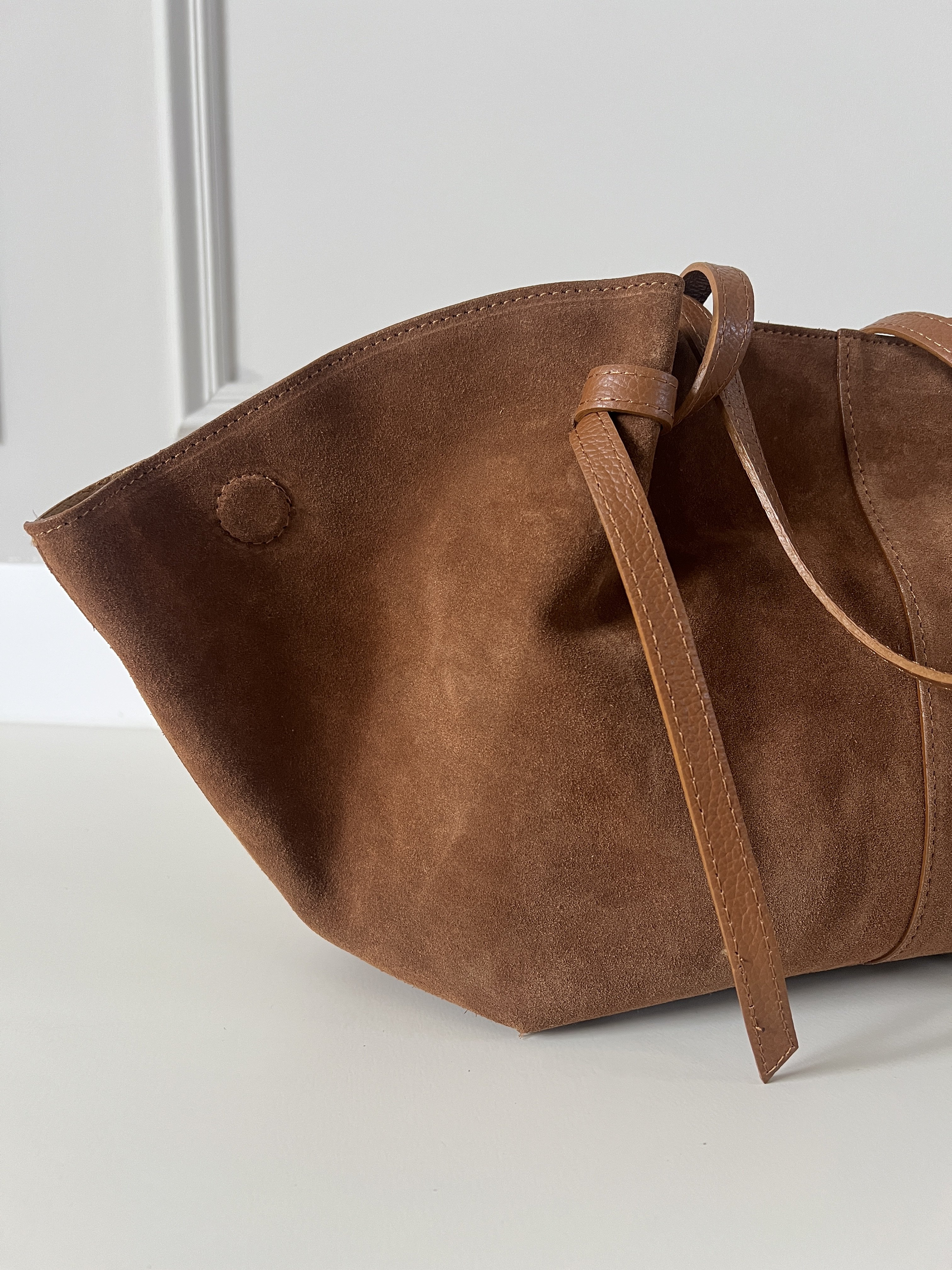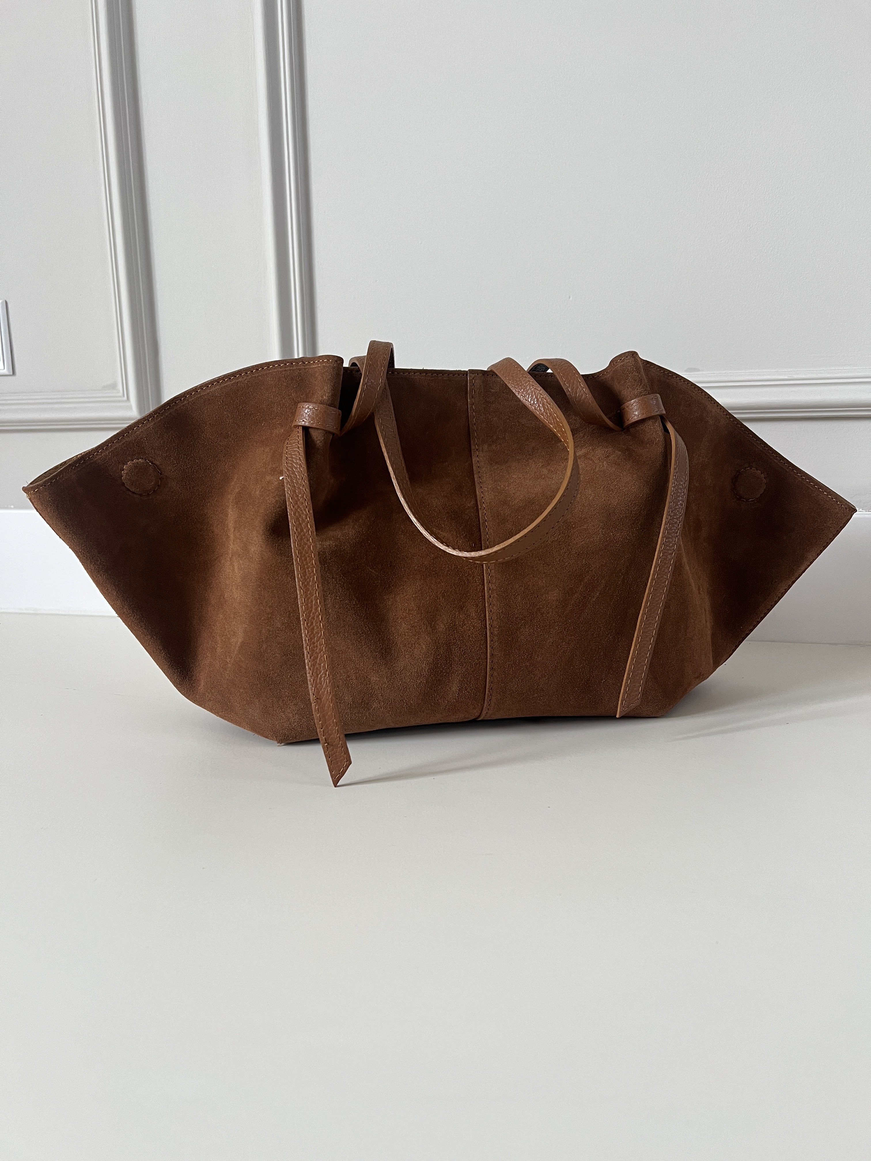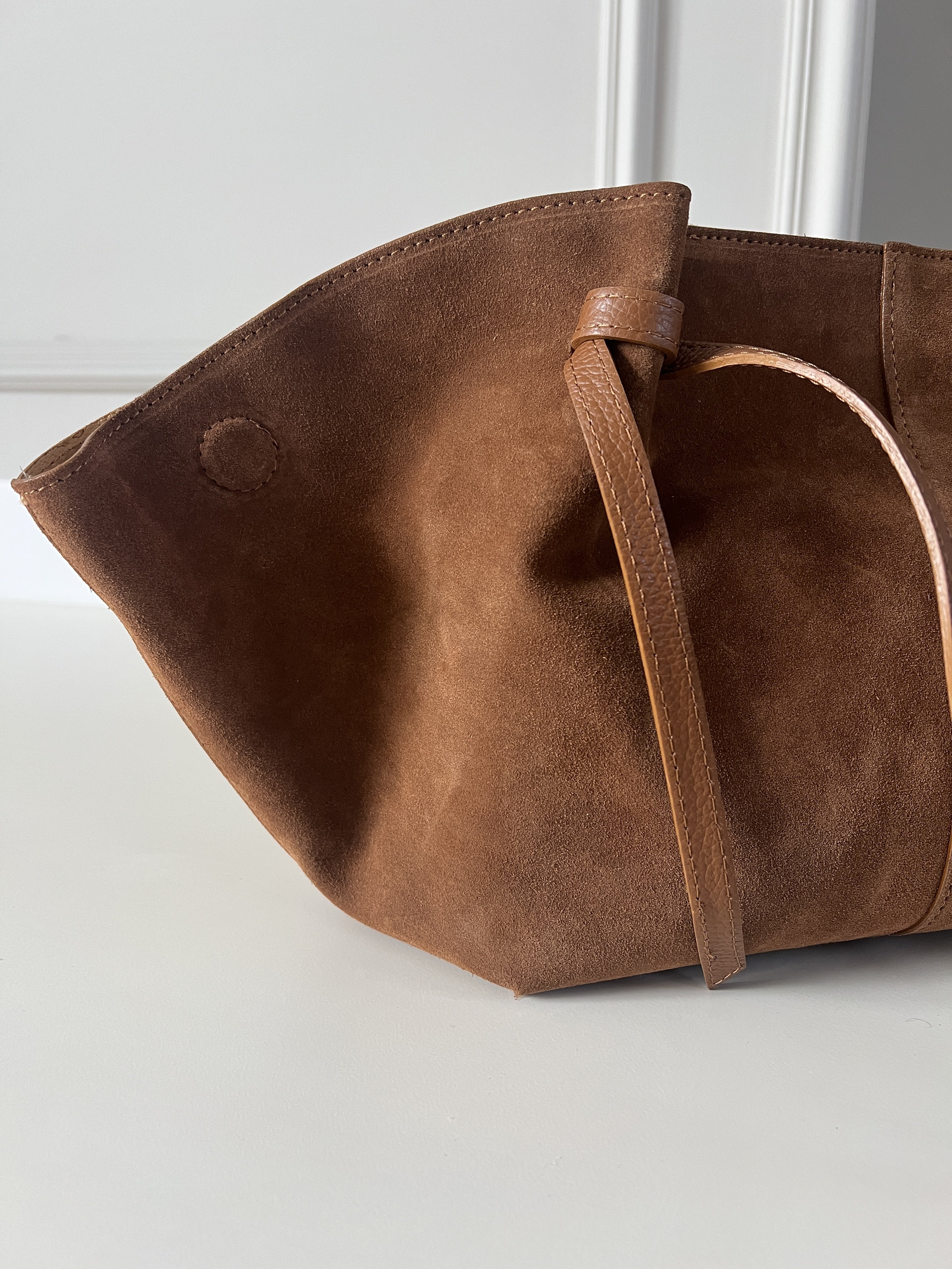 Semišová kabelka so zaujímavými doplnkami a bočným magnetom ktorý slúži na zmenu veľkosti kabelky. Kabelka má vnútri kapsu so zipsom. Kabelka je kožená, čo znamená, že pevne drží svoj tvar.