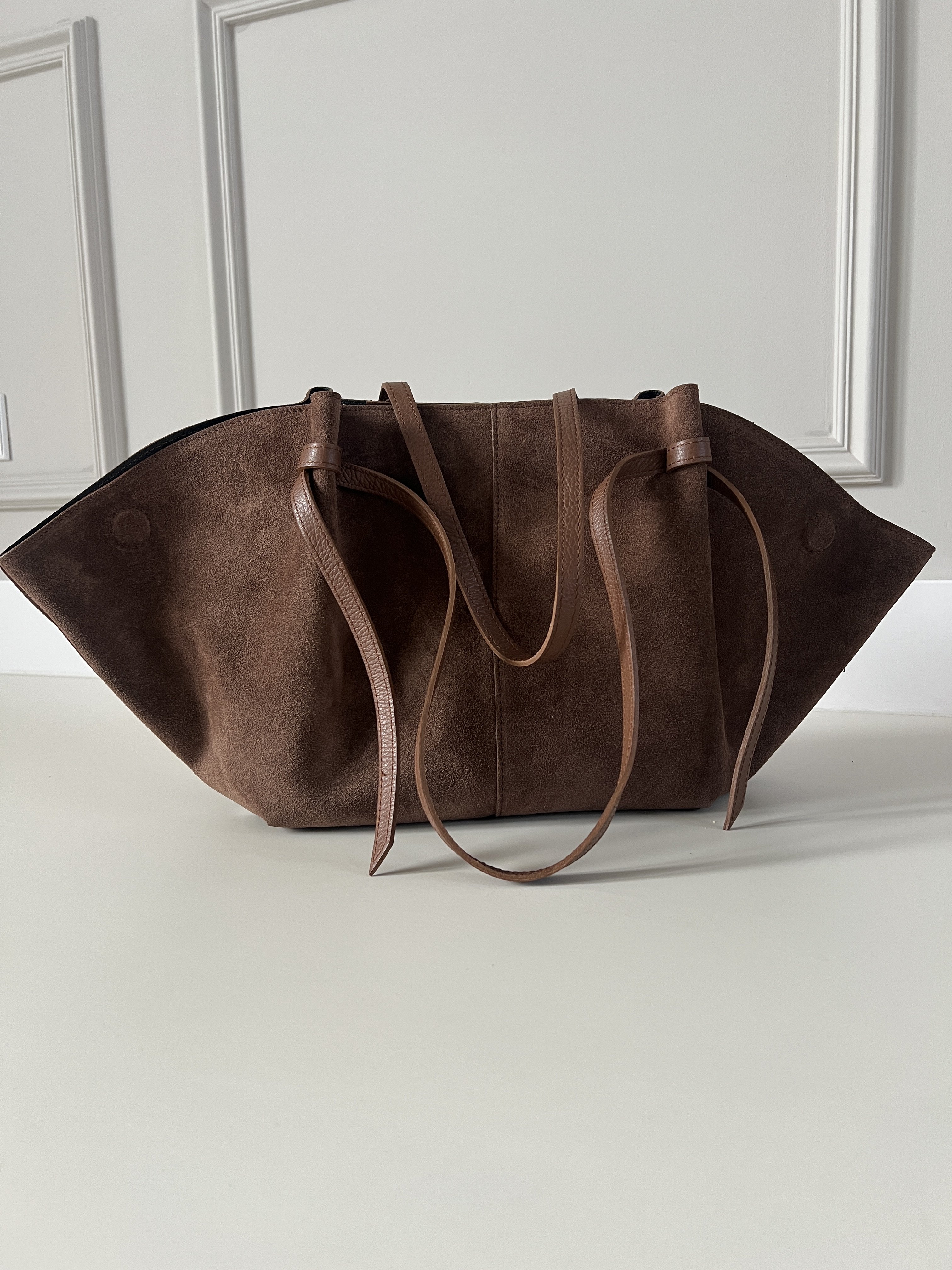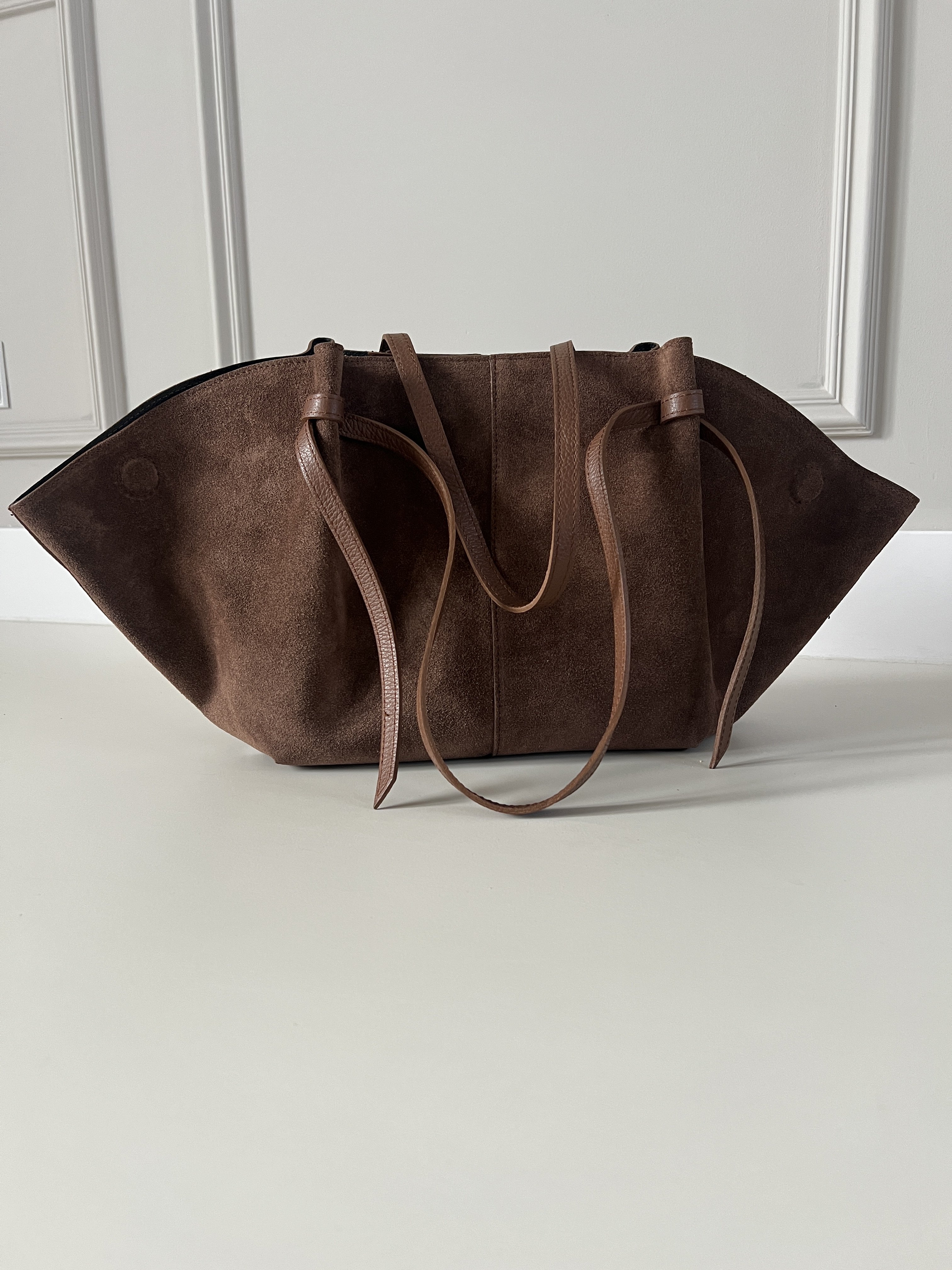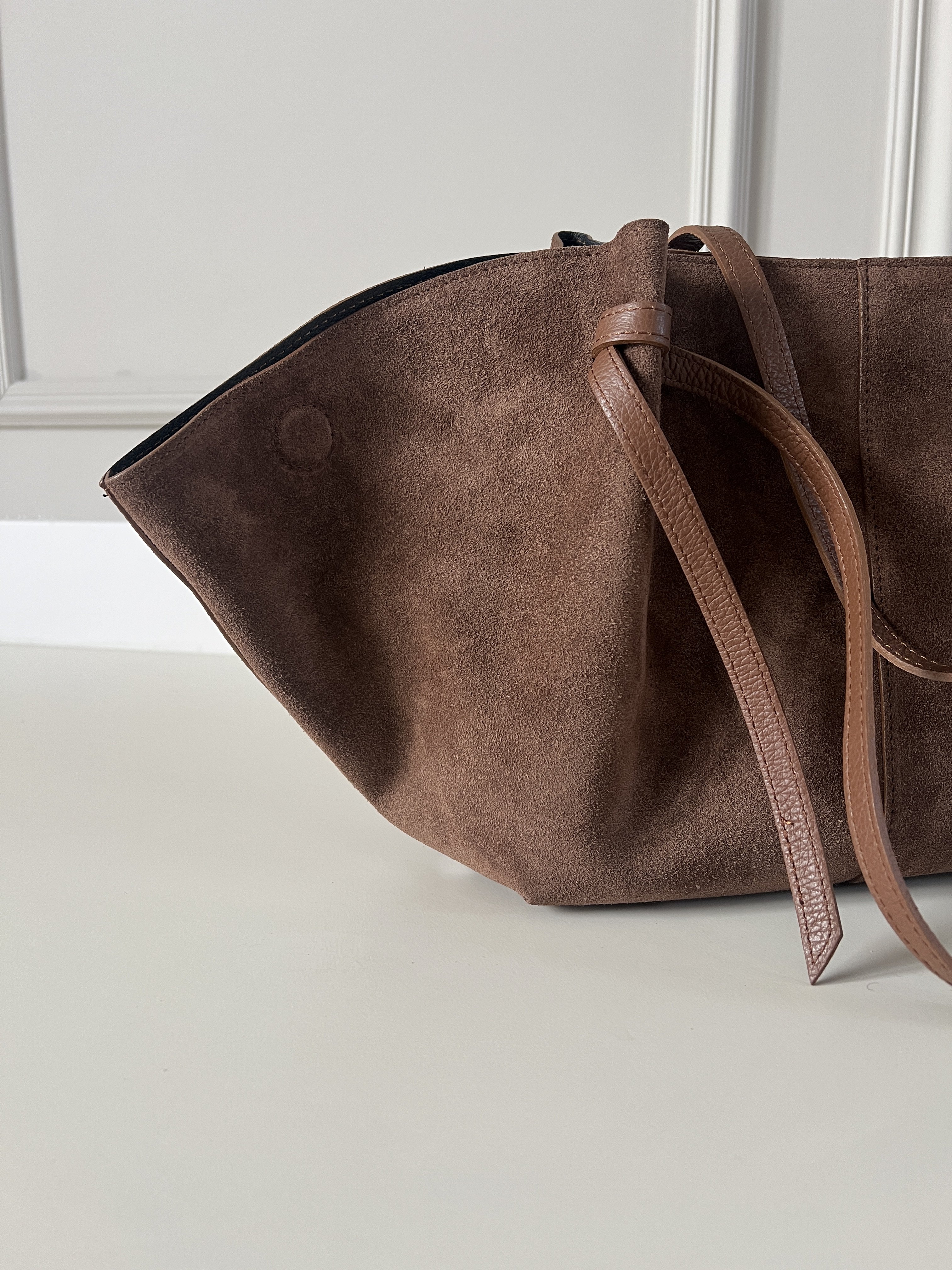Semišová kabelka so zaujímavými doplnkami a bočným magnetom ktorý slúži na zmenu veľkosti kabelky. Kabelka má vnútri kapsu so zipsom. Kabelka je kožená, čo znamená, že pevne drží svoj tvar.