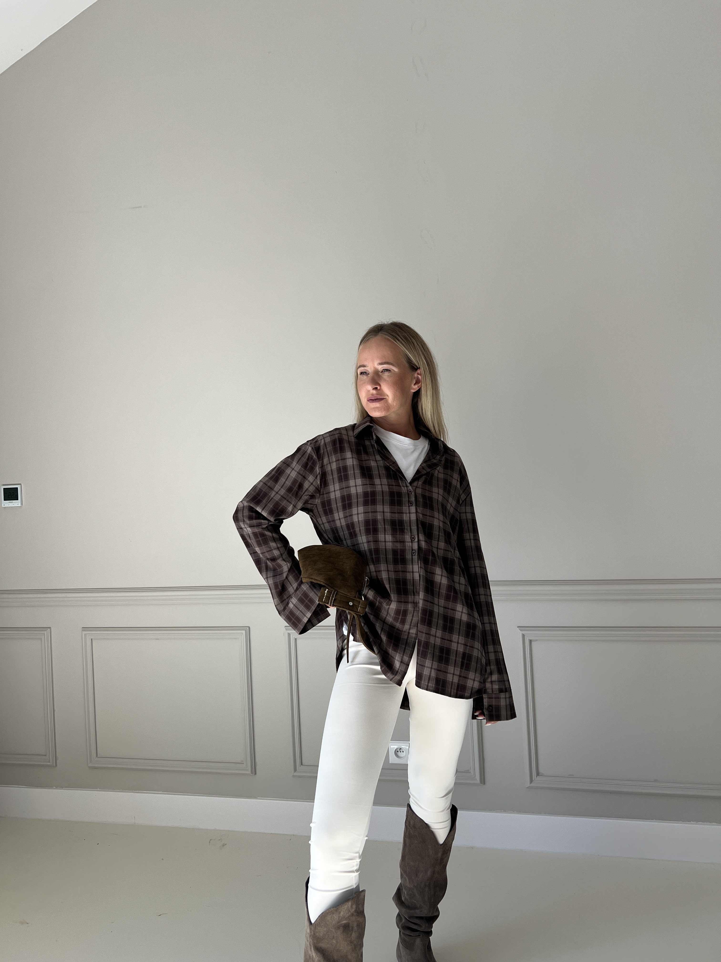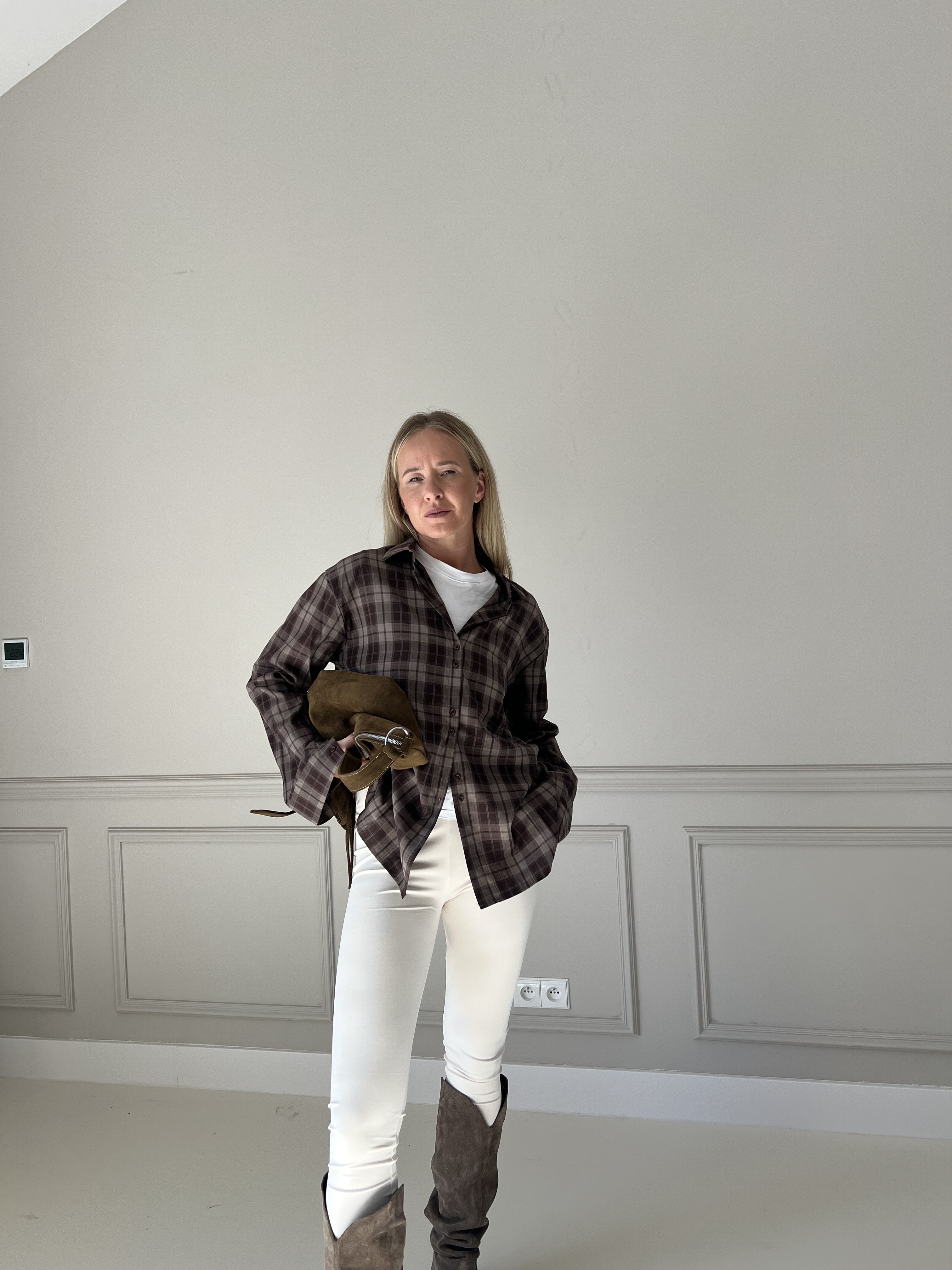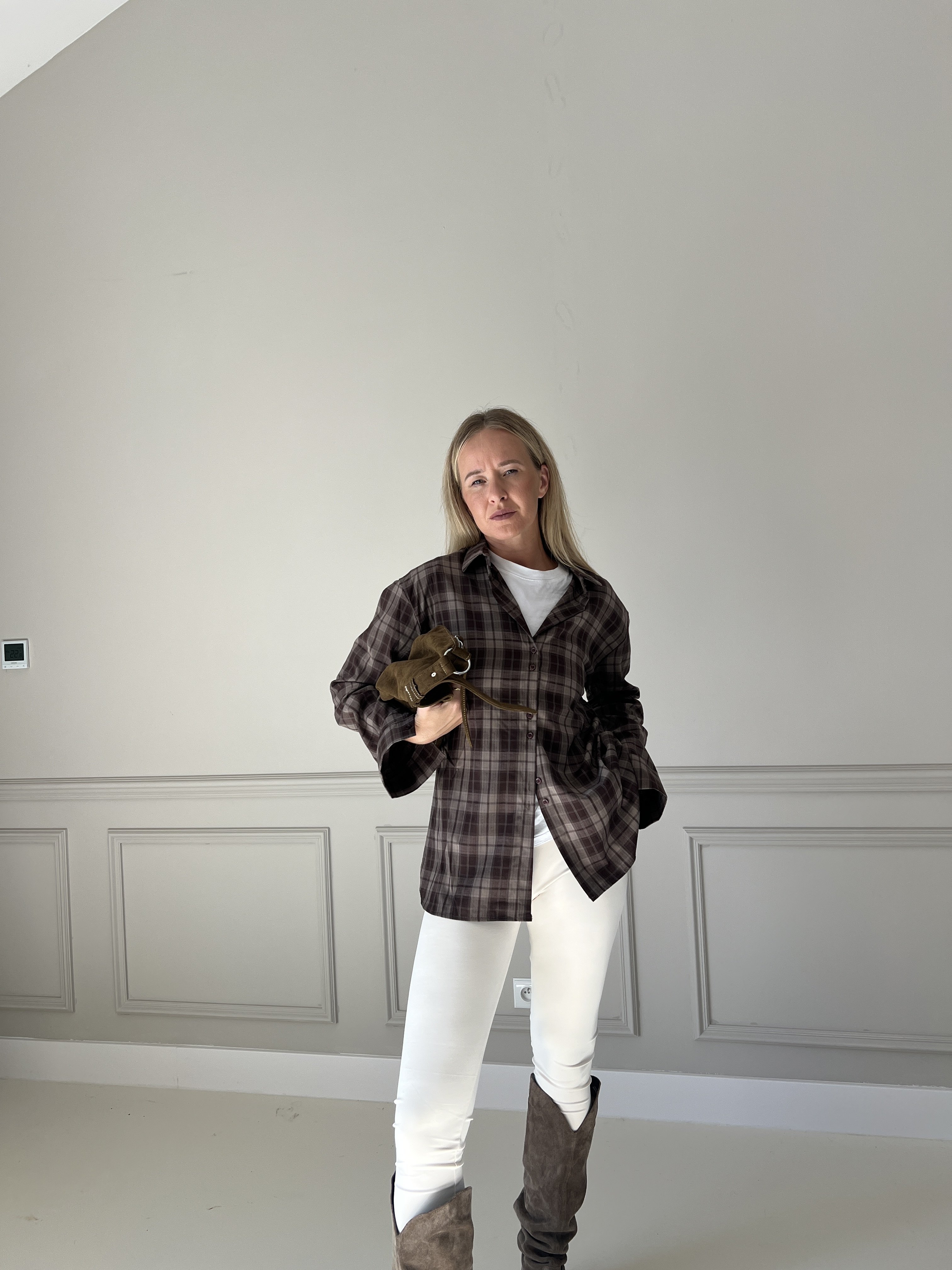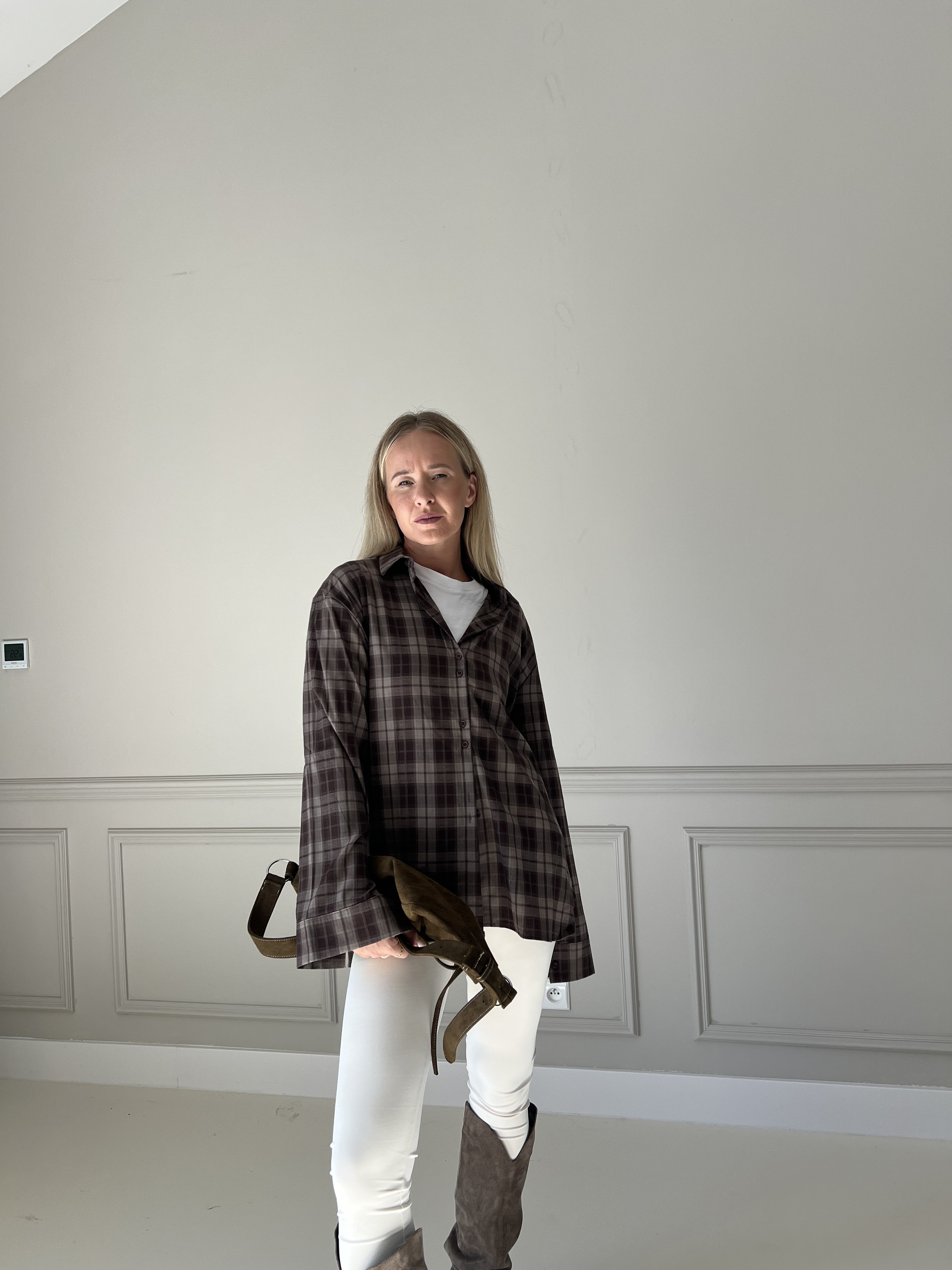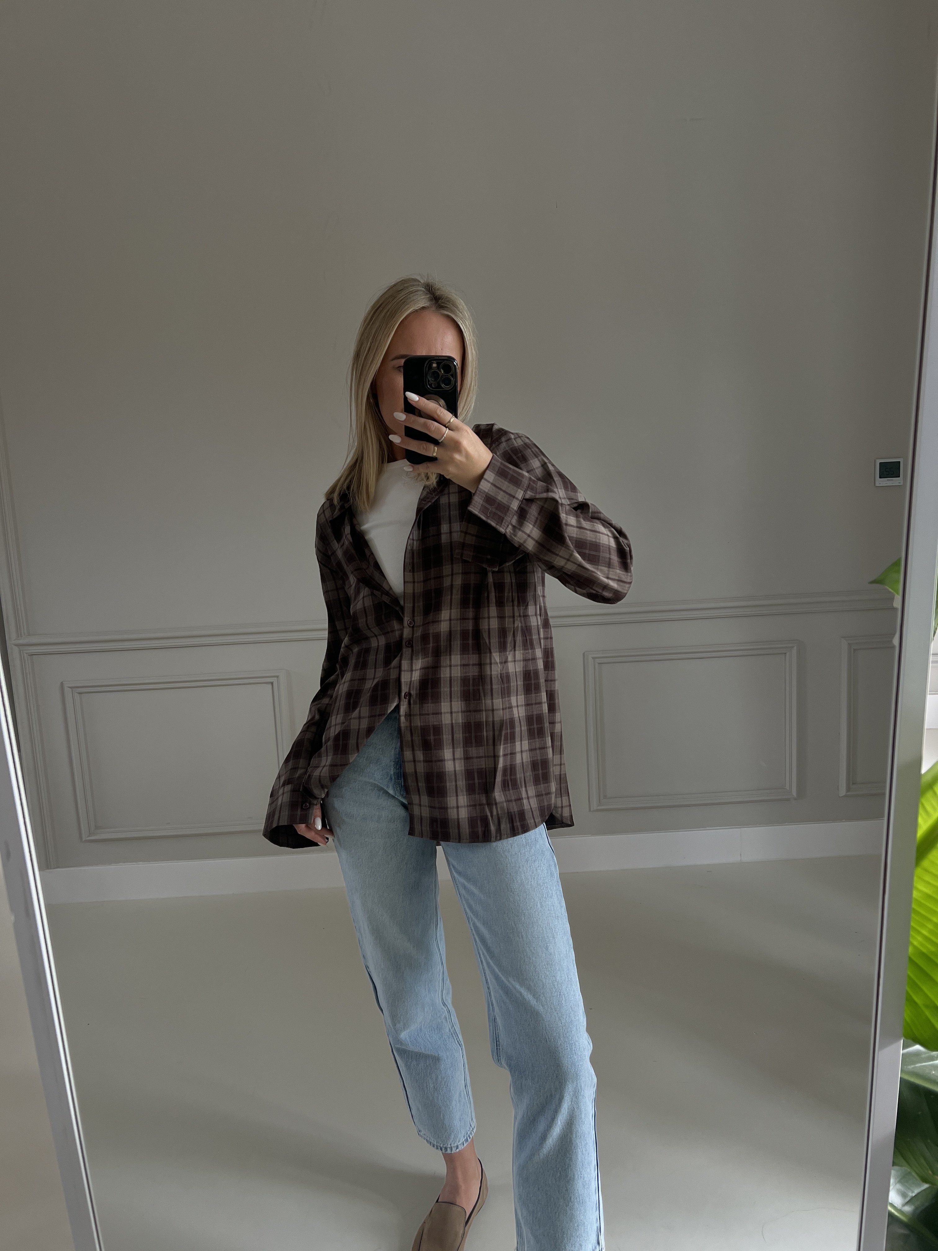 Klasická károvaná košeľa v ležérnom strihu kombinovaná hnedými odtieňmi. Košeľa má zapínanie na gombíky. Modelka má výšku 170cm, na sebe má veľkosť M/L