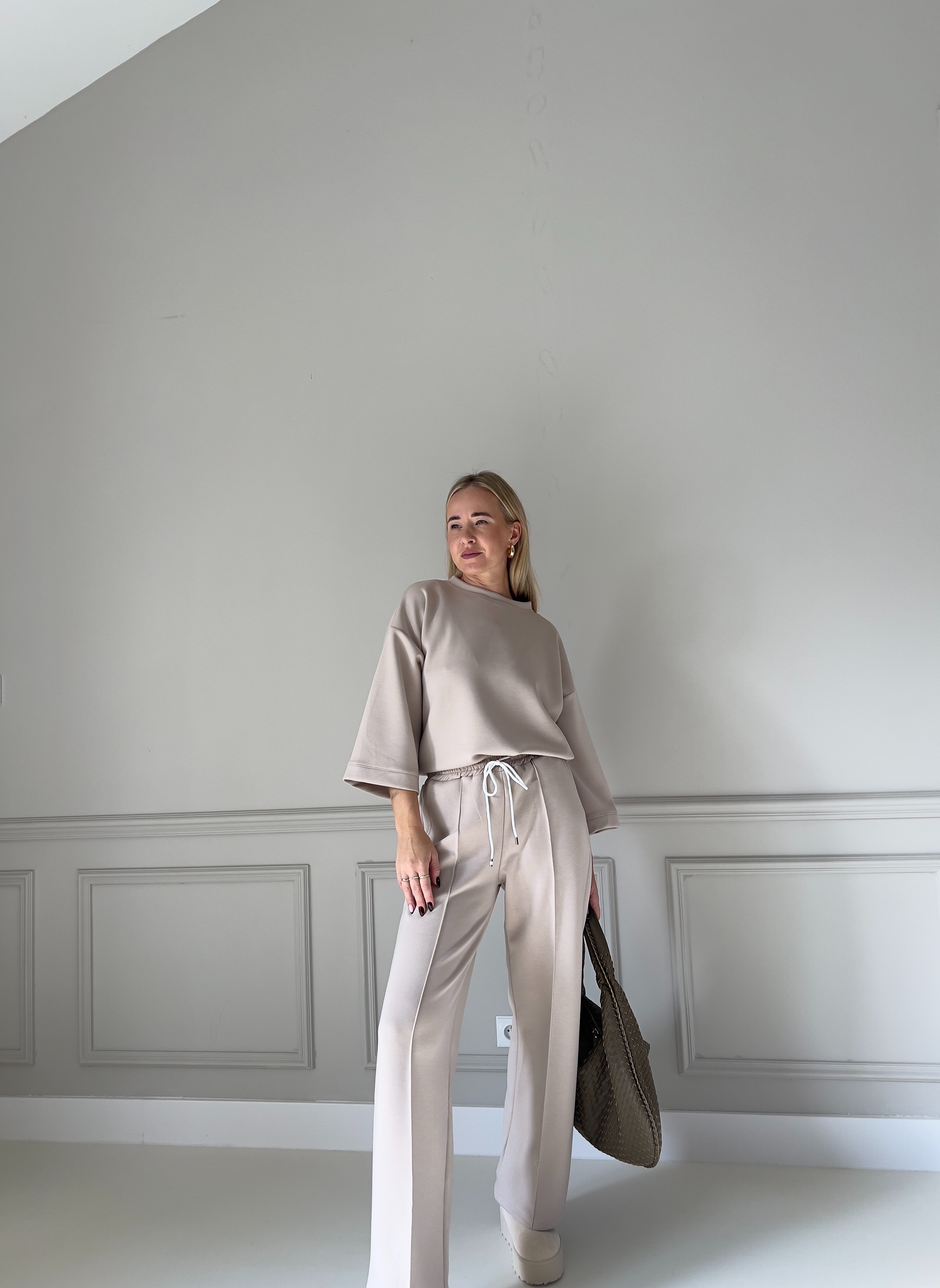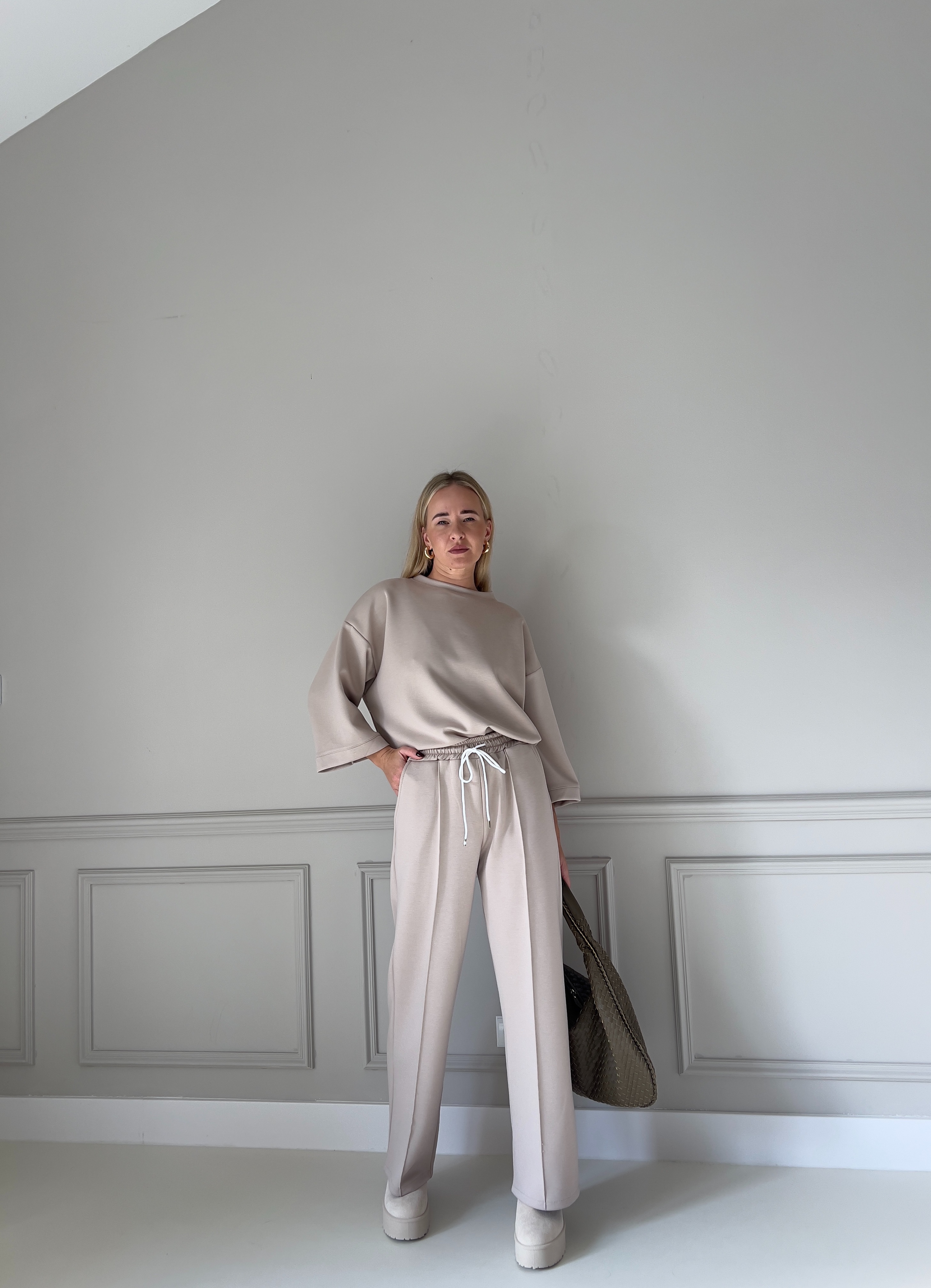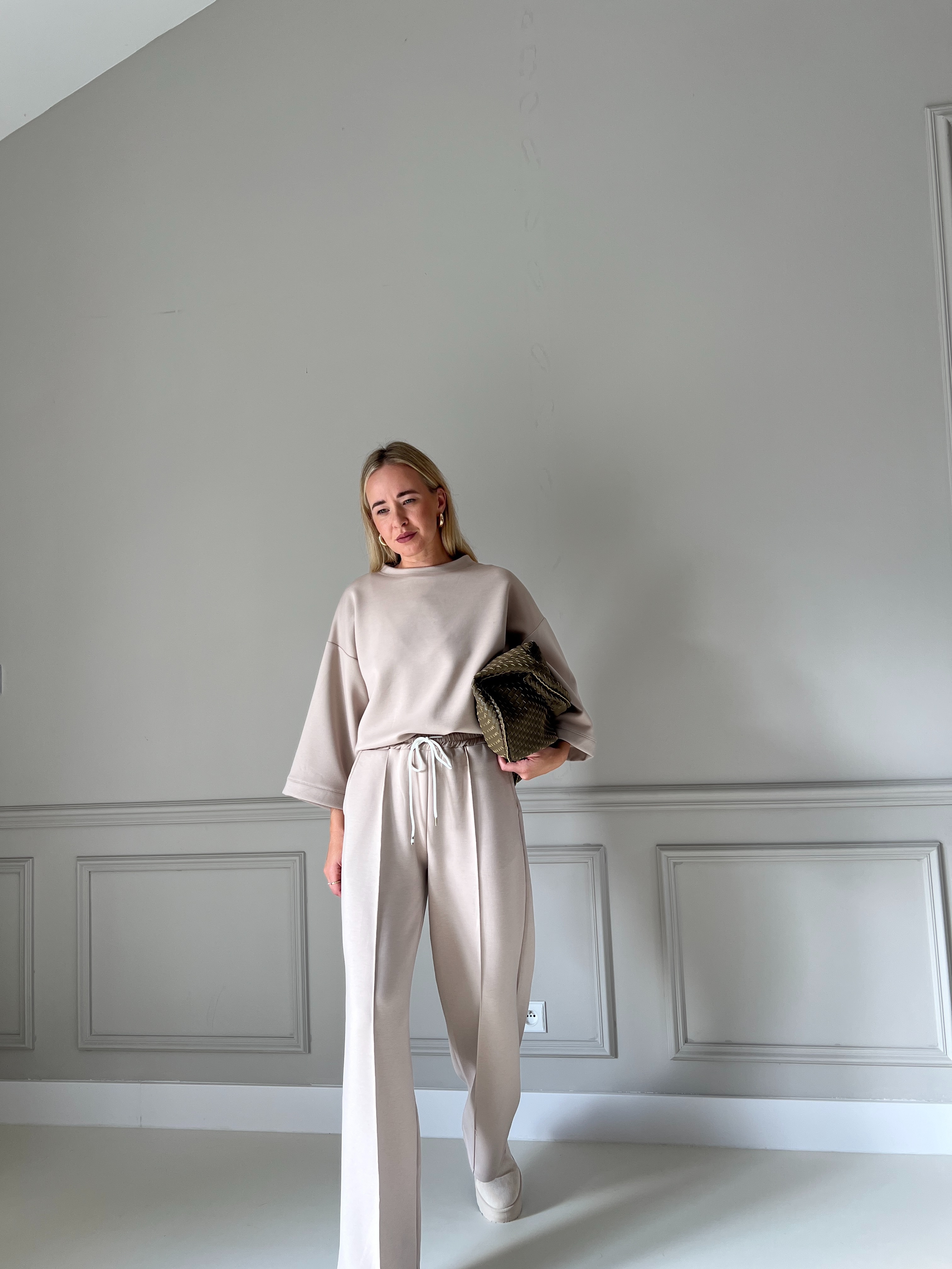 Pohodlná tepláková súprava v ležérnom strihu vo veľmi príjemnom a mäkkom materiály. Mikina má rovný, jemne oversize strih s okrúhlym výstrihom. Tepláky majú rovný strih s bočnými vreckami. V páse je gumička.