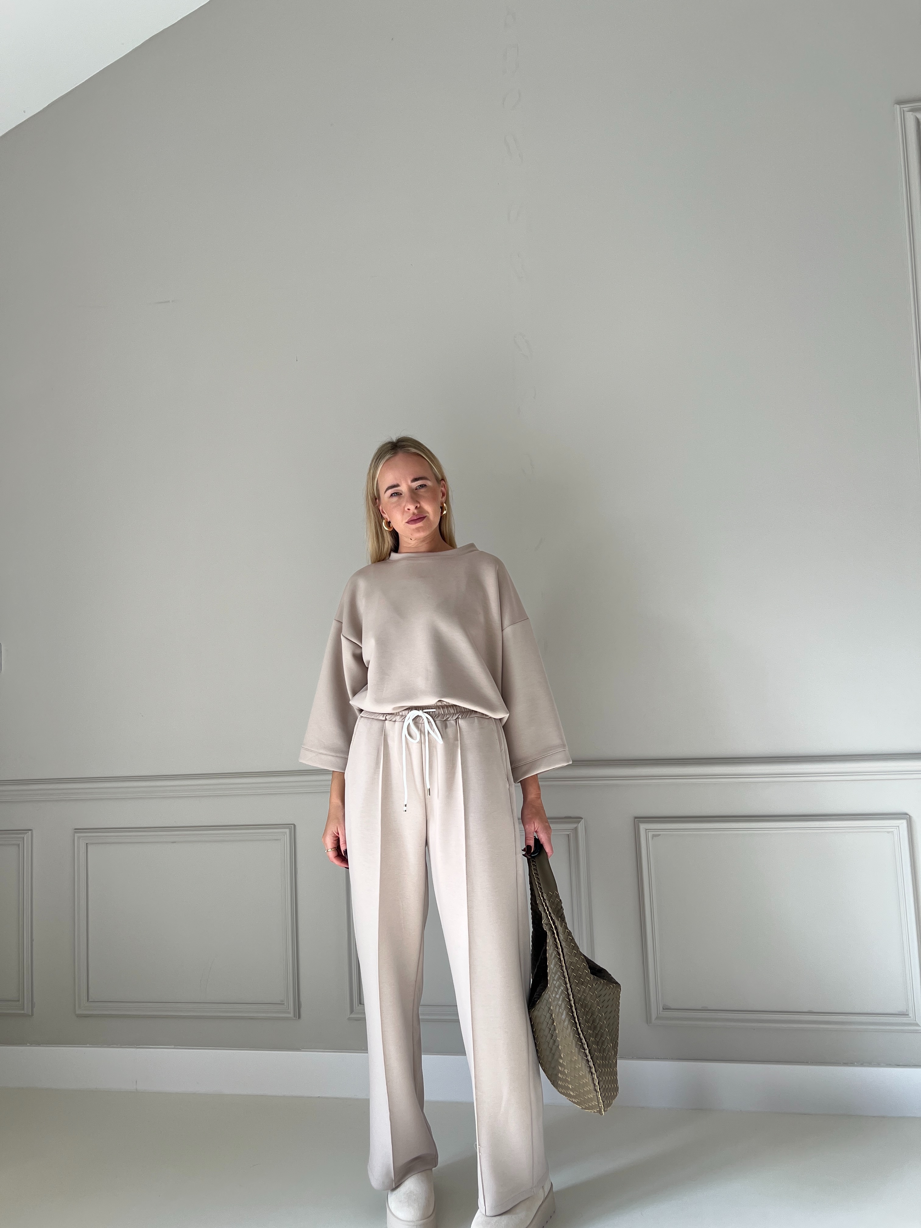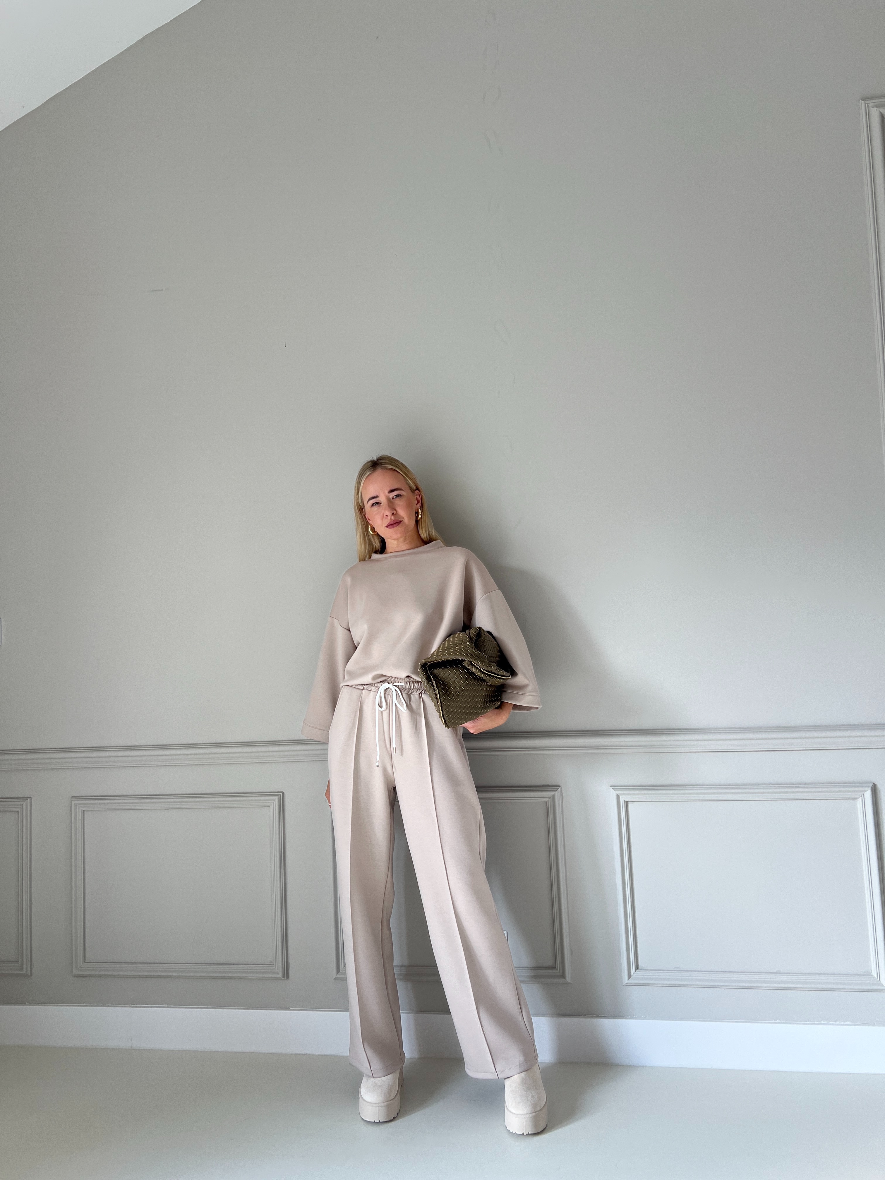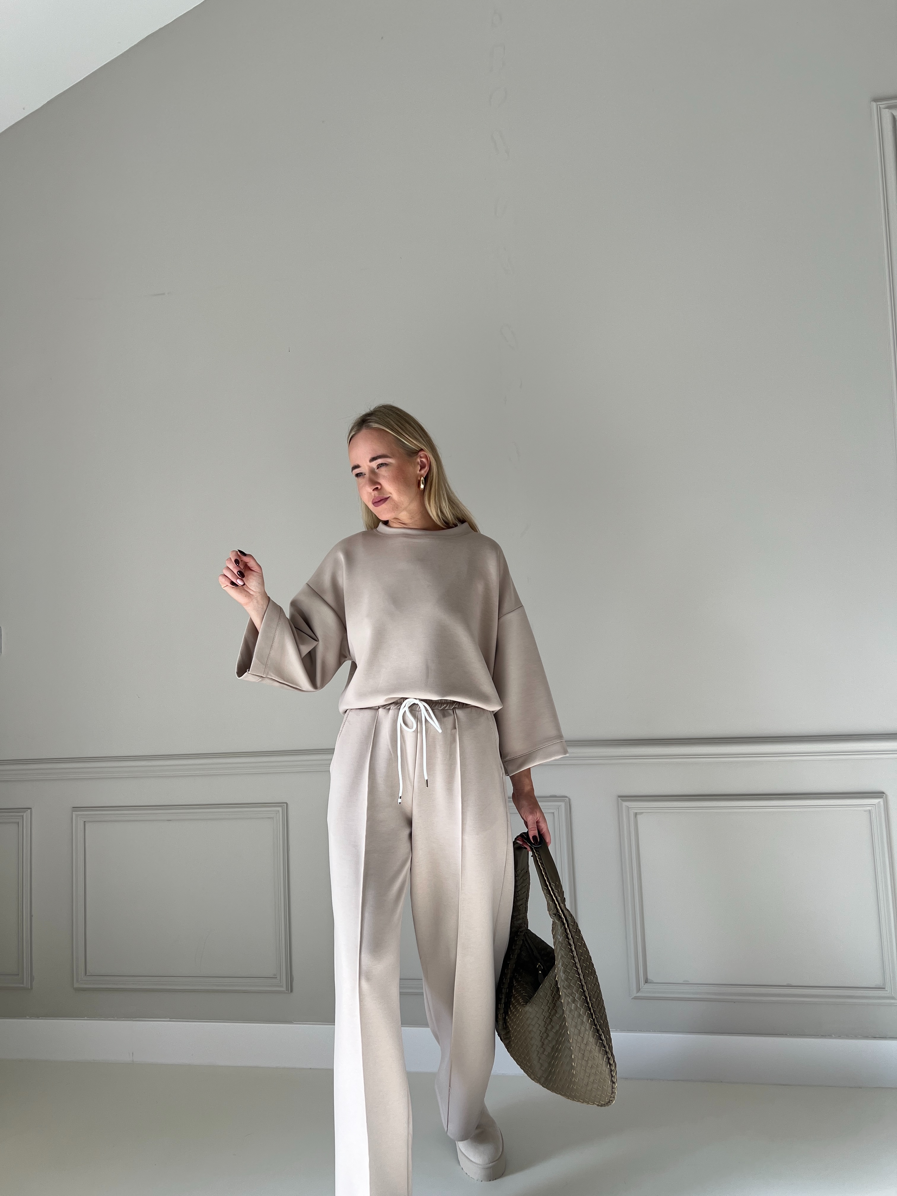 Pohodlná tepláková súprava v ležérnom strihu vo veľmi príjemnom a mäkkom materiály. Mikina má rovný, jemne oversize strih s okrúhlym výstrihom. Tepláky majú rovný strih s bočnými vreckami. V páse je gumička.