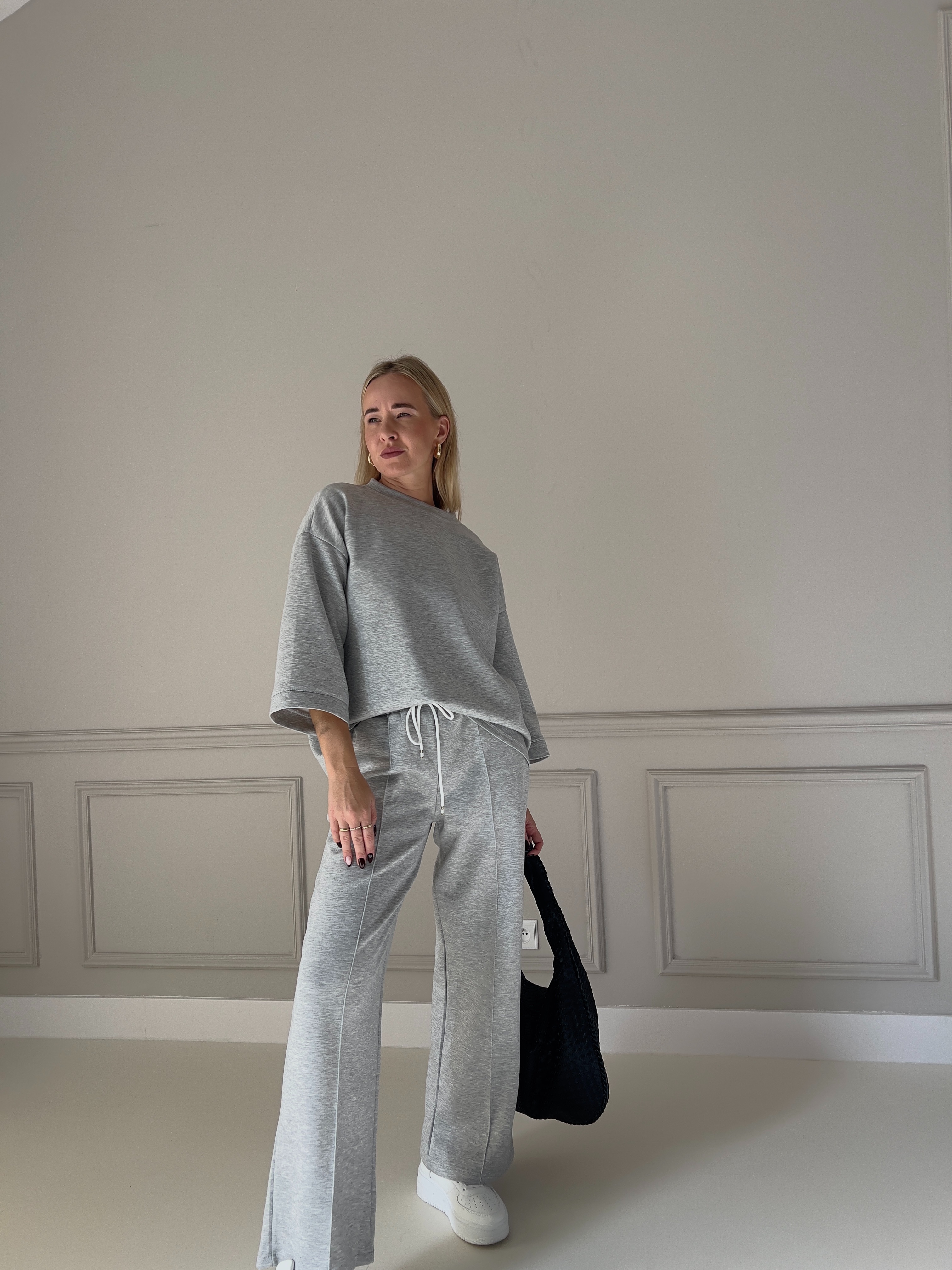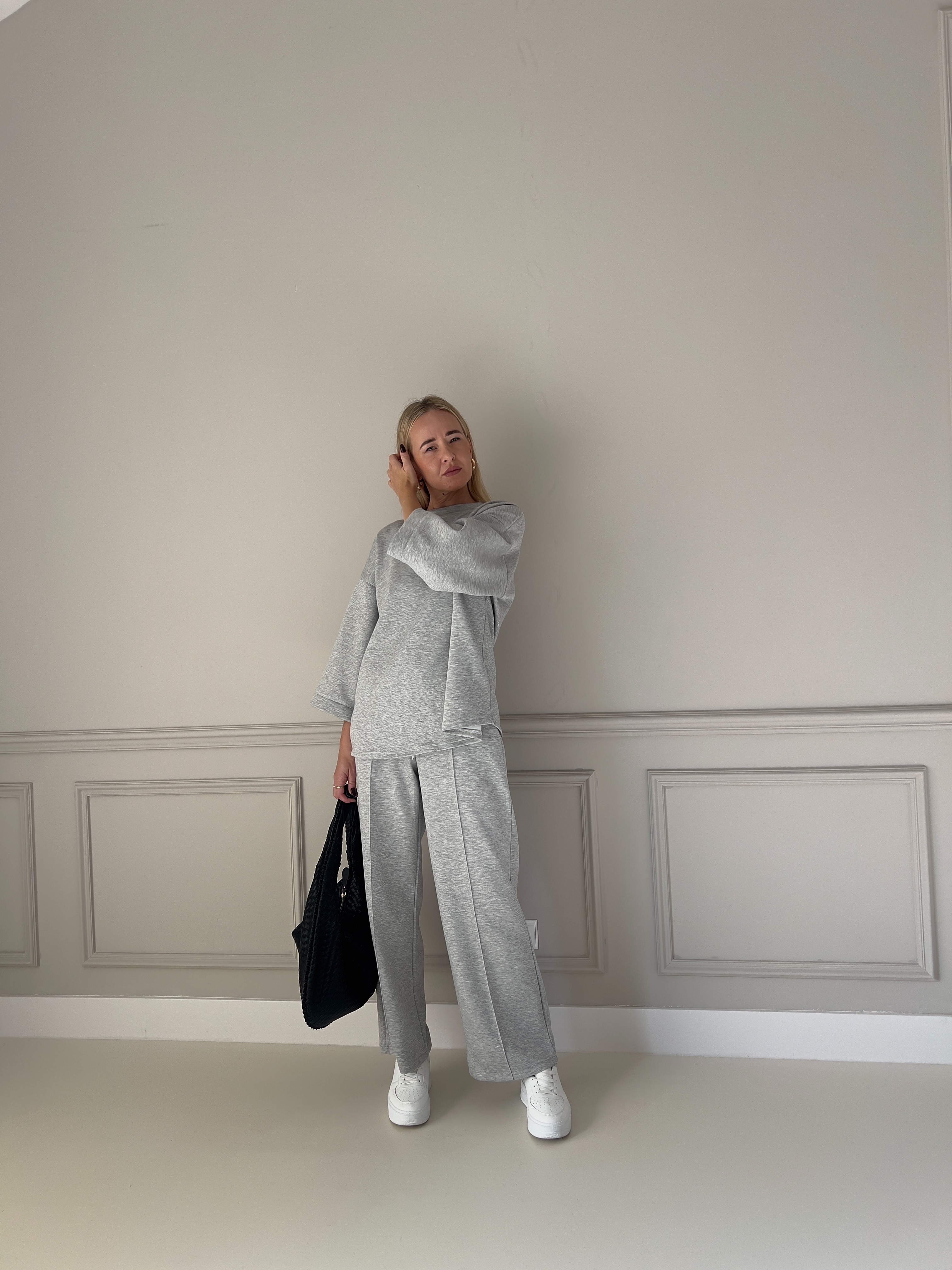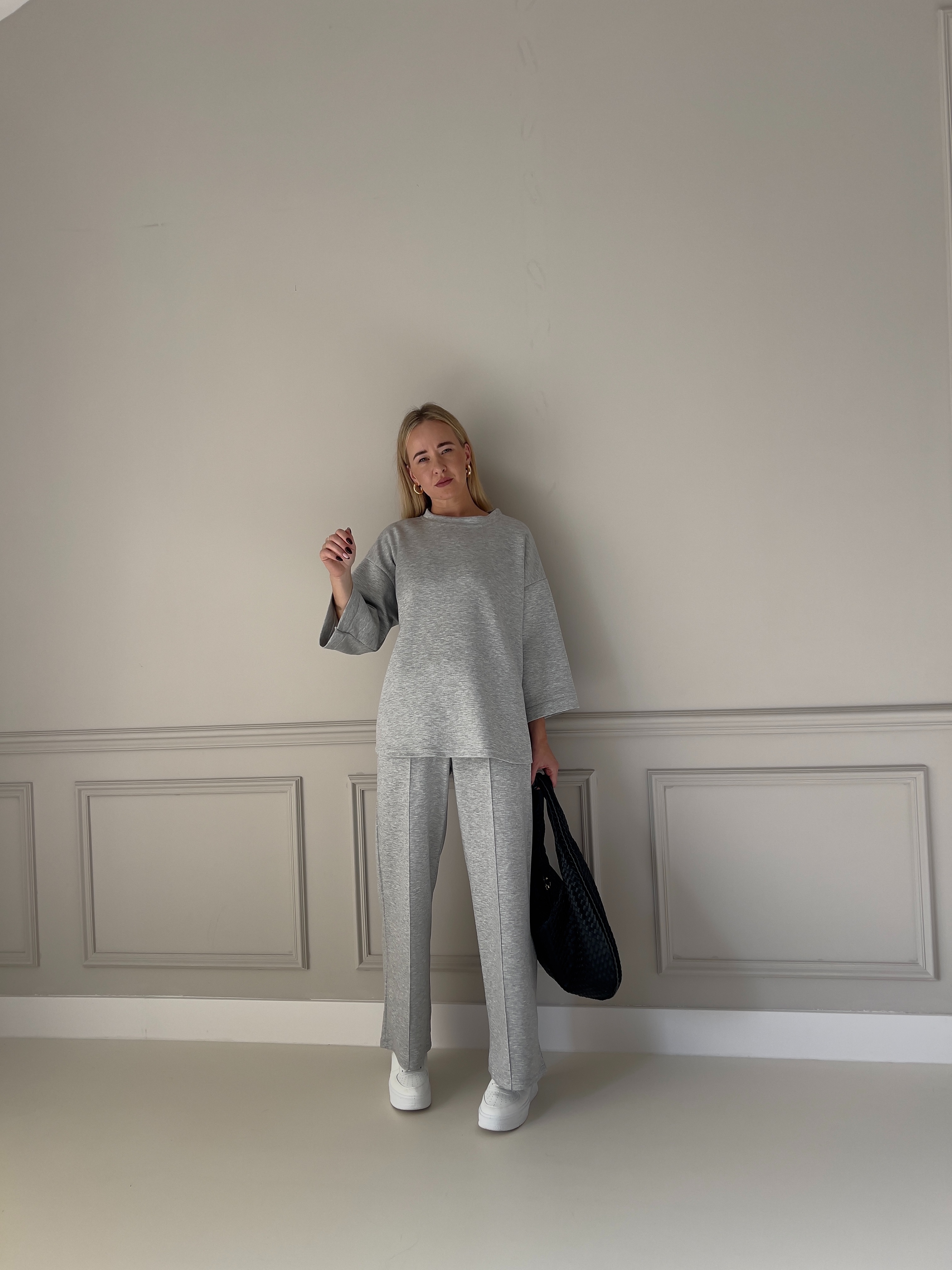 Pohodlná tepláková súprava v ležérnom strihu vo veľmi príjemnom a mäkkom materiály. Mikina má rovný, jemne oversize strih s okrúhlym výstrihom. Tepláky majú rovný strih s bočnými vreckami. V páse je gumička.