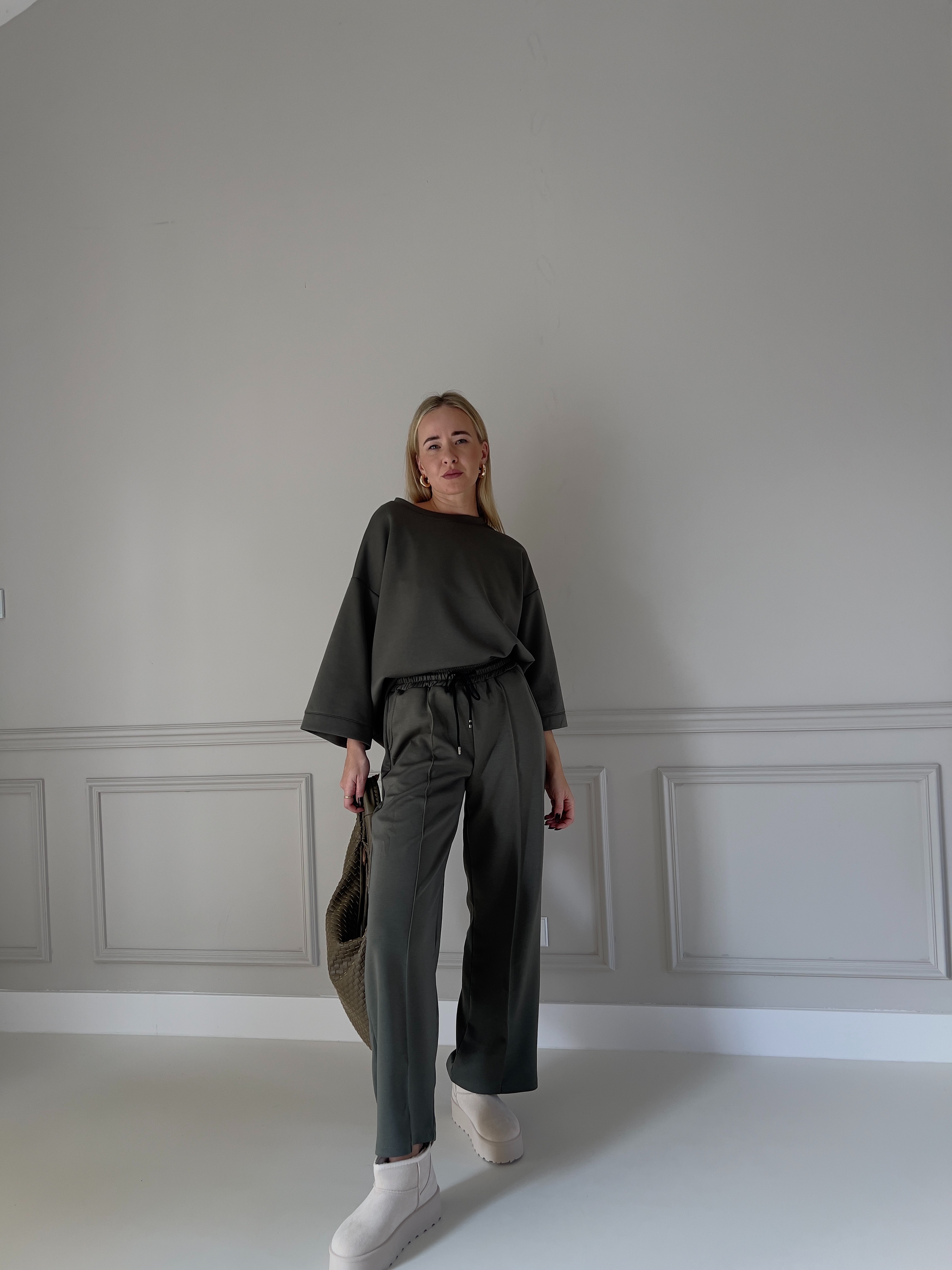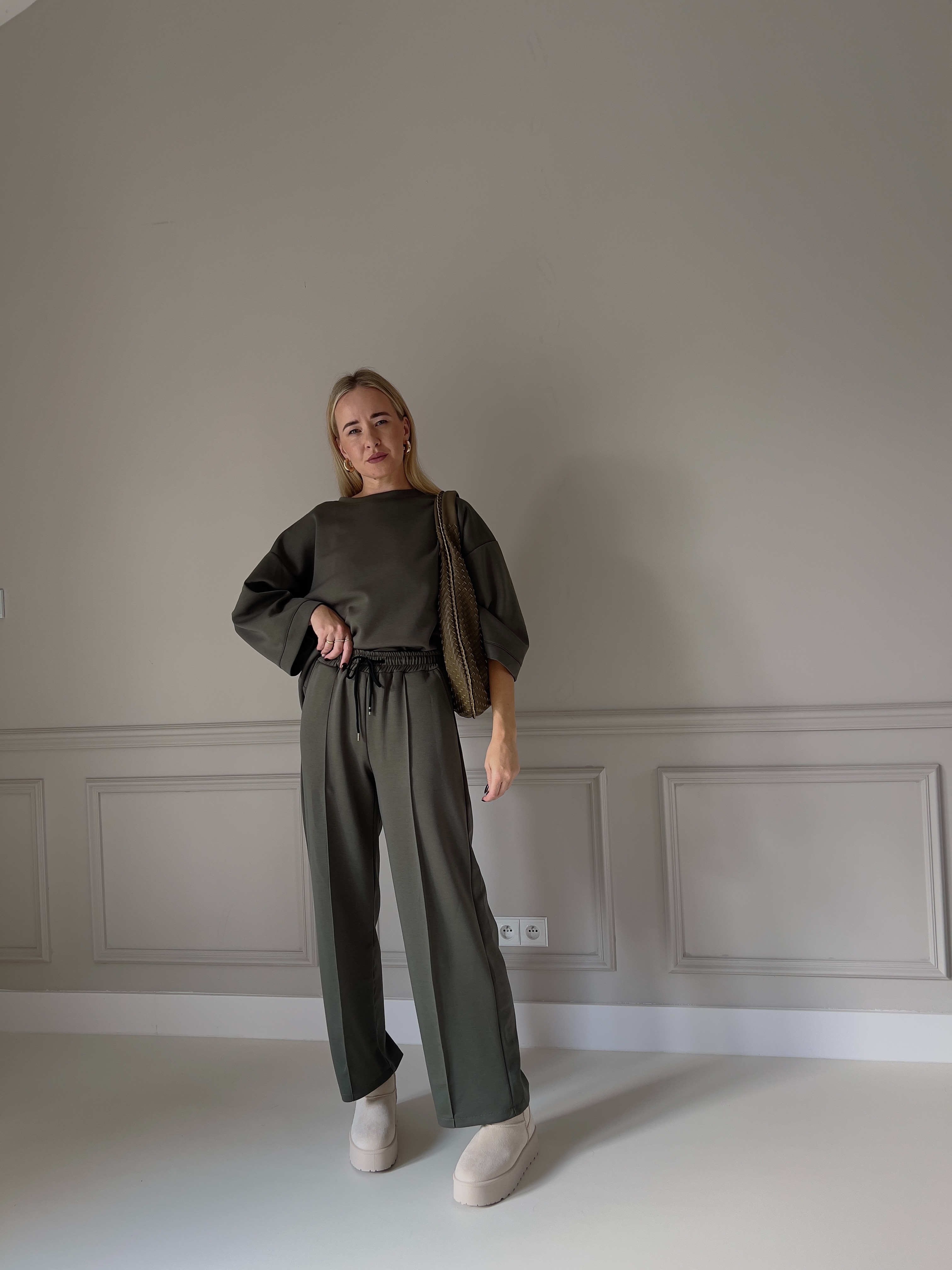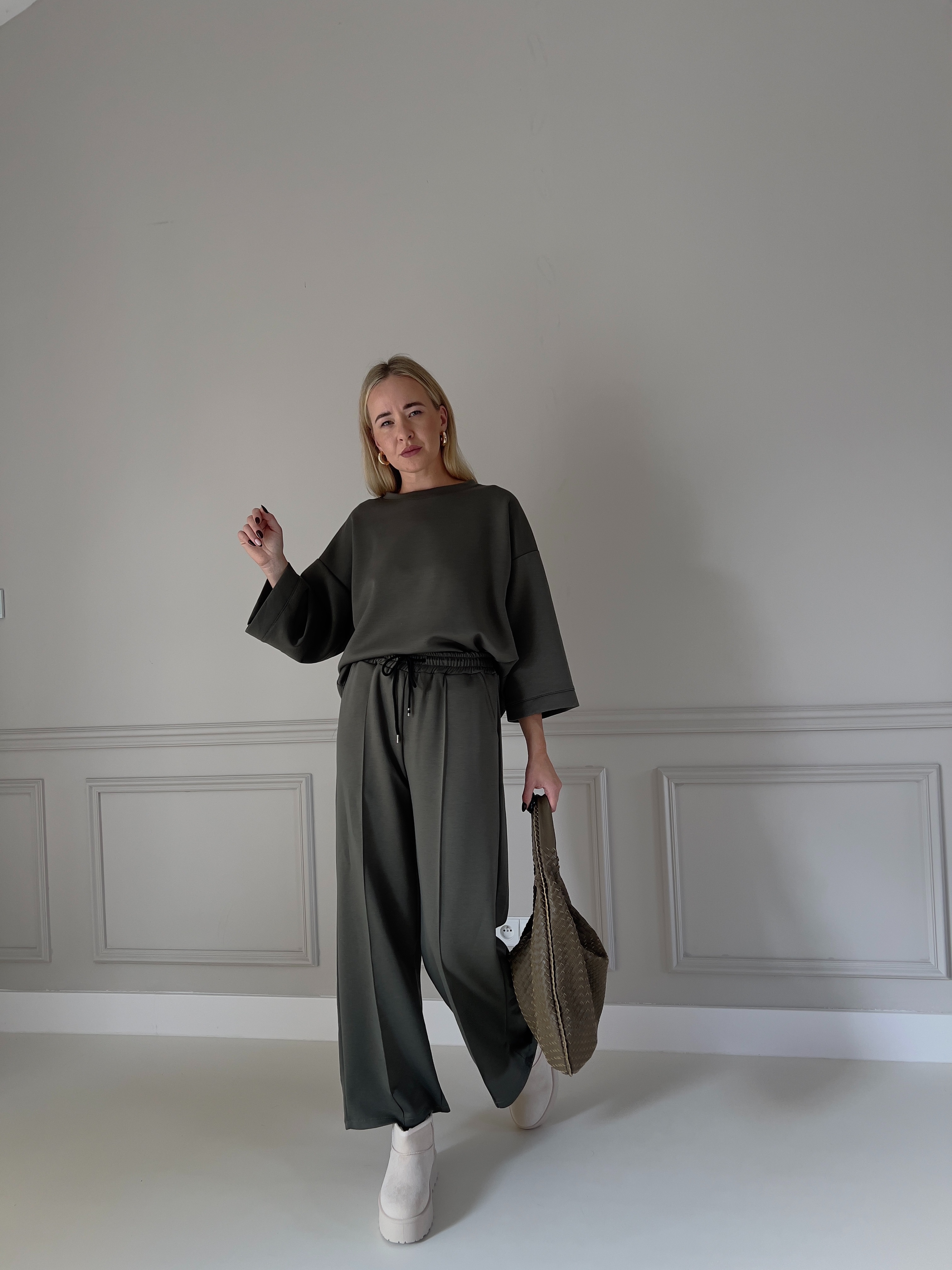Pohodlná tepláková súprava v ležérnom strihu vo veľmi príjemnom a mäkkom materiály. Mikina má rovný, jemne oversize strih s okrúhlym výstrihom. Tepláky majú rovný strih s bočnými vreckami. V páse je gumička.