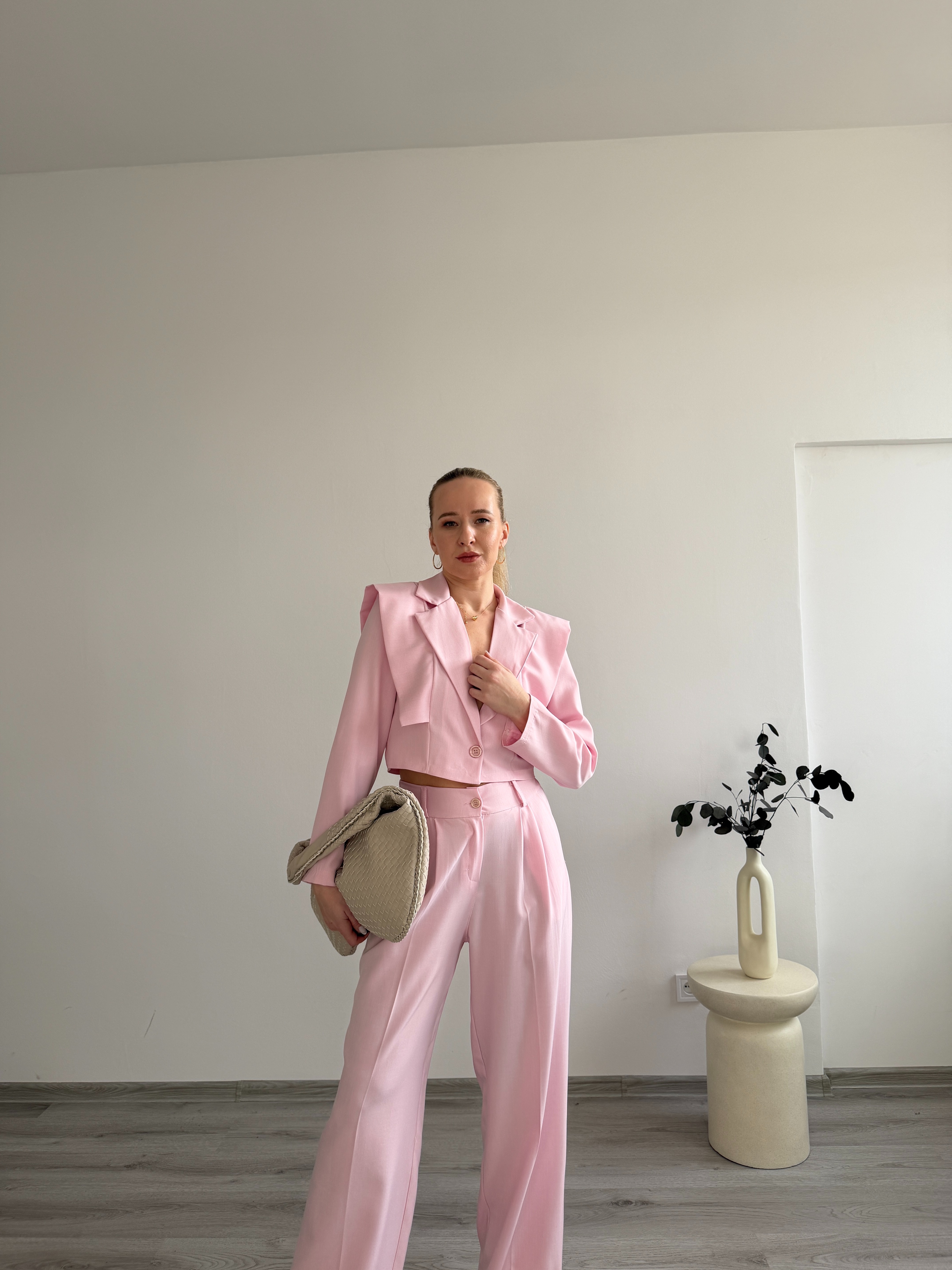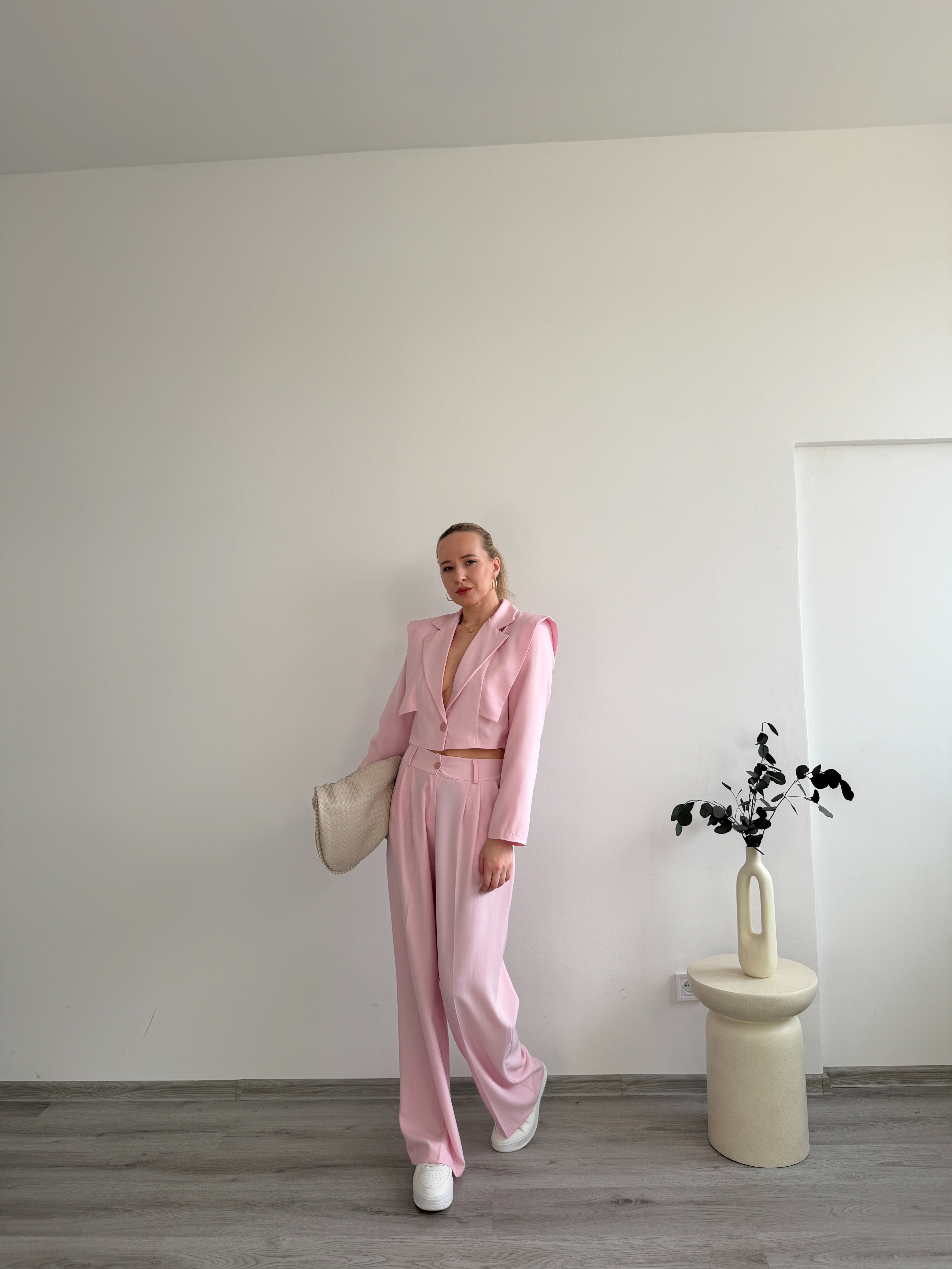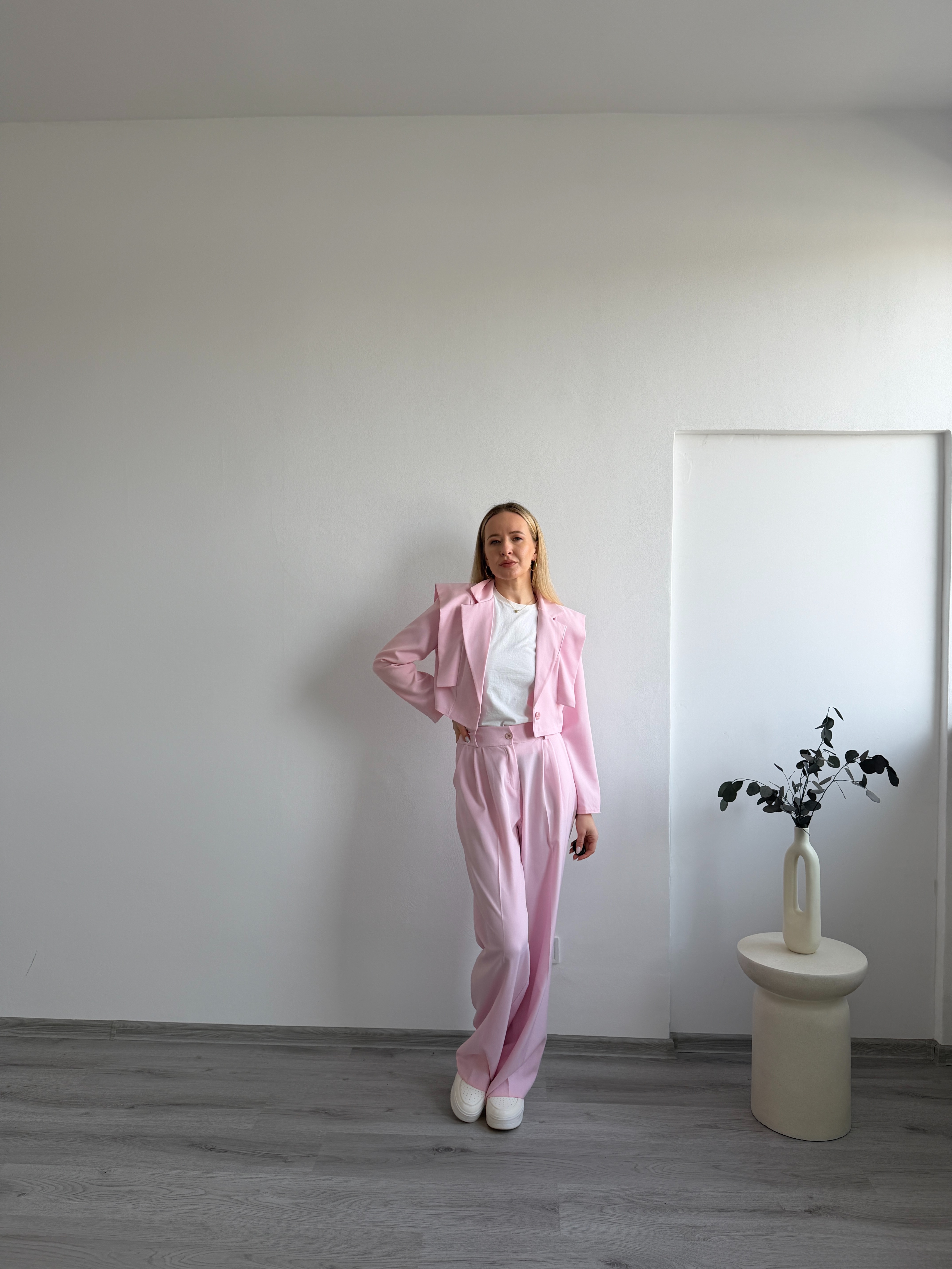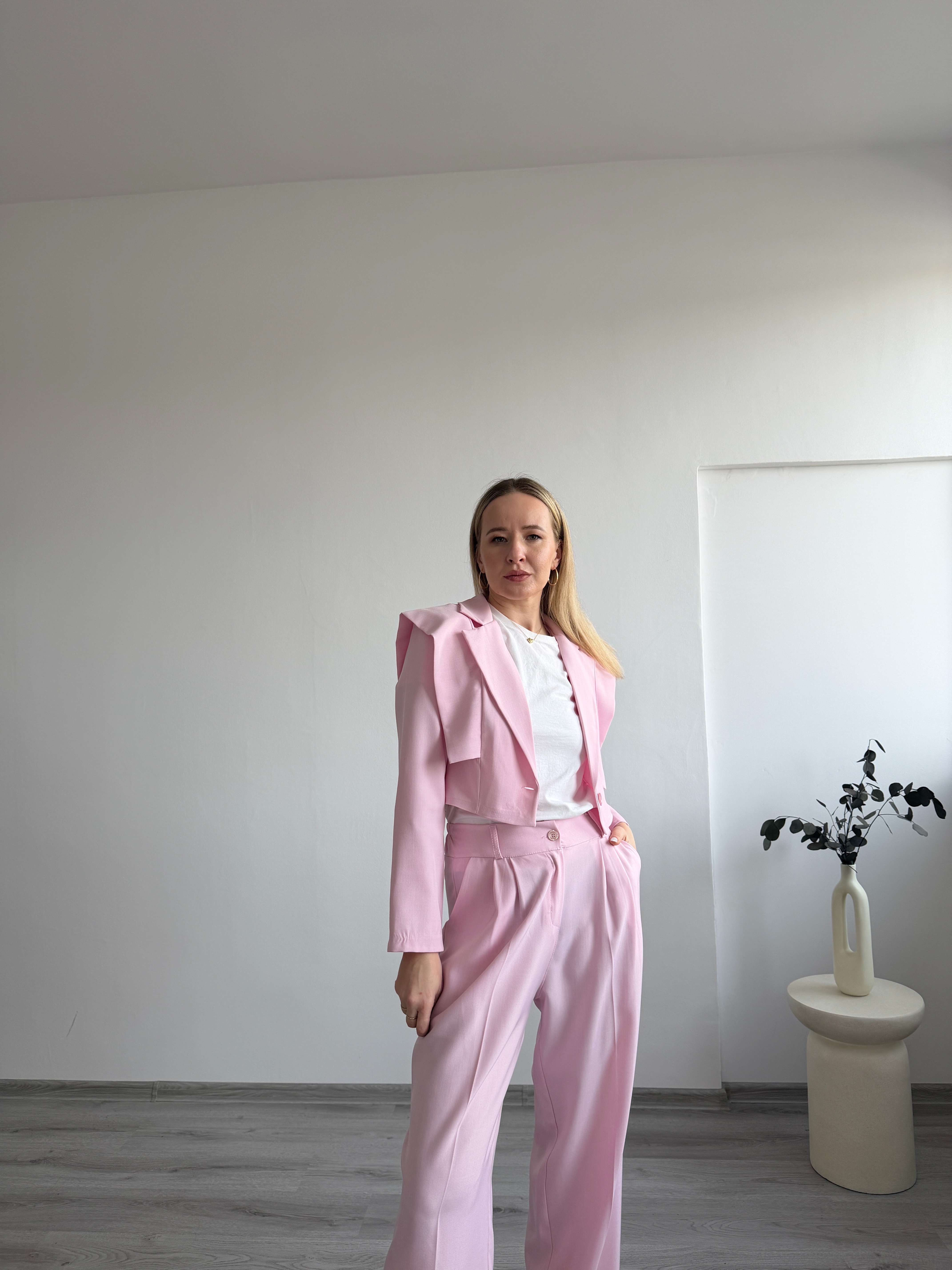 Štýlový kostým v jemnej rúžovej farbe pozostávajúci z krátkeho saka a voľných nohavíc s vysokým pásom so zapínaním na gombík, zo zadnej strany nohavíc je guma. Pohodlný, no zároveň elegantný komplet vhodný na oslavy, pracovné stretnutia či špeciálne príležitosti. Modelka má výšku 170cm, nosí veľkosť S.