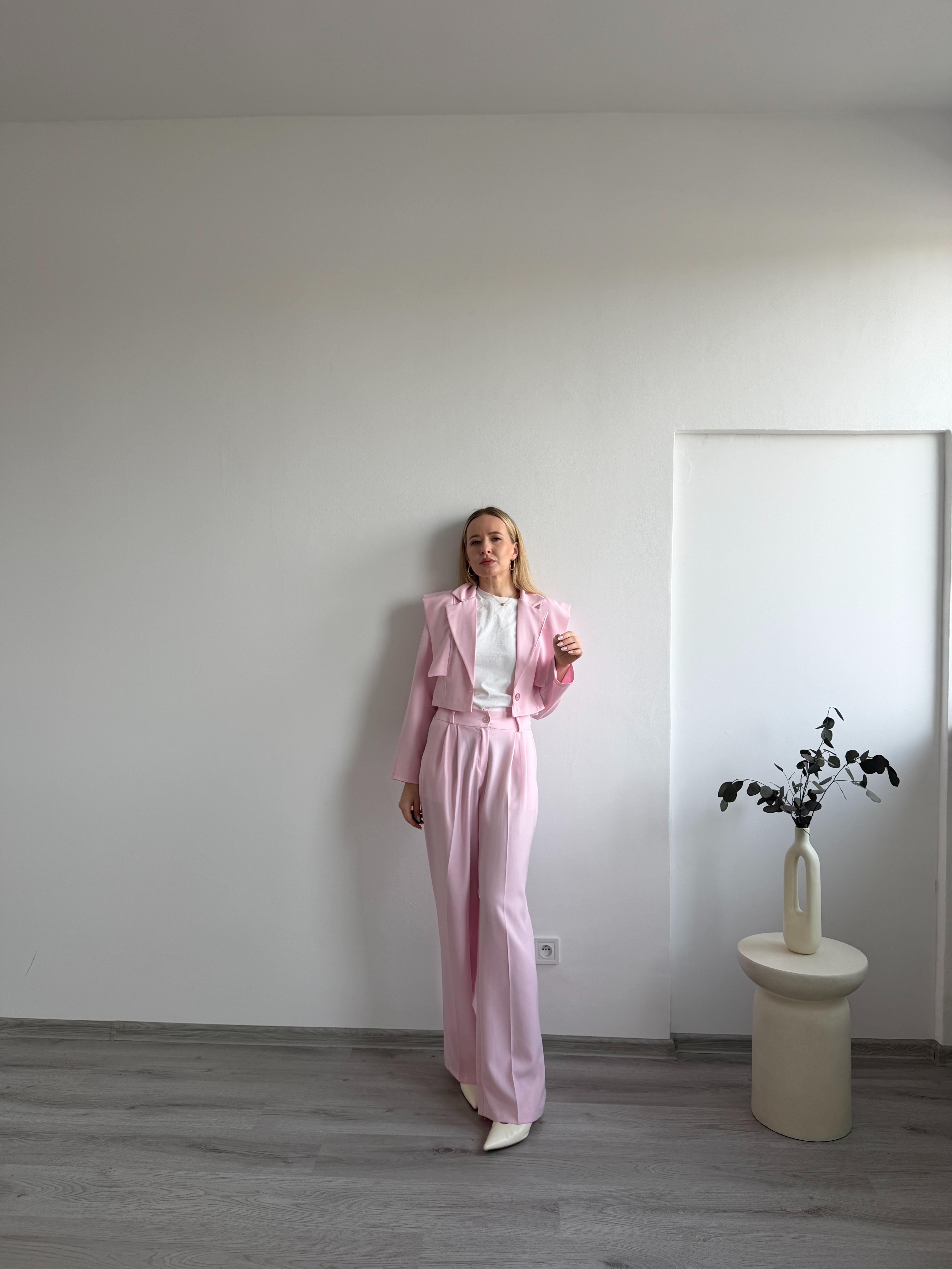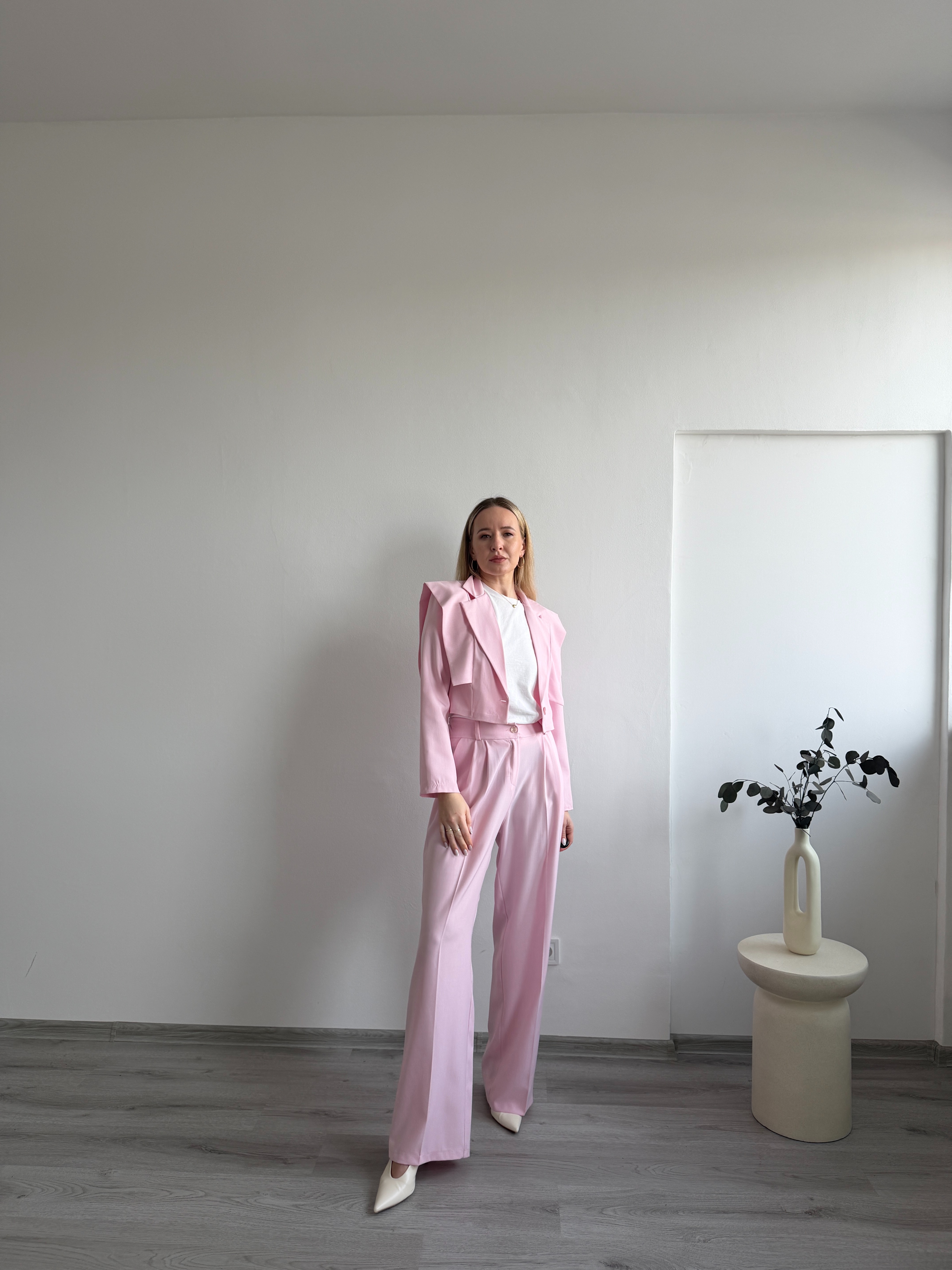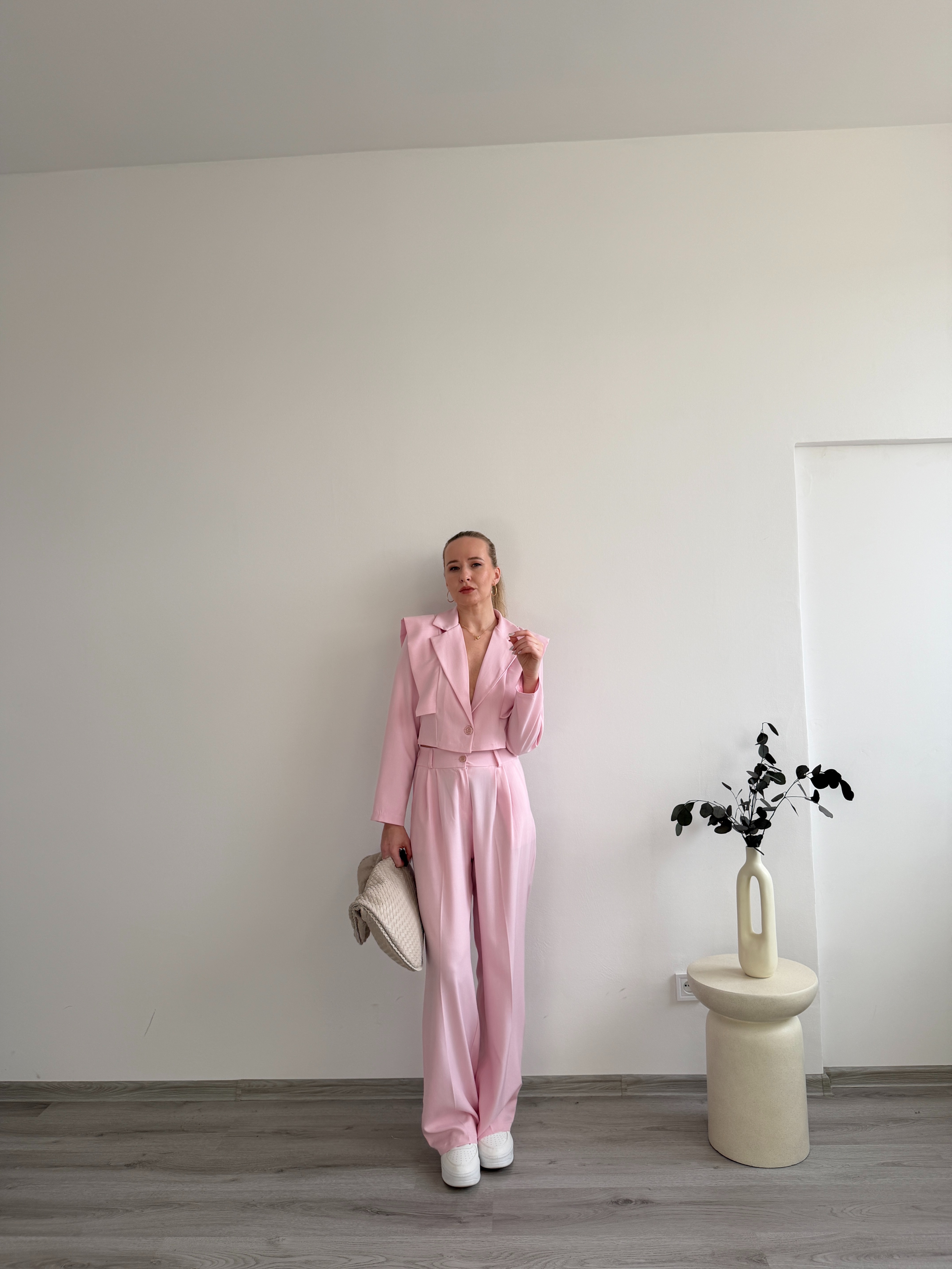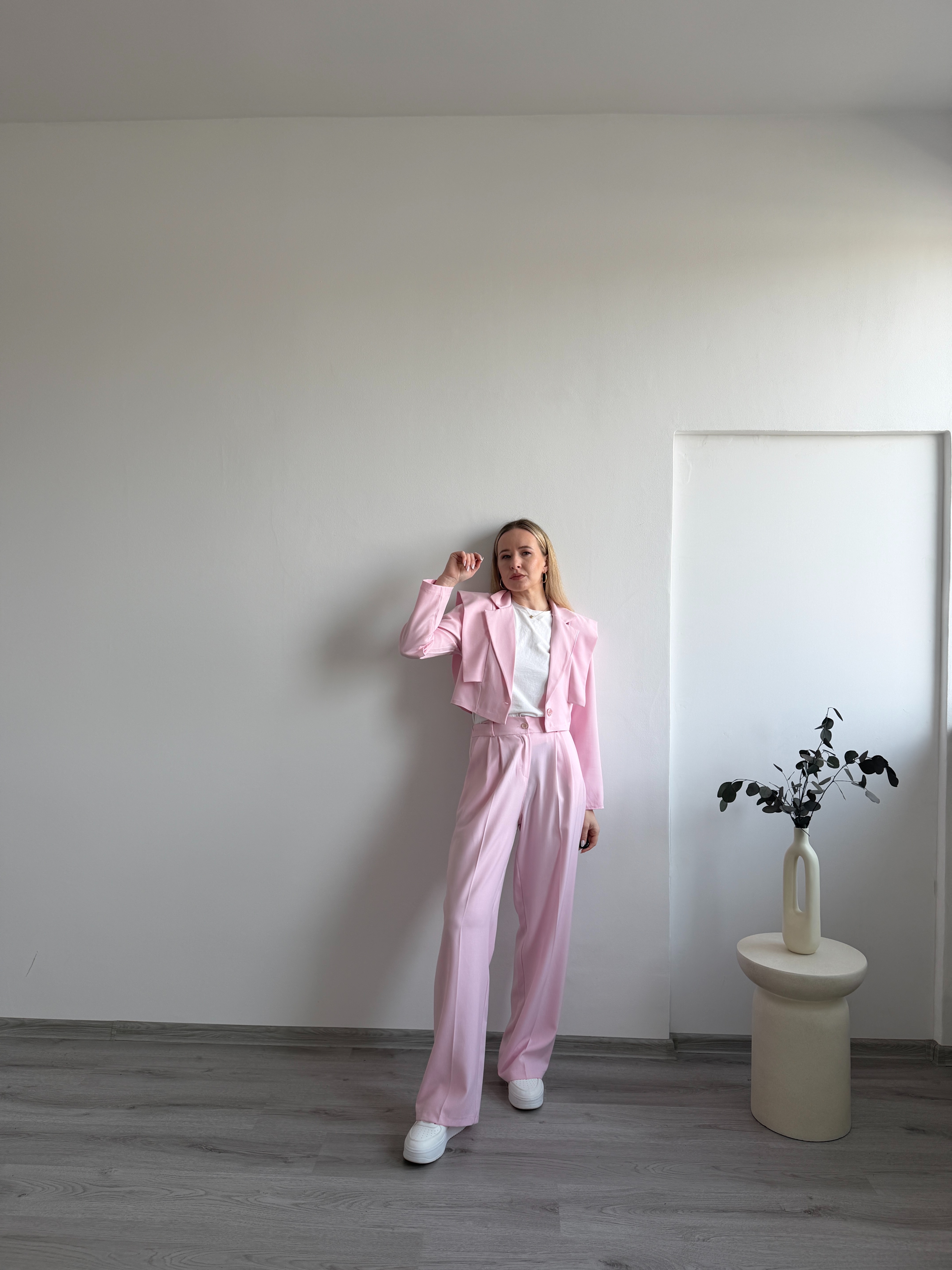Štýlový kostým v jemnej rúžovej farbe pozostávajúci z krátkeho saka a voľných nohavíc s vysokým pásom so zapínaním na gombík, zo zadnej strany nohavíc je guma. Pohodlný, no zároveň elegantný komplet vhodný na oslavy, pracovné stretnutia či špeciálne príležitosti. Modelka má výšku 170cm, nosí veľkosť S.