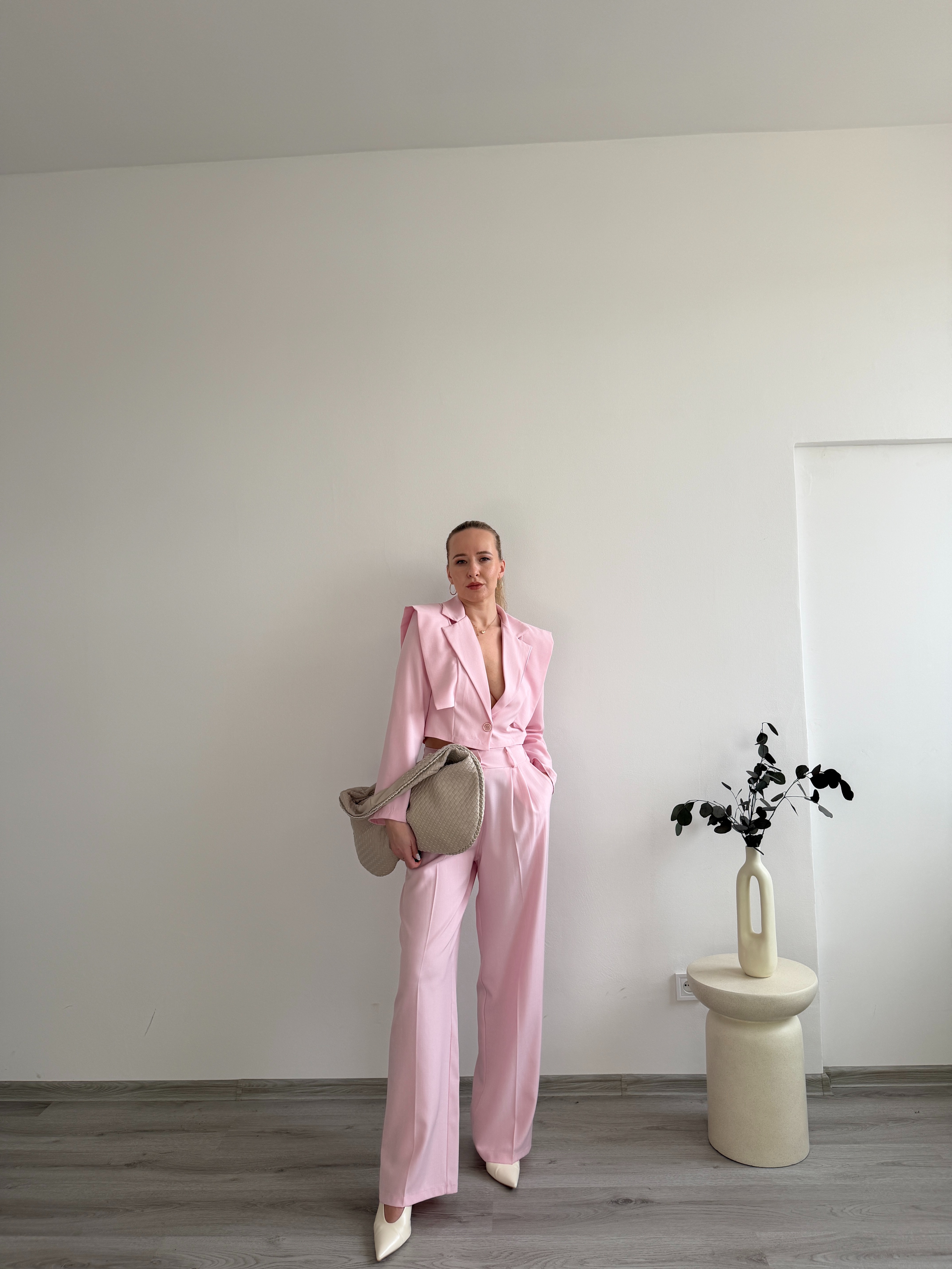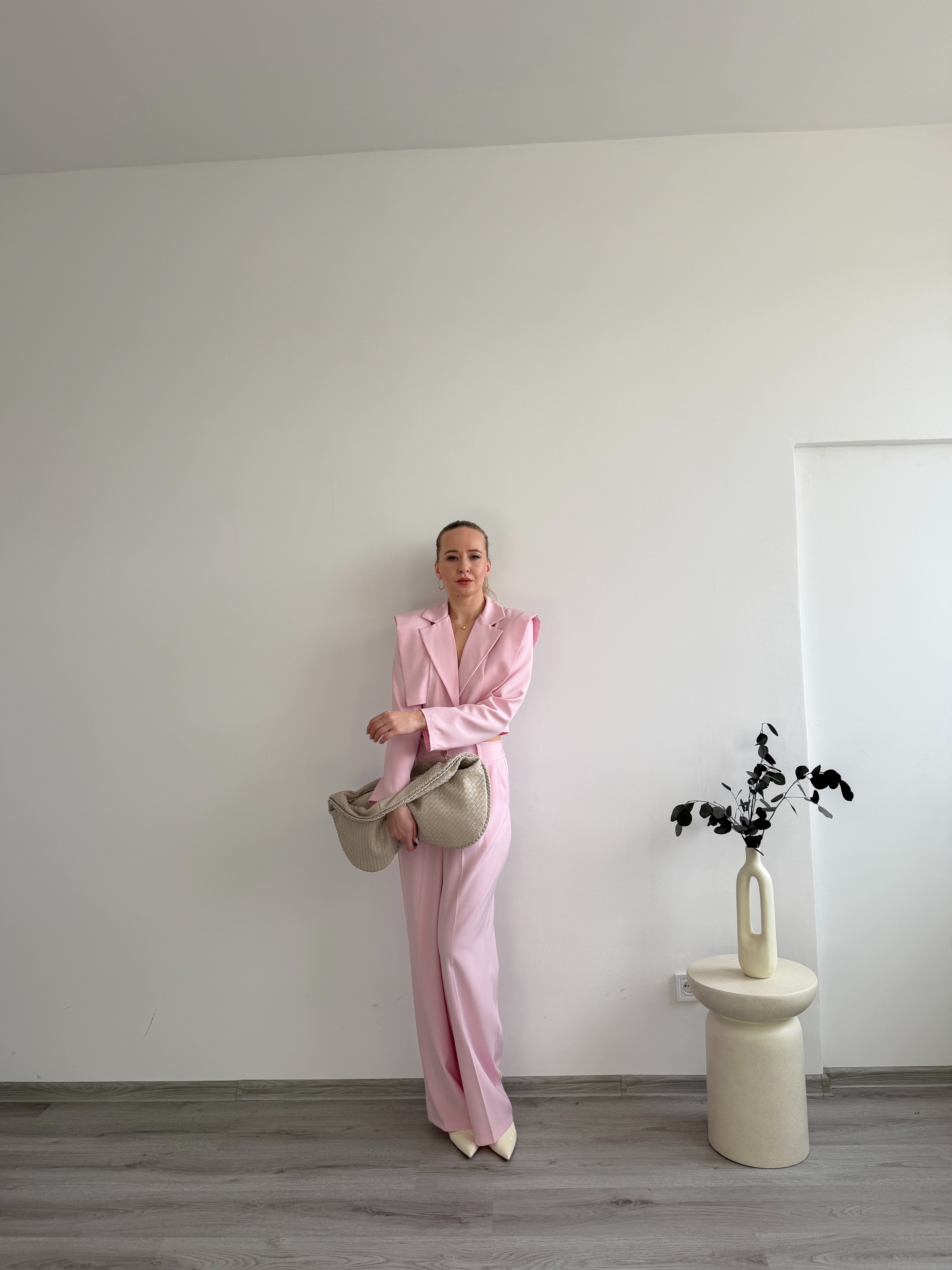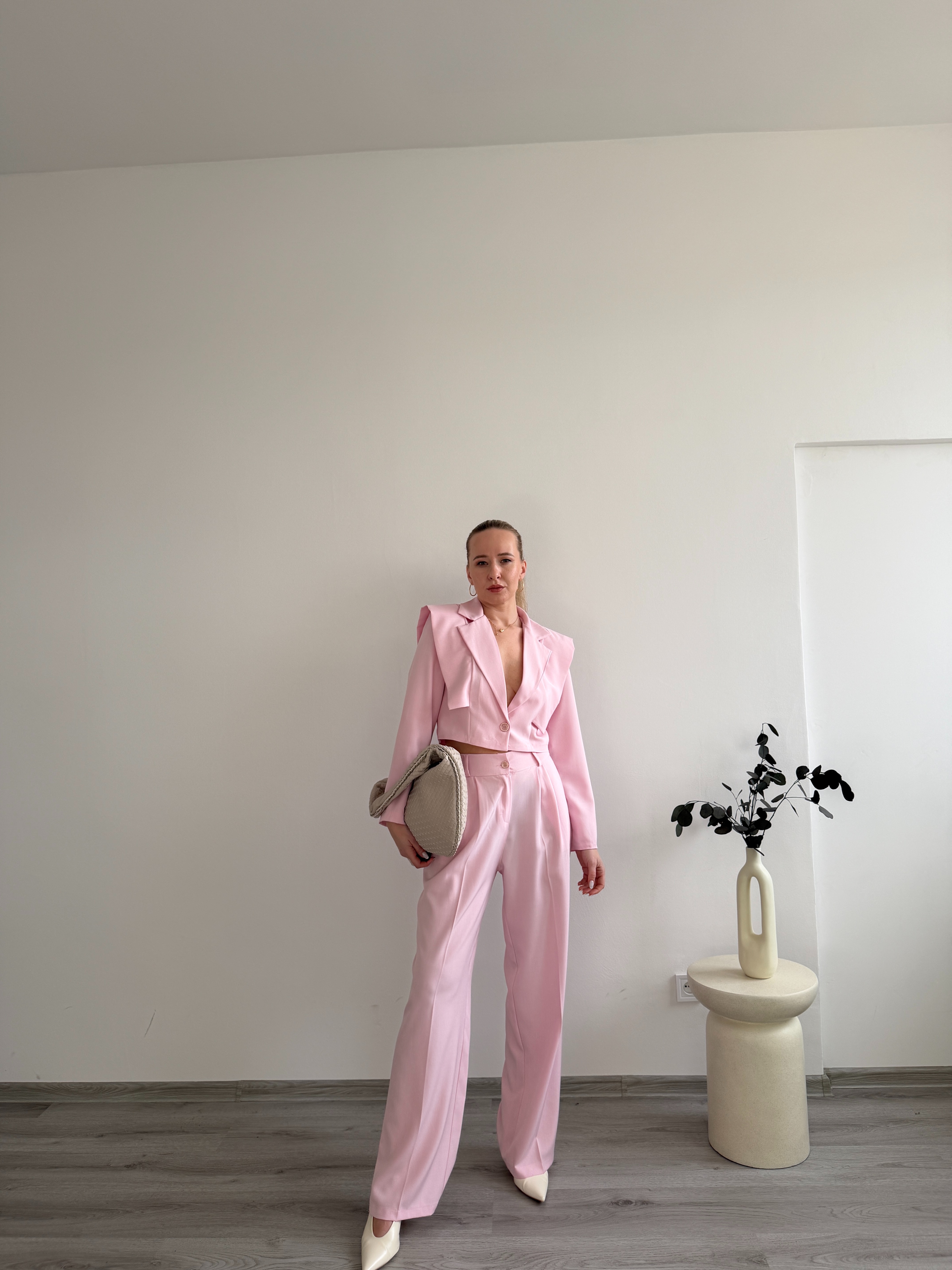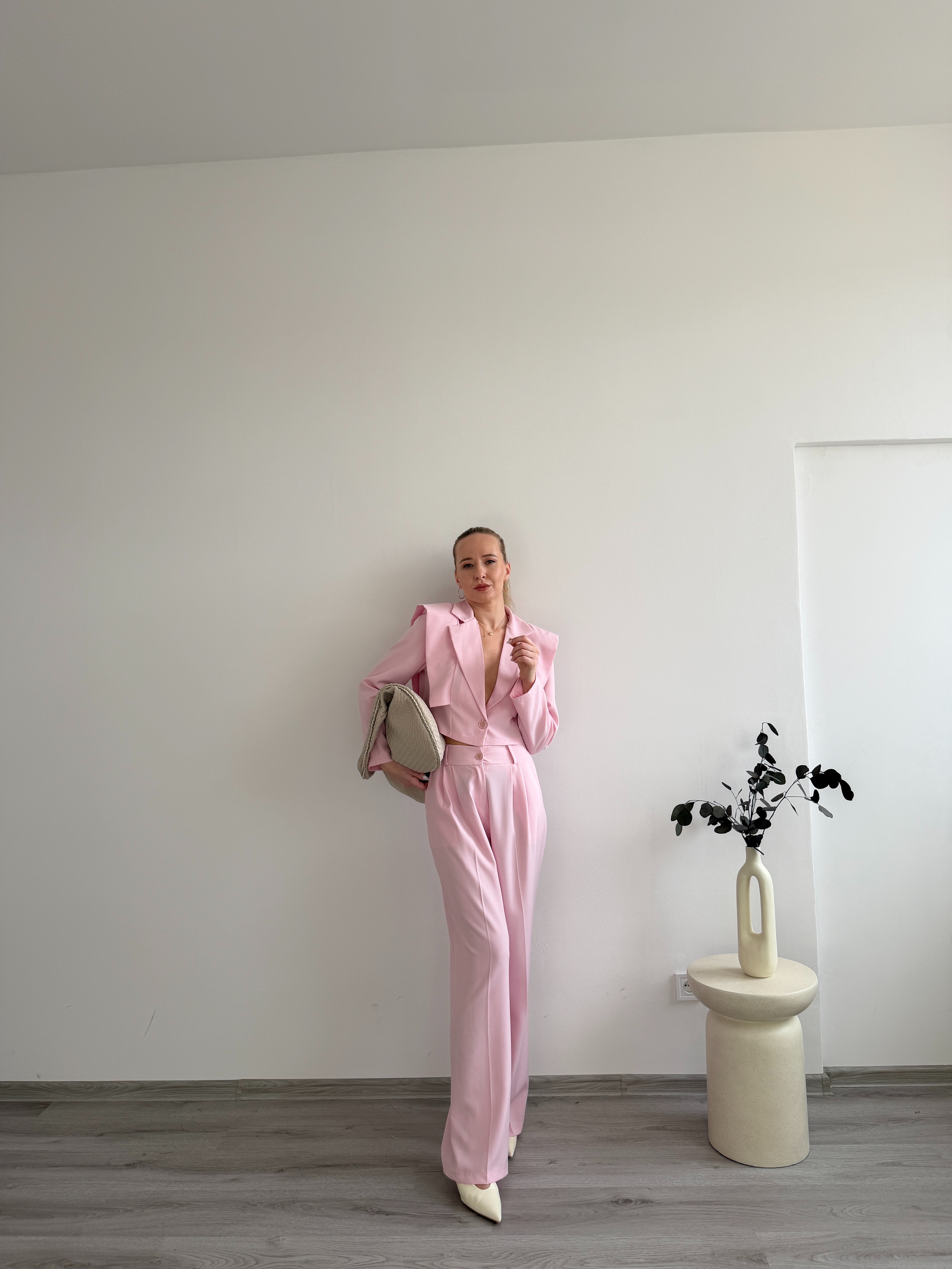 Štýlový kostým v jemnej rúžovej farbe pozostávajúci z krátkeho saka a voľných nohavíc s vysokým pásom so zapínaním na gombík, zo zadnej strany nohavíc je guma. Pohodlný, no zároveň elegantný komplet vhodný na oslavy, pracovné stretnutia či špeciálne príležitosti. Modelka má výšku 170cm, nosí veľkosť S.