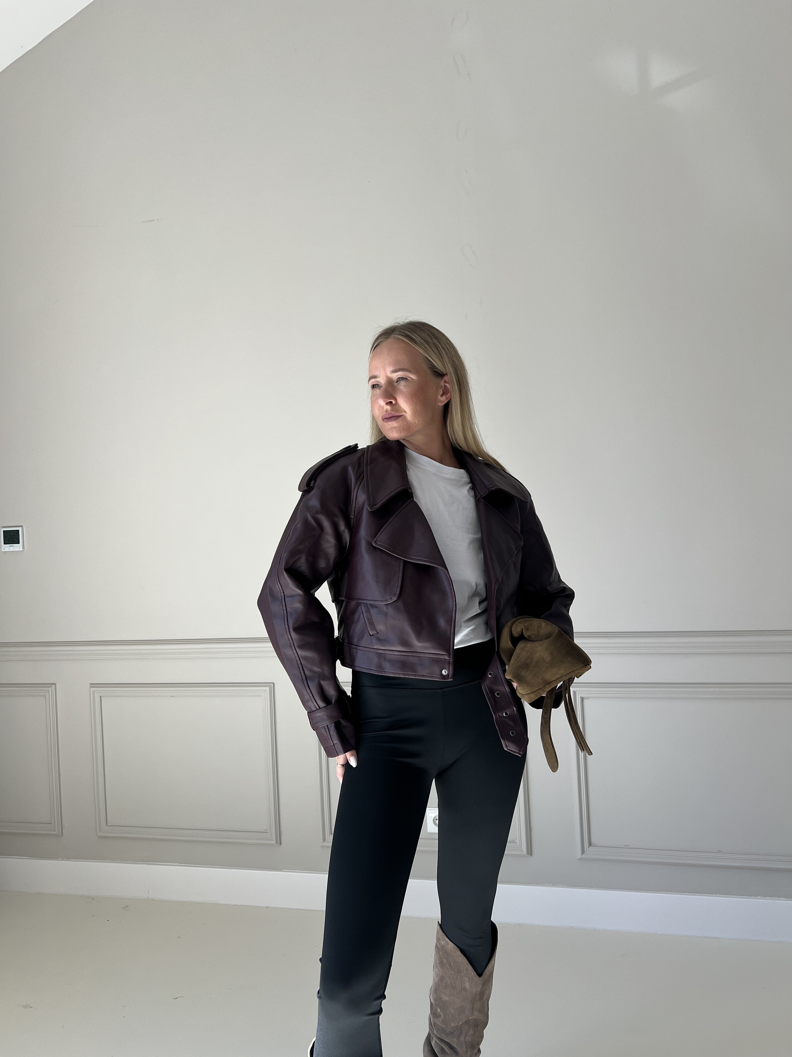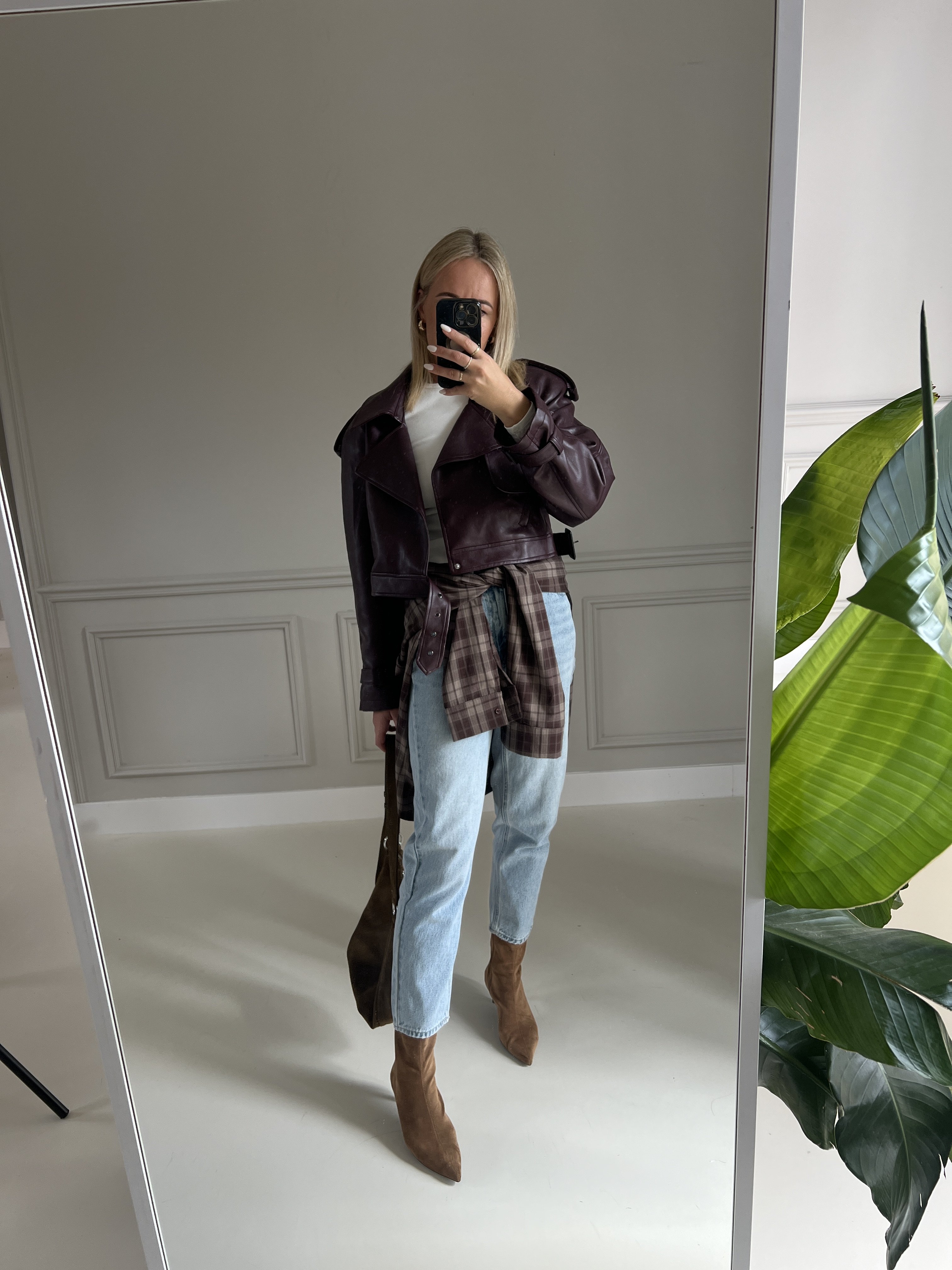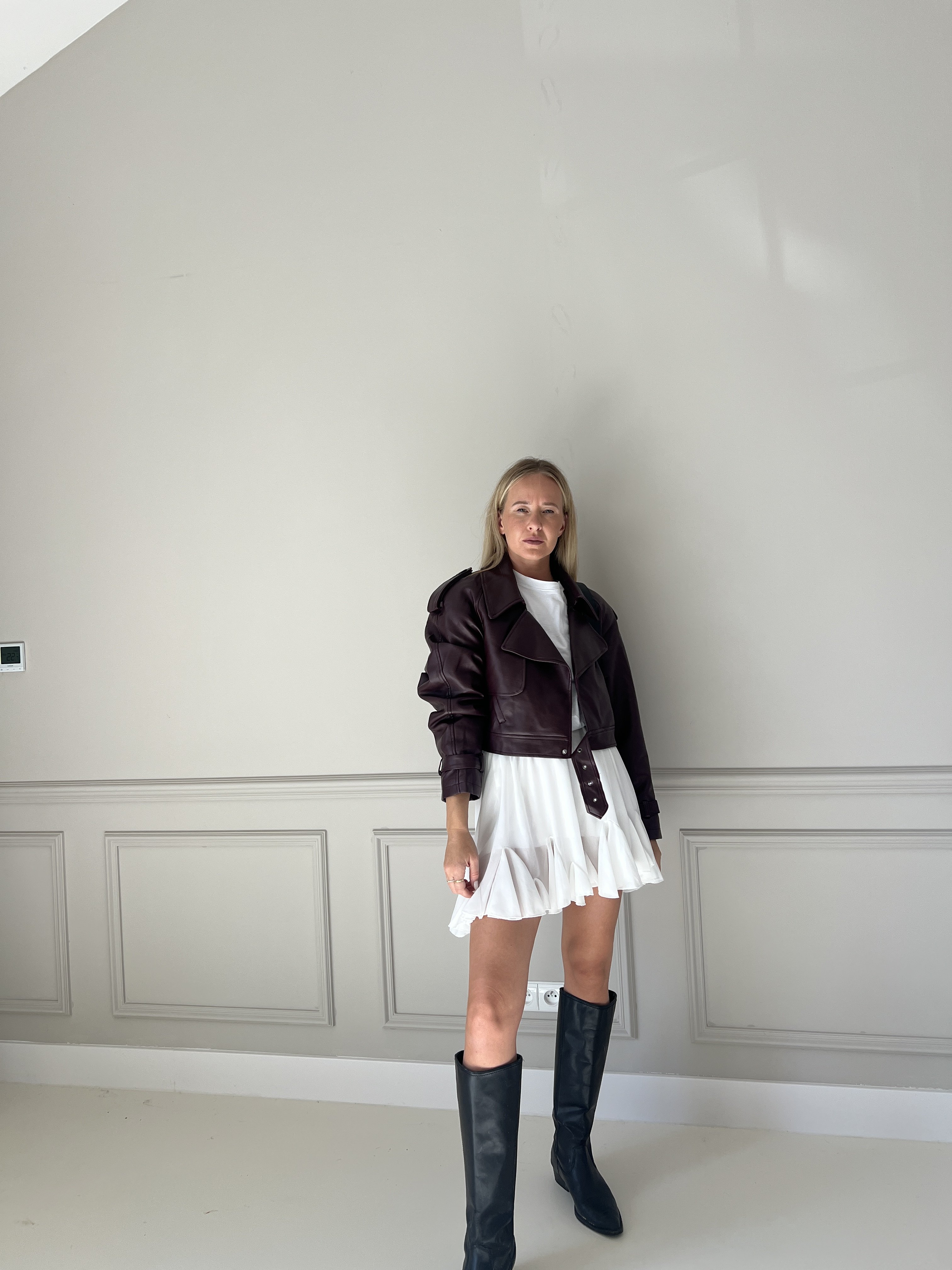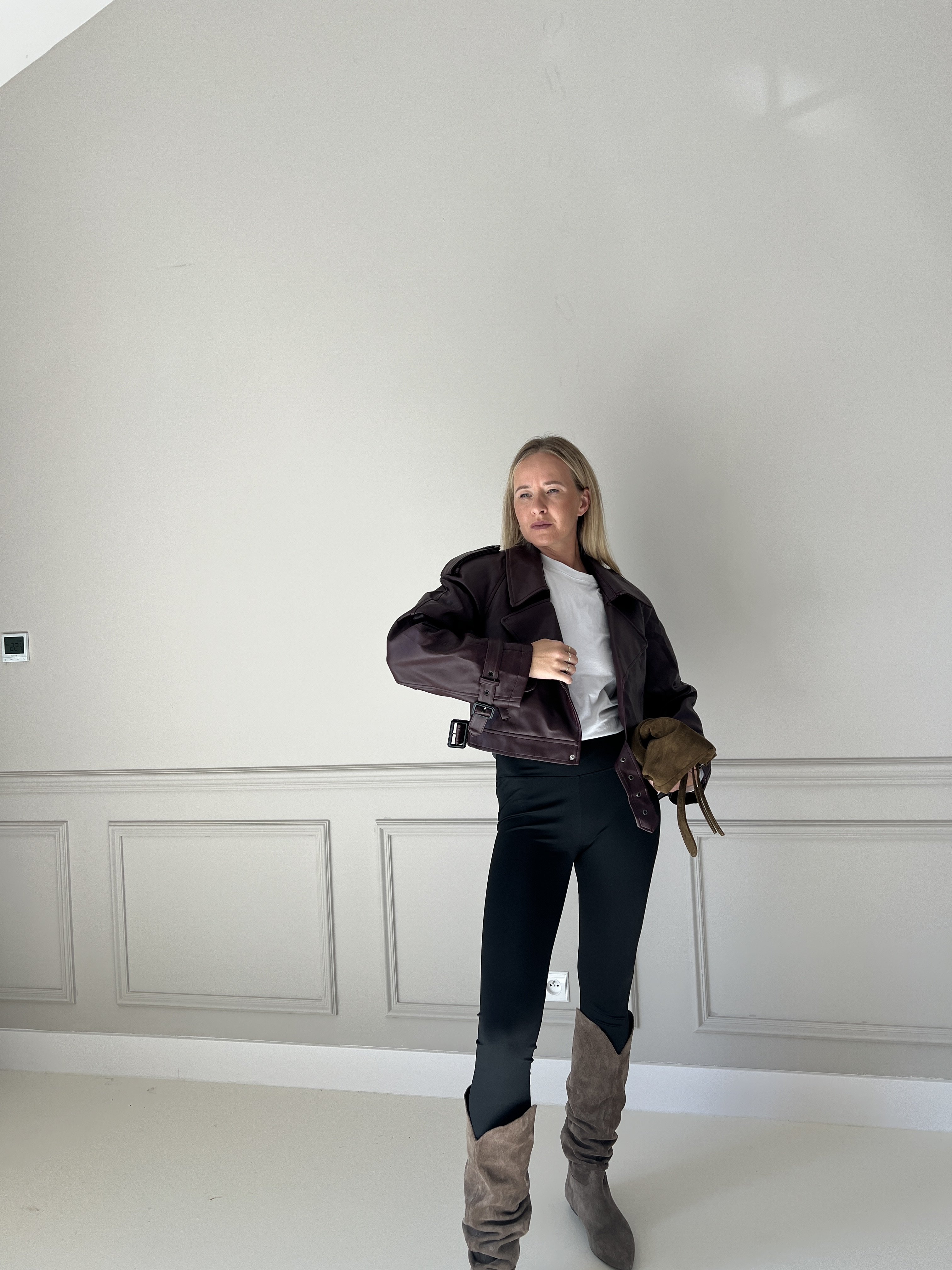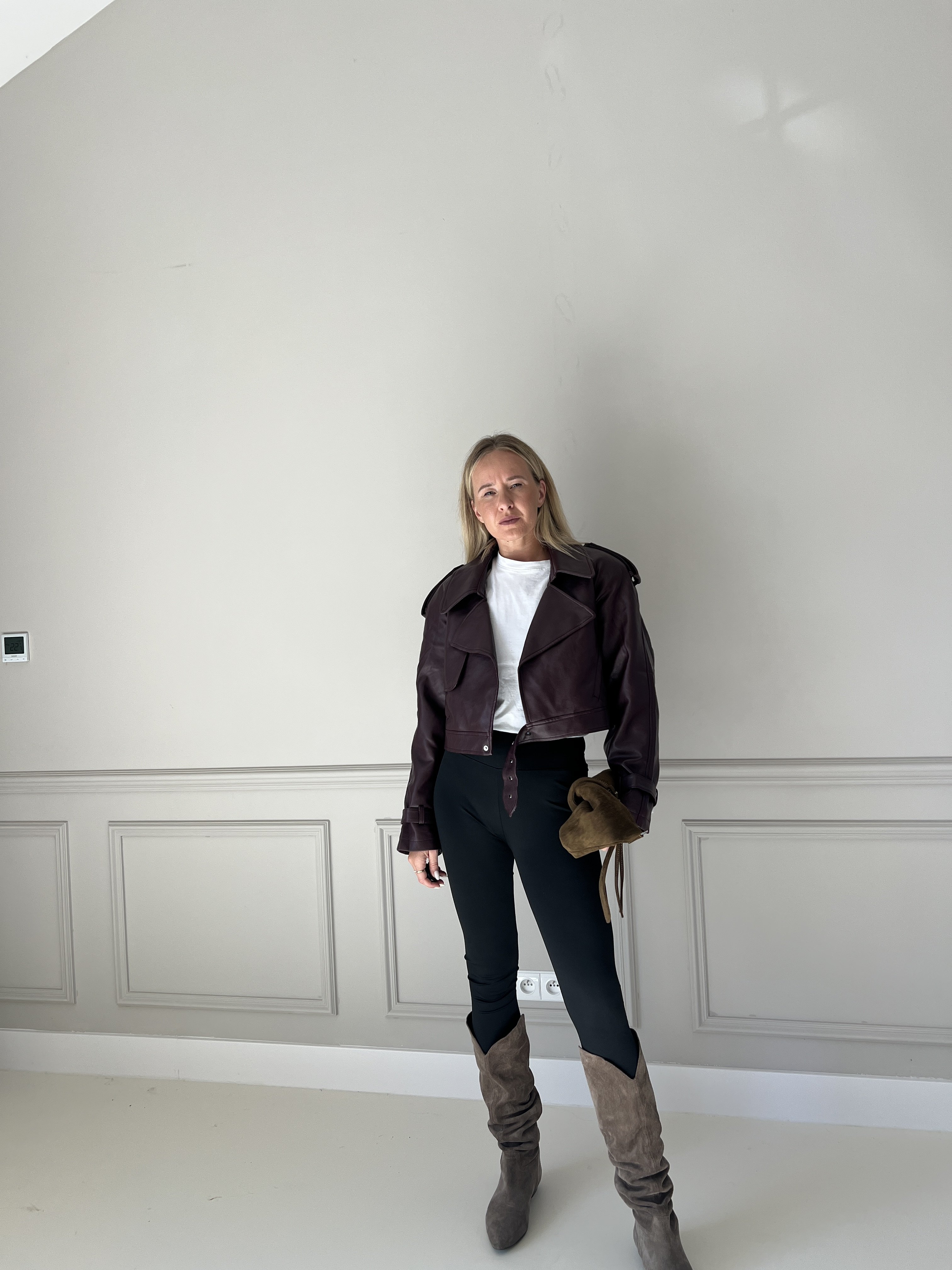 Koženková bunda v kratkom strihu so širokými klopami. Bunda má bočné vrecká a pútka na rukávoch. Modelka má výšku 170cm, na sebe má veľkosť S.