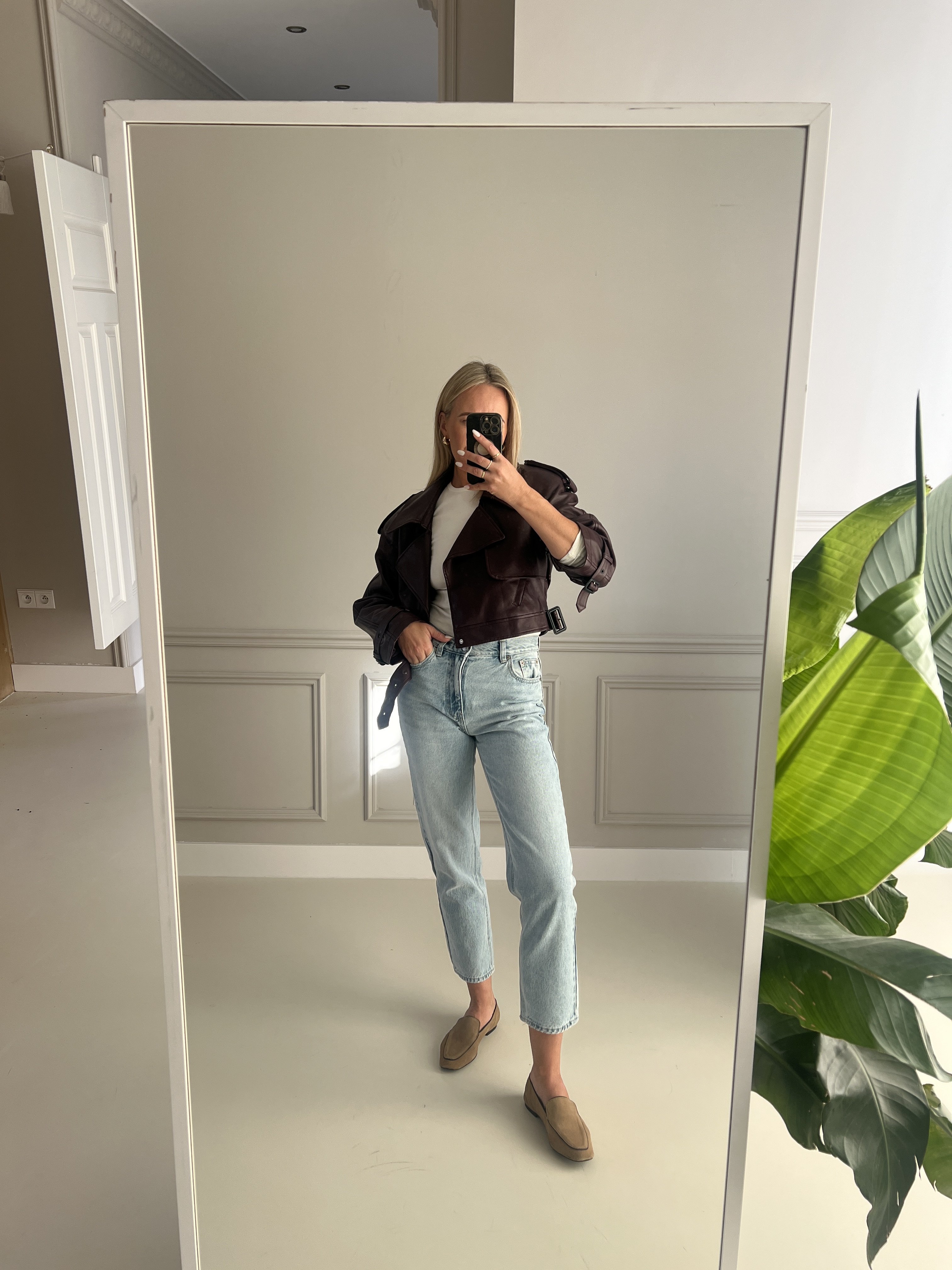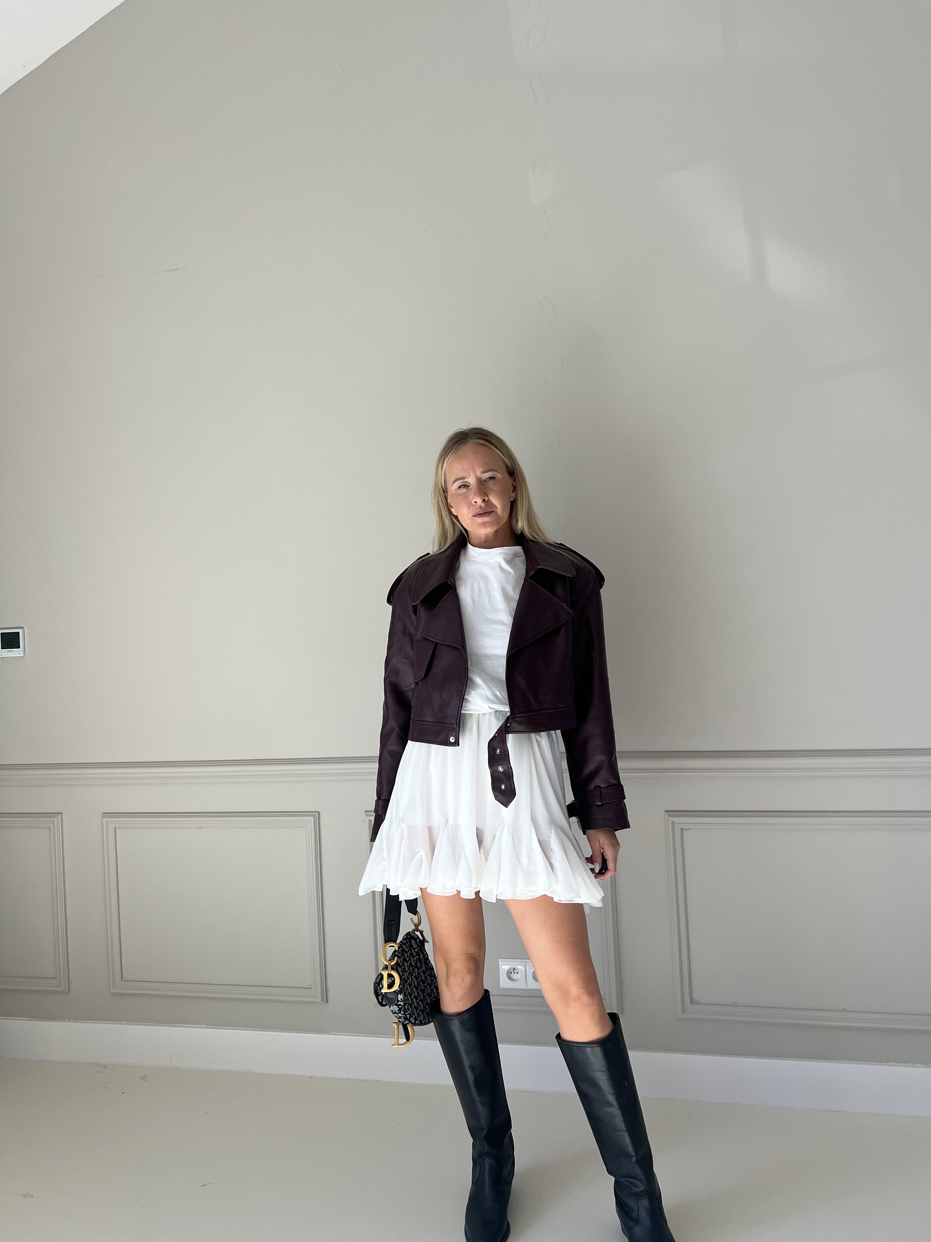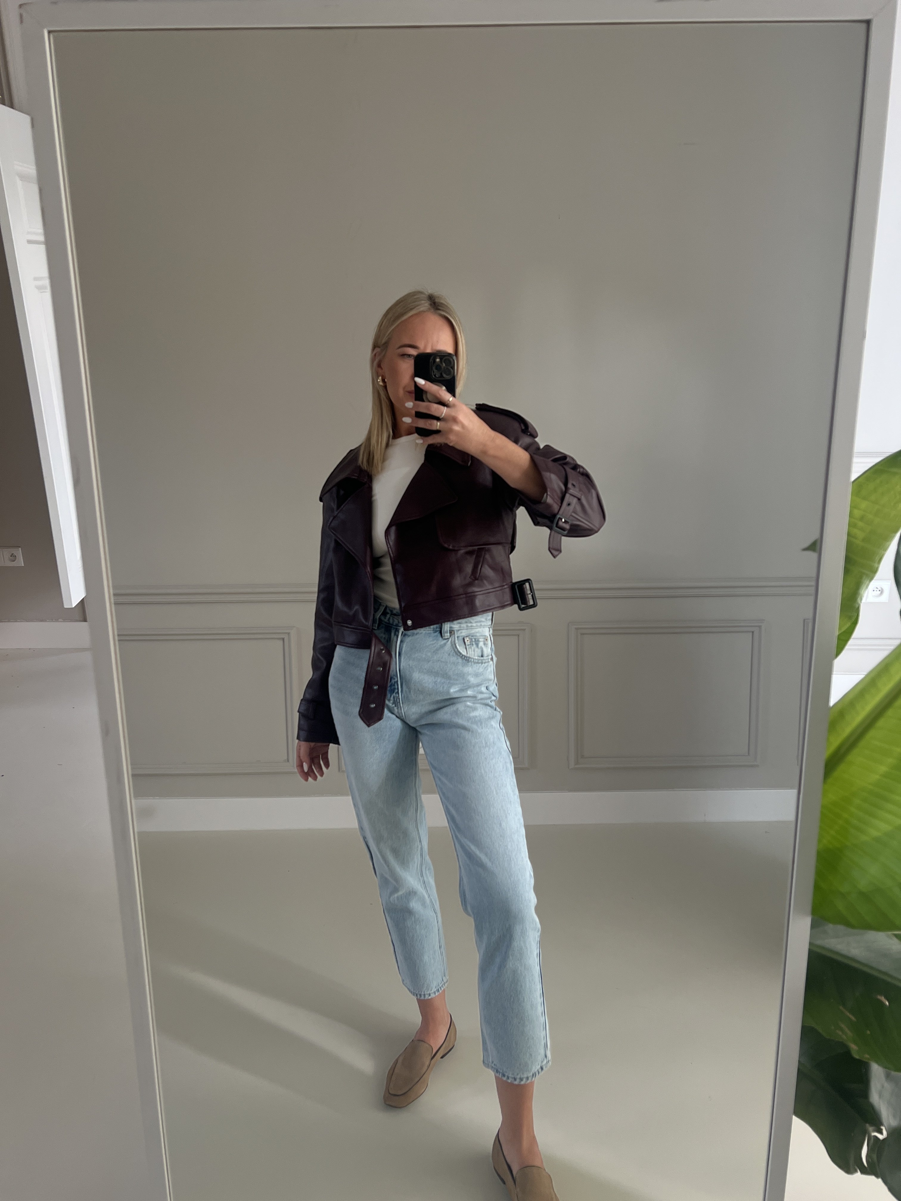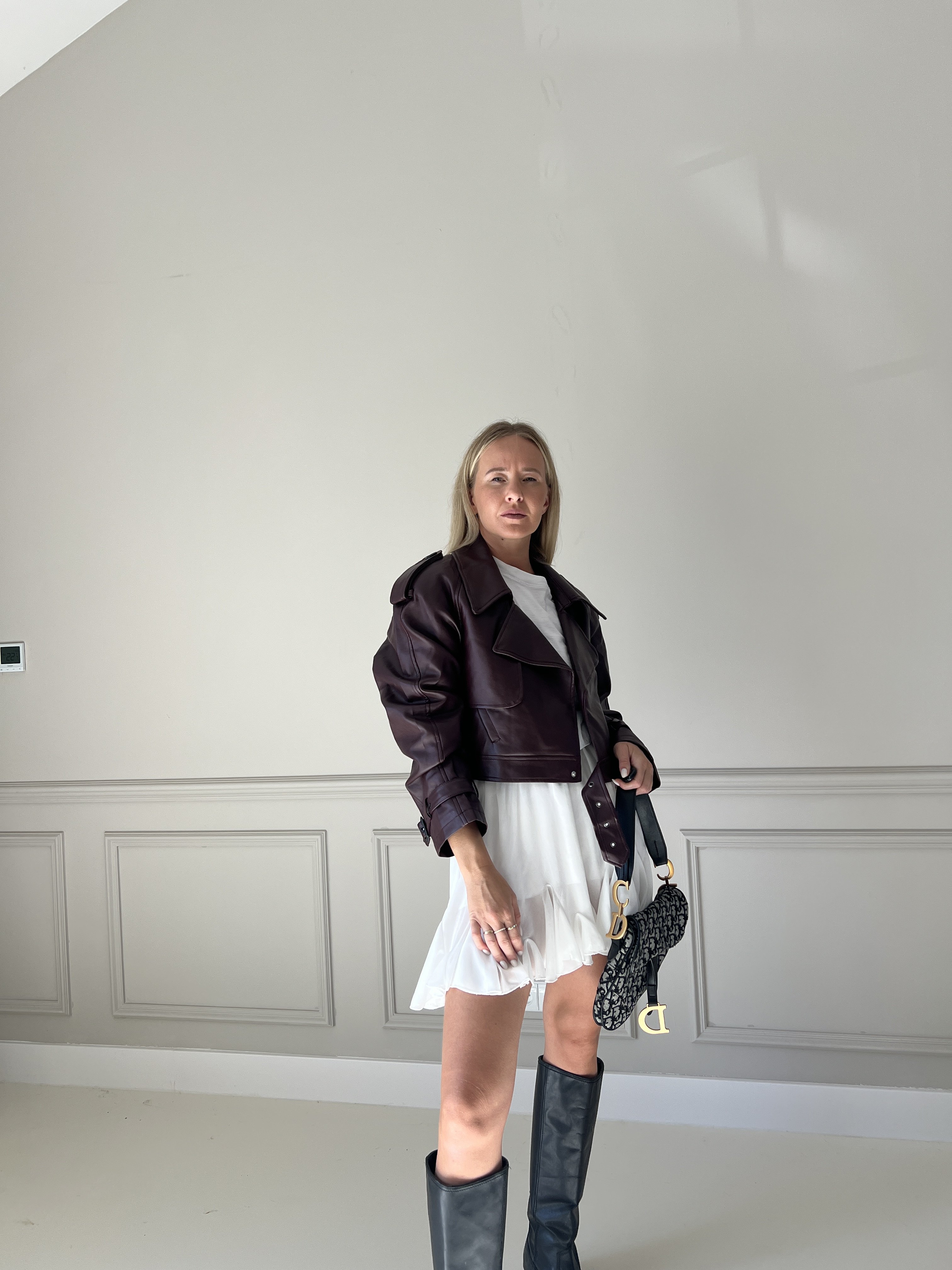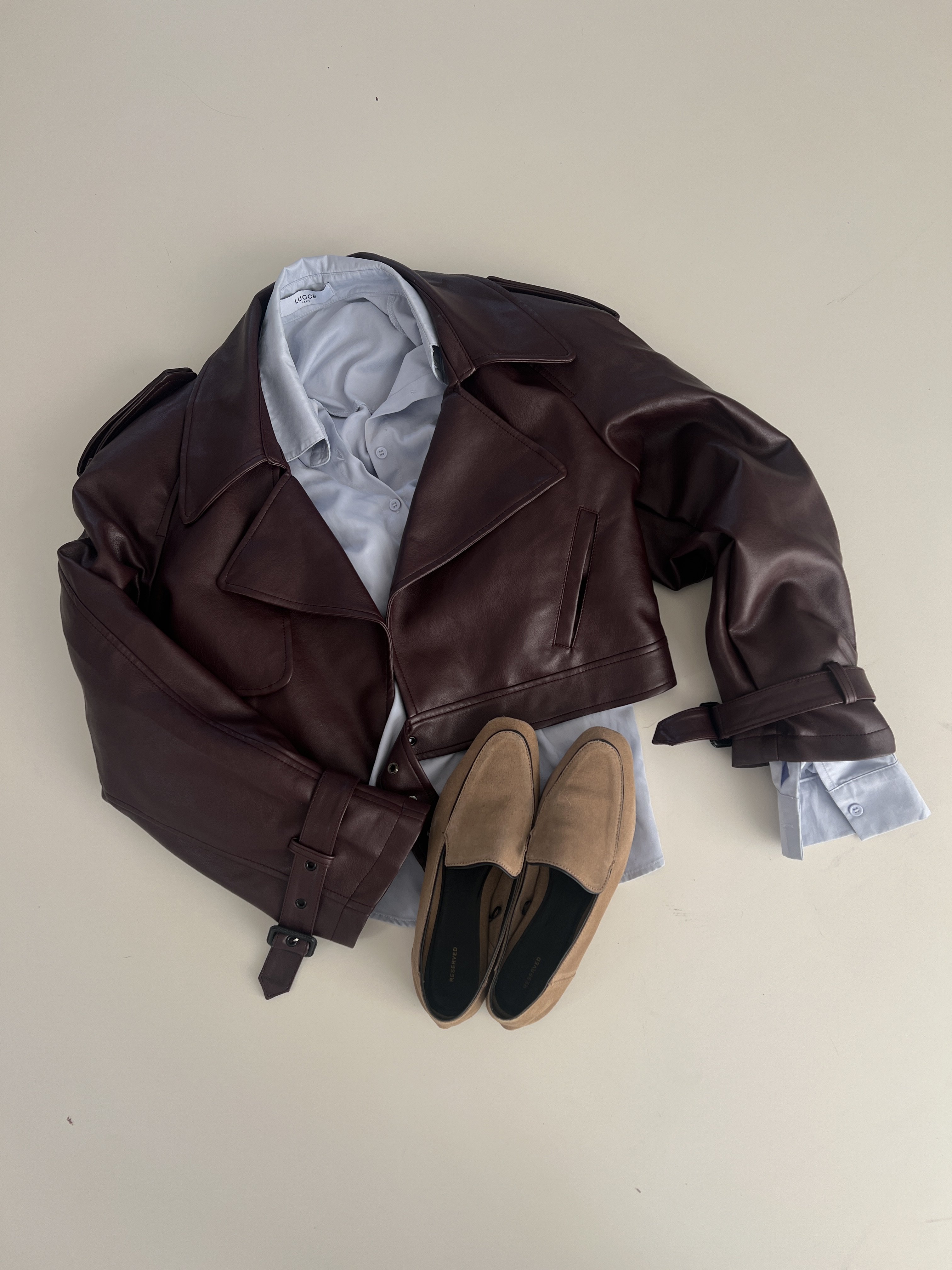 Koženková bunda v kratkom strihu so širokými klopami. Bunda má bočné vrecká a pútka na rukávoch. Modelka má výšku 170cm, na sebe má veľkosť S.