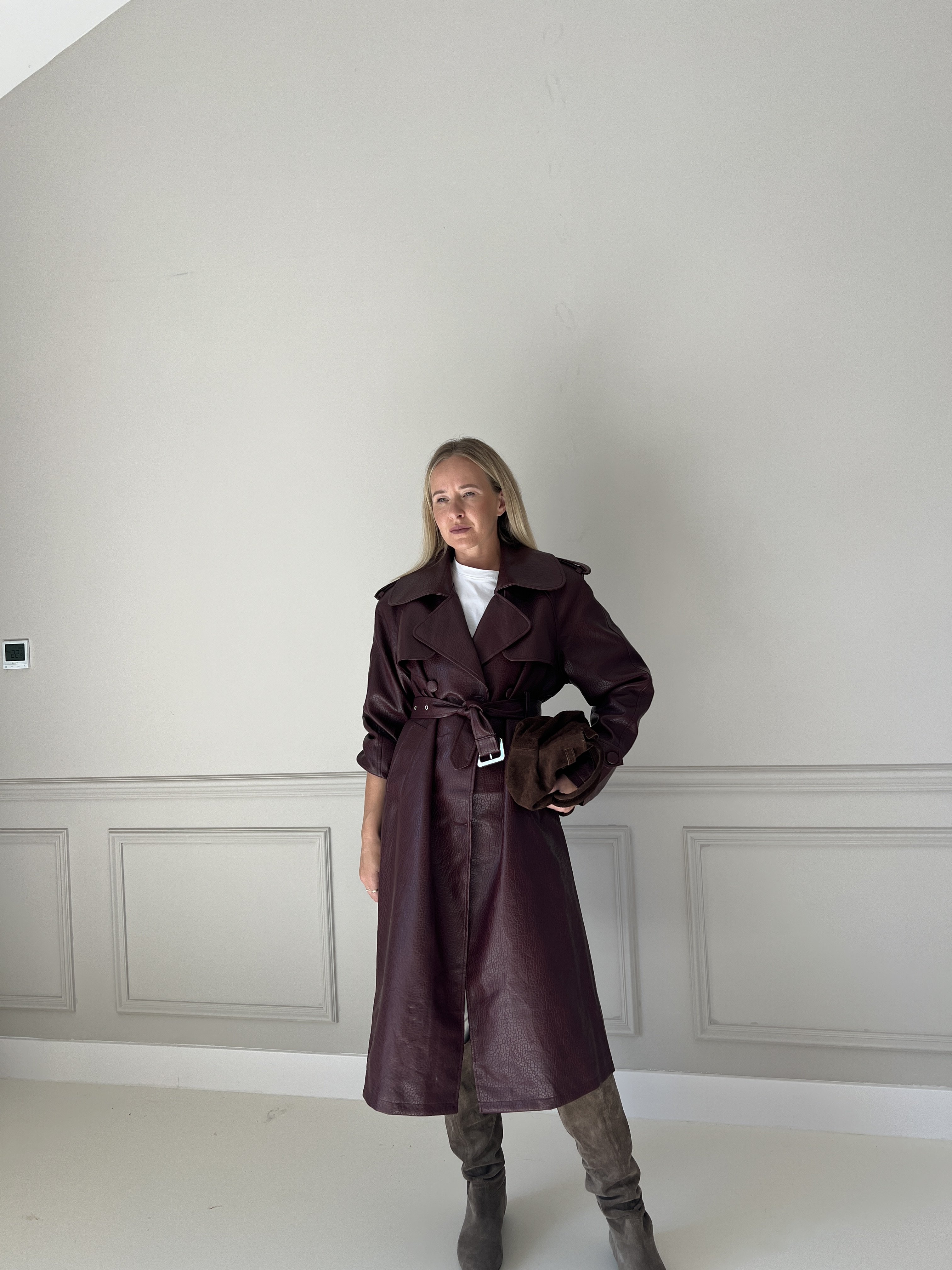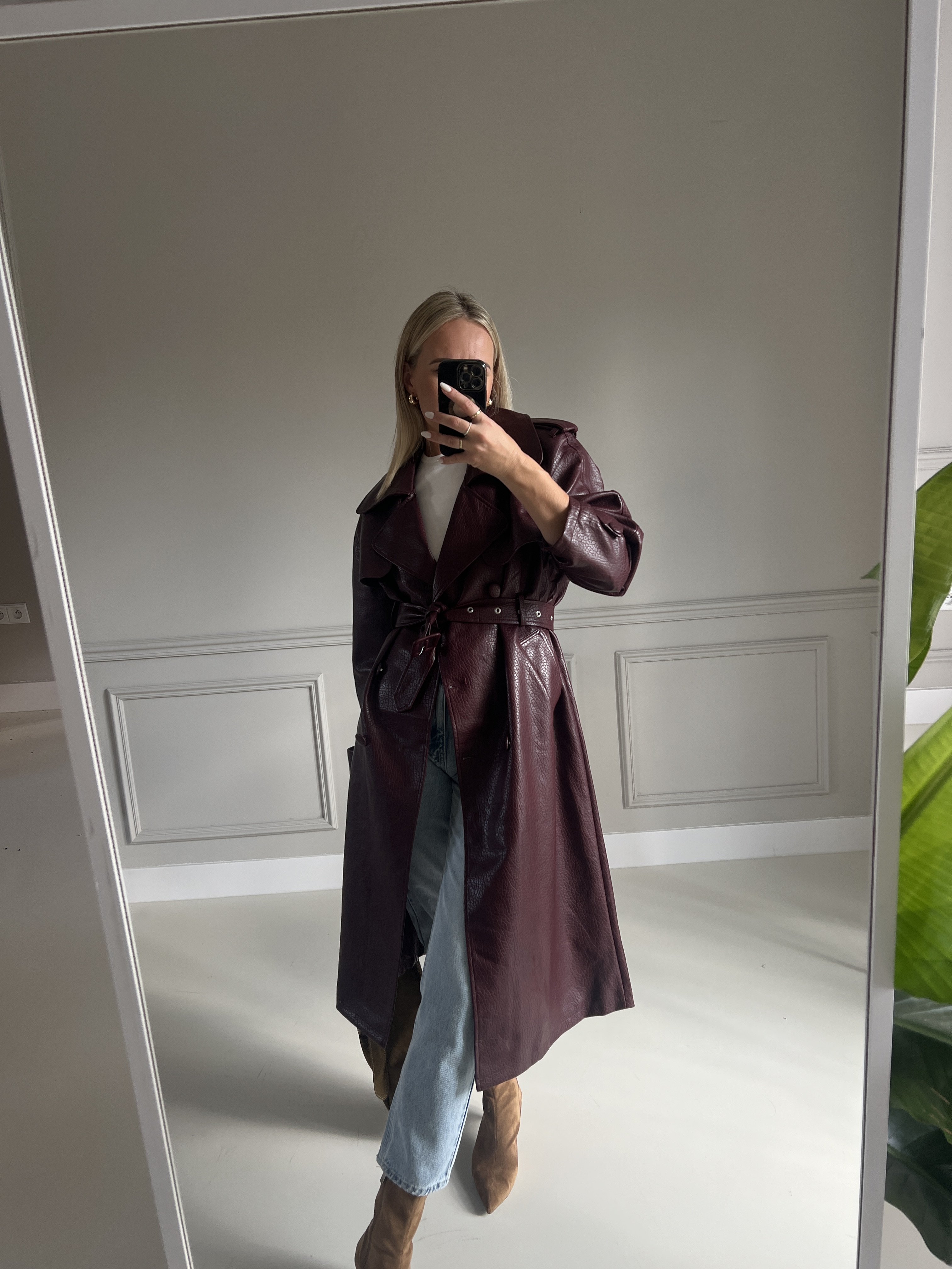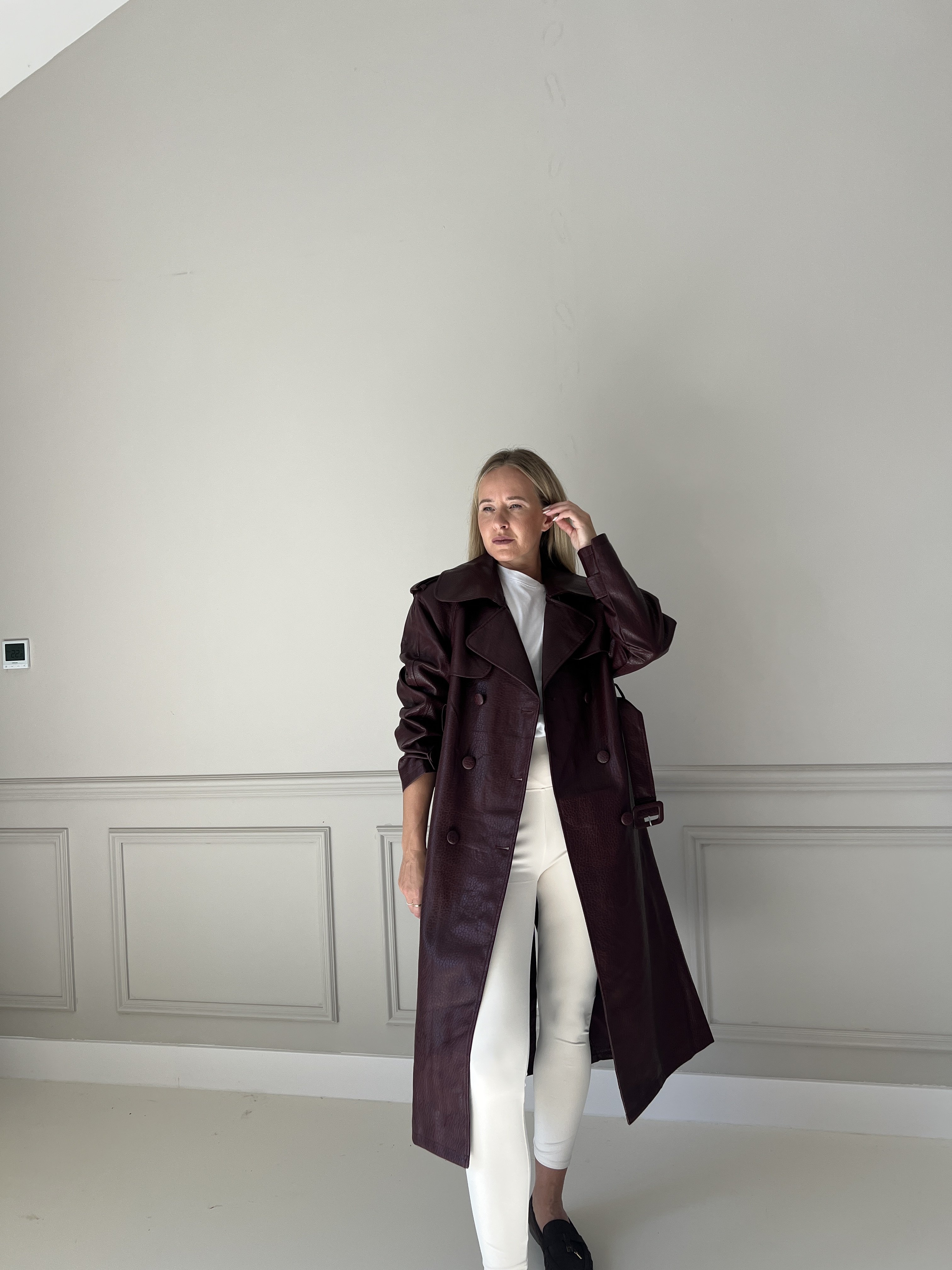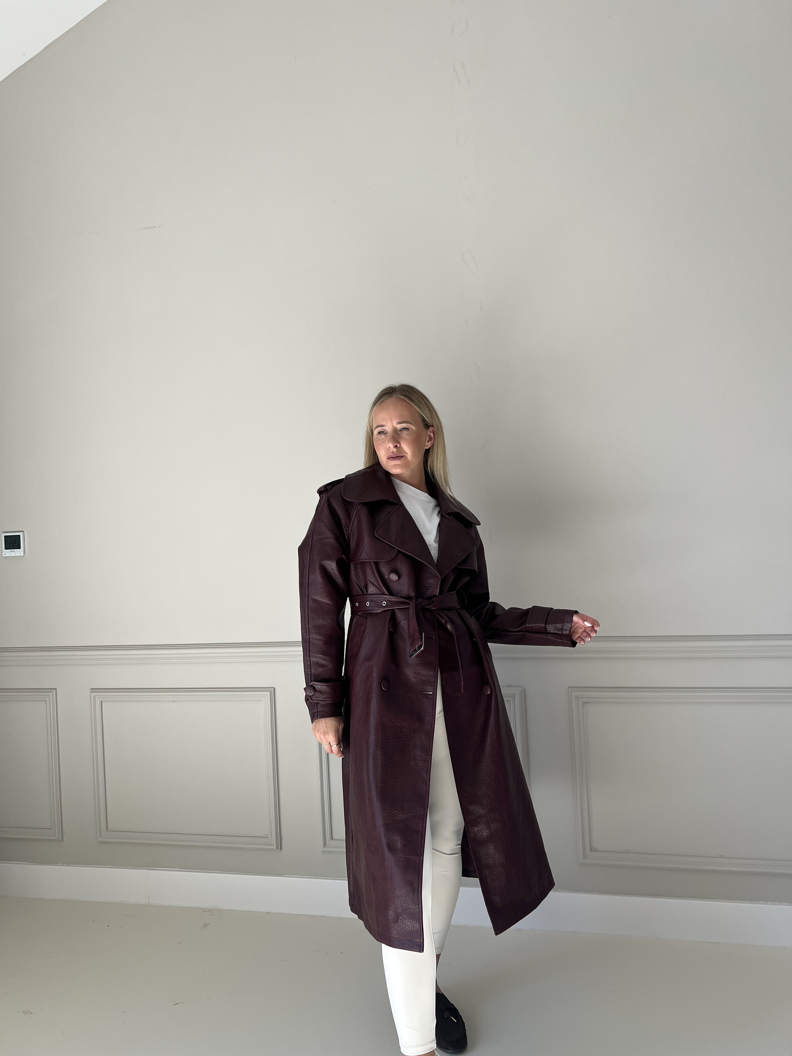 Koženkový trenchcoat s opaskom a bočnými vreckami. Kabát je z pevnejšej štruktúrovanej koženky, ktorá pekne drží svoj tvar. Modelka má výšku 170cm, na sebe má veľkosť S.