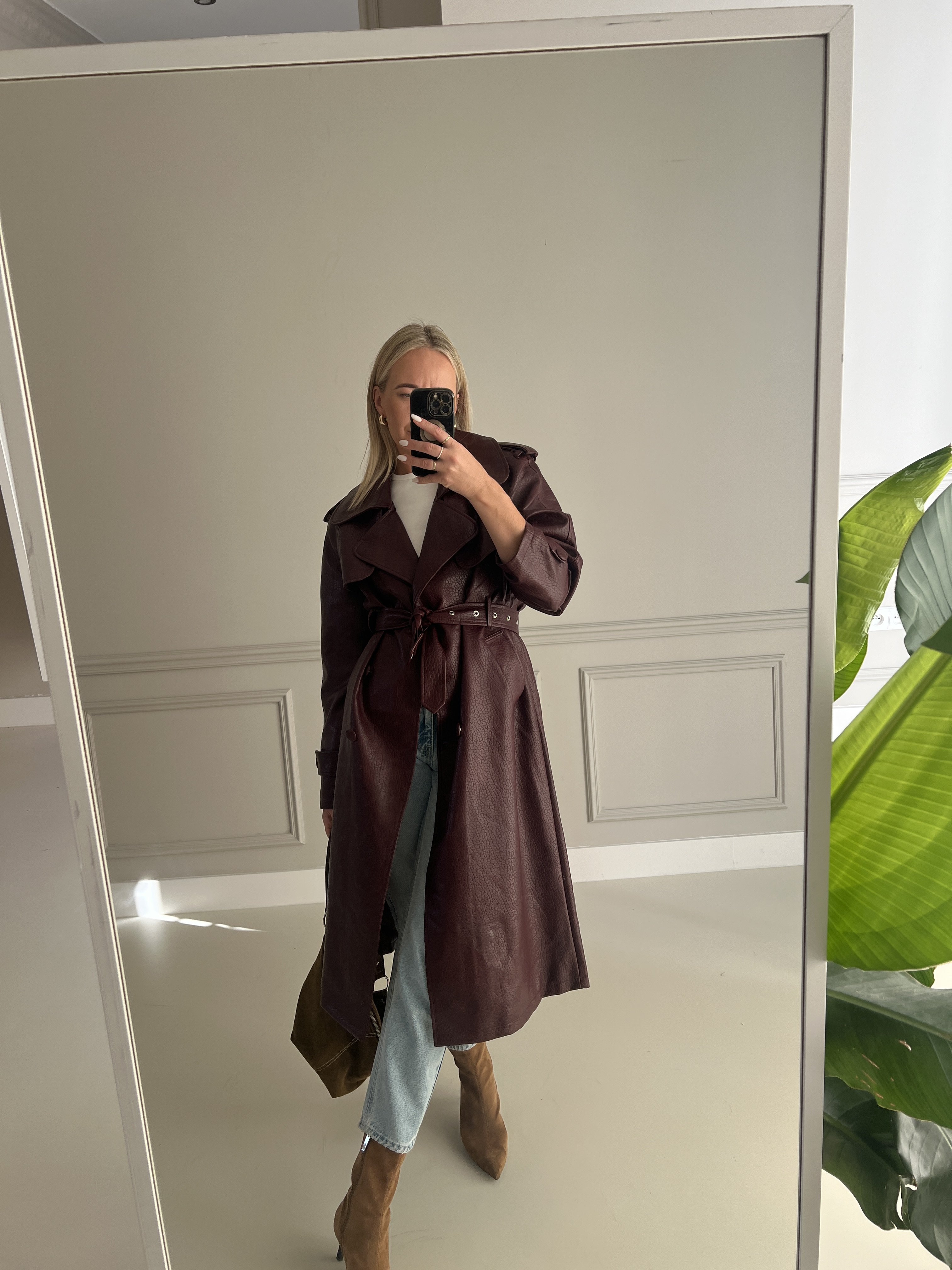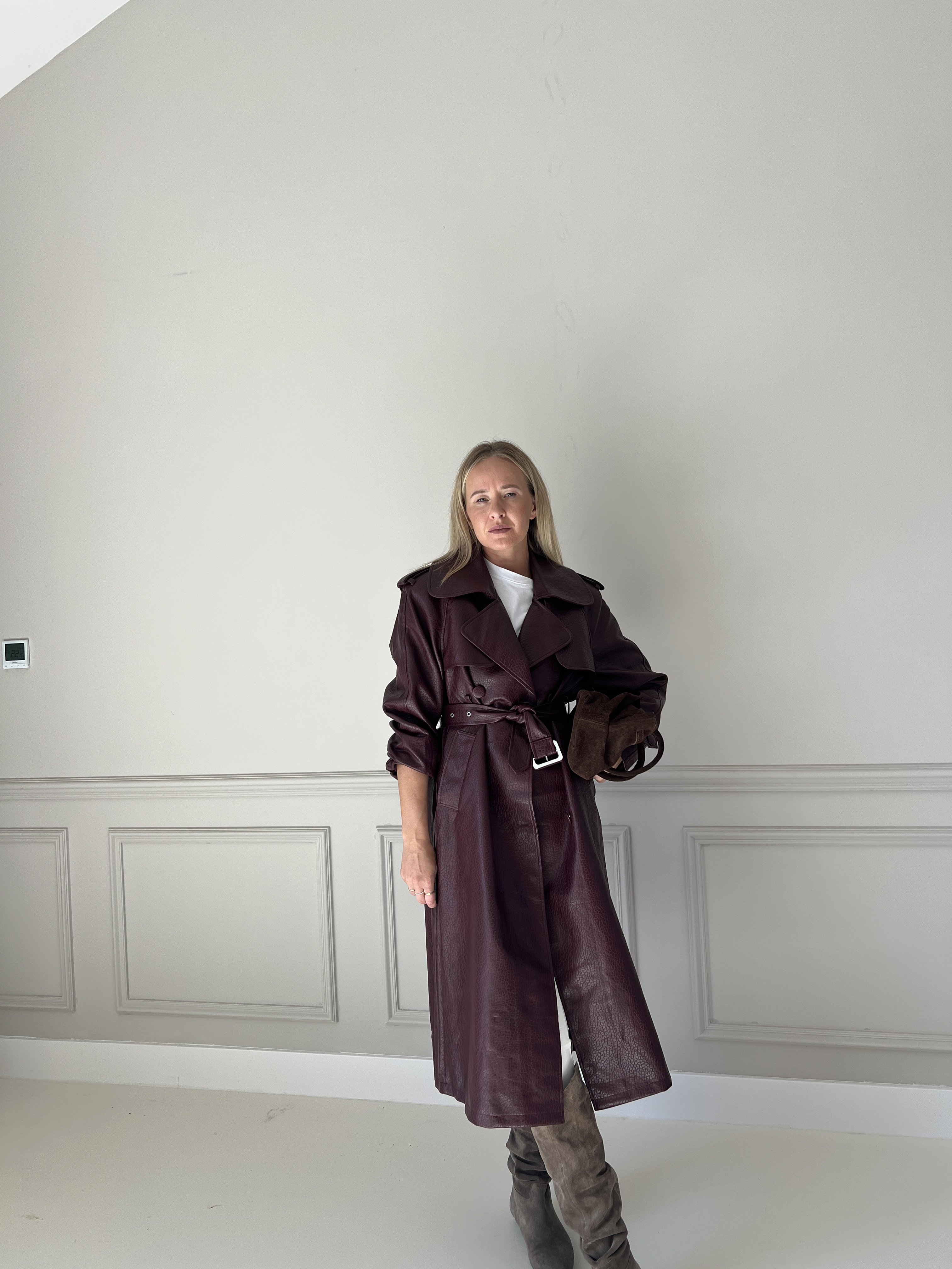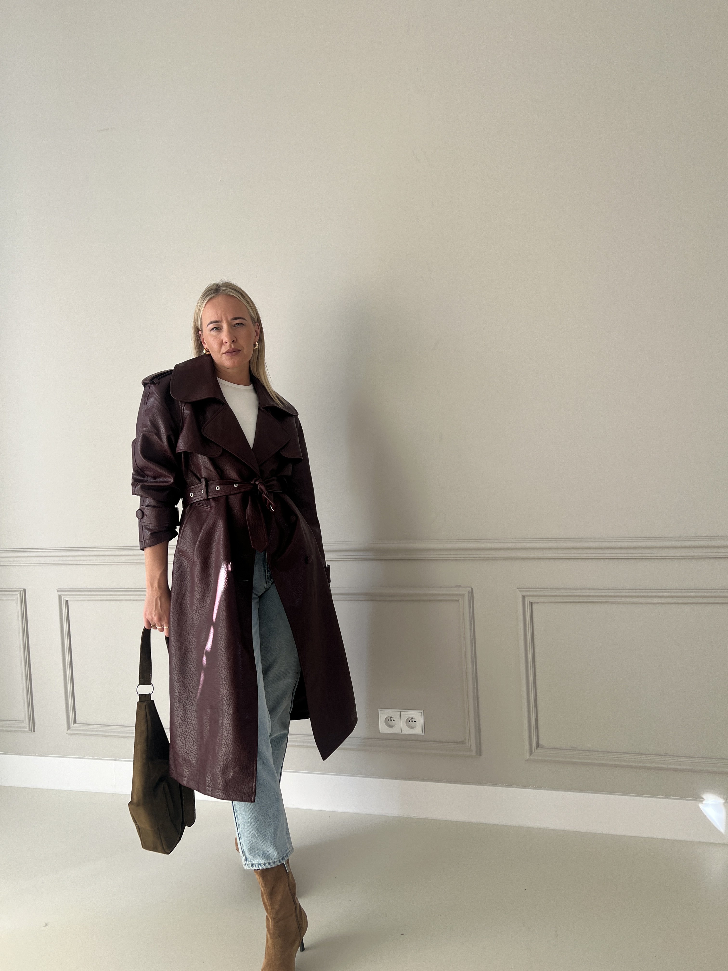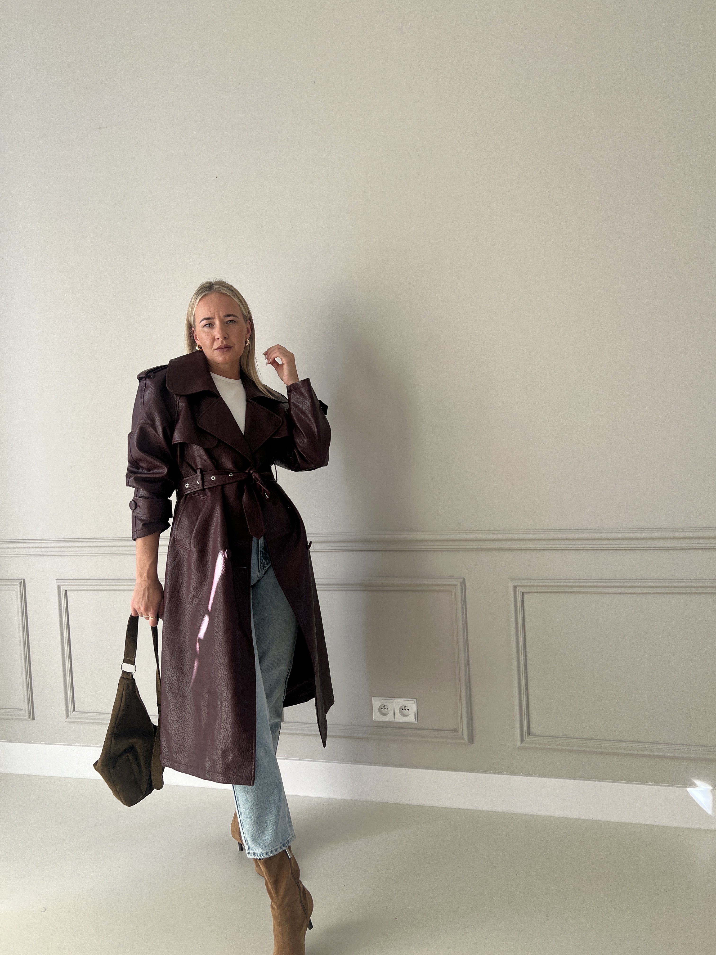 Koženkový trenchcoat s opaskom a bočnými vreckami. Kabát je z pevnejšej štruktúrovanej koženky, ktorá pekne drží svoj tvar. Modelka má výšku 170cm, na sebe má veľkosť S.
