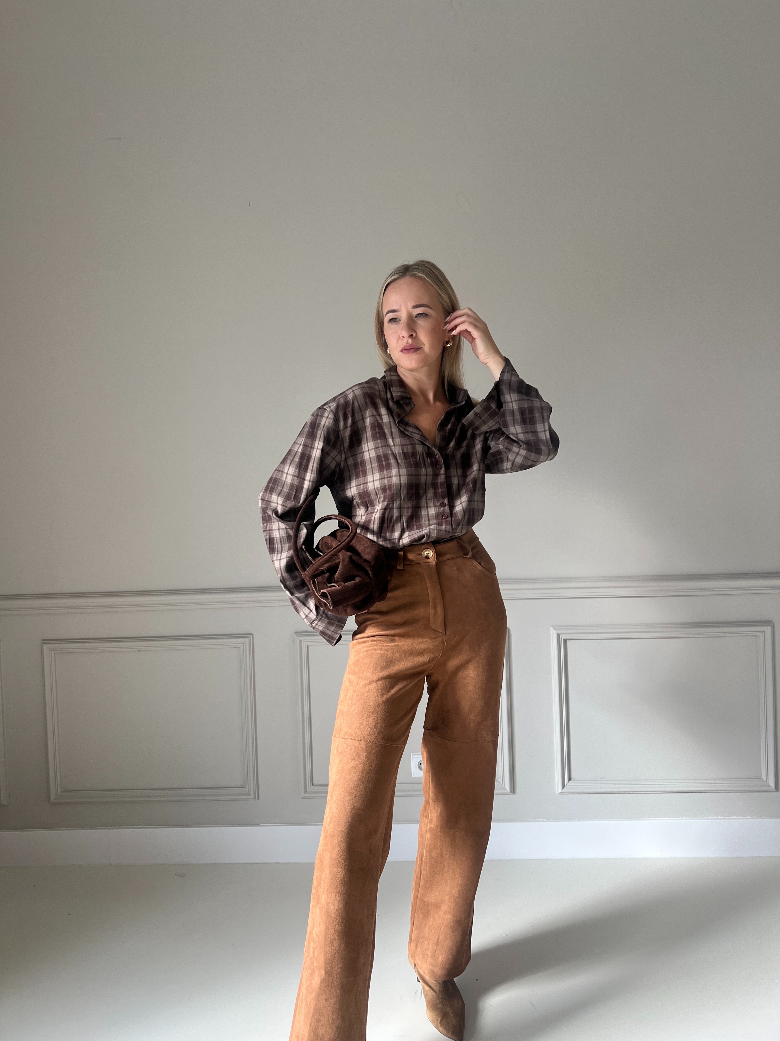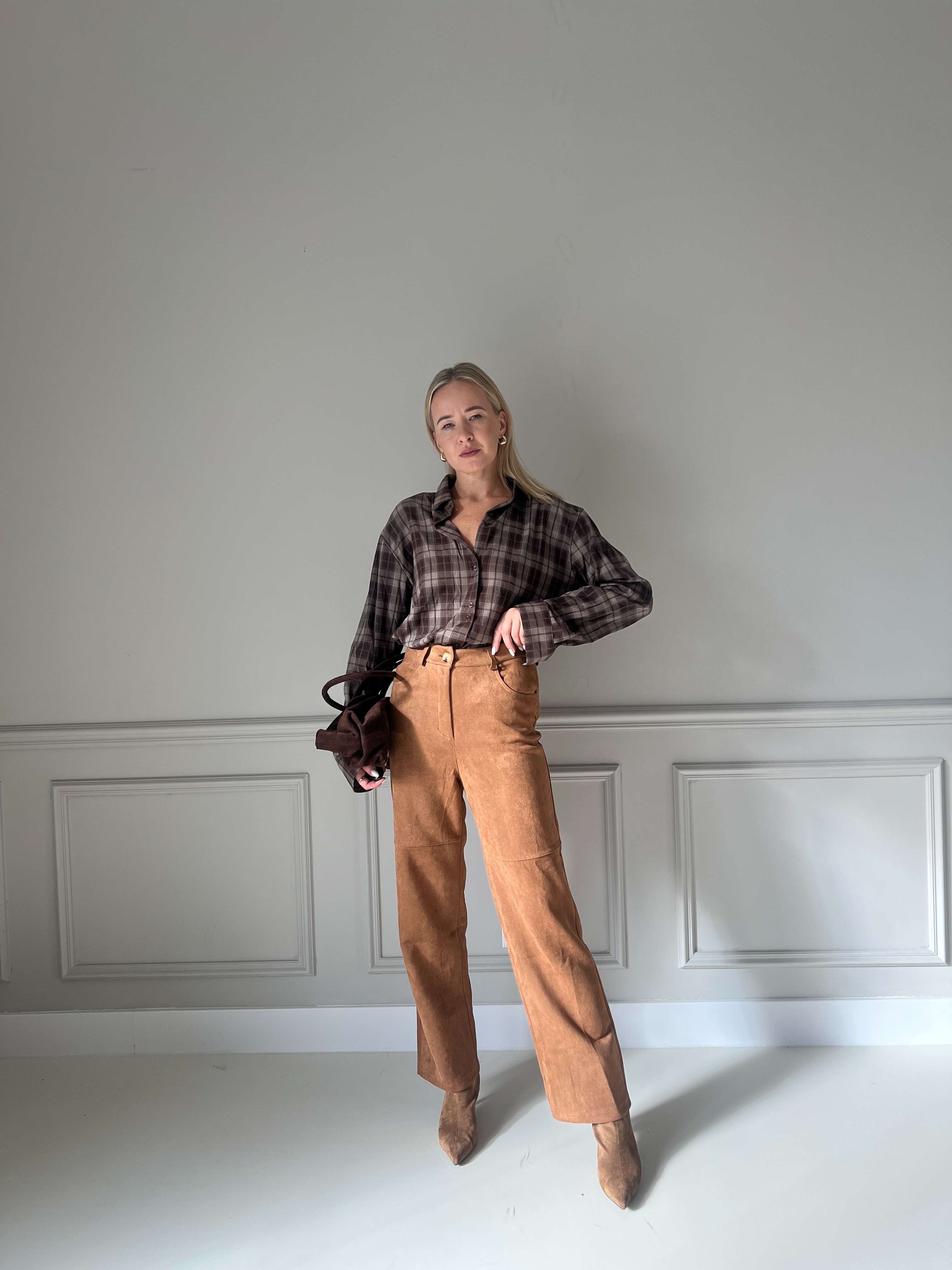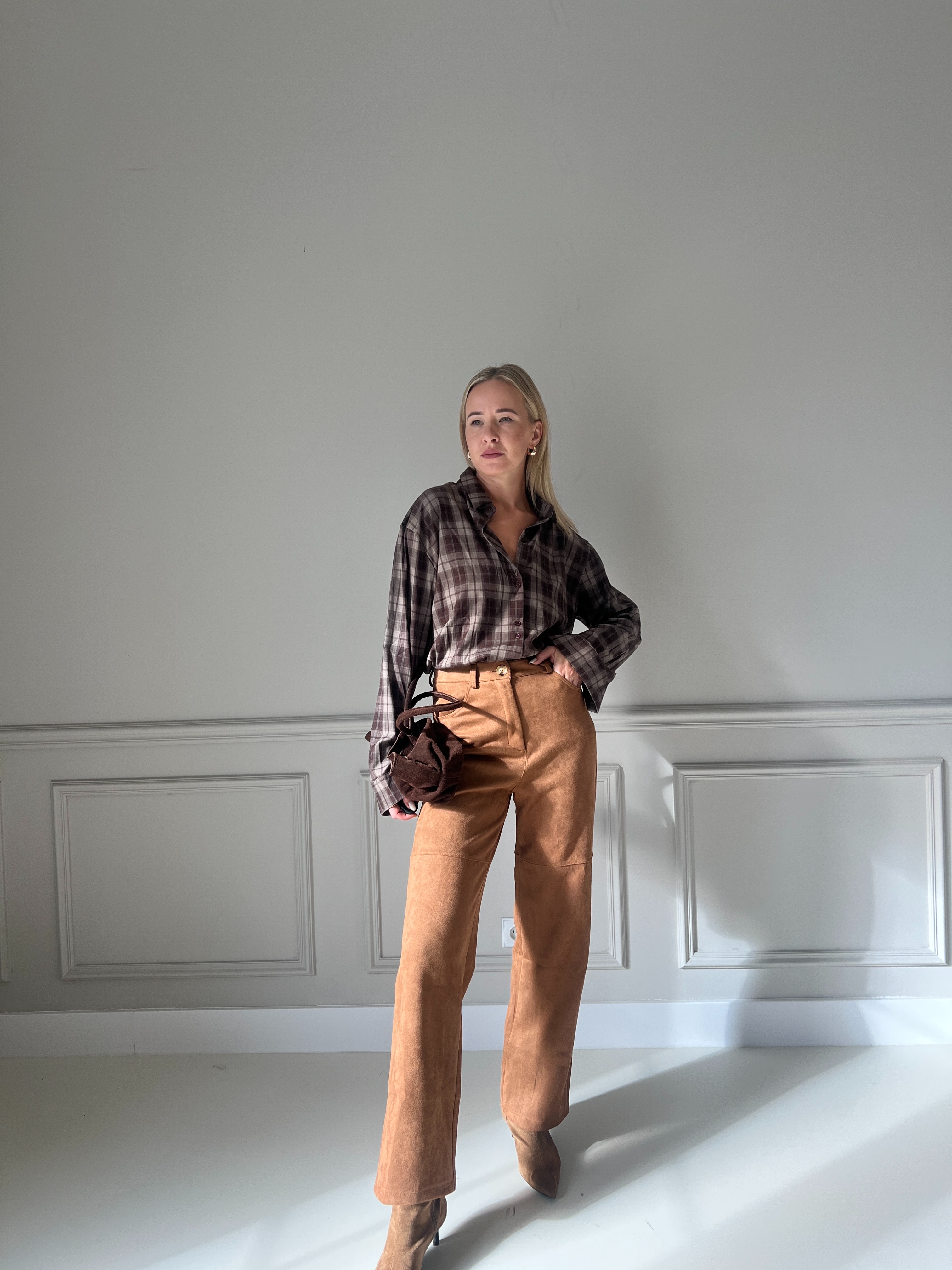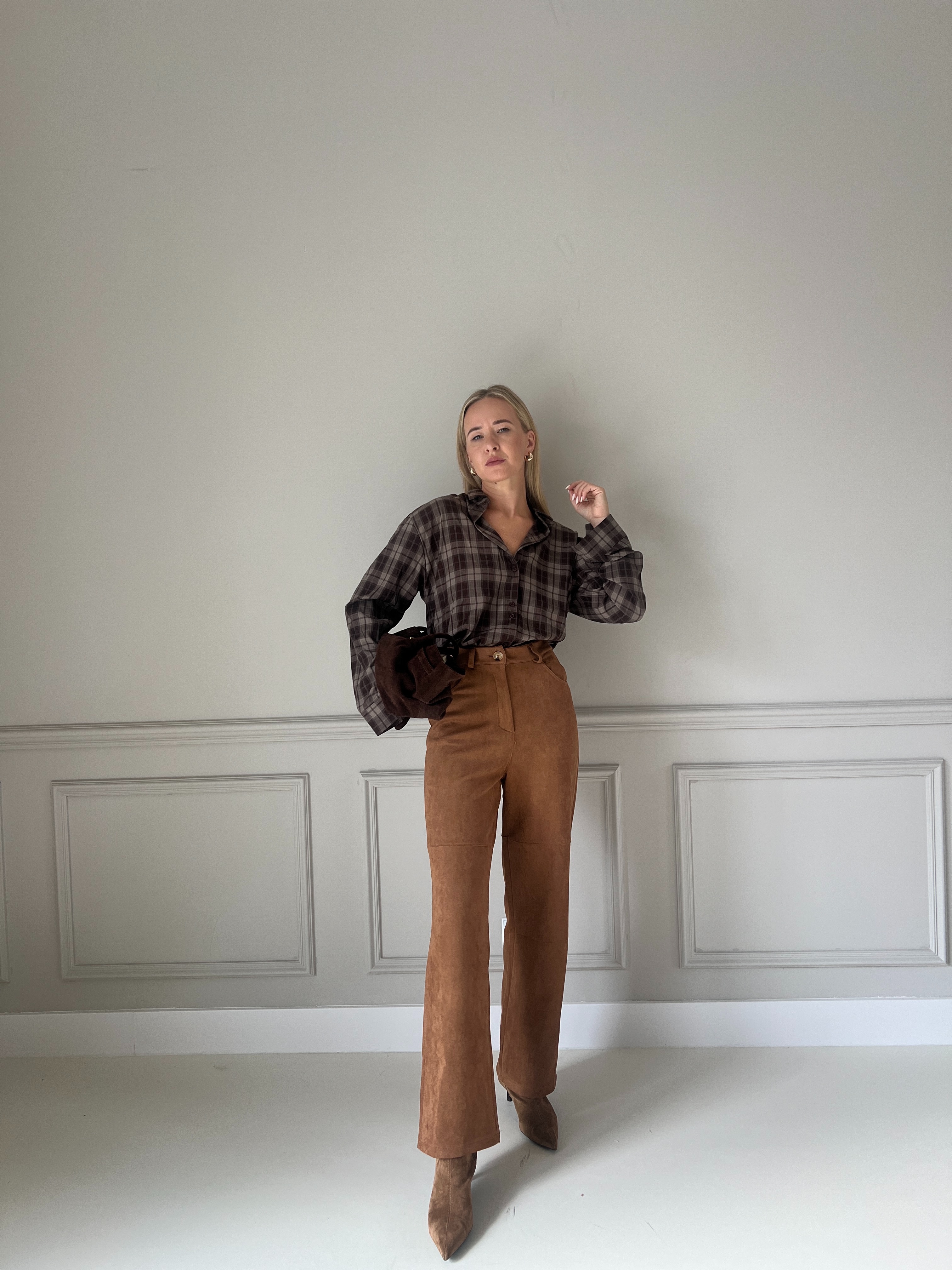 Semišové nohavice s rovným, veľmi pohodlným strihom. Nohavice majú vysoký pás a zapínanie na gombík. Modelka má výšku 170cm, na sebe má veľkosť S.