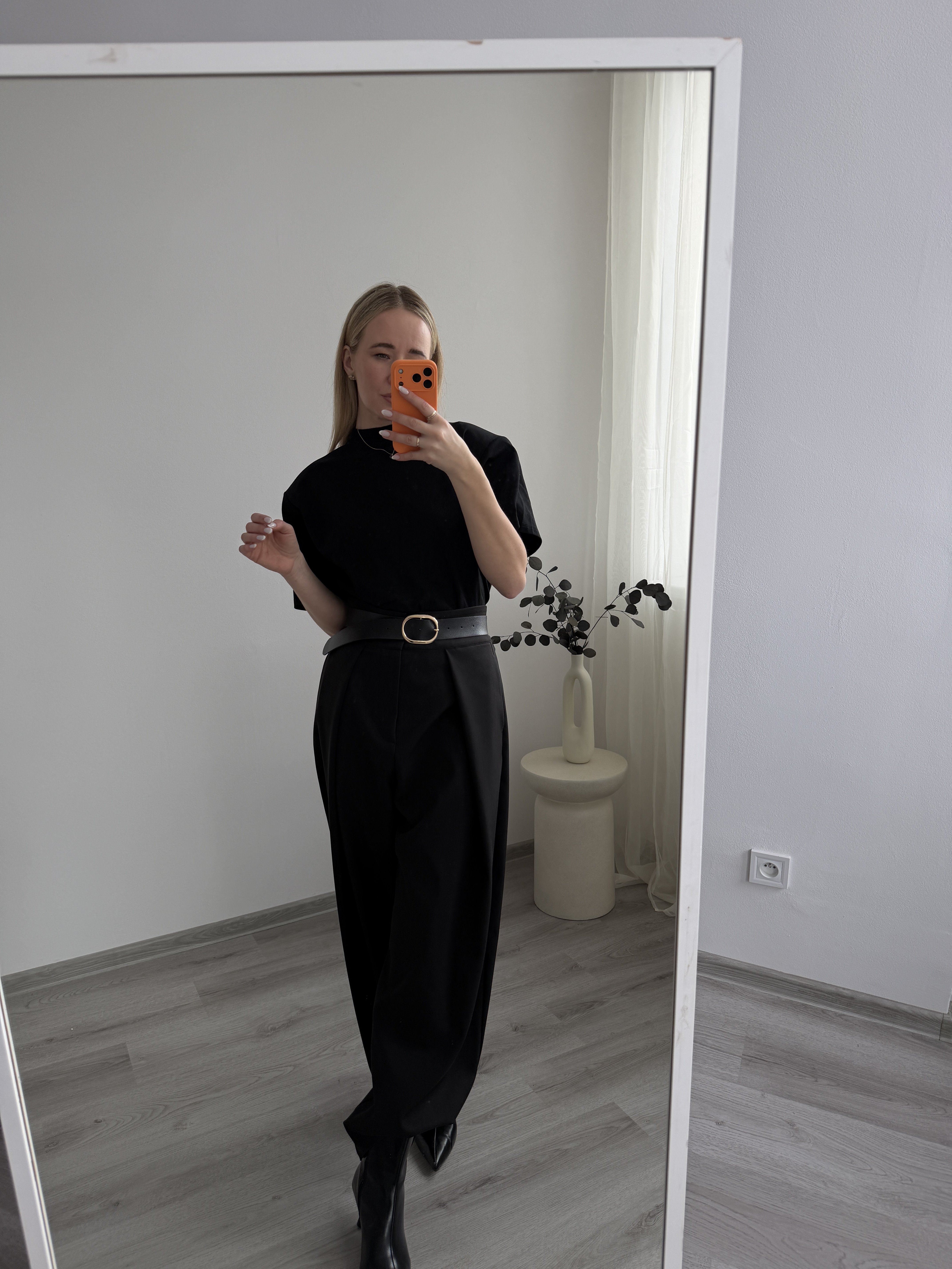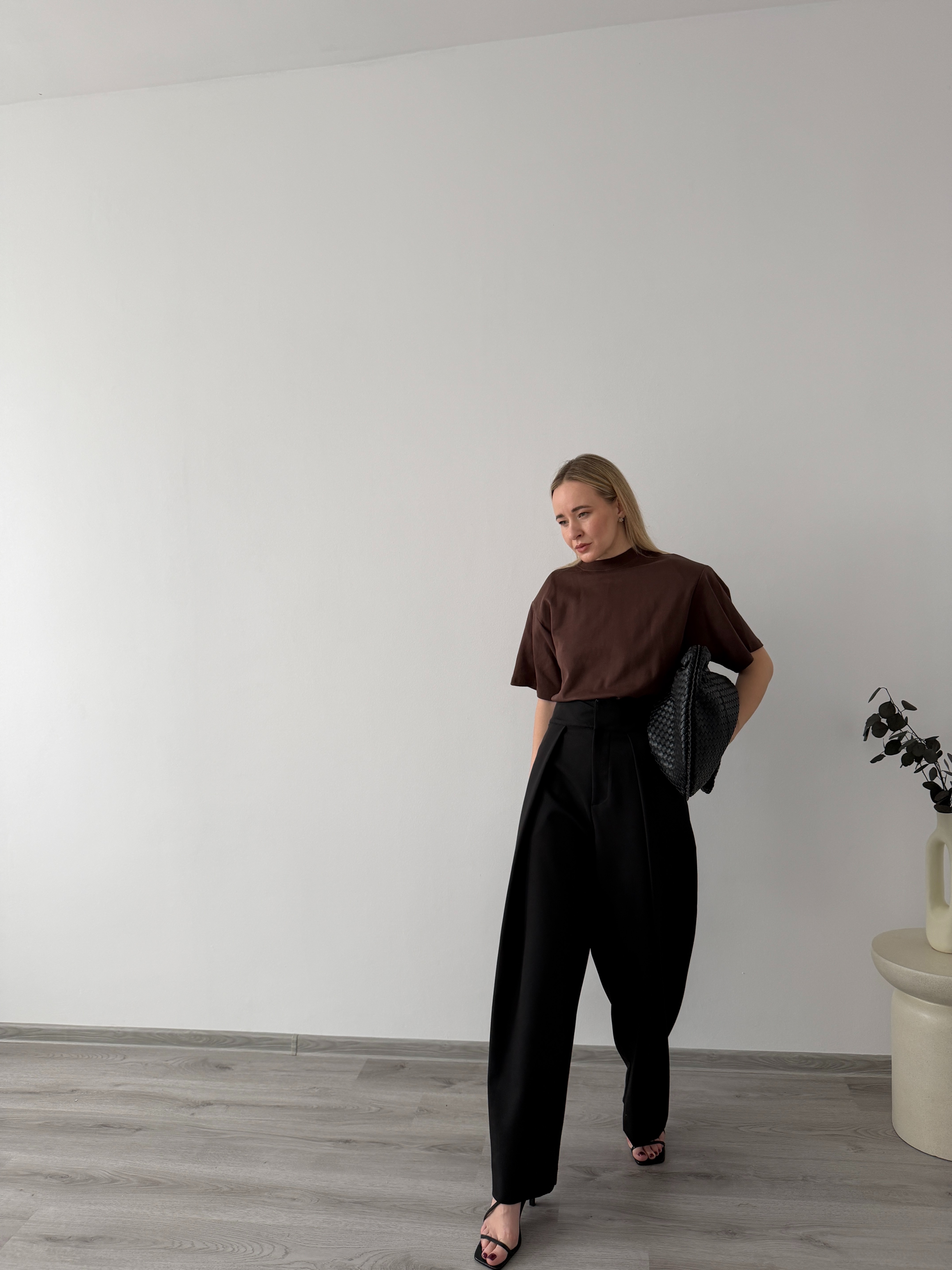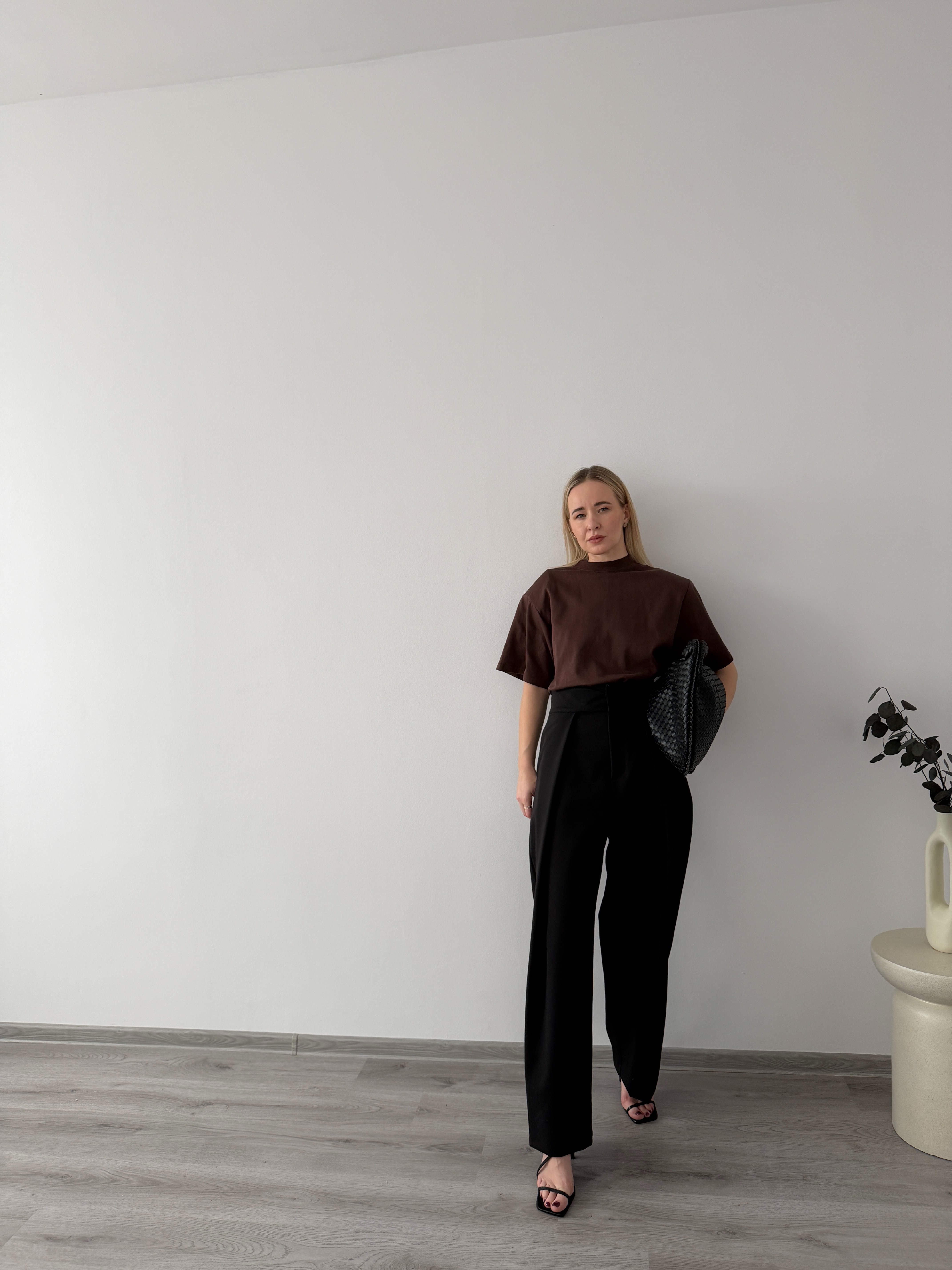 Široké čierne nohavice s vysokým pásom a jemným skladaním. Pohodlný strih opticky predlžuje nohy a ľahko sa kombinuje s elegantnými aj ležérnymi kúskami.