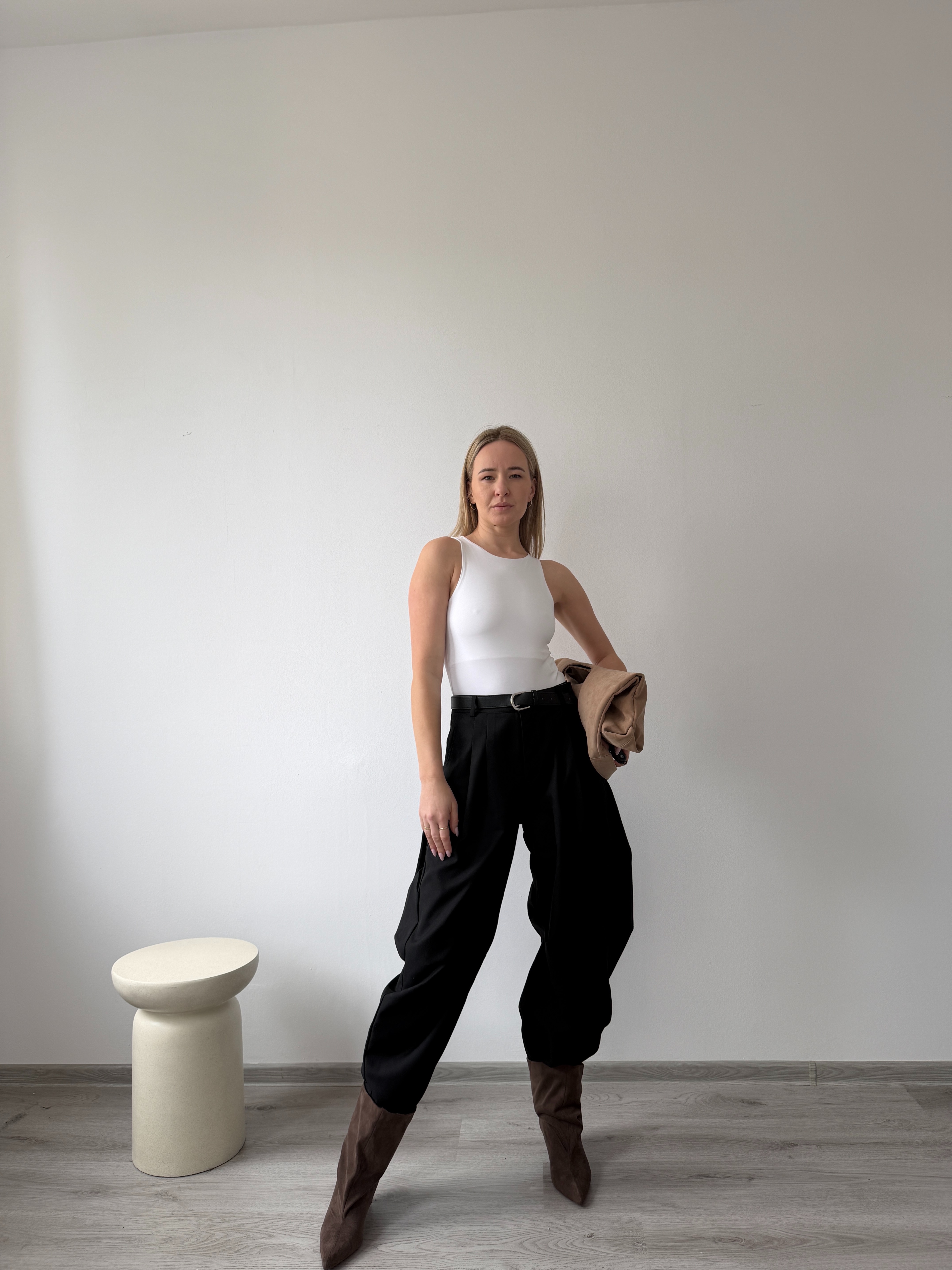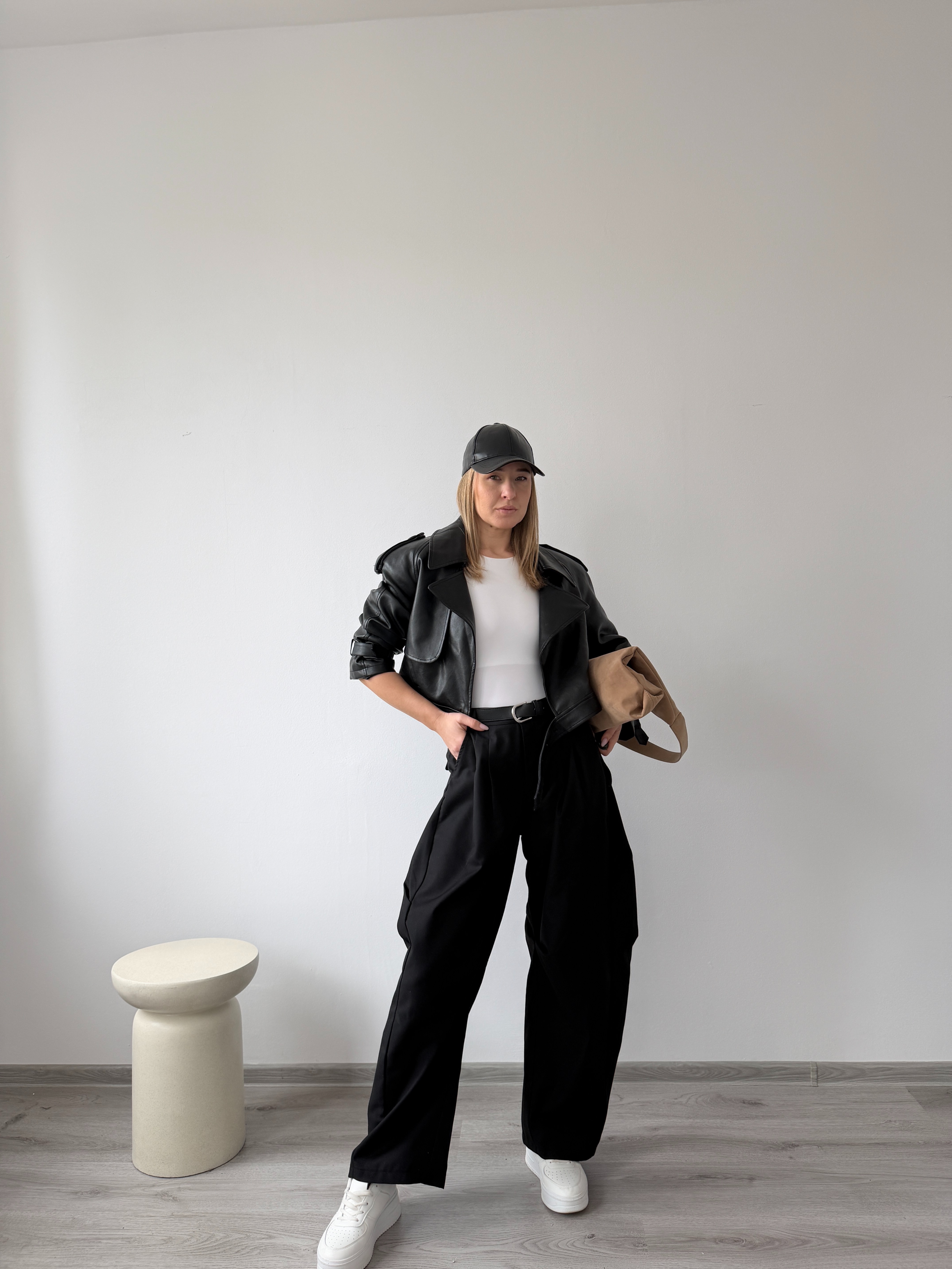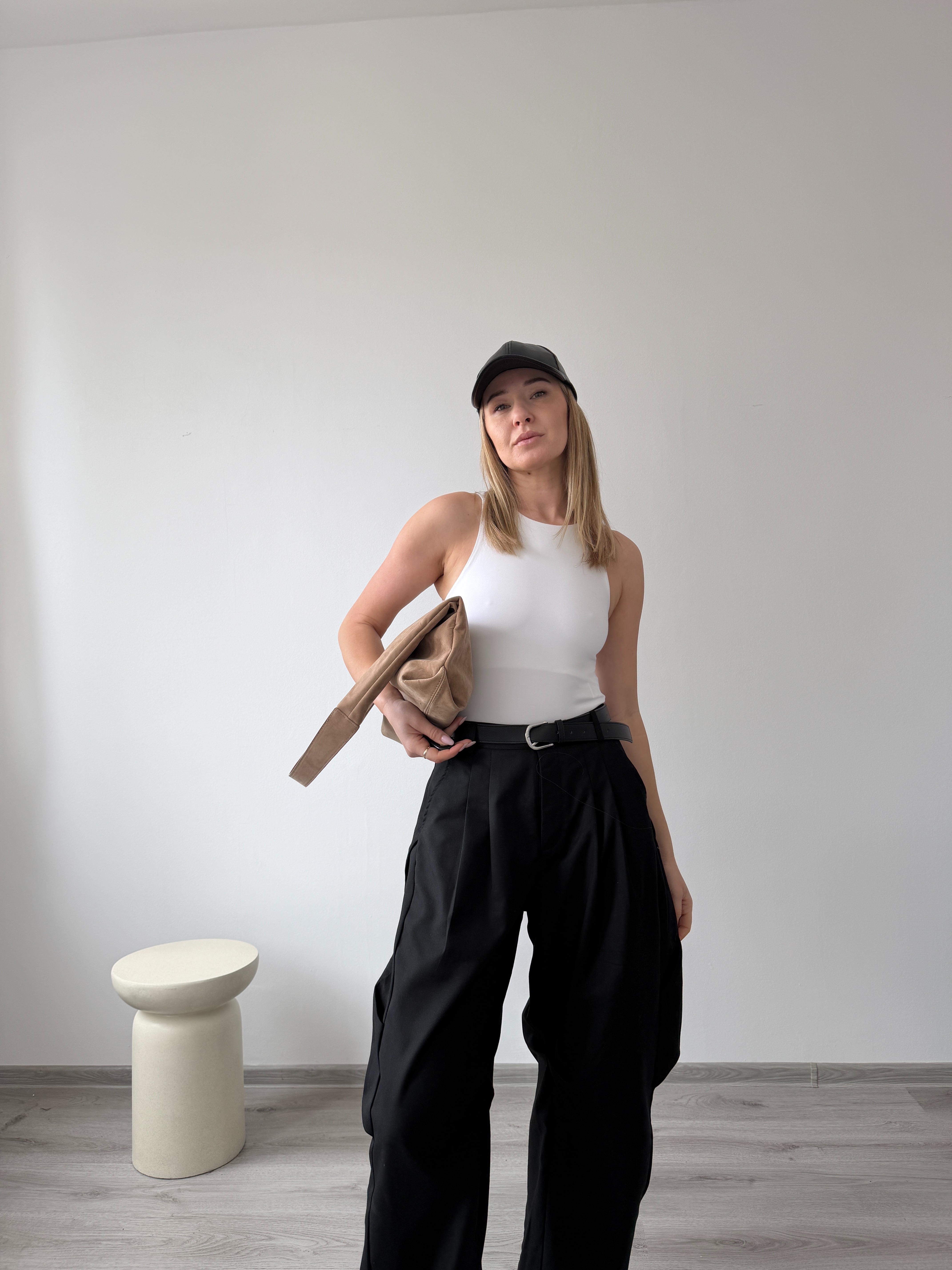 Elegantné nohavice s vysokým pásom a záhybmi vpredu. Široký strih, príjemný materiál a univerzálna farba pre nadčasový vzhľad. Modelka má výšku 170cm, na sebe má veľkosť M. -sedia štandardnému číslovaniu