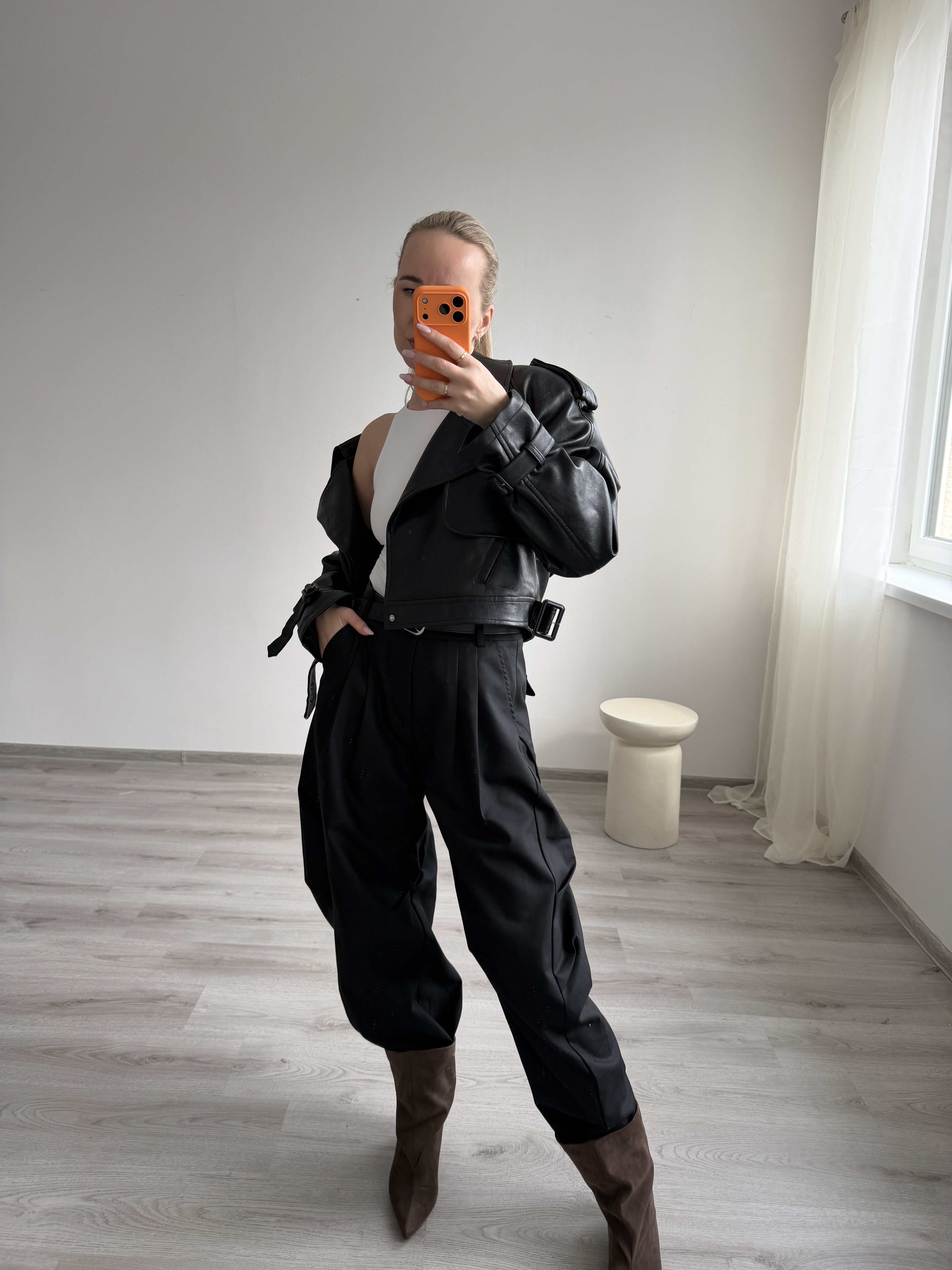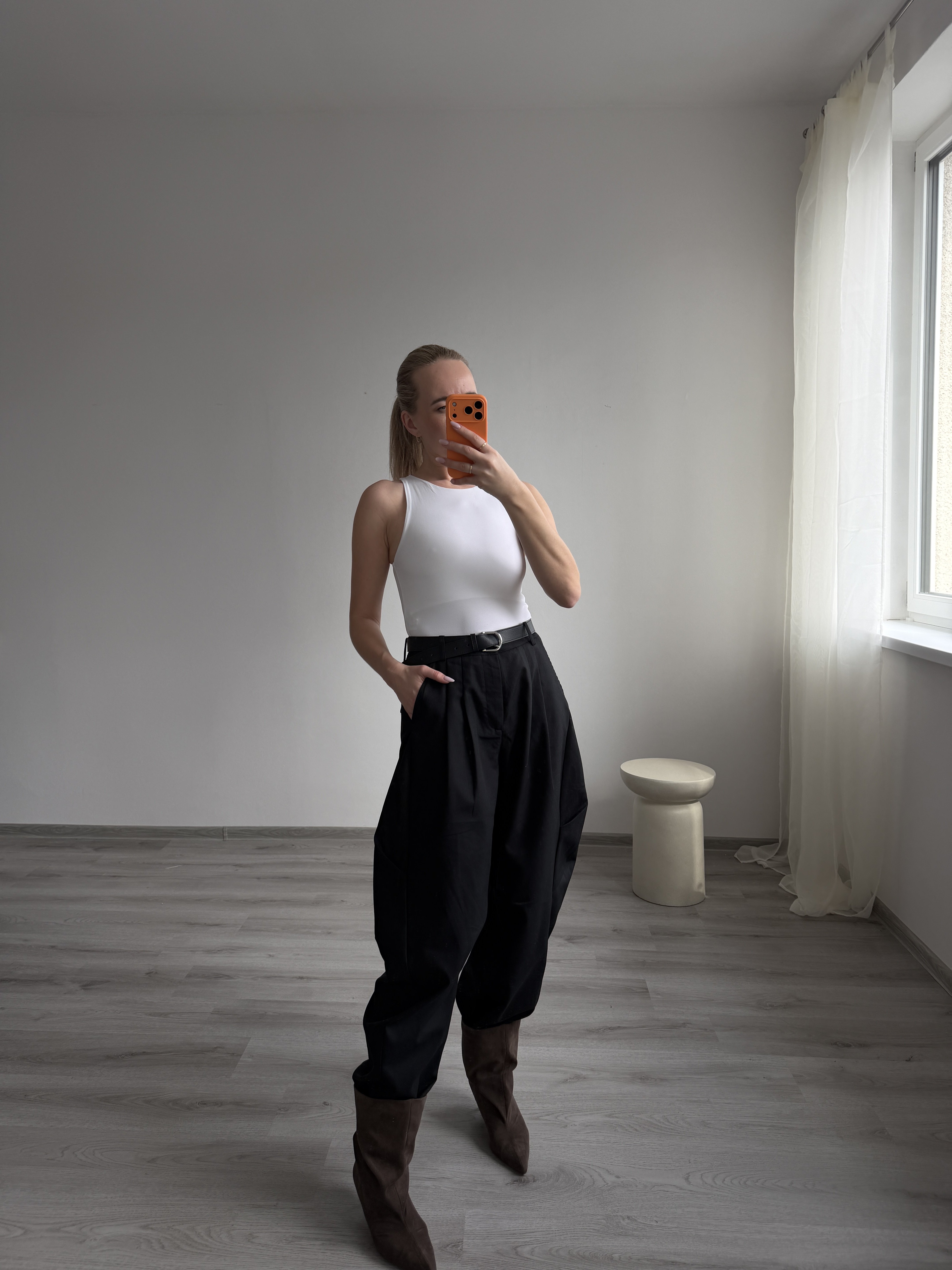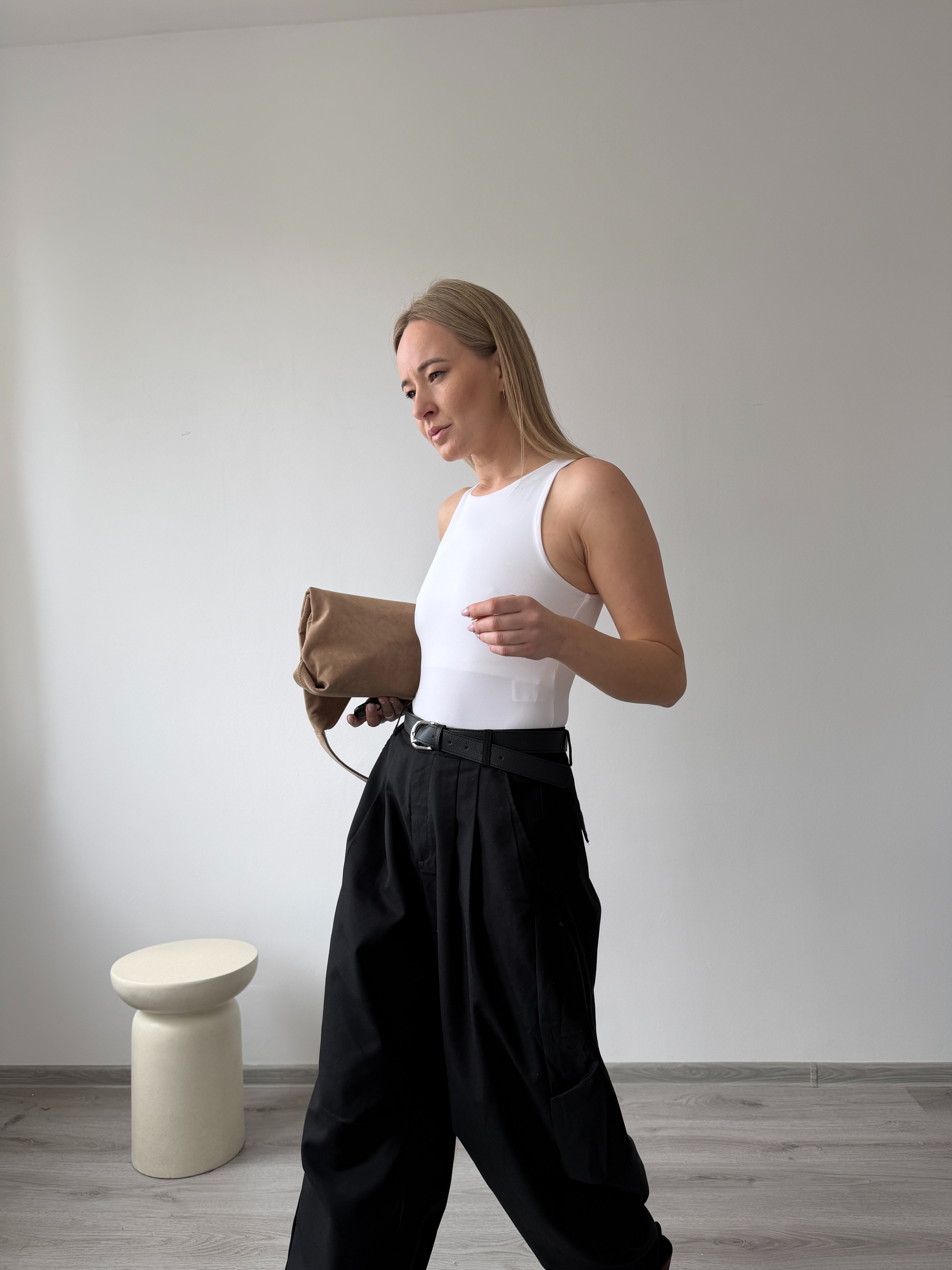 Elegantné nohavice s vysokým pásom a záhybmi vpredu. Široký strih, príjemný materiál a univerzálna farba pre nadčasový vzhľad. Modelka má výšku 170cm, na sebe má veľkosť M. -sedia štandardnému číslovaniu
