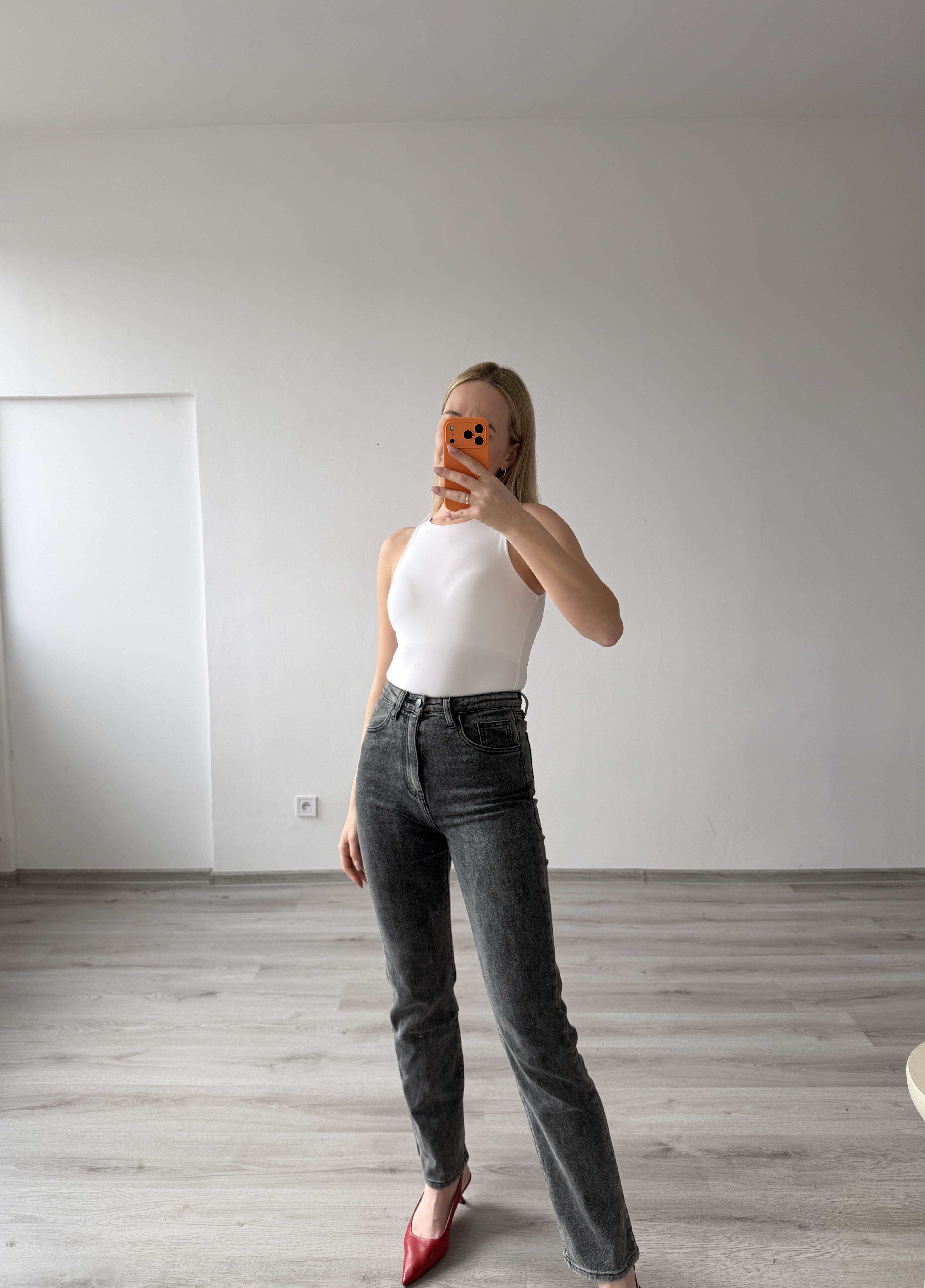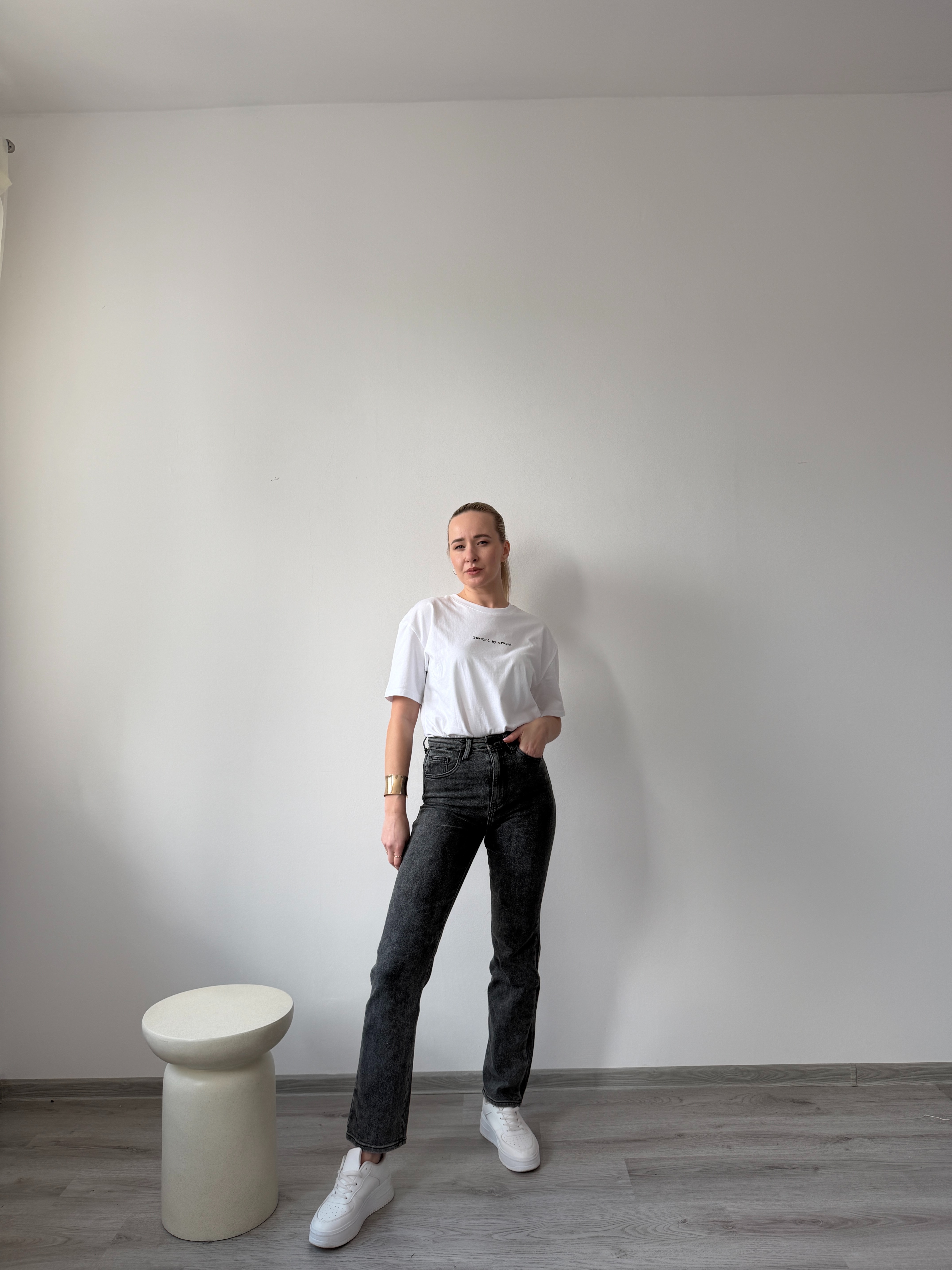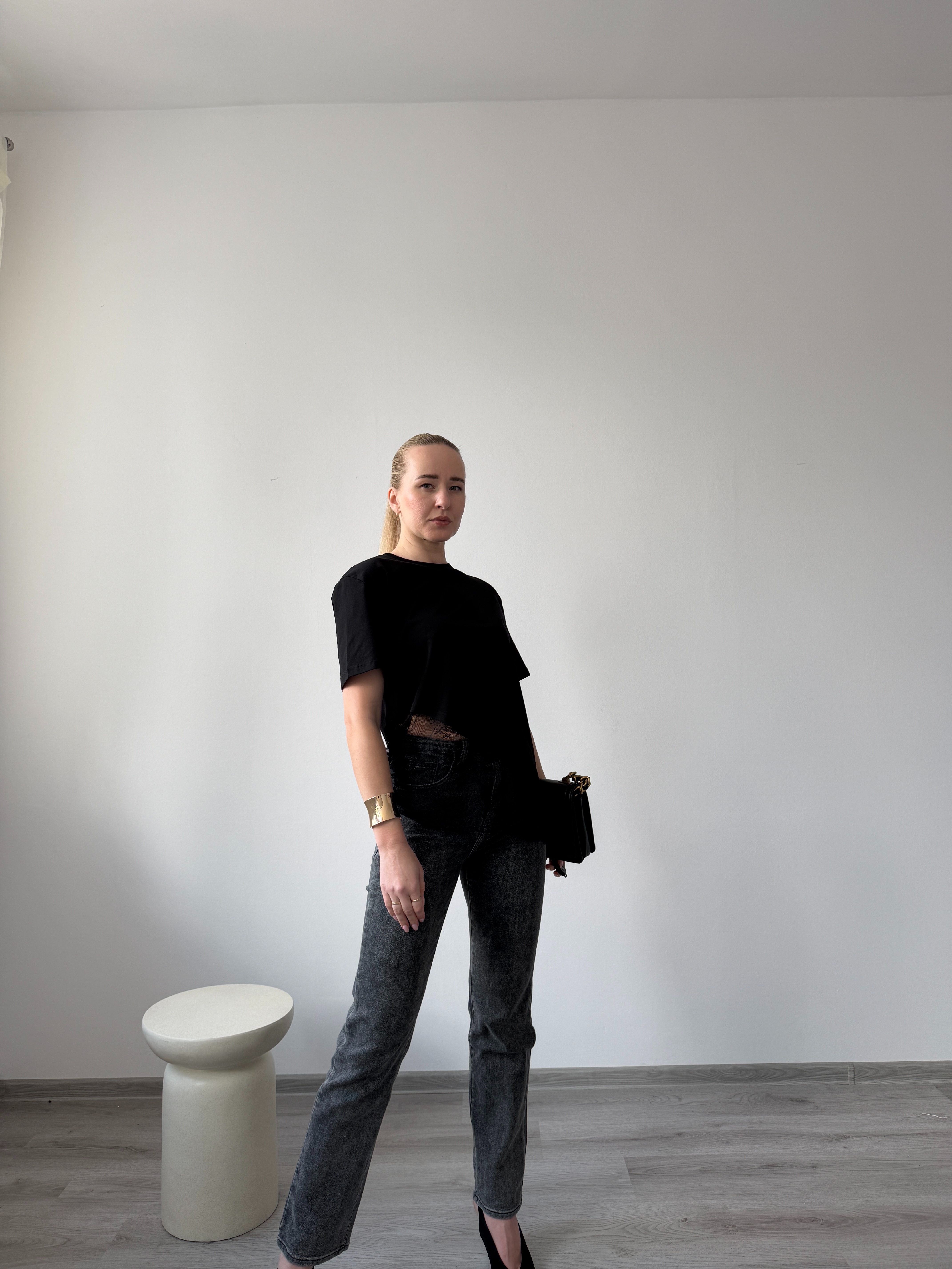 Čierne štýlove grafitové rifle sú ľahko kombinovateľné a vhodné na každodenné nosenie aj elegantnejšie outfity. Modelka má výšku 170cm, na sebe má veľkosť 36.