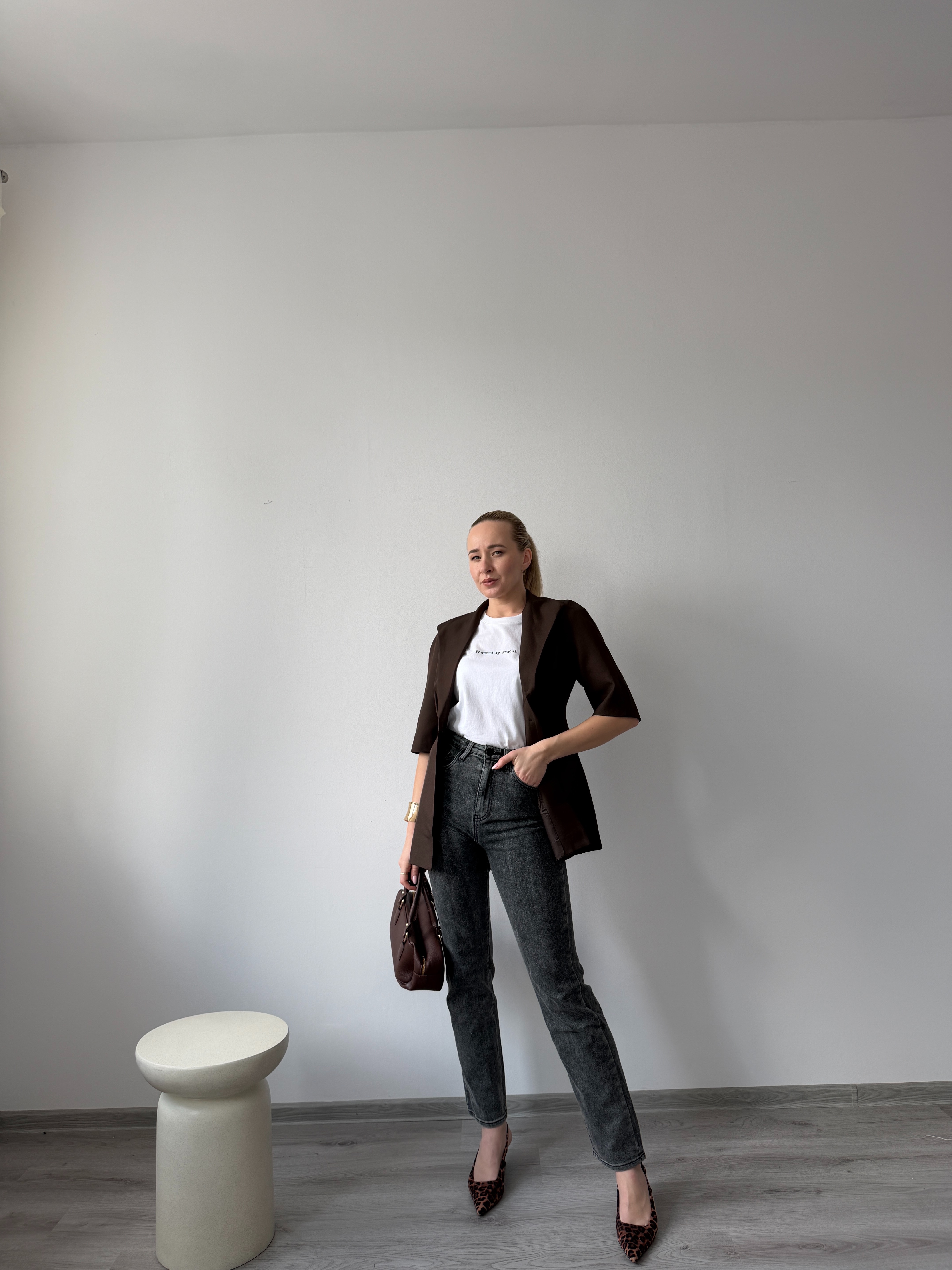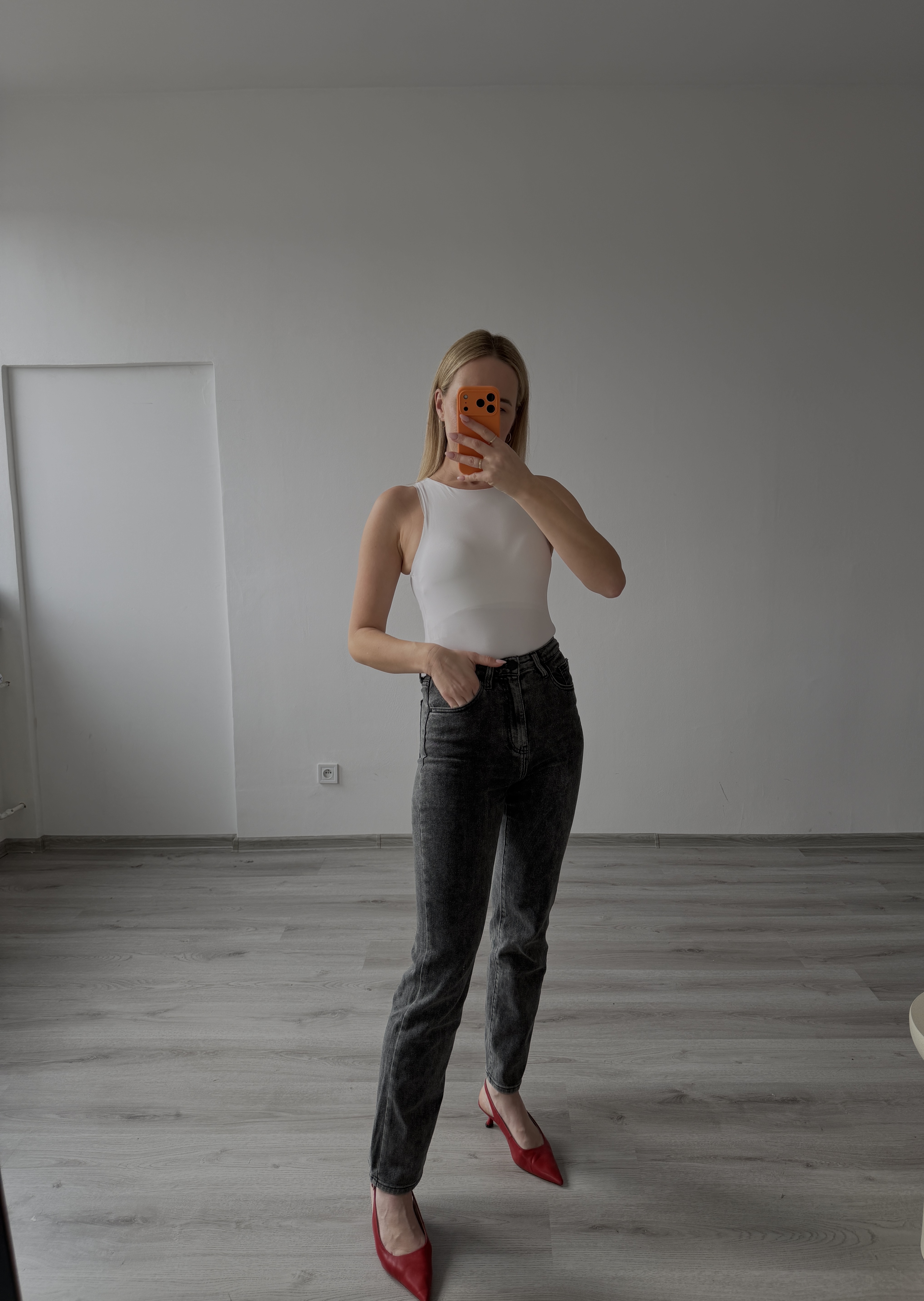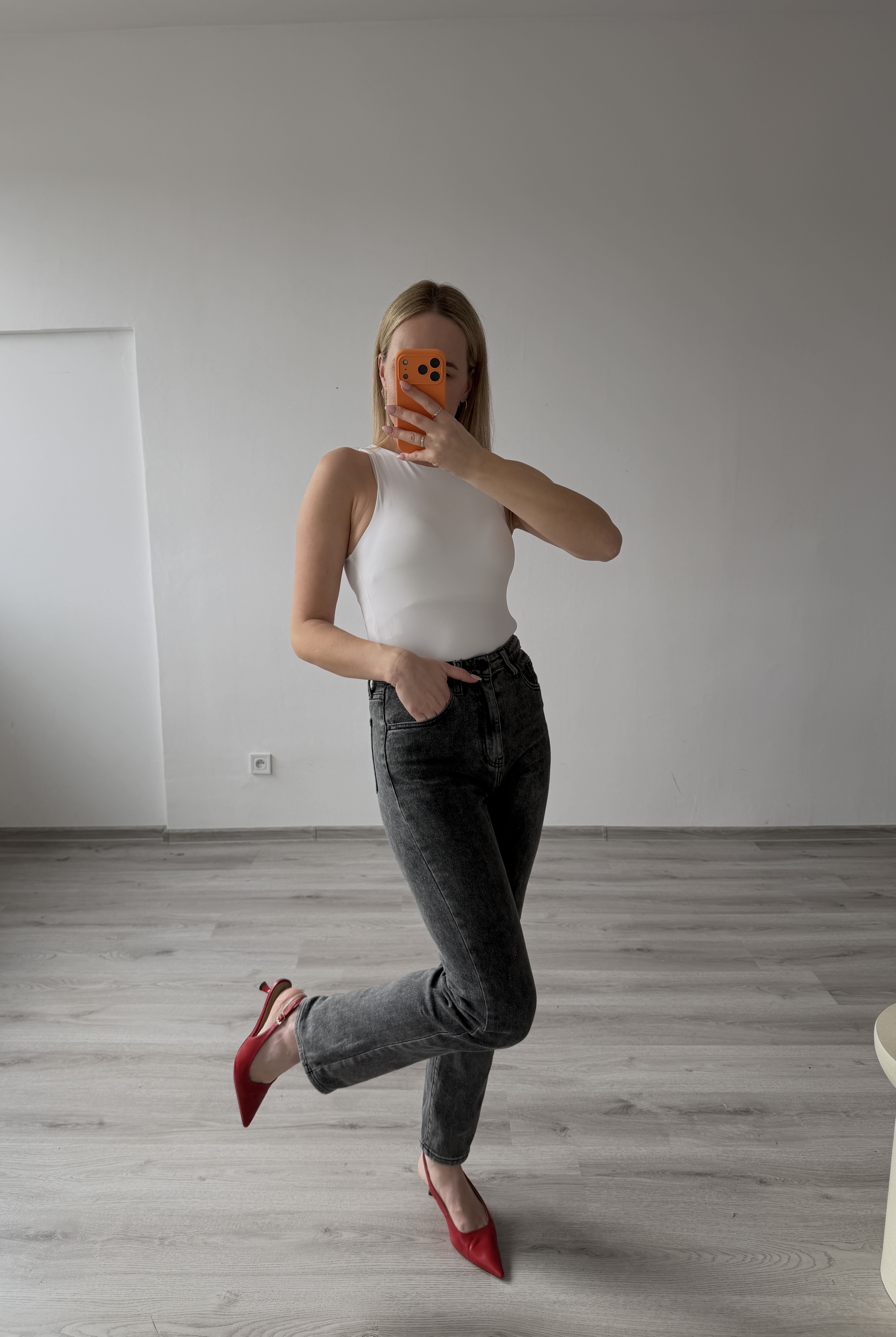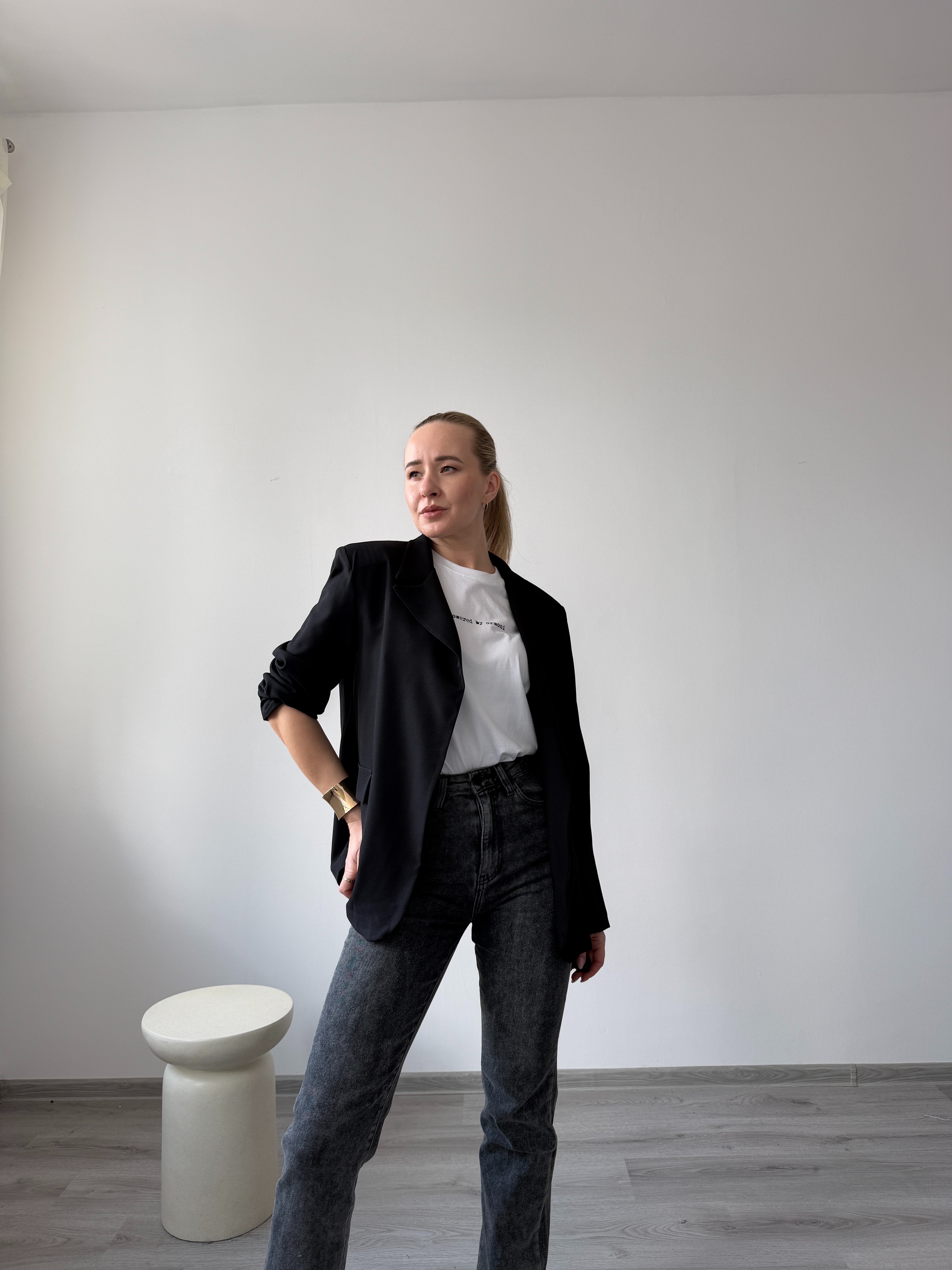 Čierne štýlove grafitové rifle sú ľahko kombinovateľné a vhodné na každodenné nosenie aj elegantnejšie outfity. Modelka má výšku 170cm, na sebe má veľkosť 36.