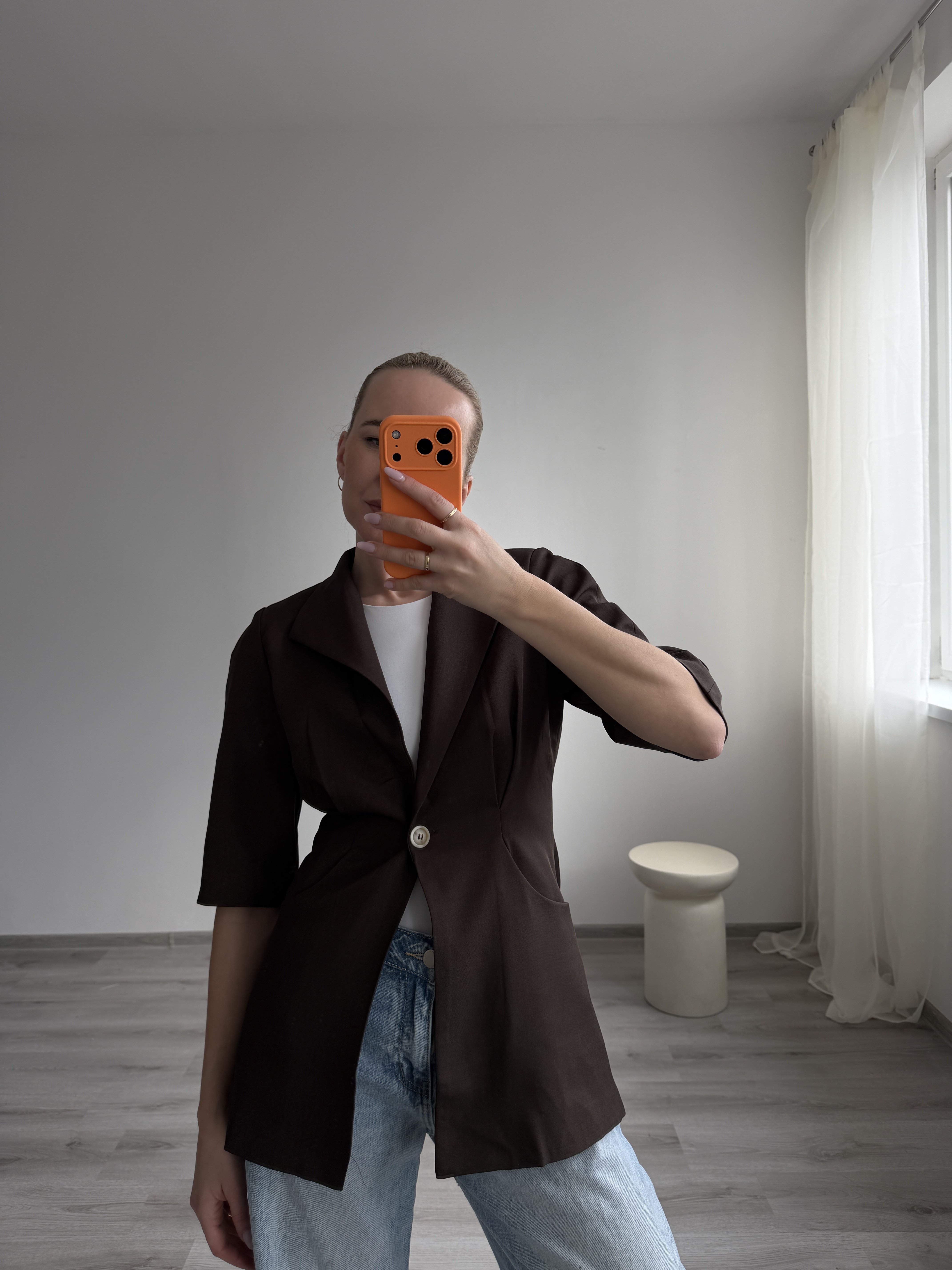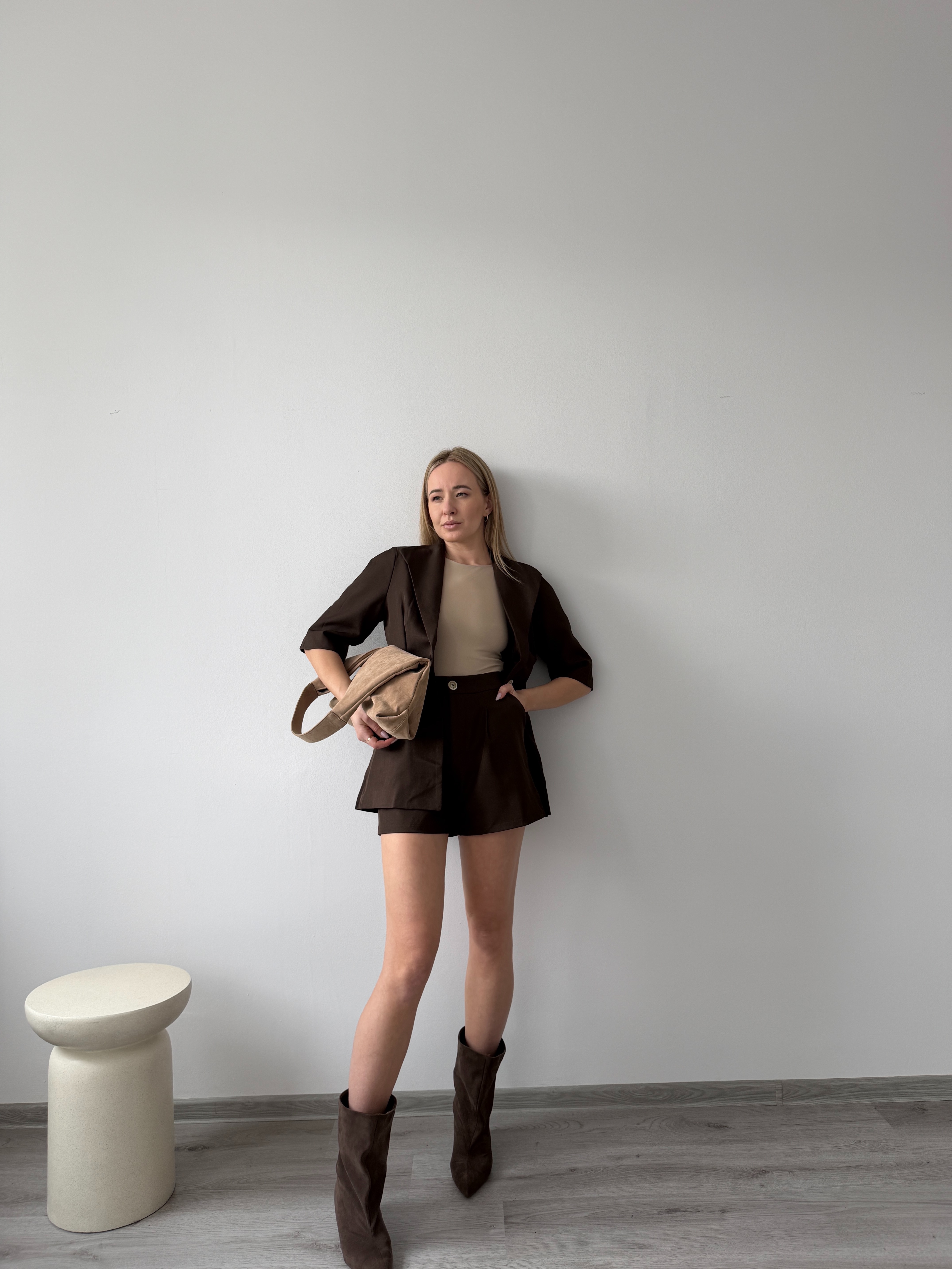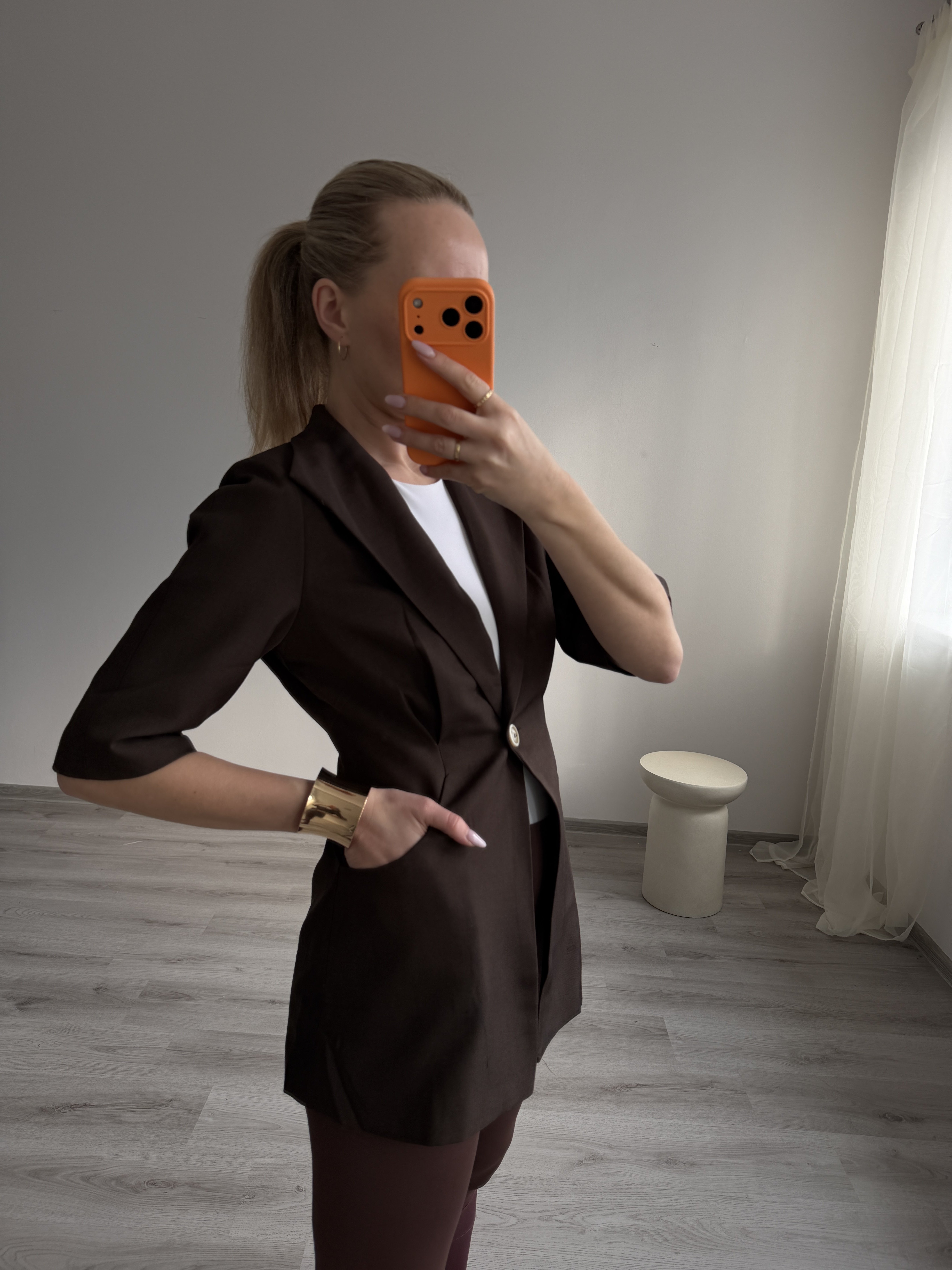 Moderné hnedé sako s krátkym rukávom v elegantom strihu. Má jednoduchý, no veľmi štýlový dizajn, ktorý sa hodí na vrstvenie počas teplejších dní. Skvelý doplnok k nohaviciam, šatám aj kraťasom. Modelka má výšku 170cm a nosí veľkosť S.