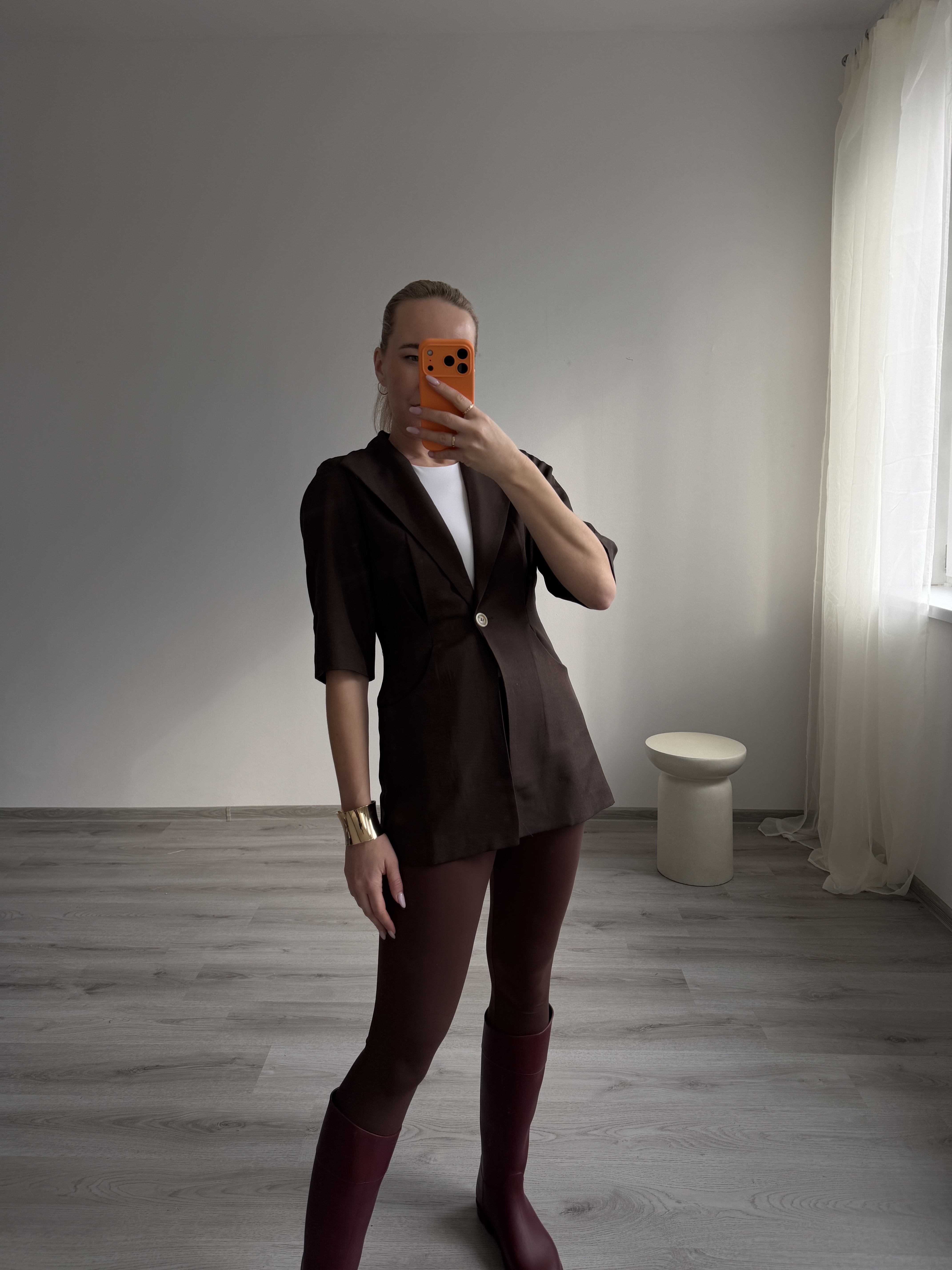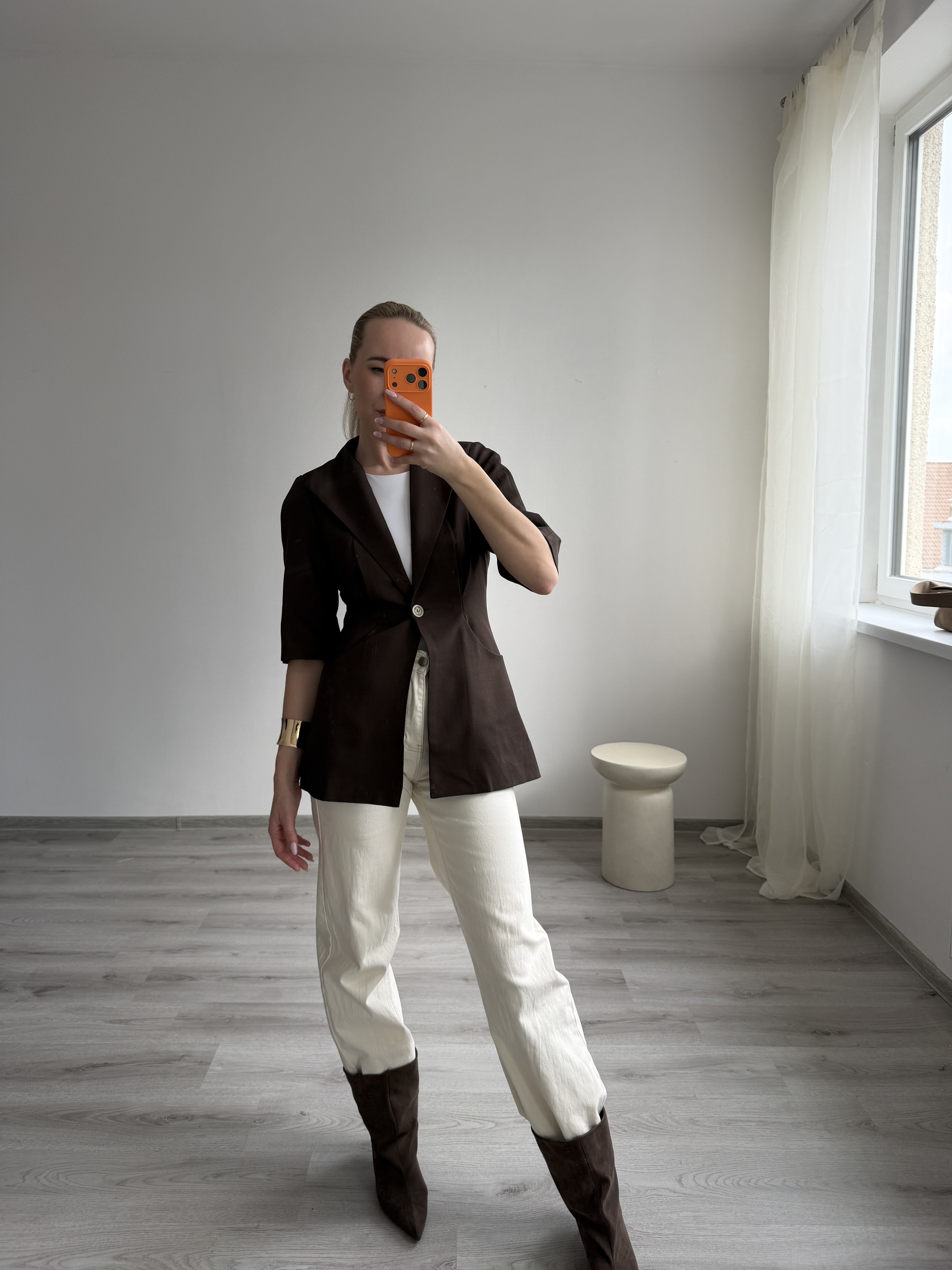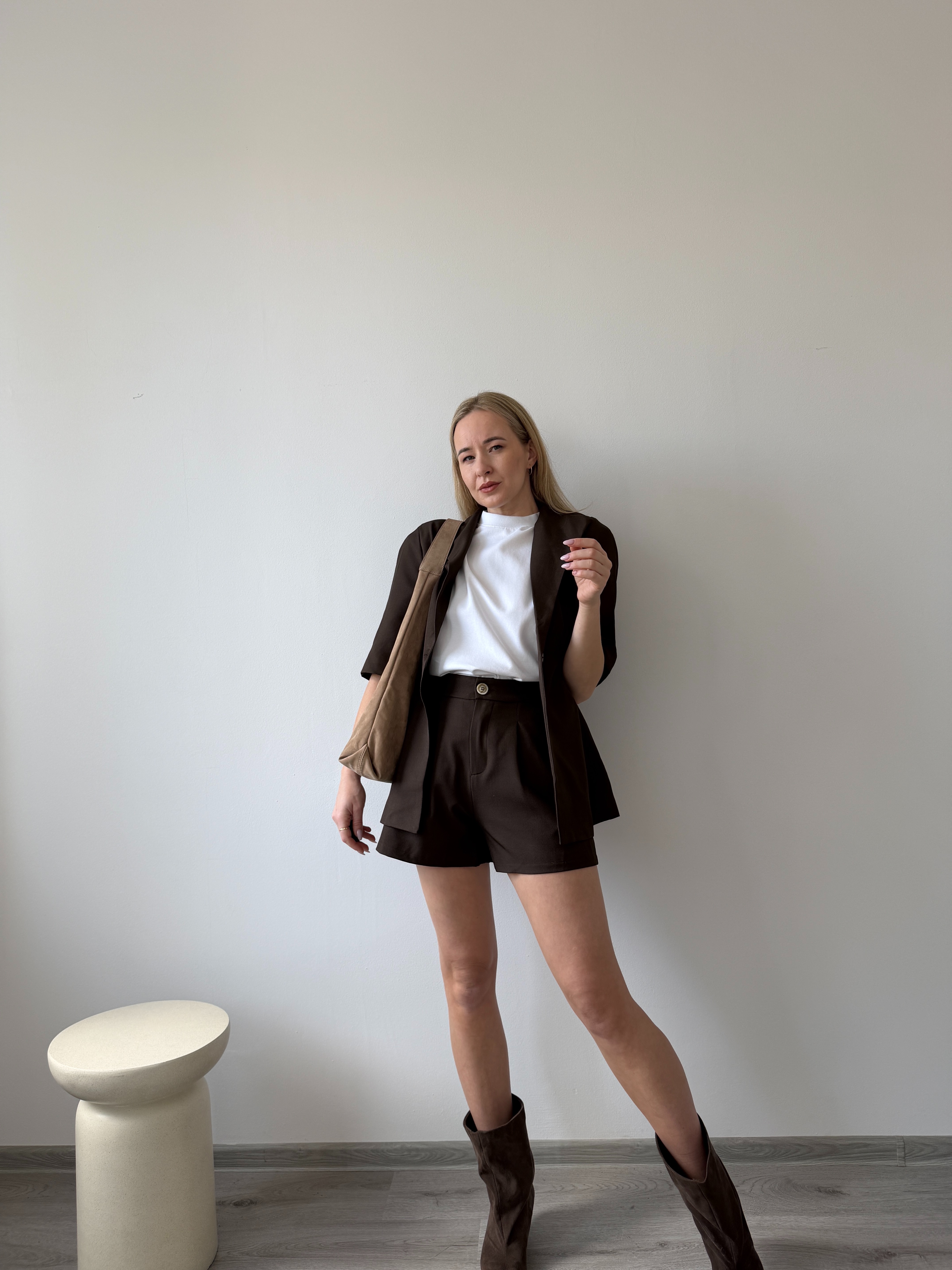Moderné hnedé sako s krátkym rukávom v elegantom strihu. Má jednoduchý, no veľmi štýlový dizajn, ktorý sa hodí na vrstvenie počas teplejších dní. Skvelý doplnok k nohaviciam, šatám aj kraťasom. Modelka má výšku 170cm a nosí veľkosť S.