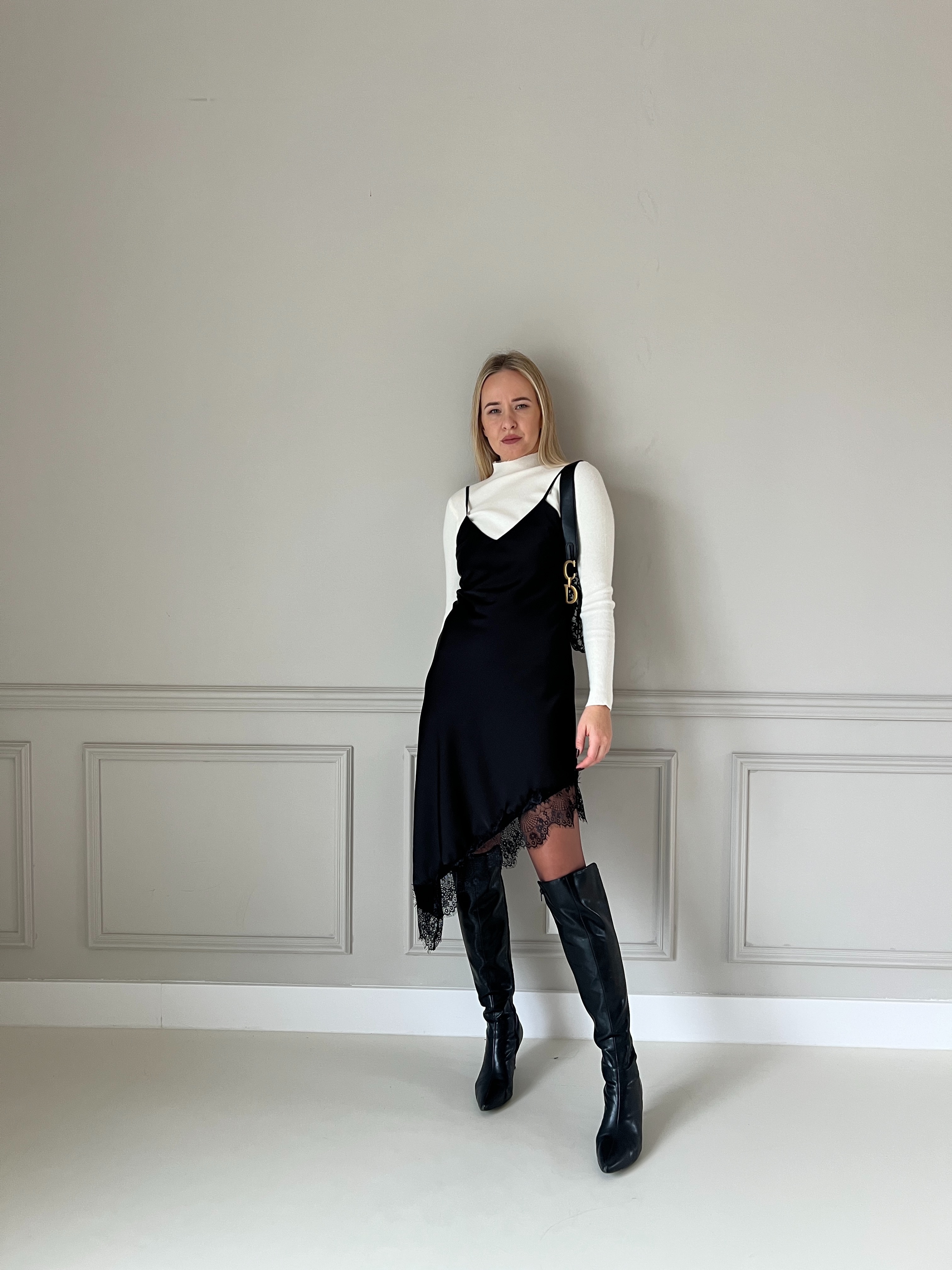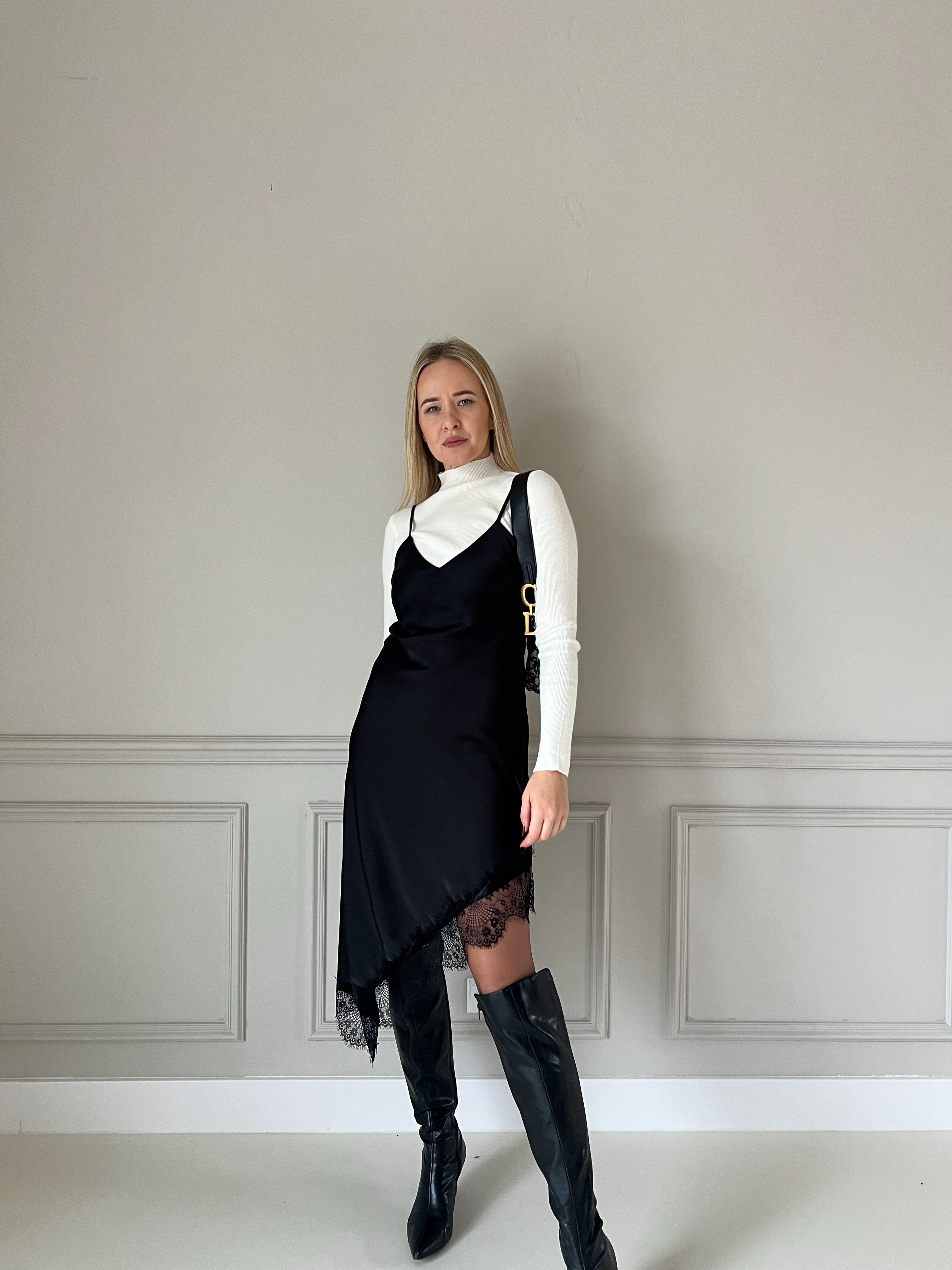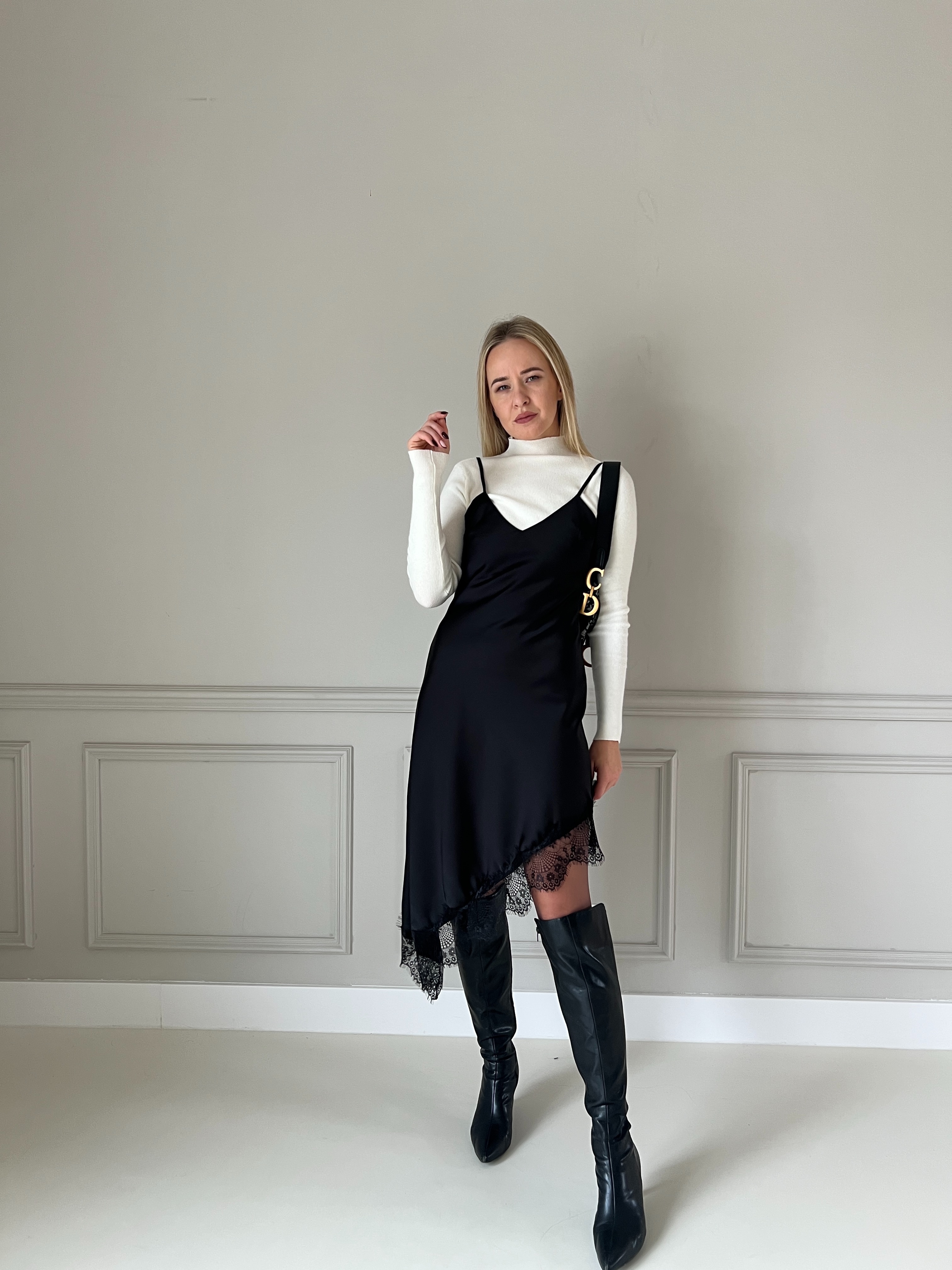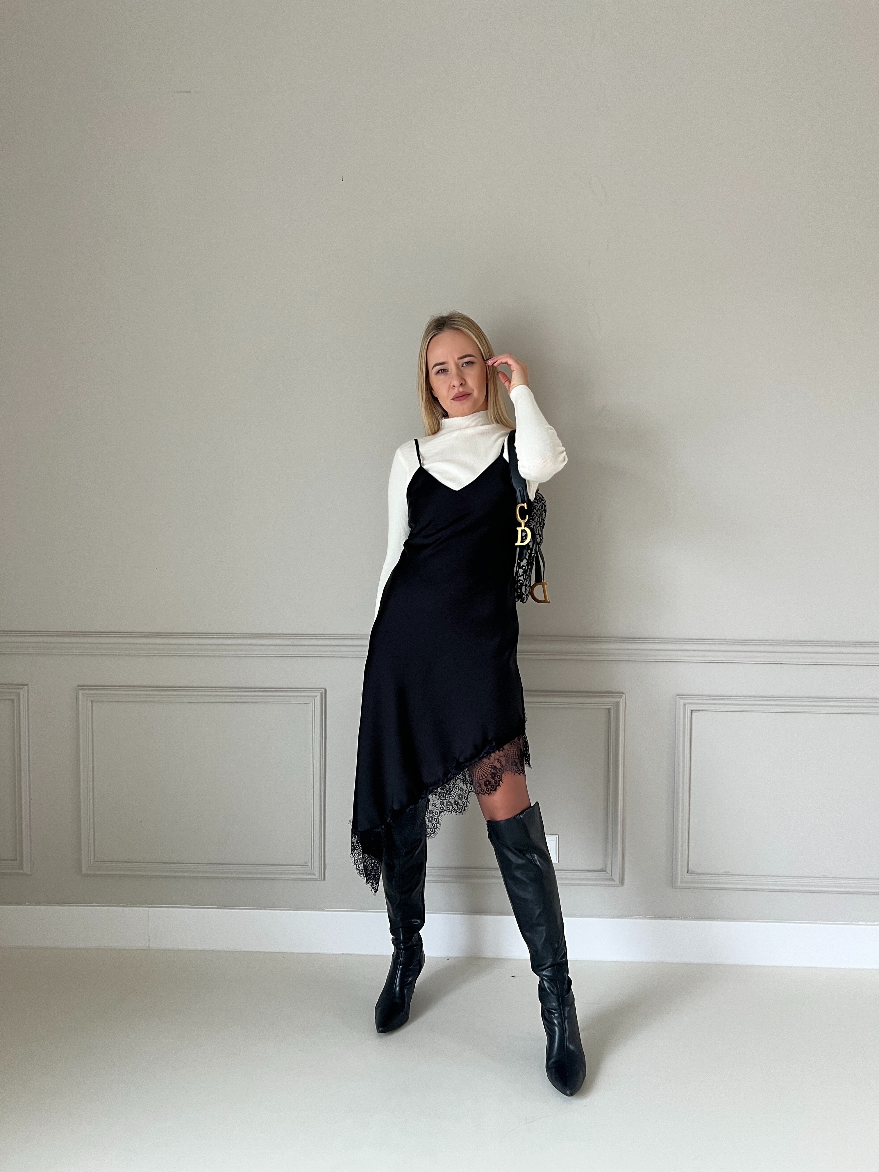 Elegantné čierne šaty s jemnými tenkými ramienkami a decentným V-výstrihom. Dizajn je minimalistický, no obohatený výrazným čipkovým lemom, ktorý dodáva výraznú ženskosť a štýl. Materiál je splývavý a príjemný na nosenie – strih zvýrazní siluetu, vďaka čomu sú tieto šaty ideálne na večerné podujatia, oslavy alebo iné špeciálne príležitosti. Modelka má výšku 170cm, na sebe má veľkosť S.