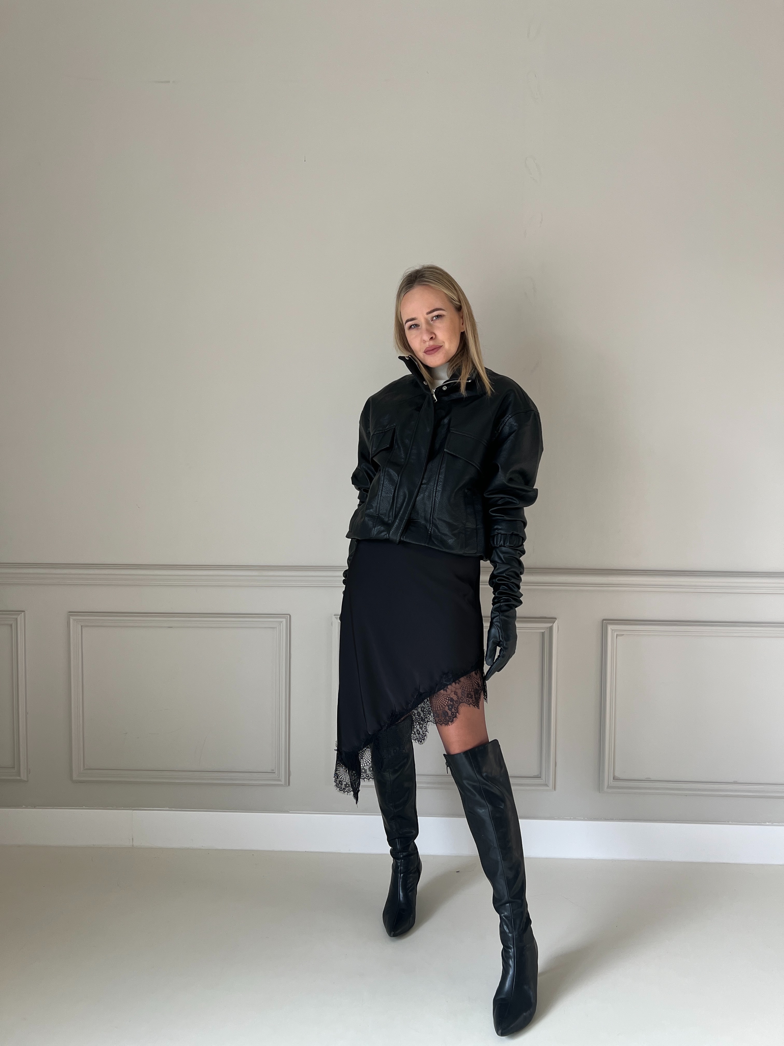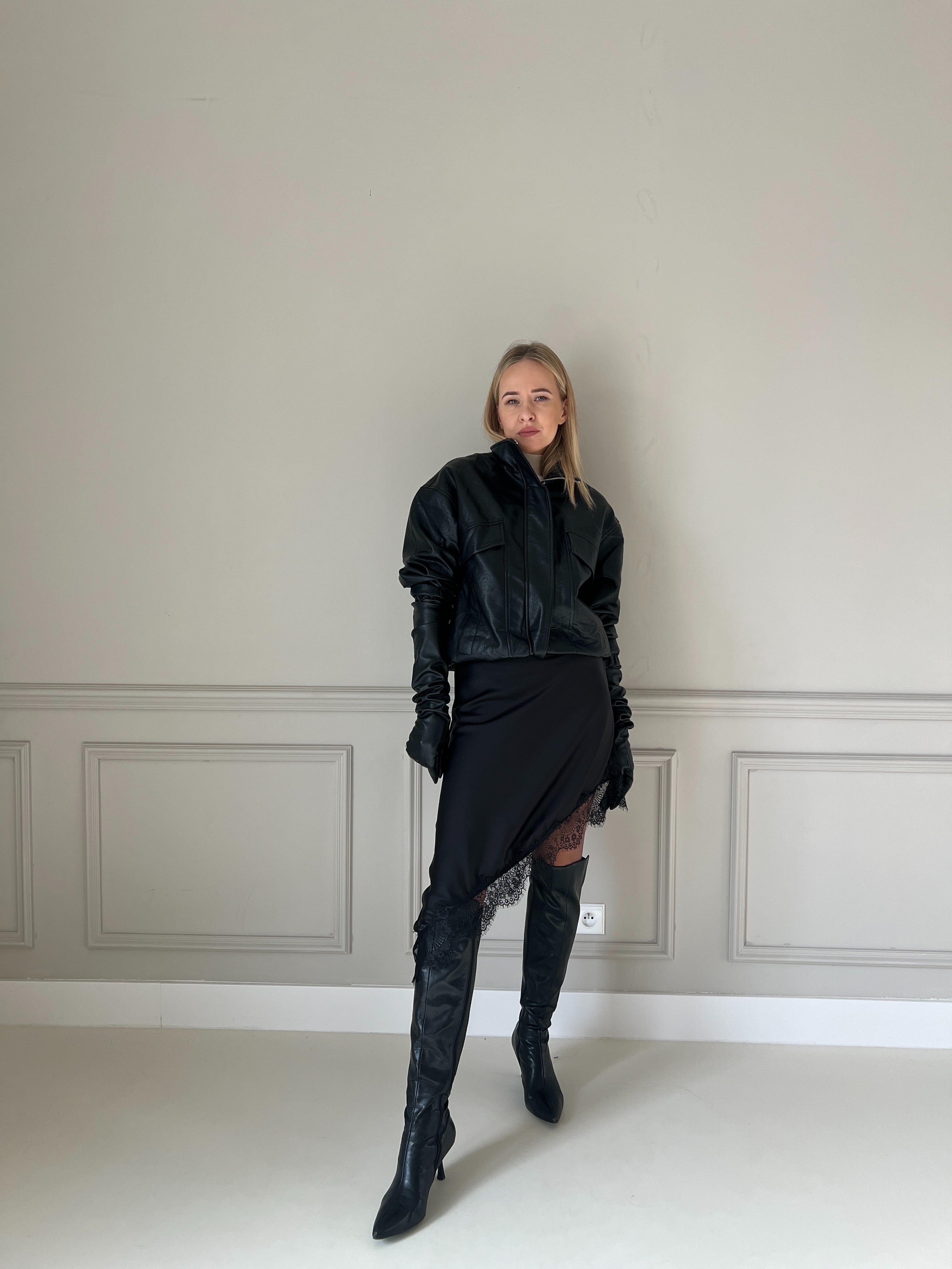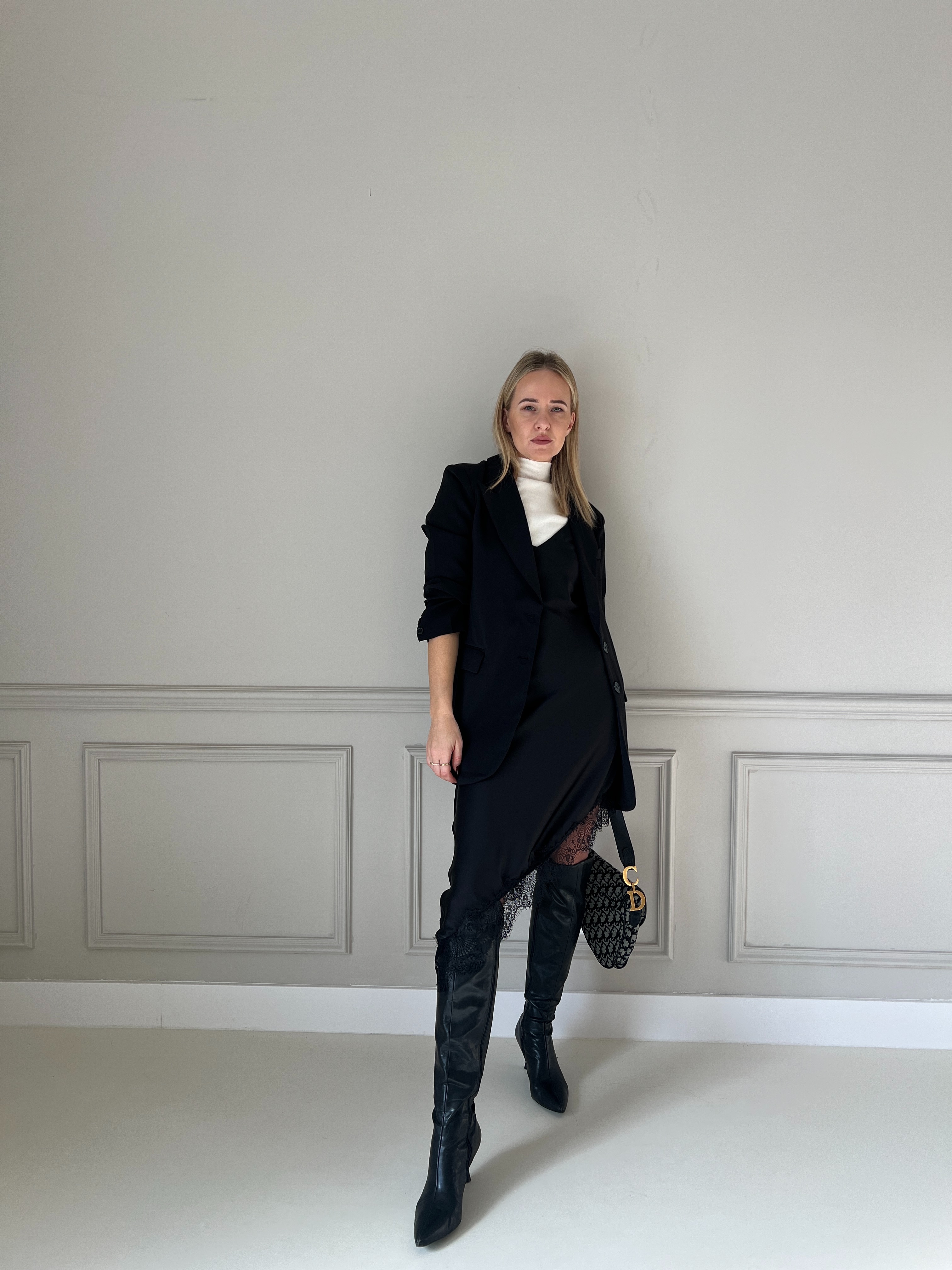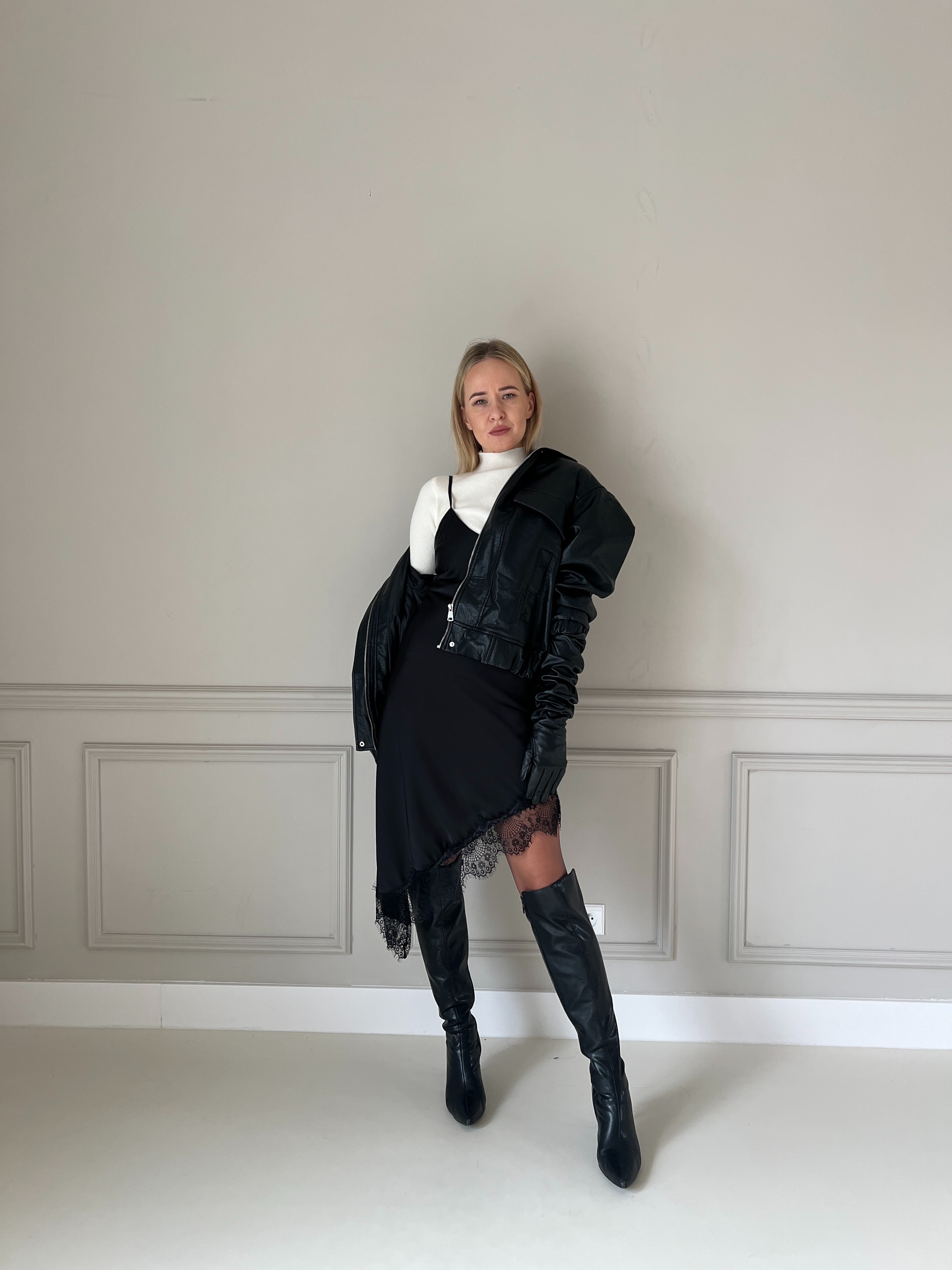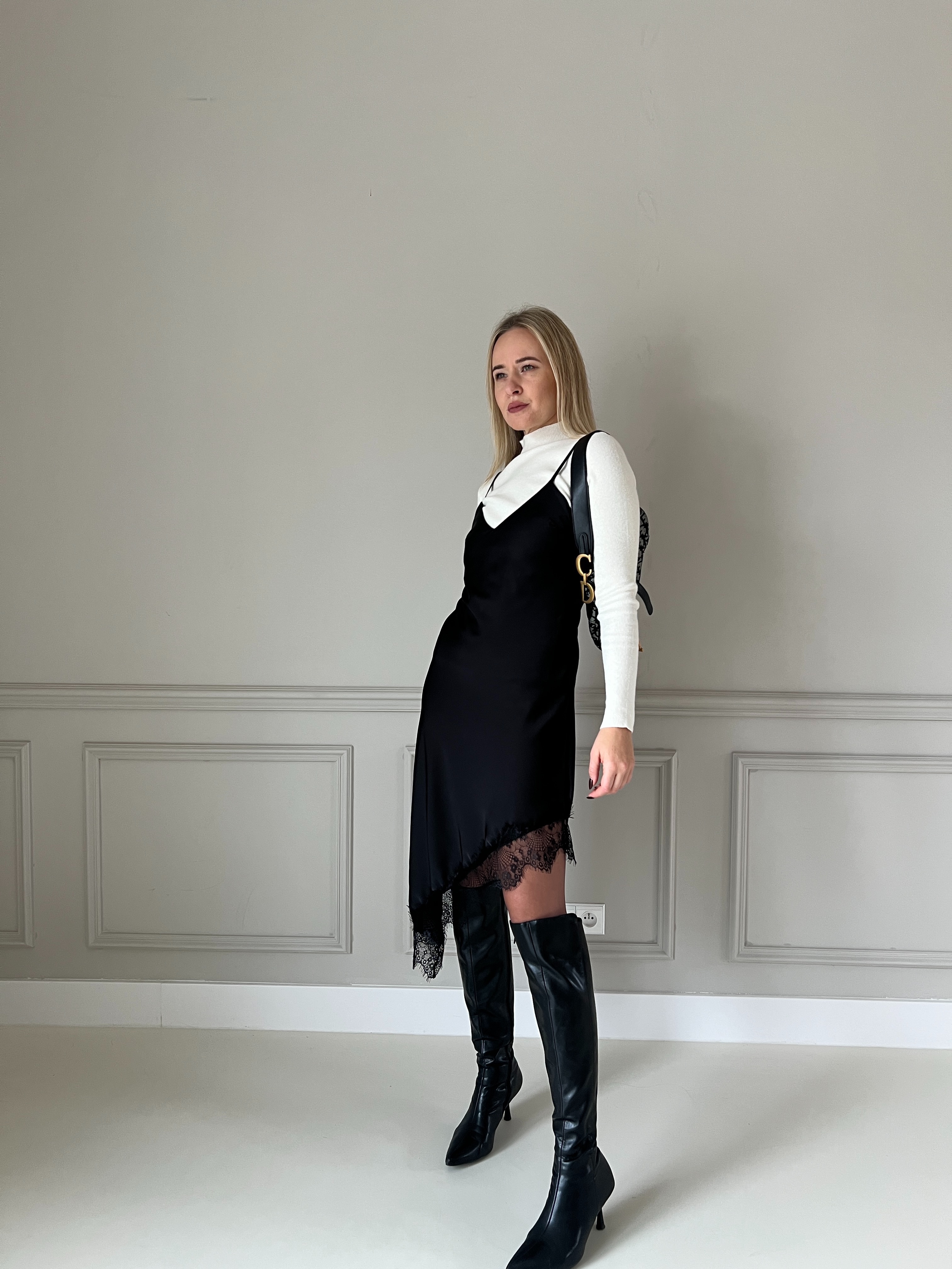 Elegantné čierne šaty s jemnými tenkými ramienkami a decentným V-výstrihom. Dizajn je minimalistický, no obohatený výrazným čipkovým lemom, ktorý dodáva výraznú ženskosť a štýl. Materiál je splývavý a príjemný na nosenie – strih zvýrazní siluetu, vďaka čomu sú tieto šaty ideálne na večerné podujatia, oslavy alebo iné špeciálne príležitosti. Modelka má výšku 170cm, na sebe má veľkosť S.