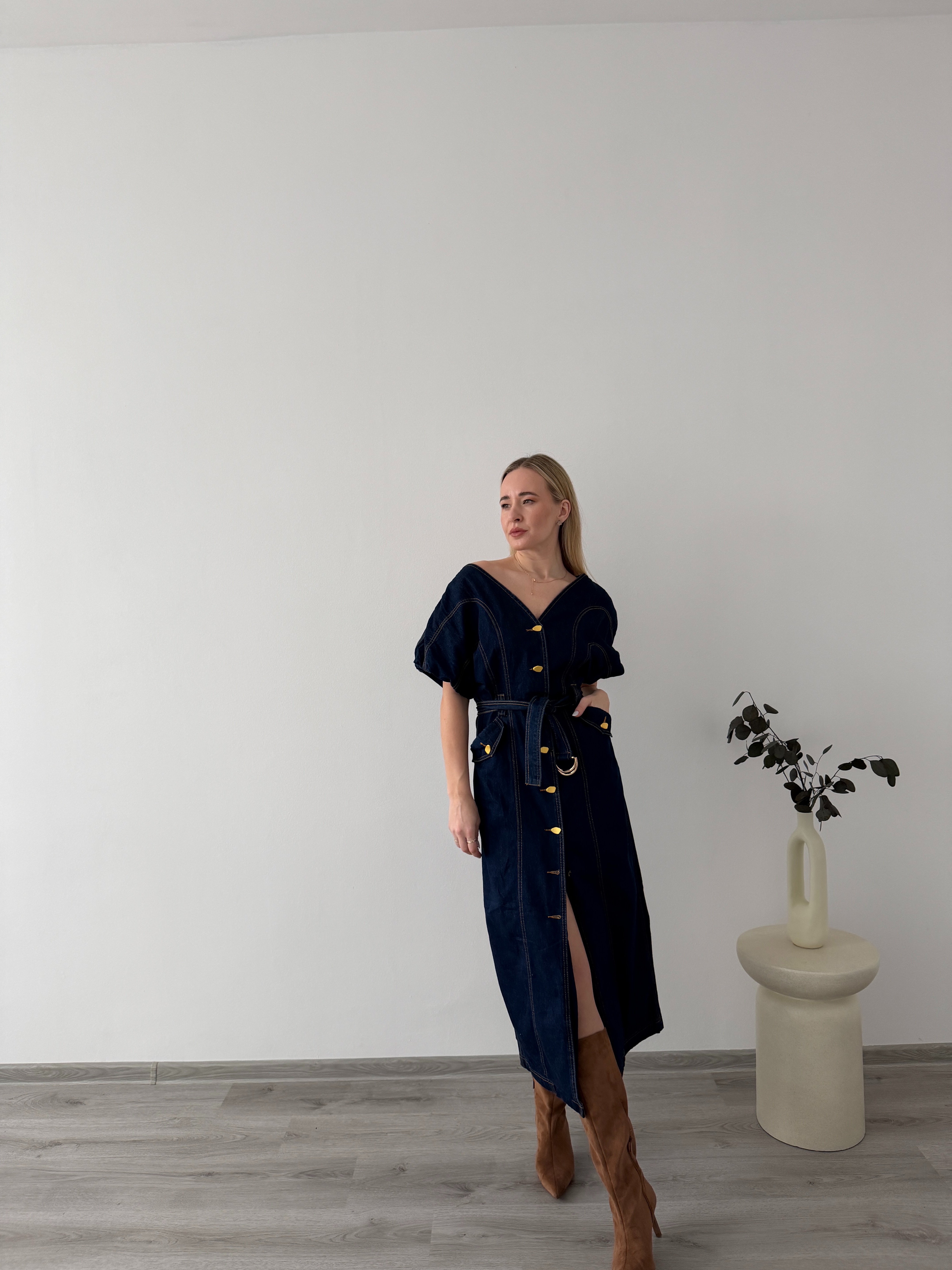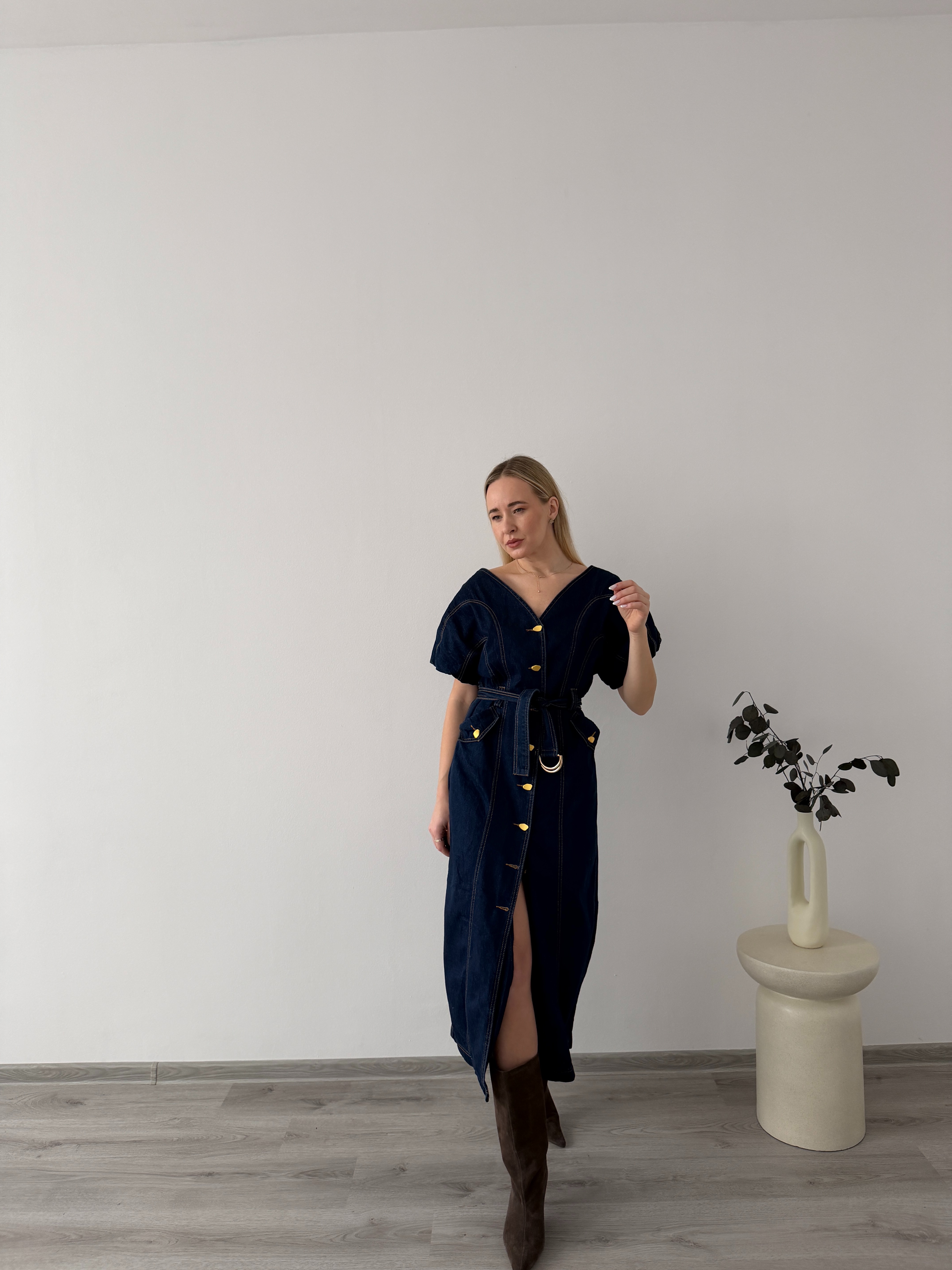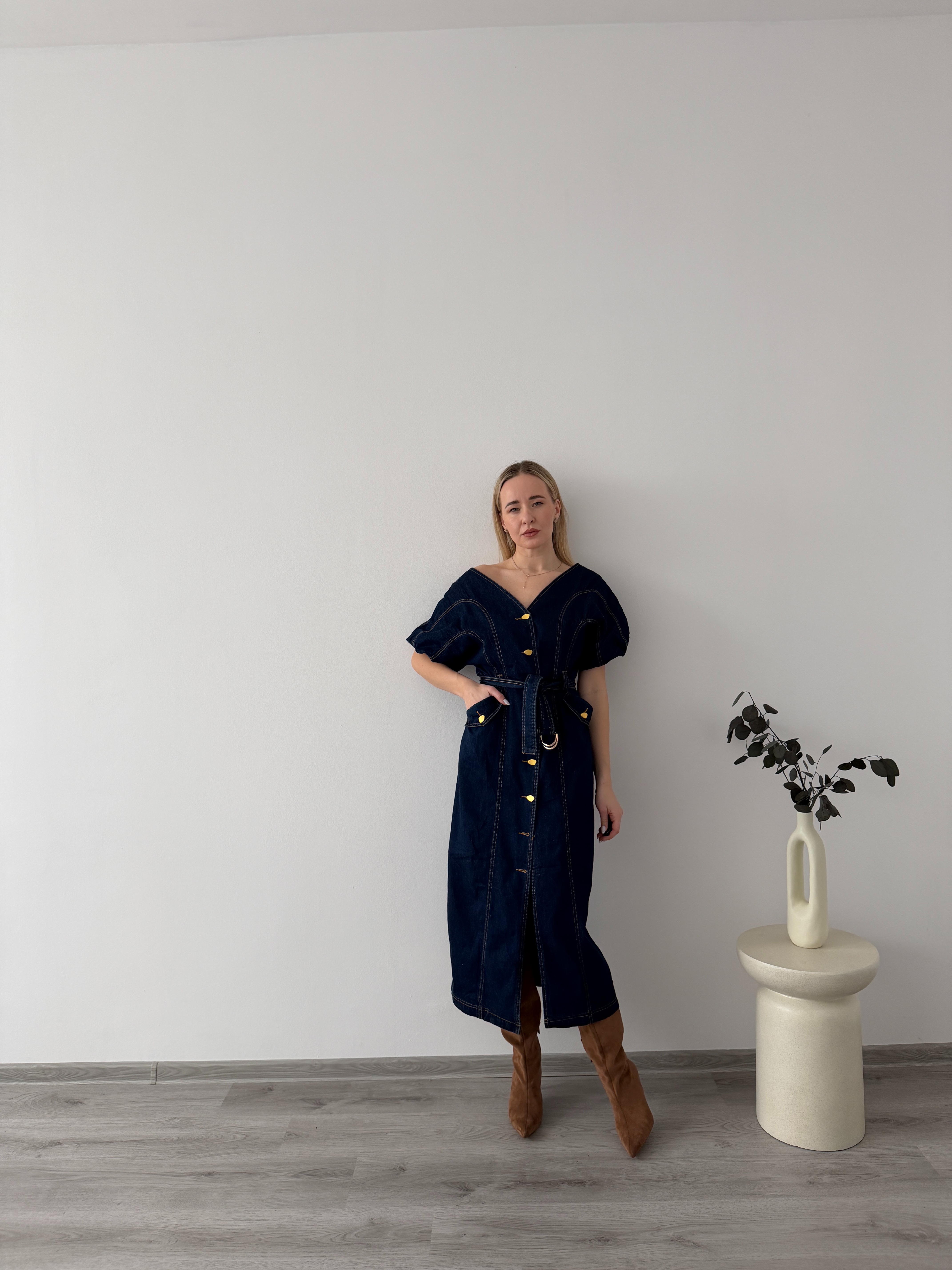Denimové šaty s opaskom a gombíkmi po celej dĺžke. Praktický, ženský strih, ktorý krásne zvýrazní siluetu a hodí sa na celodenné nosenie.