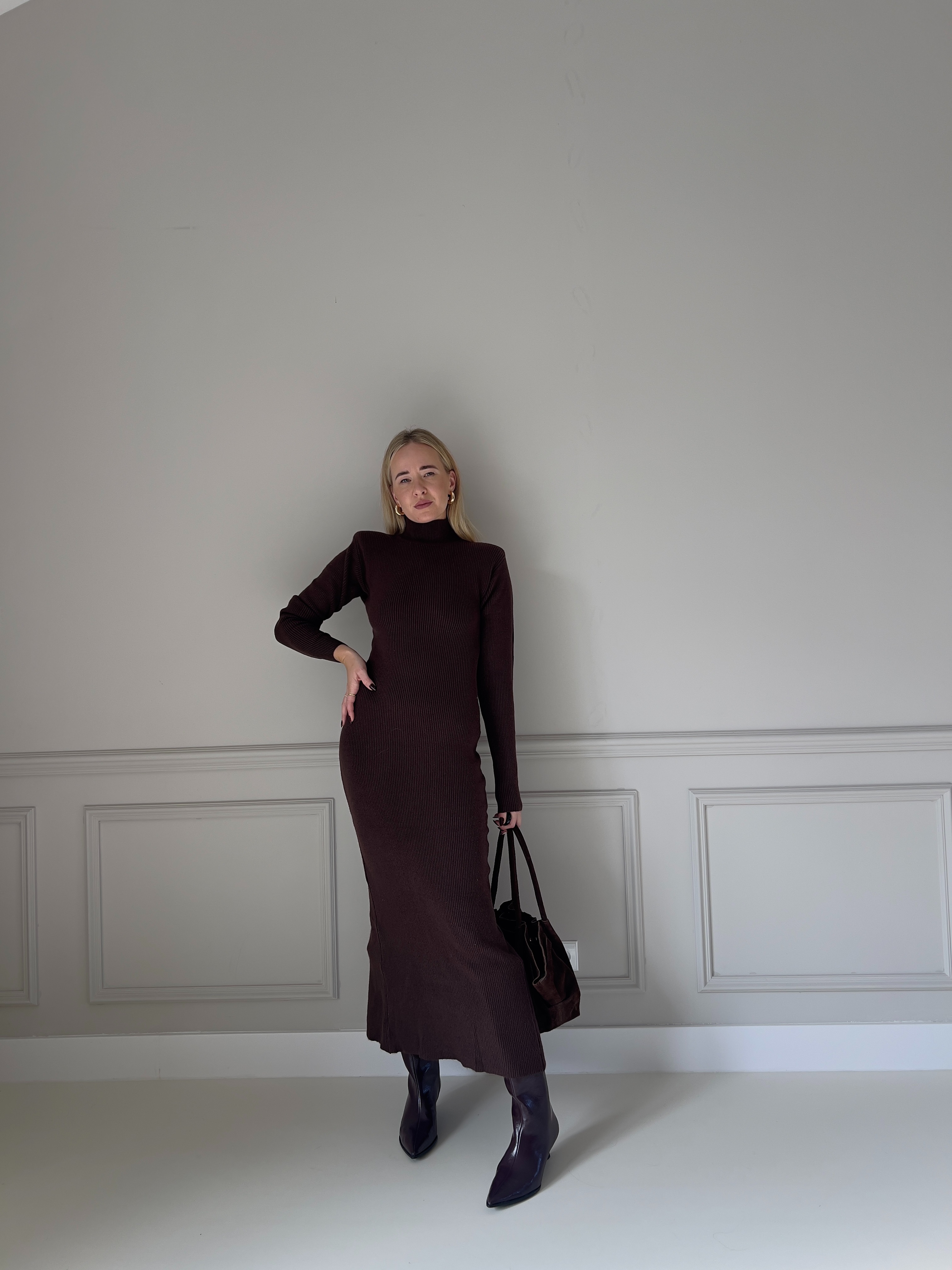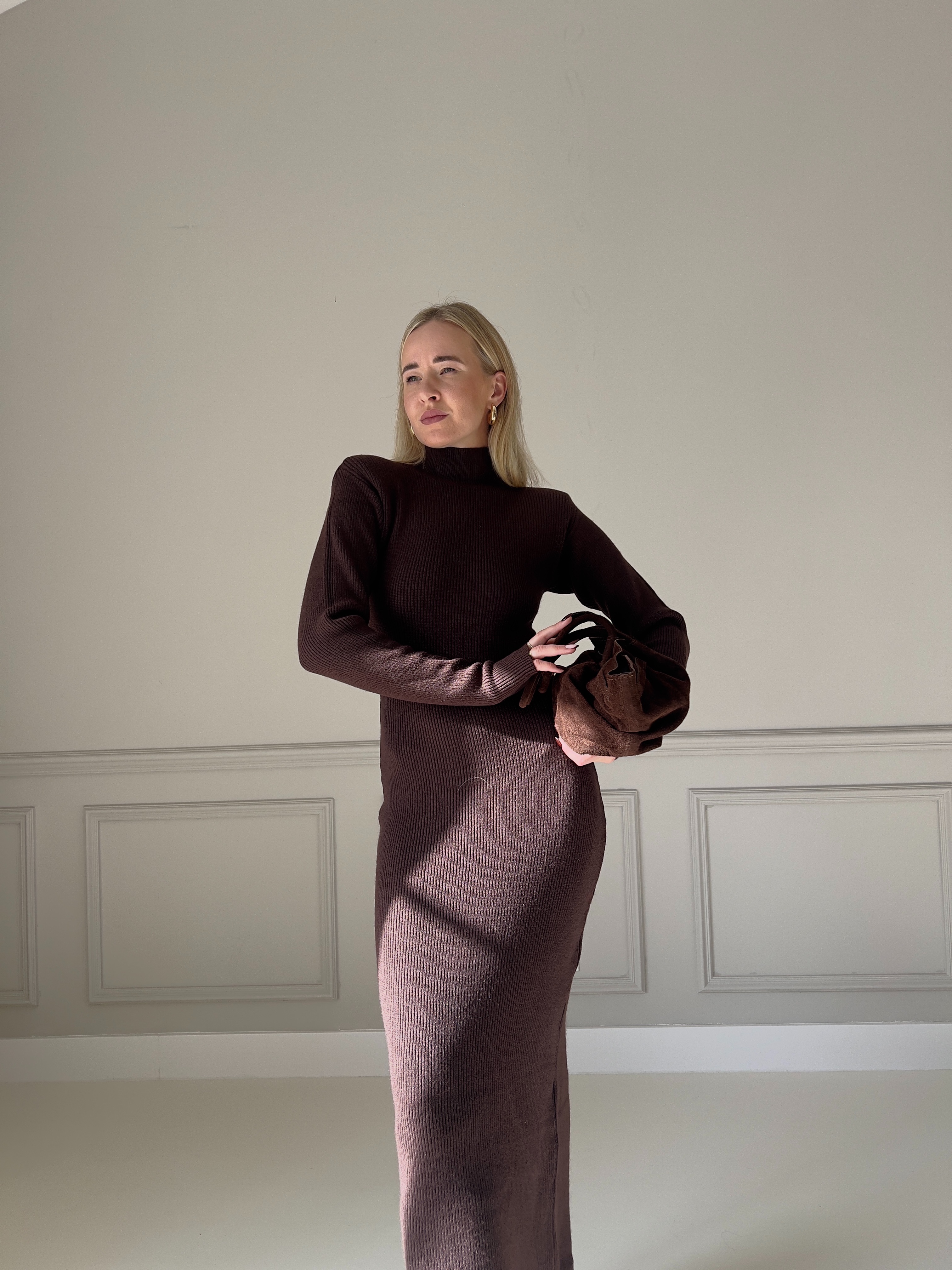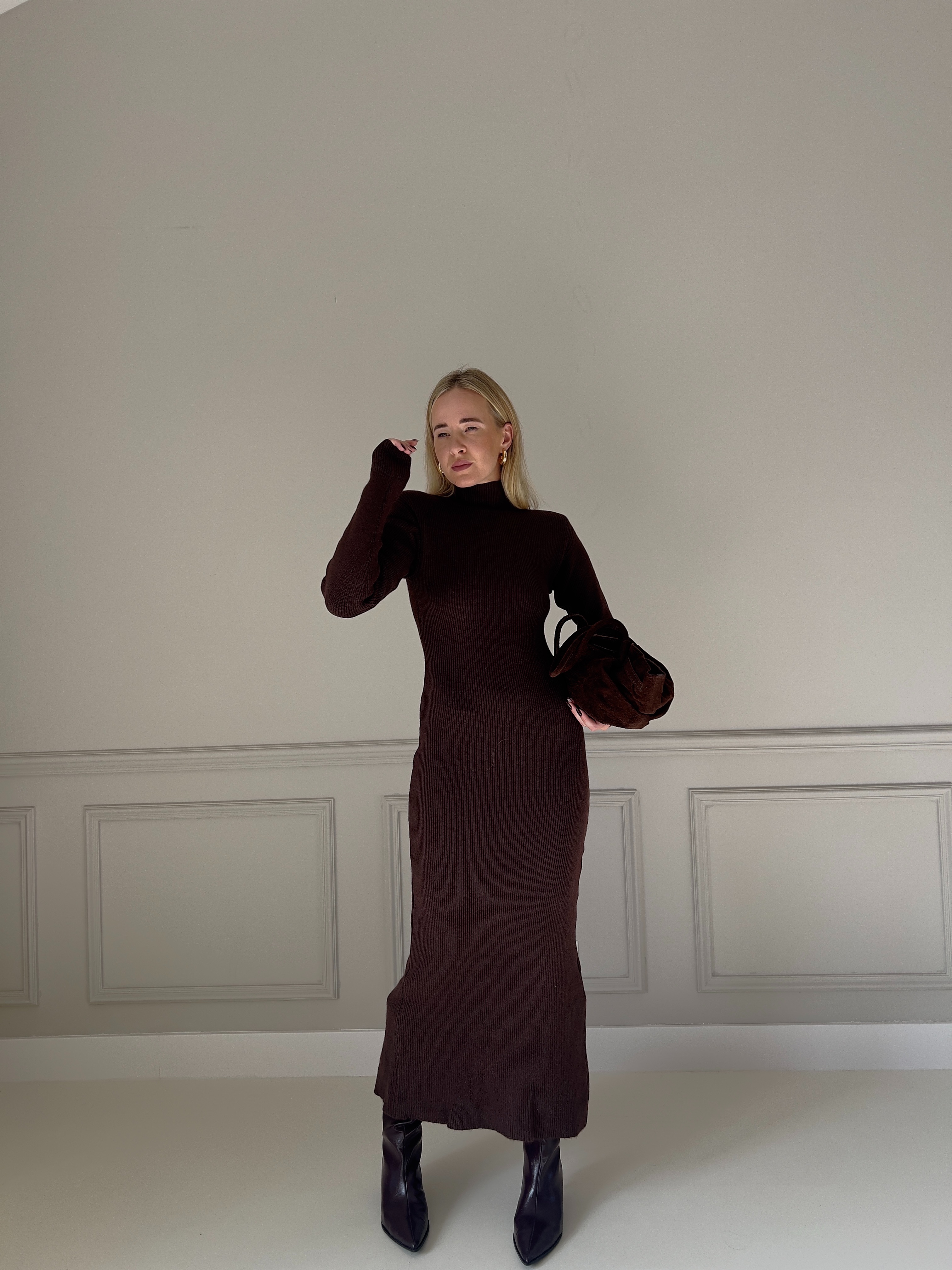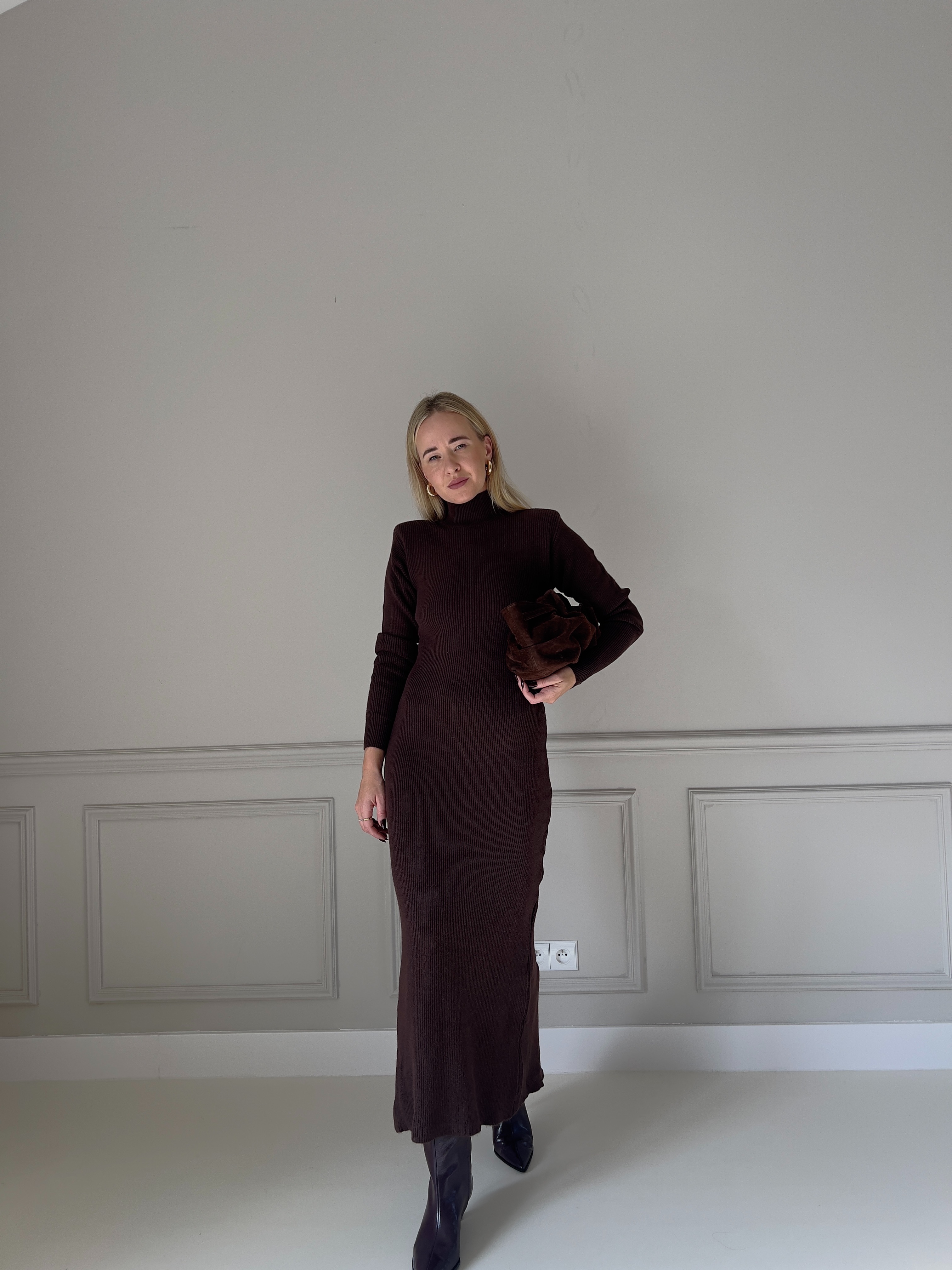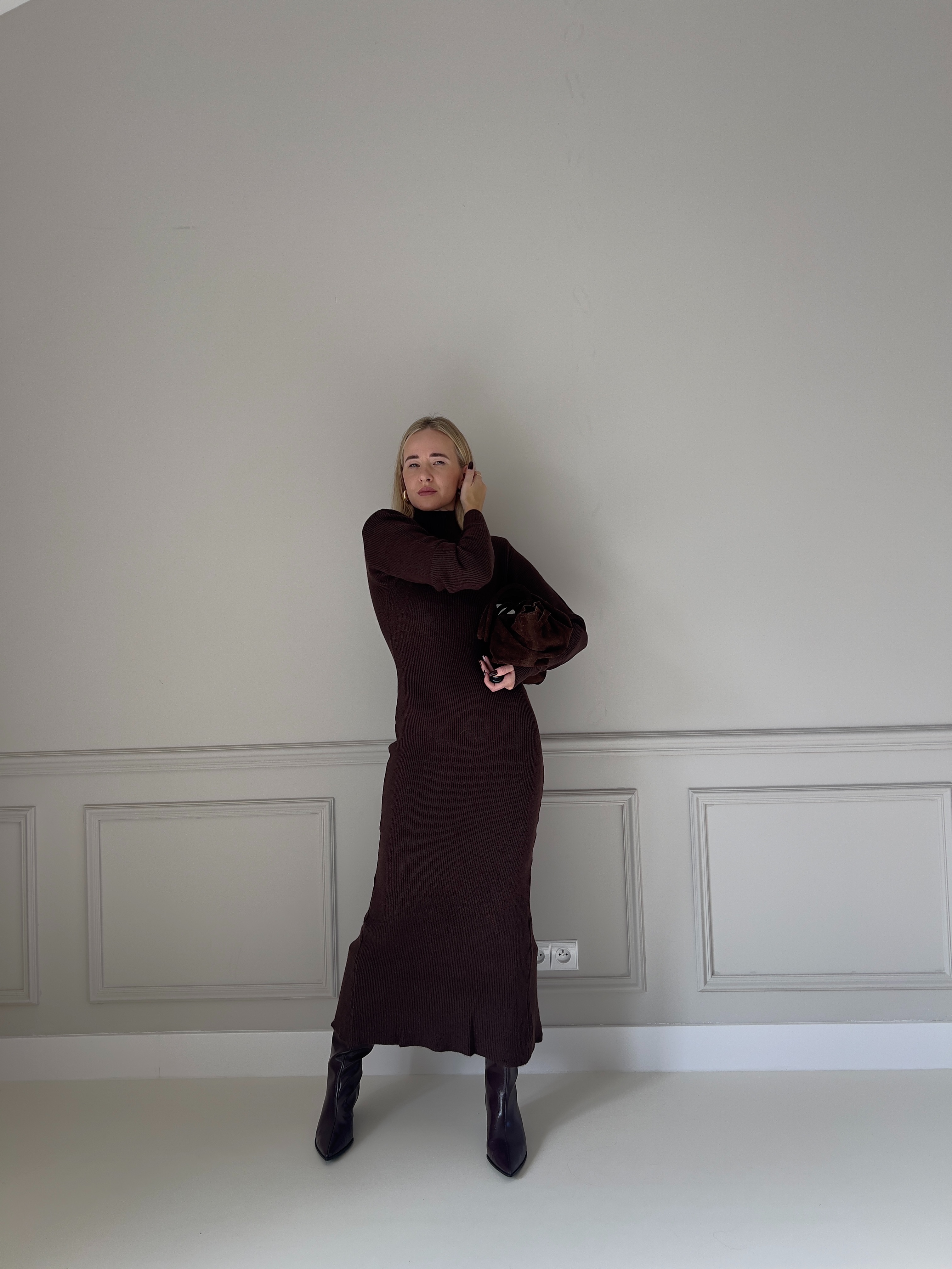 Úpletové šaty v maxi dĺžke s jemne vrúbkovanou štruktúrou. Šaty majú v zadnej časti rozparok. Modelka má výšku 170cm, nosí veľkosť S.