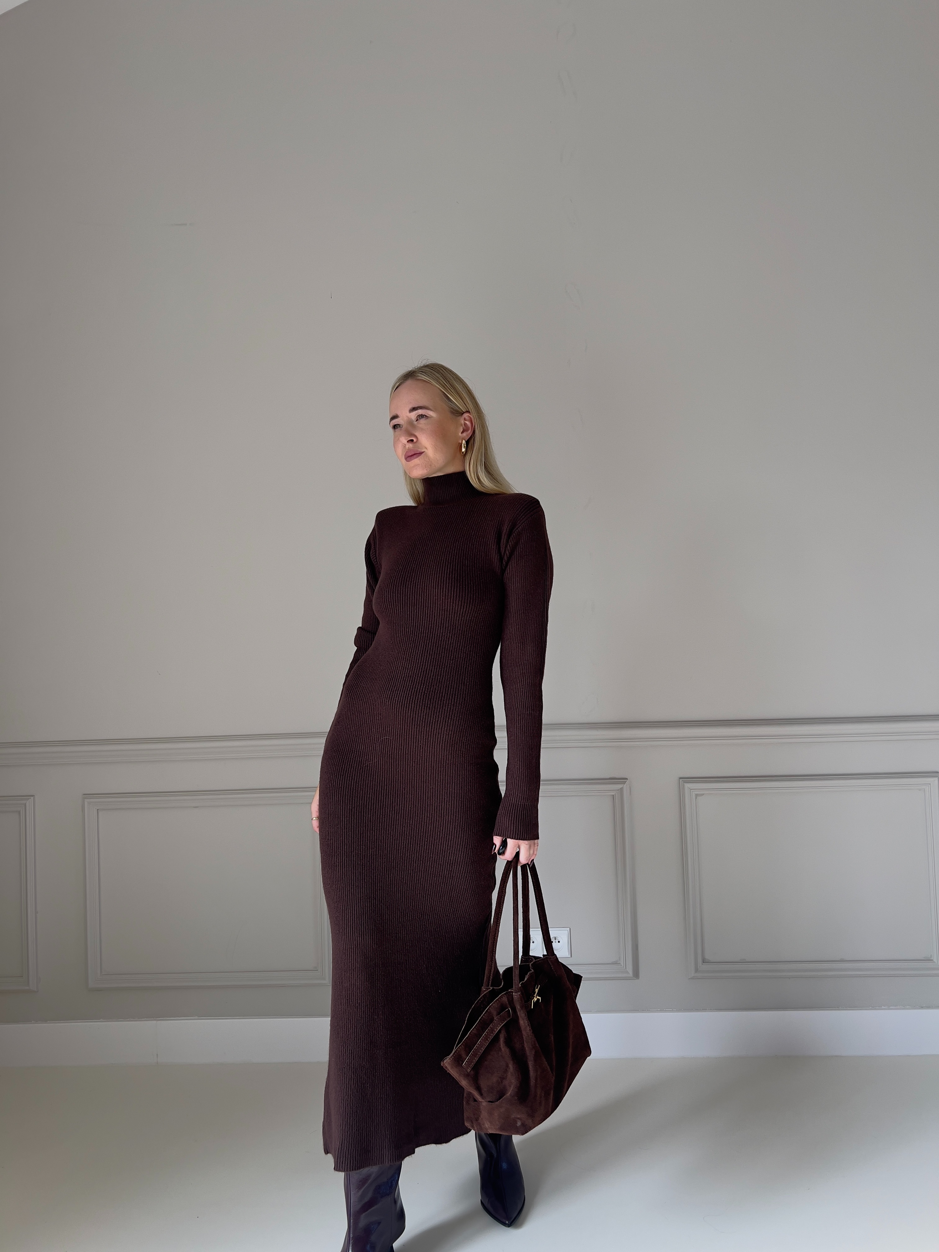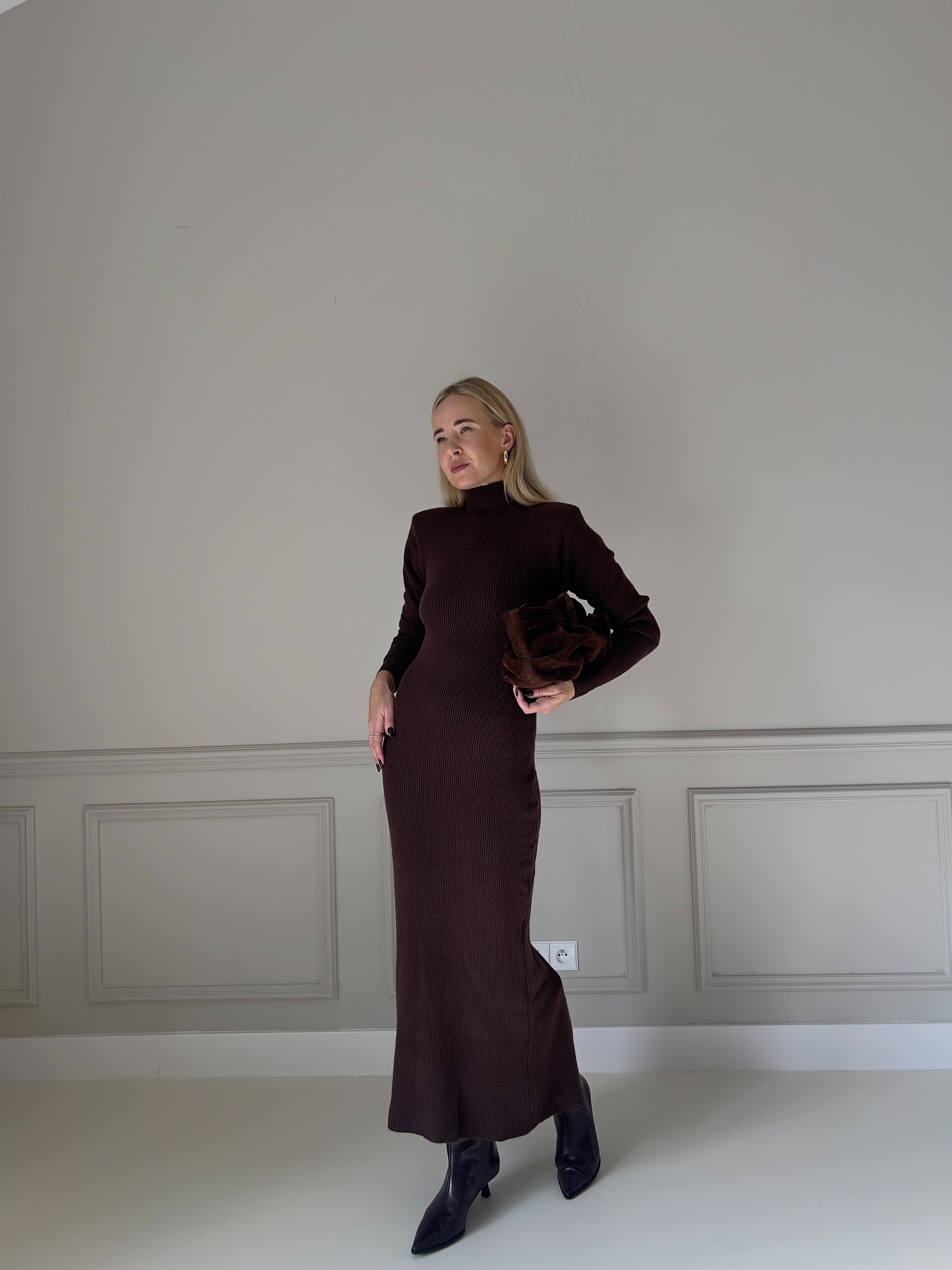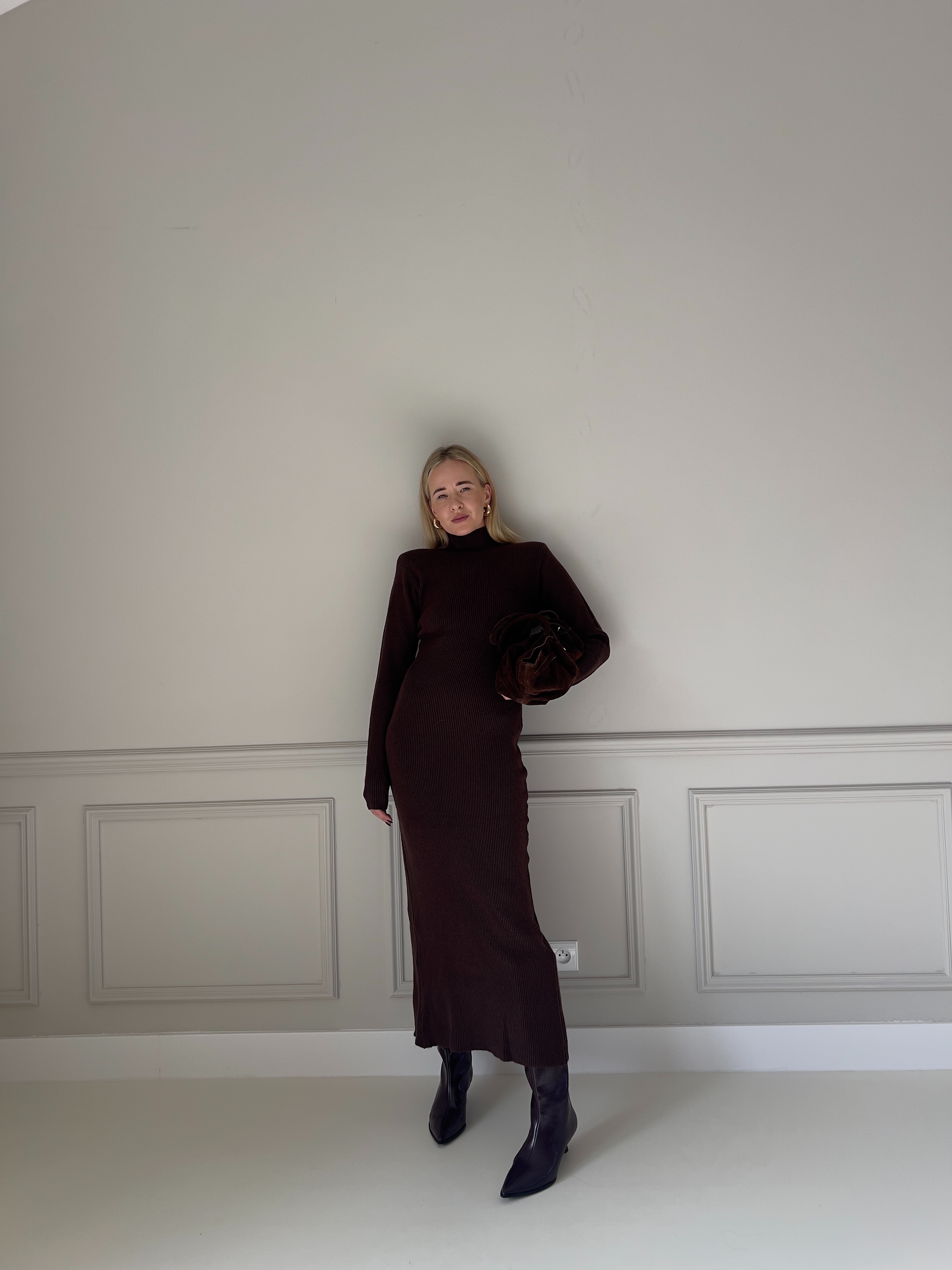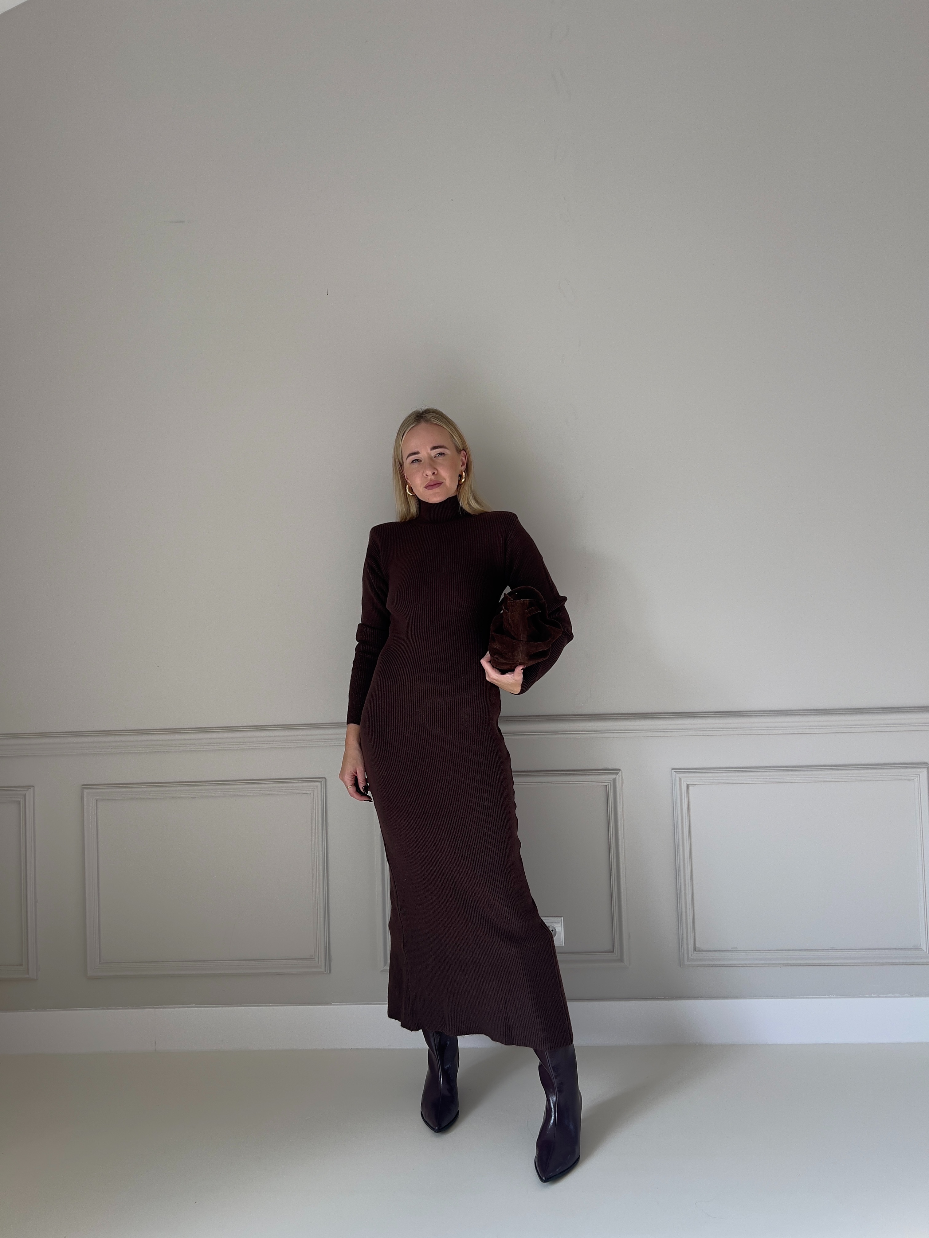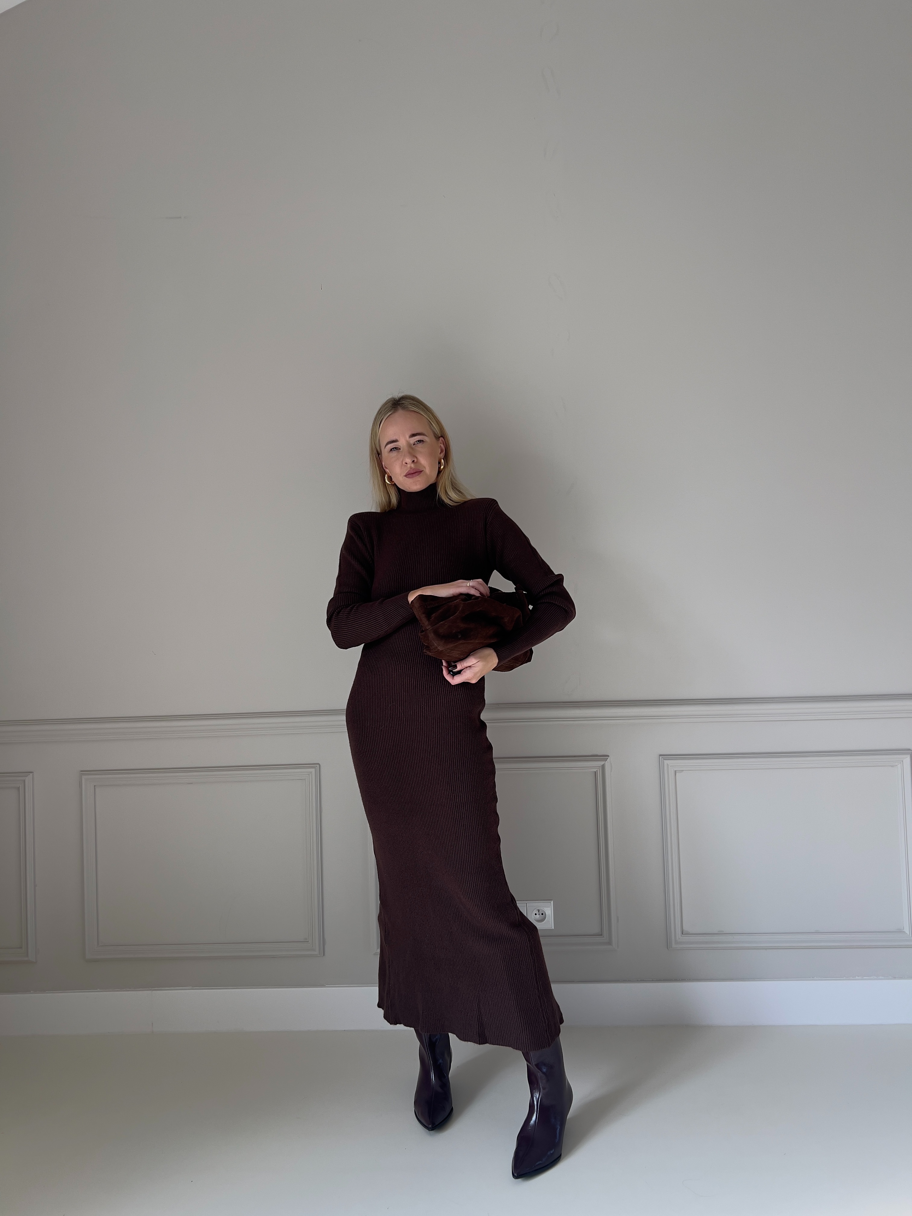 Úpletové šaty v maxi dĺžke s jemne vrúbkovanou štruktúrou. Šaty majú v zadnej časti rozparok. Modelka má výšku 170cm, nosí veľkosť S.