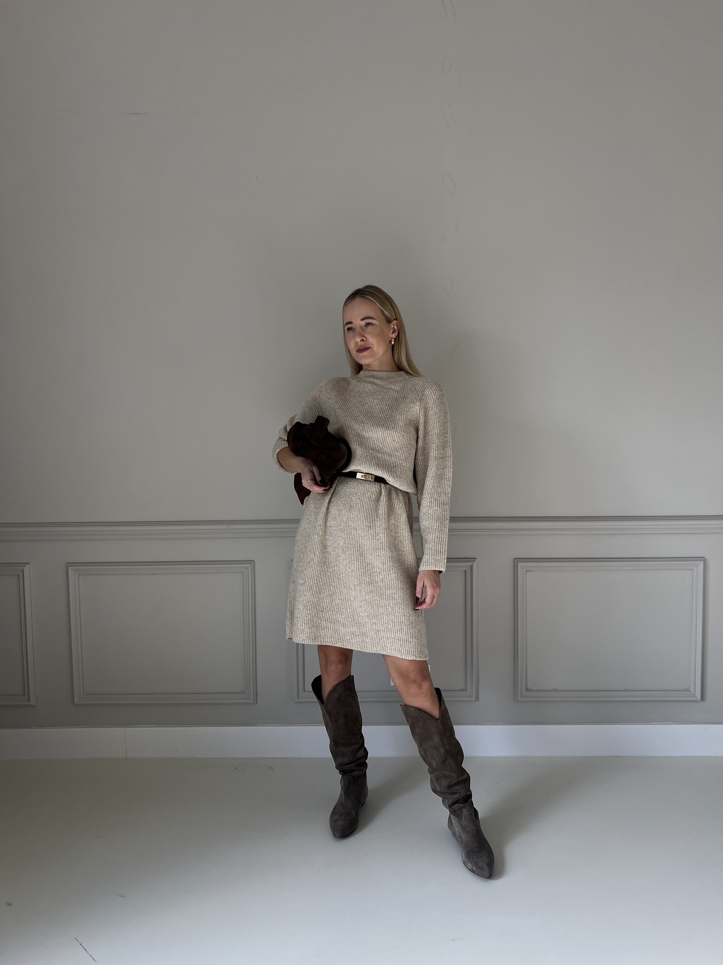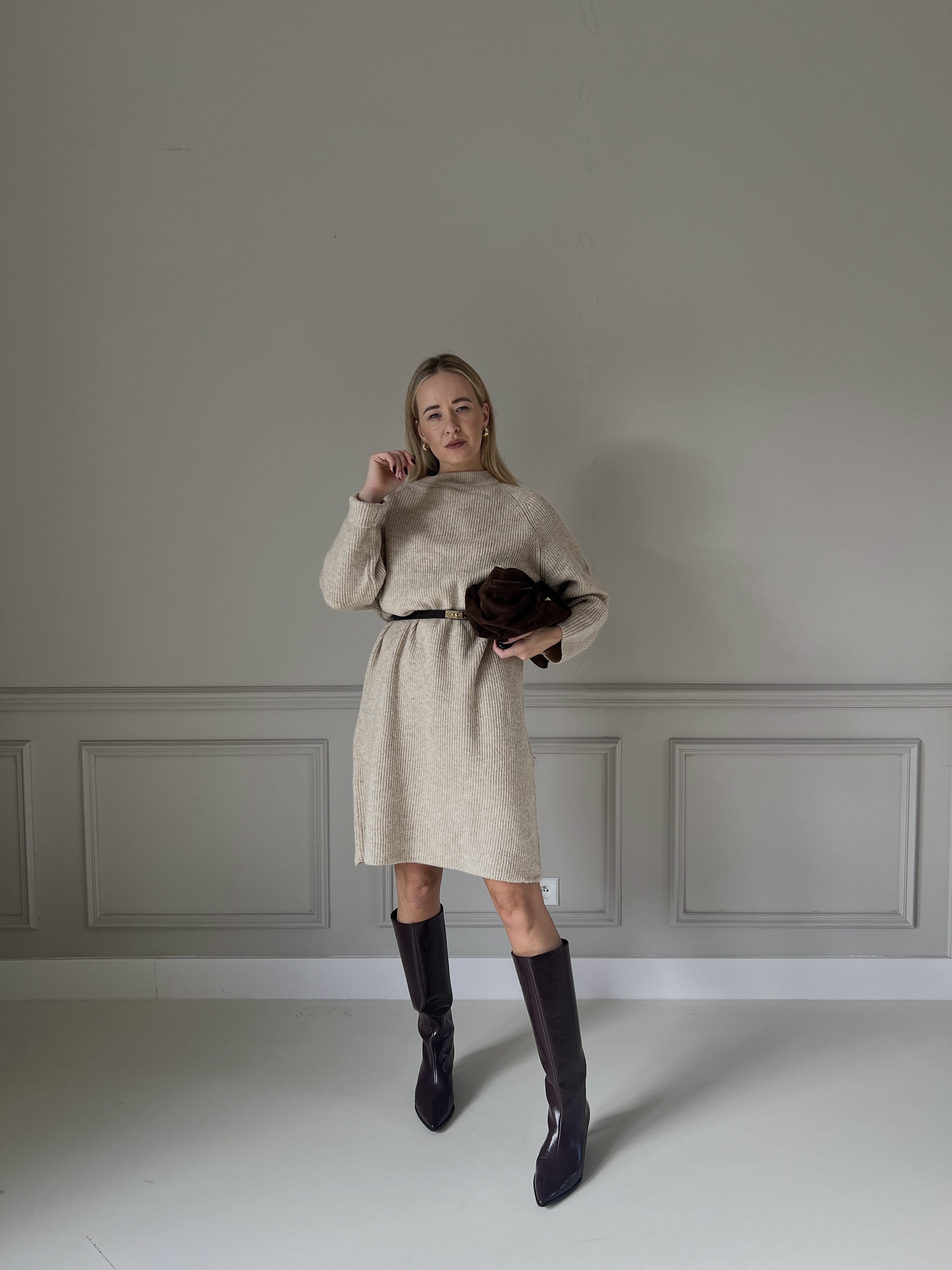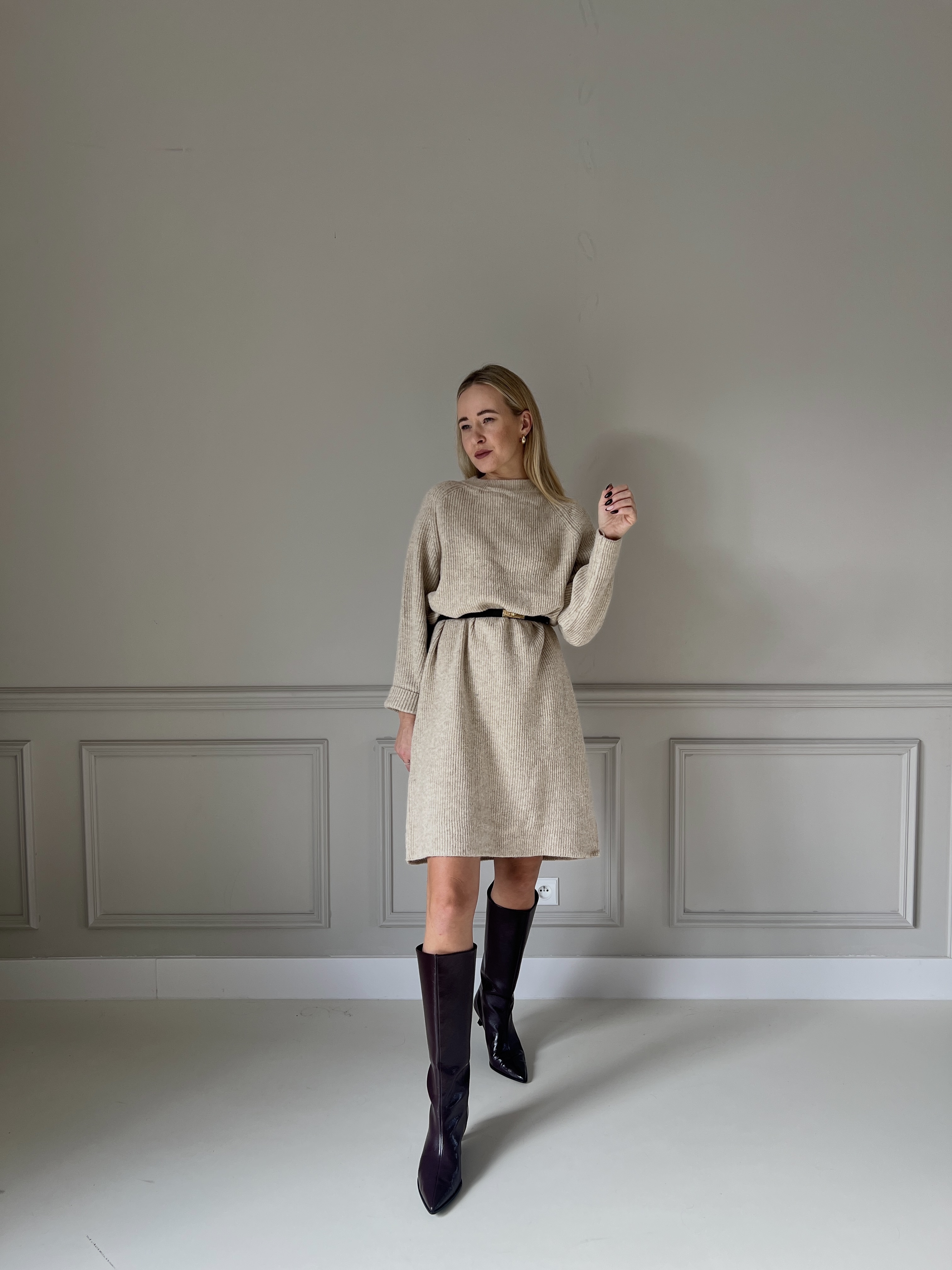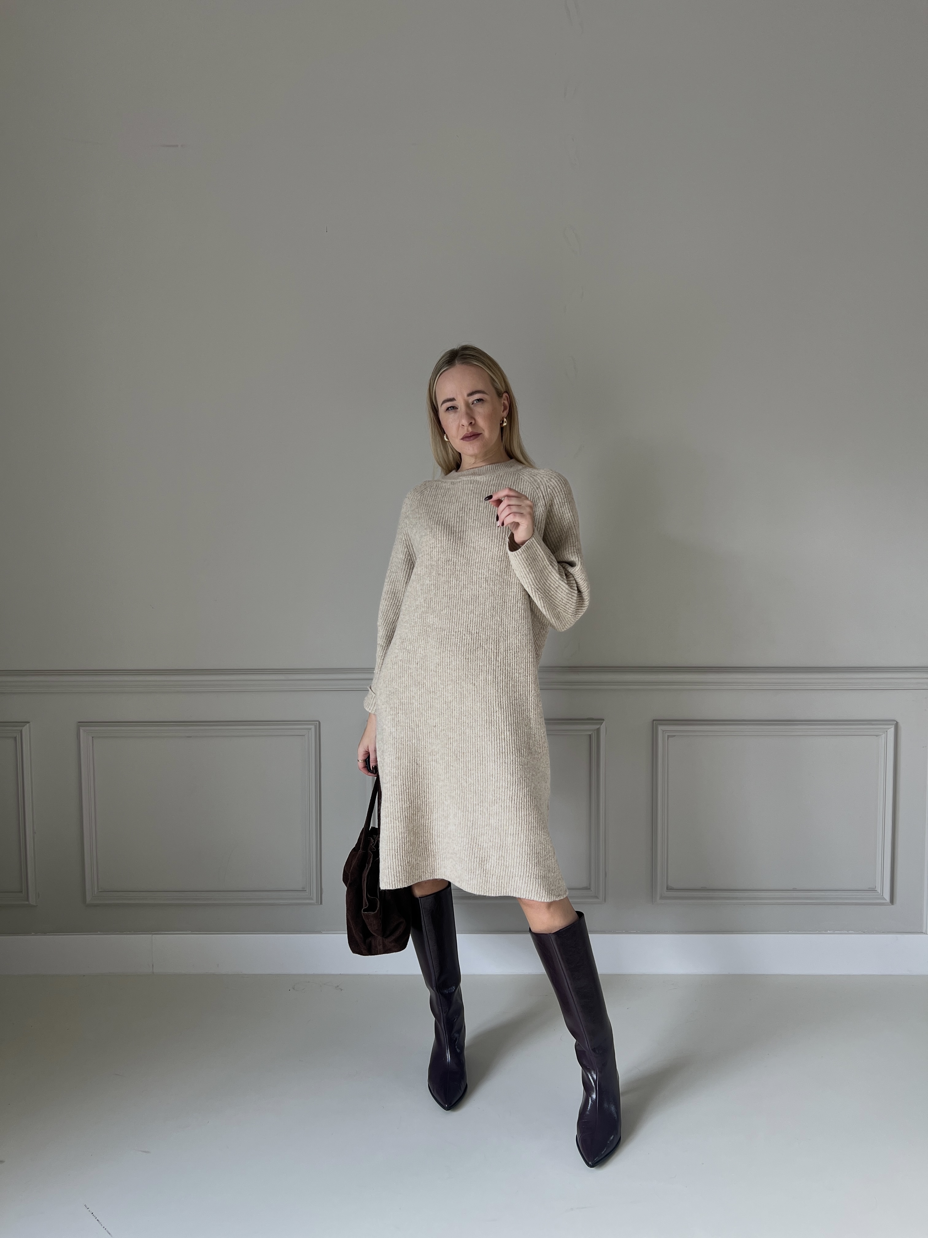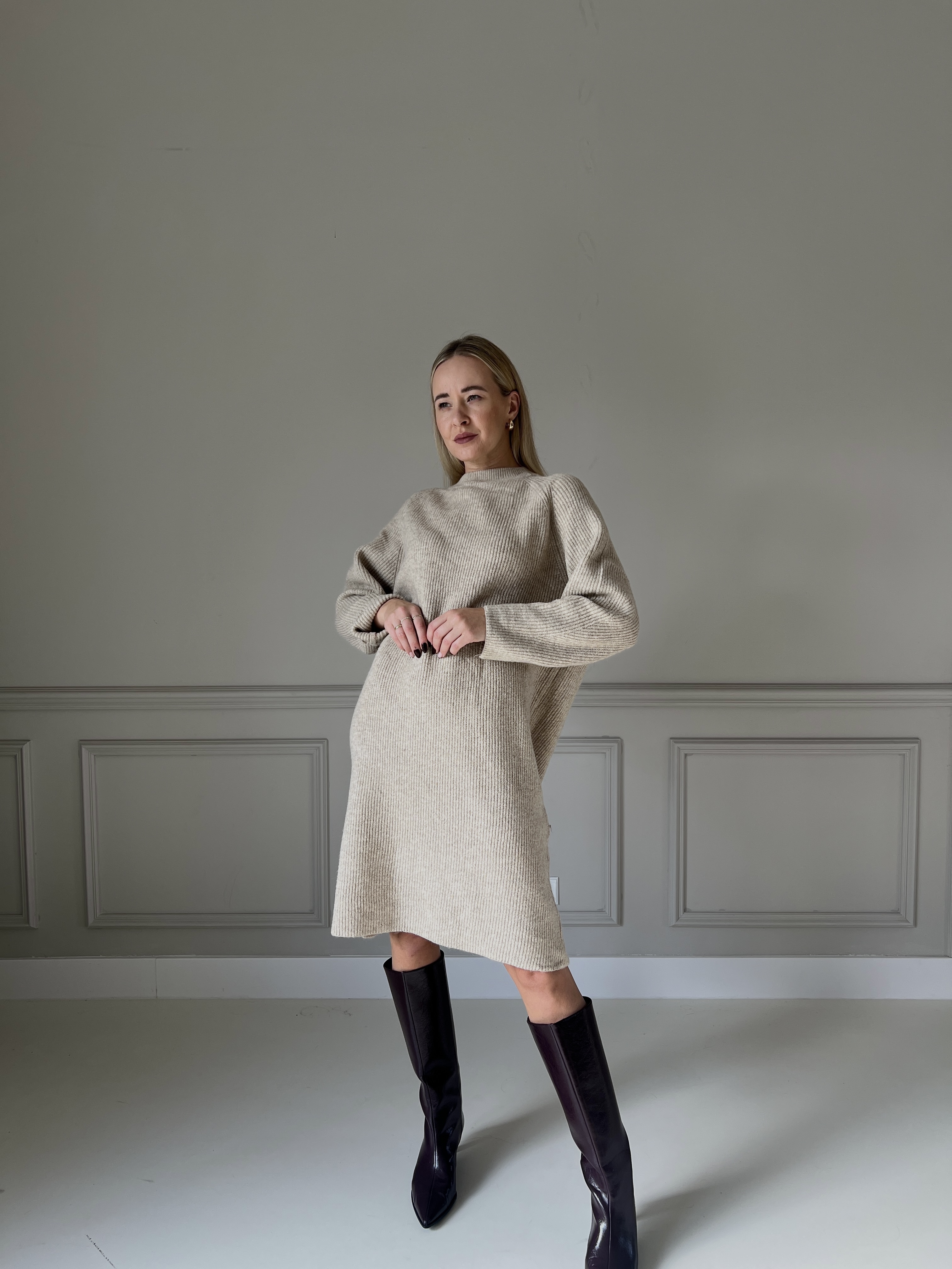 Jemné úpletové šaty v béžovom odtieni s dlhými rukávmi a voľnejším strihom. Materiál pôsobí mäkko a príjemne na dotyk, ktorý ponúka komfort aj eleganciu v jednom.
