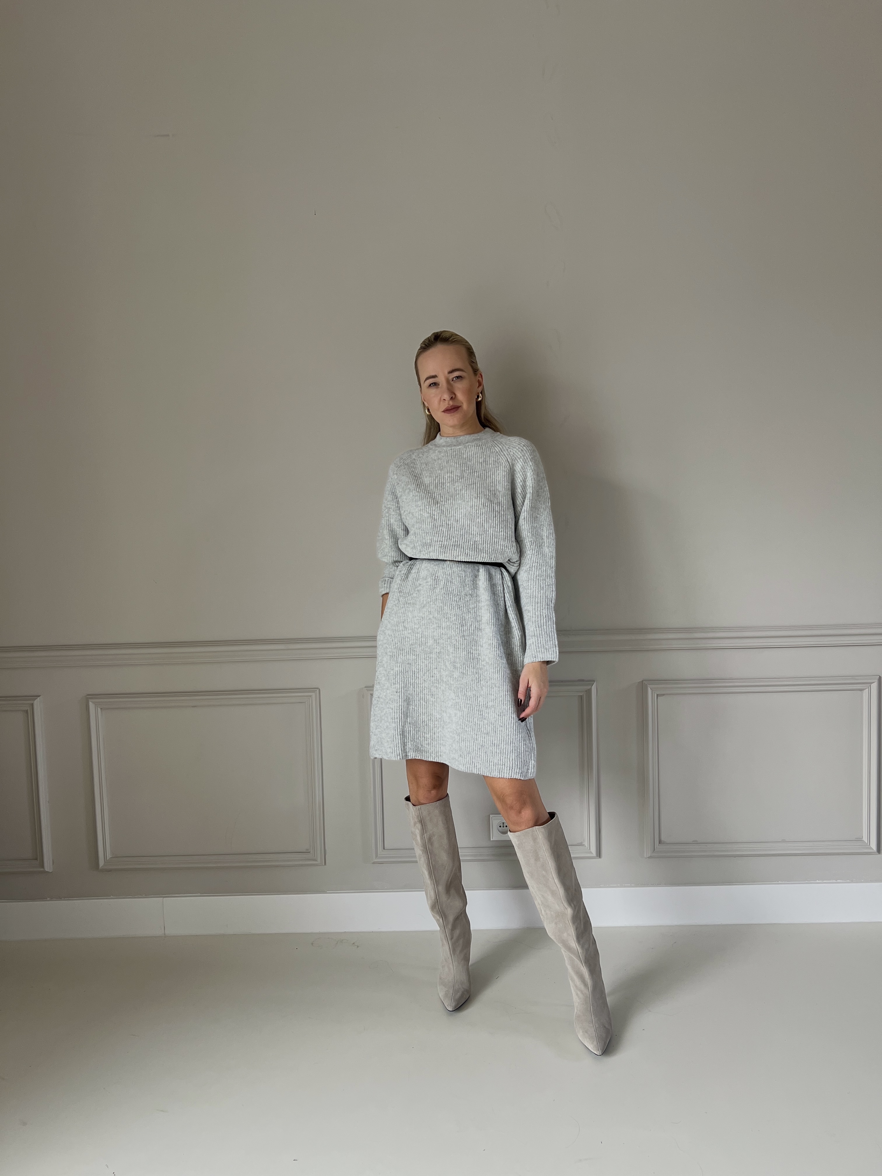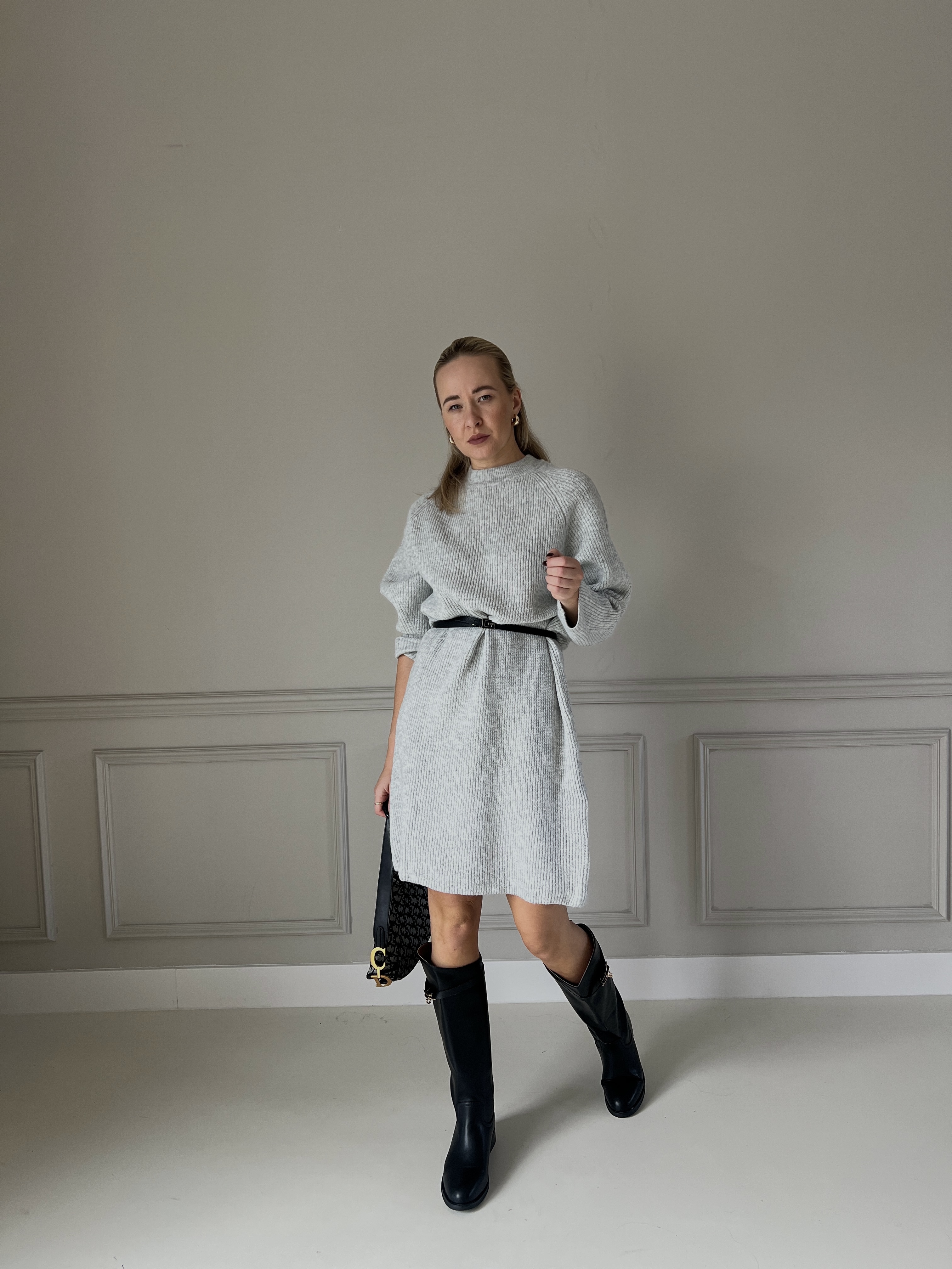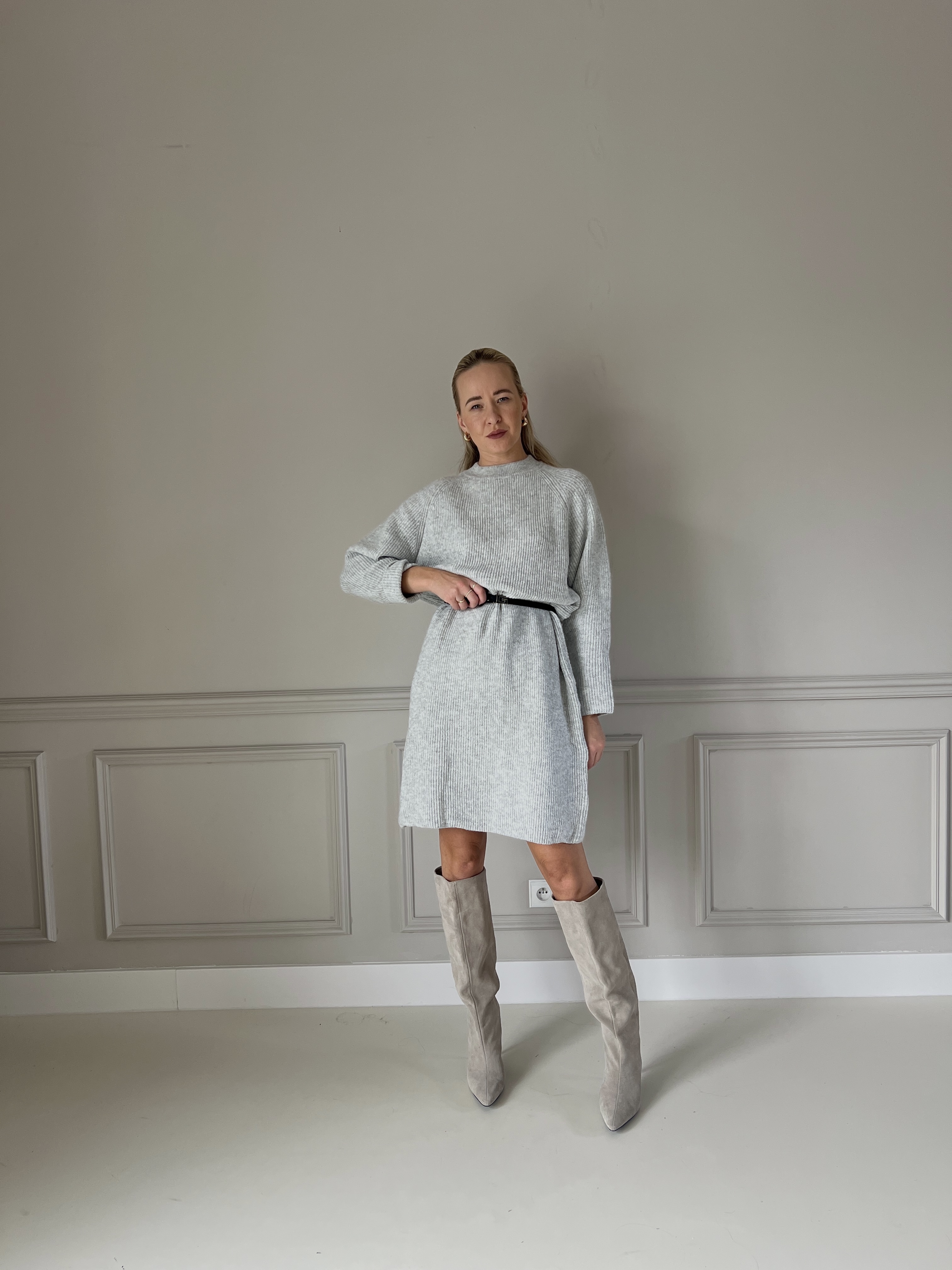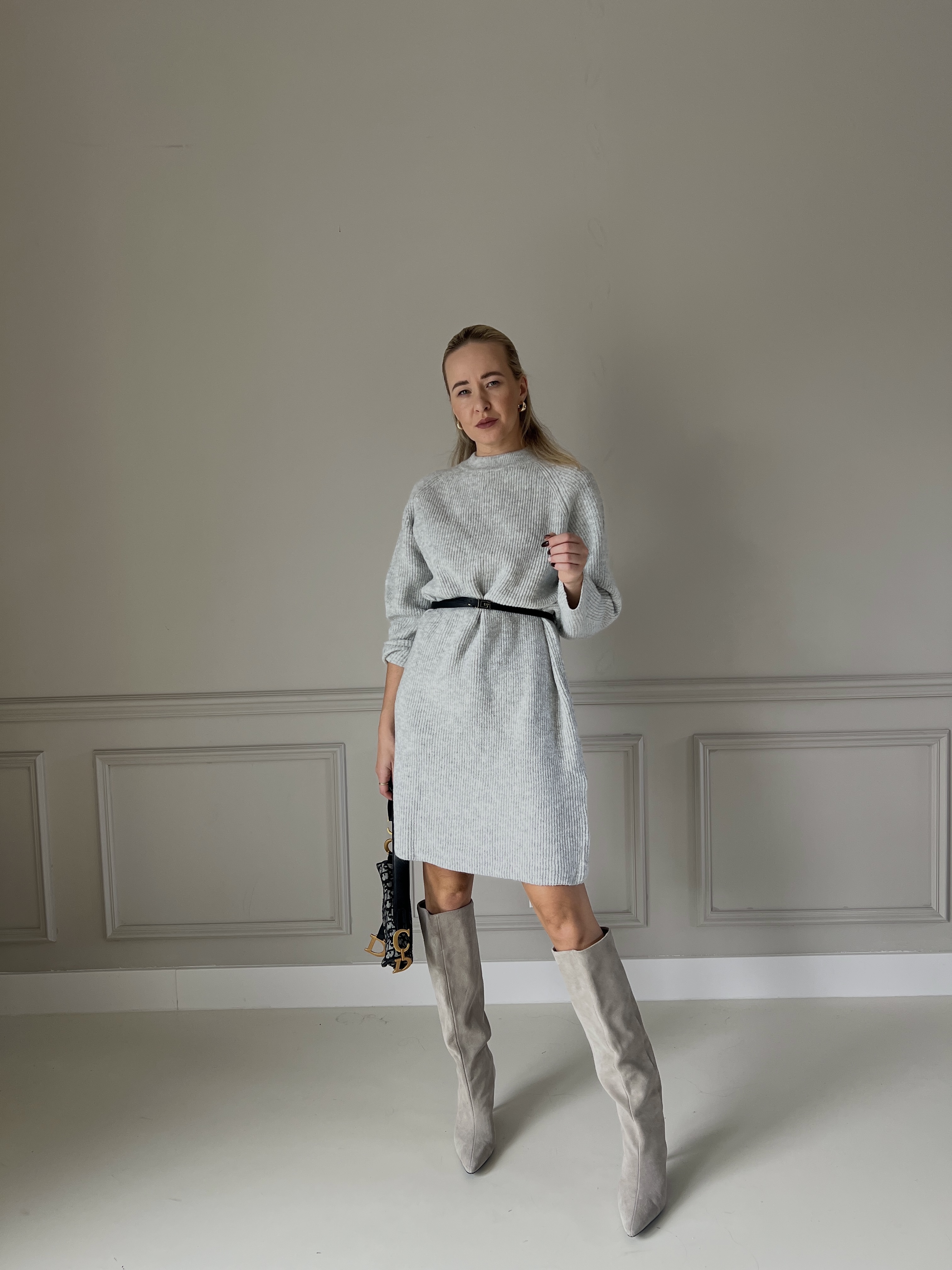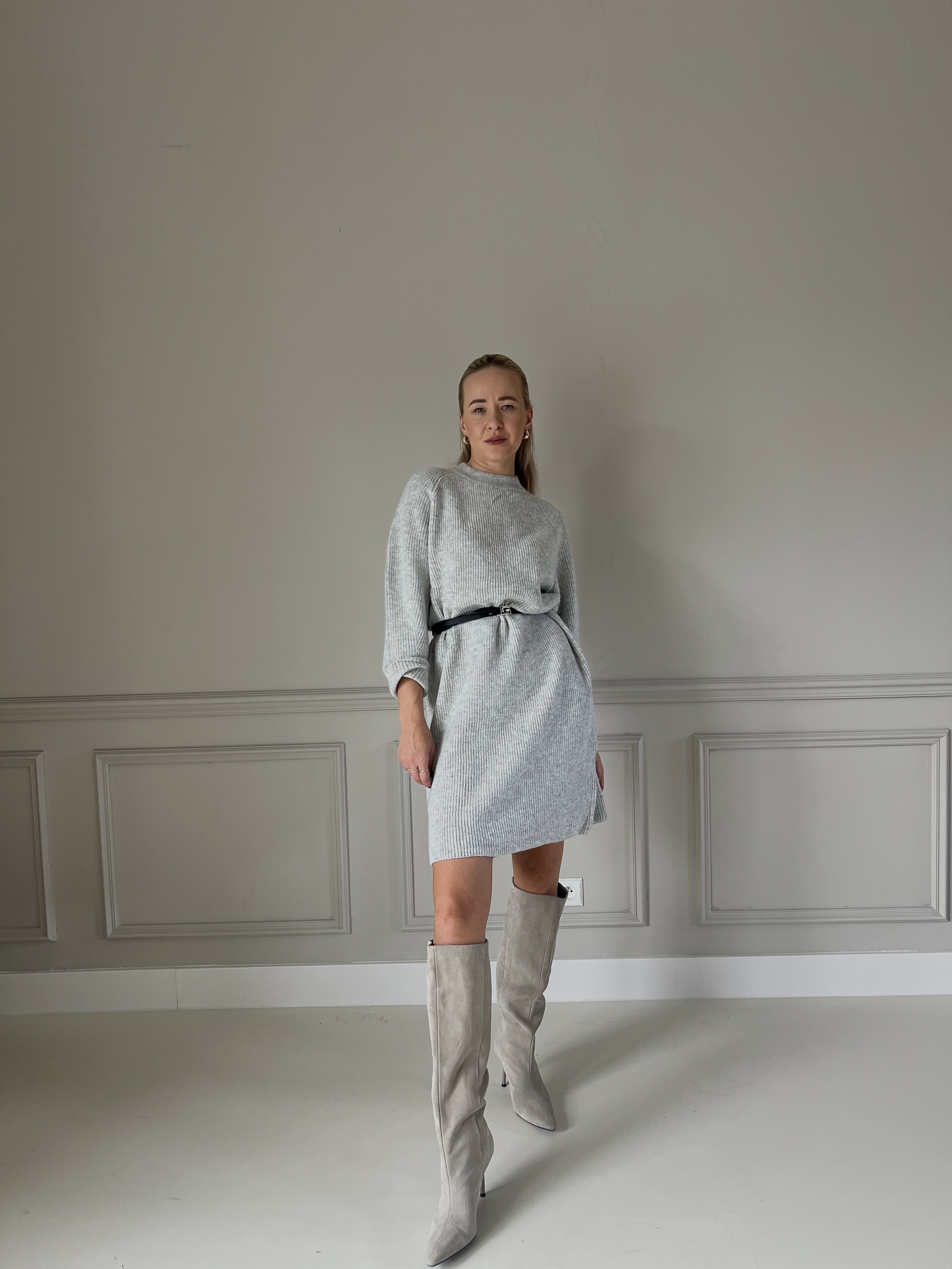 Jemné úpletové šaty v sivom odtieni s dlhými rukávmi a voľnejším strihom. Materiál pôsobí mäkko a príjemne na dotyk, ktorý ponúka komfort aj eleganciu v jednom.