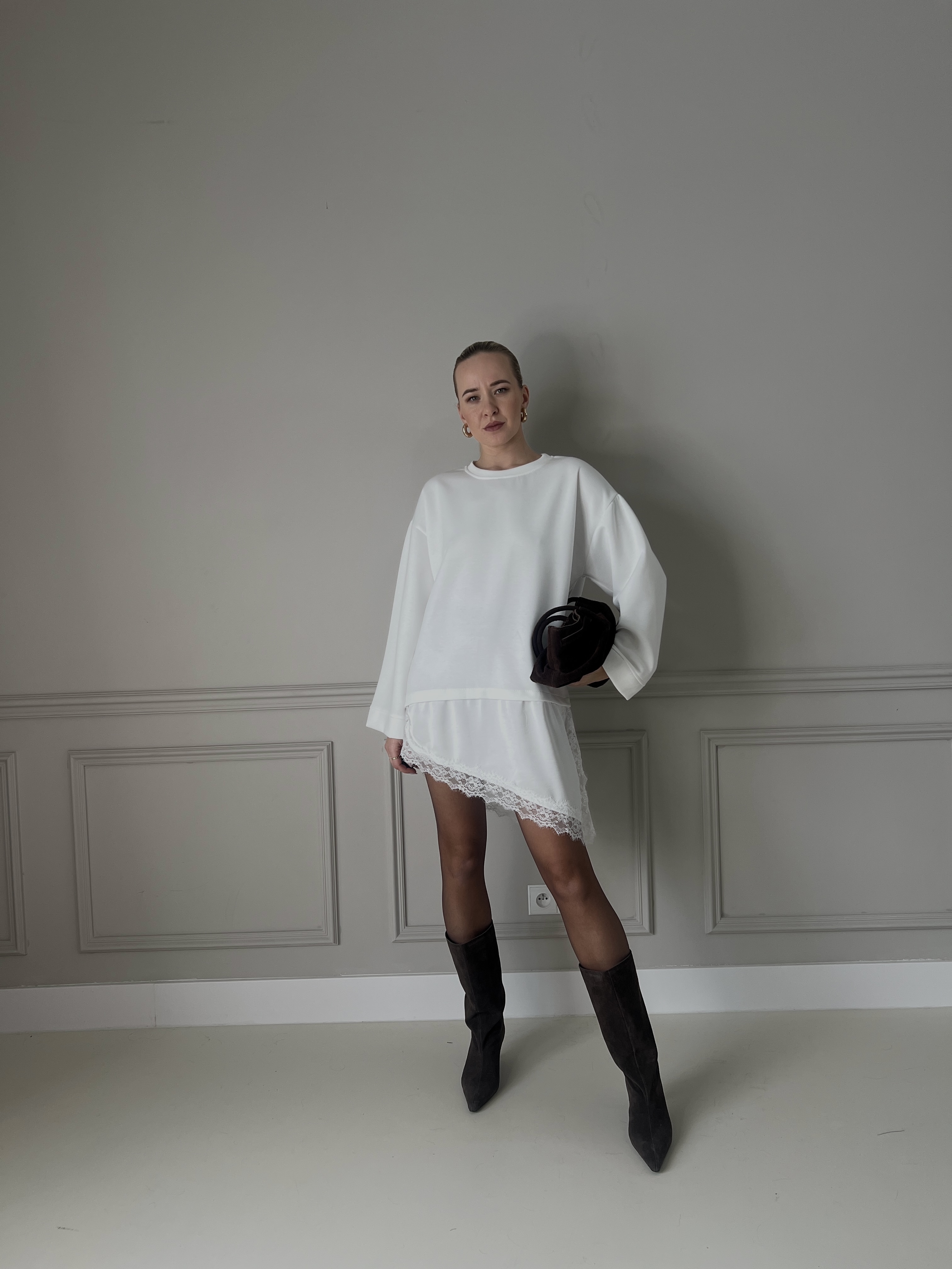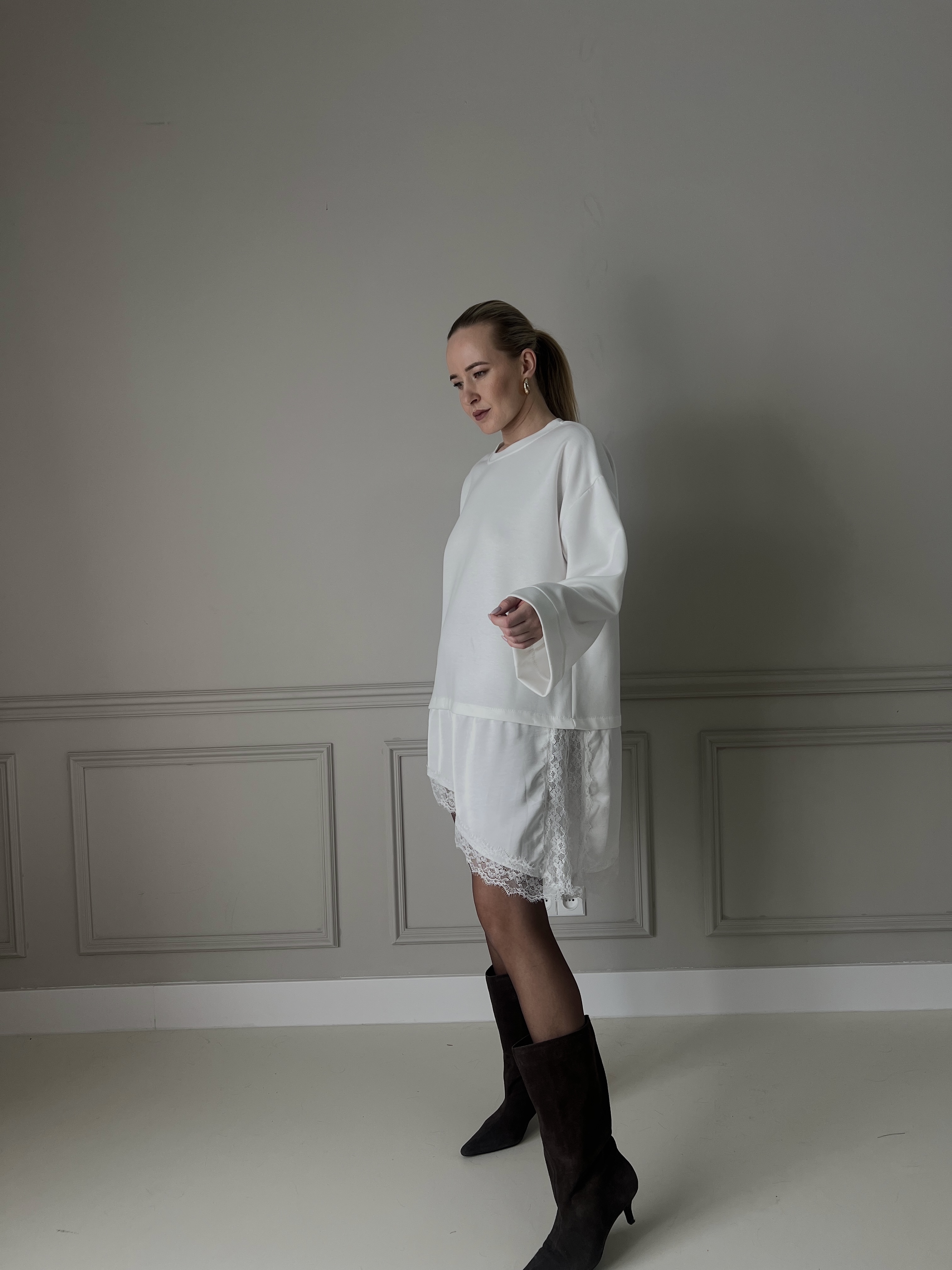Elegantné biele oversize šaty vyrobené z príjemného mäkkého materiálu, ktoré poskytujú maximálne pohodlie počas celého dňa. Spodný lem je doplnený jemnou čipkou, ktorá dodáva modelu ženskosť a ľahkosť. Ideálne na bežné nosenie aj štýlové príležitosti.