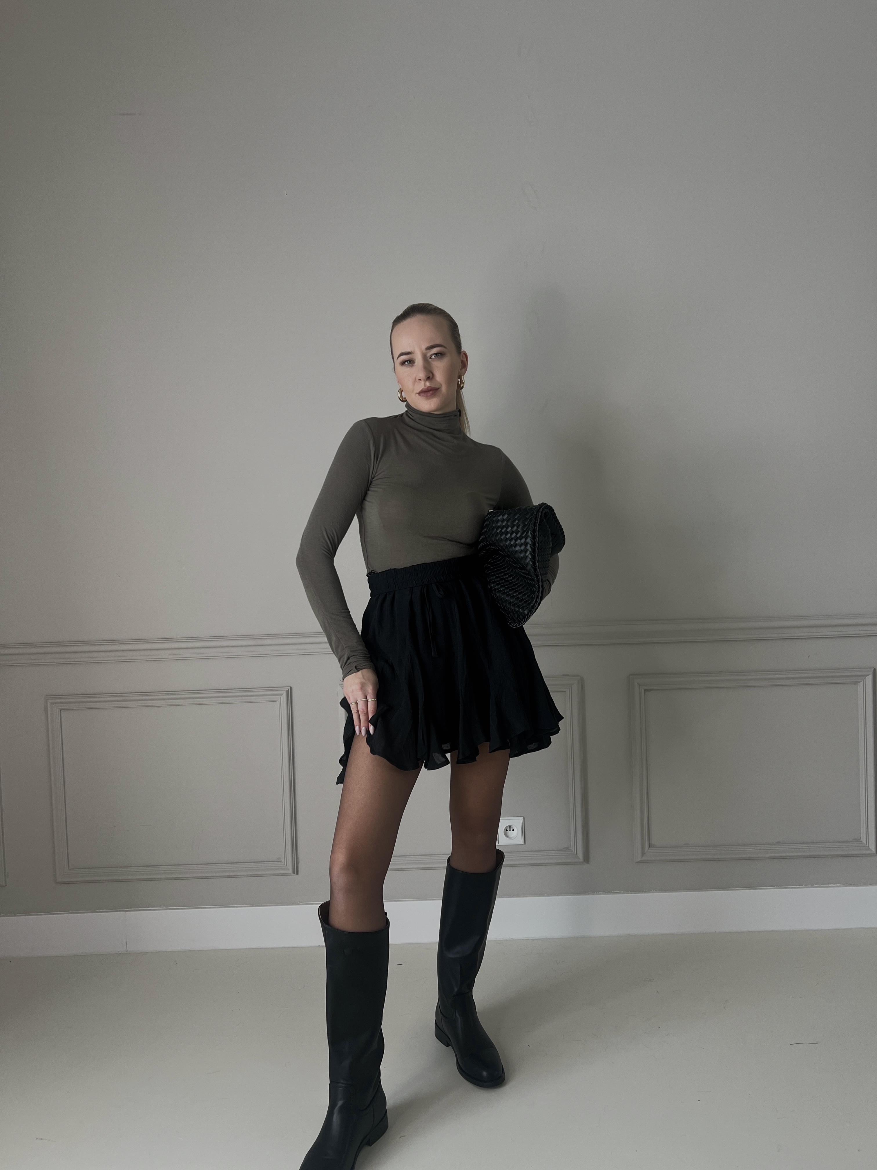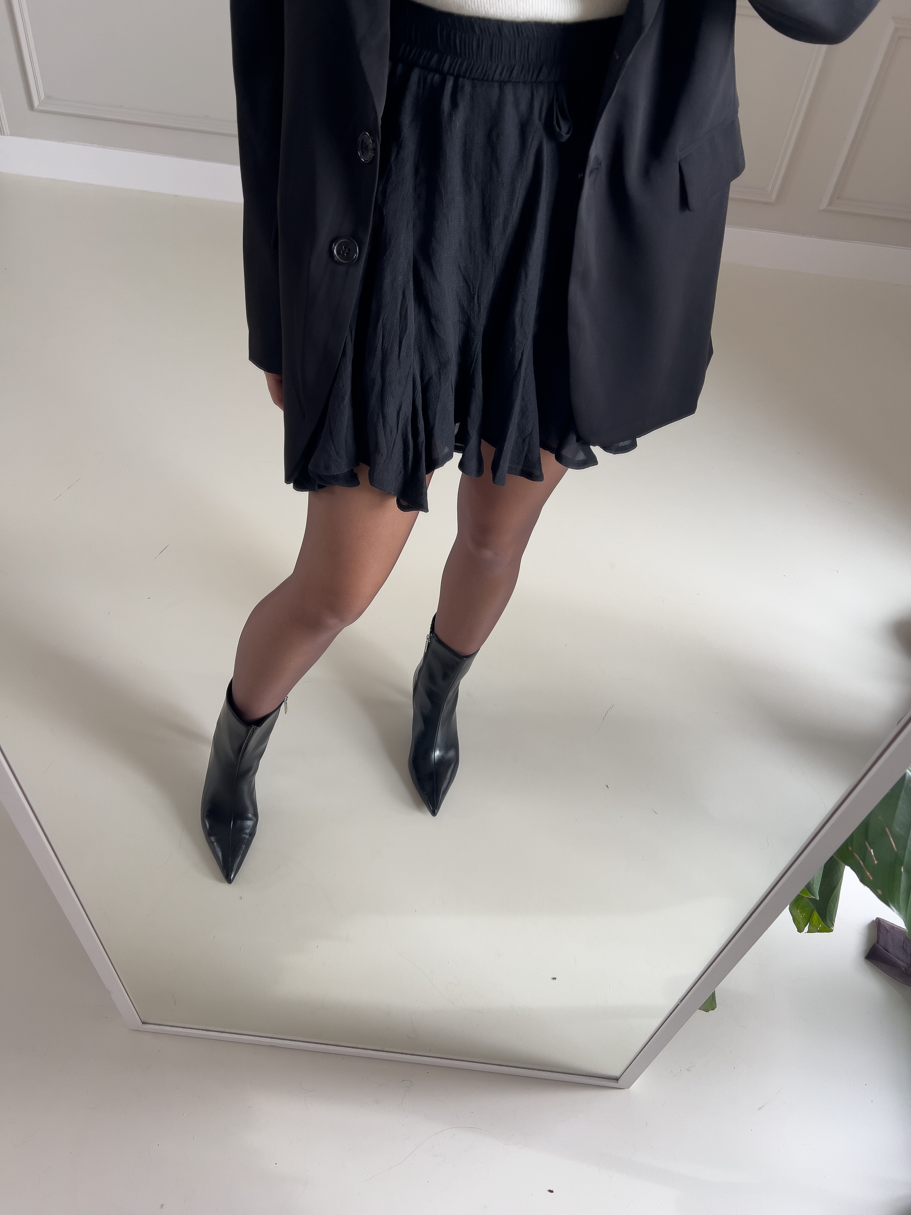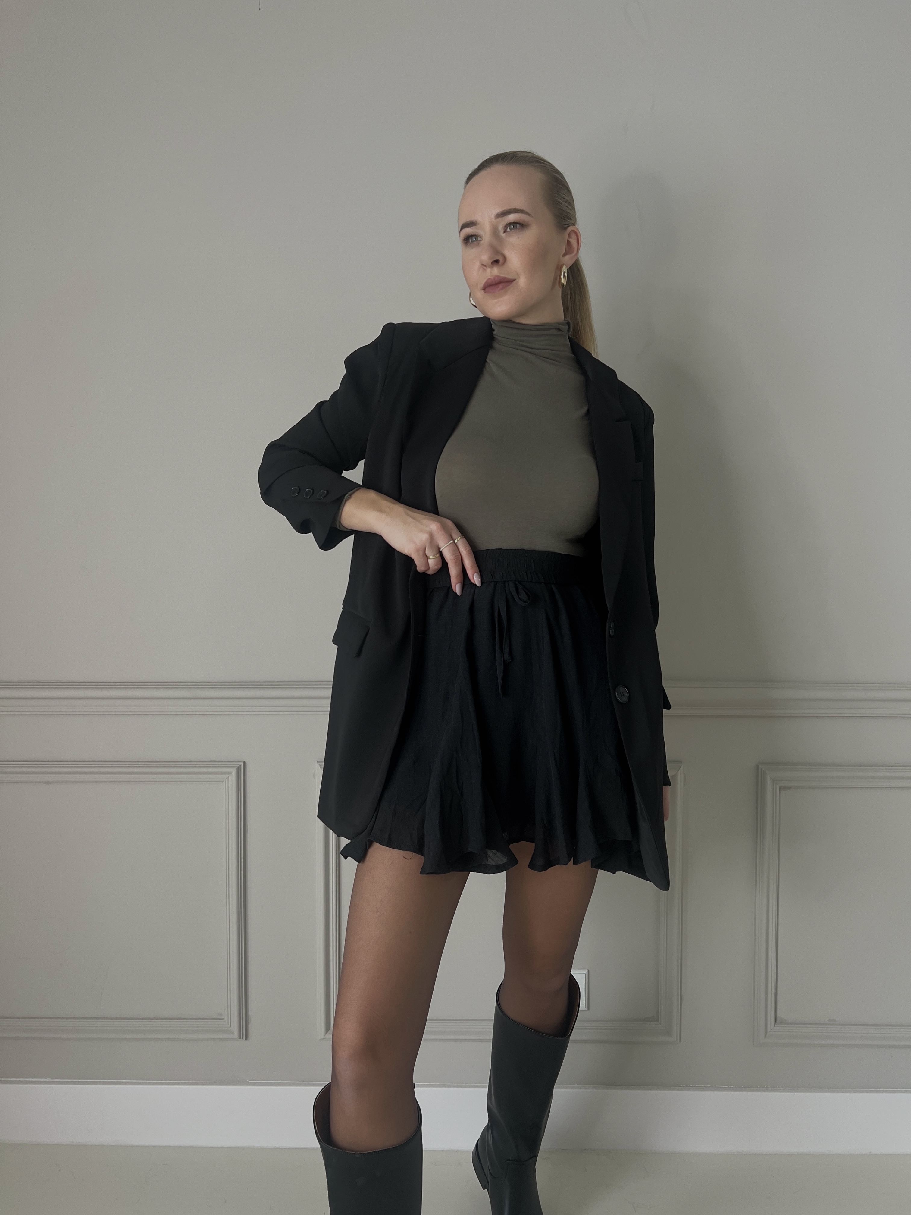 Ľahučká čierna sukňa s elastickým pásom a šnúrkou, ideálna na každodenné nosenie. Má voľný padavý strih, ktorý poskytuje maximálny komfort a pôsobí vzdušne a žensky.