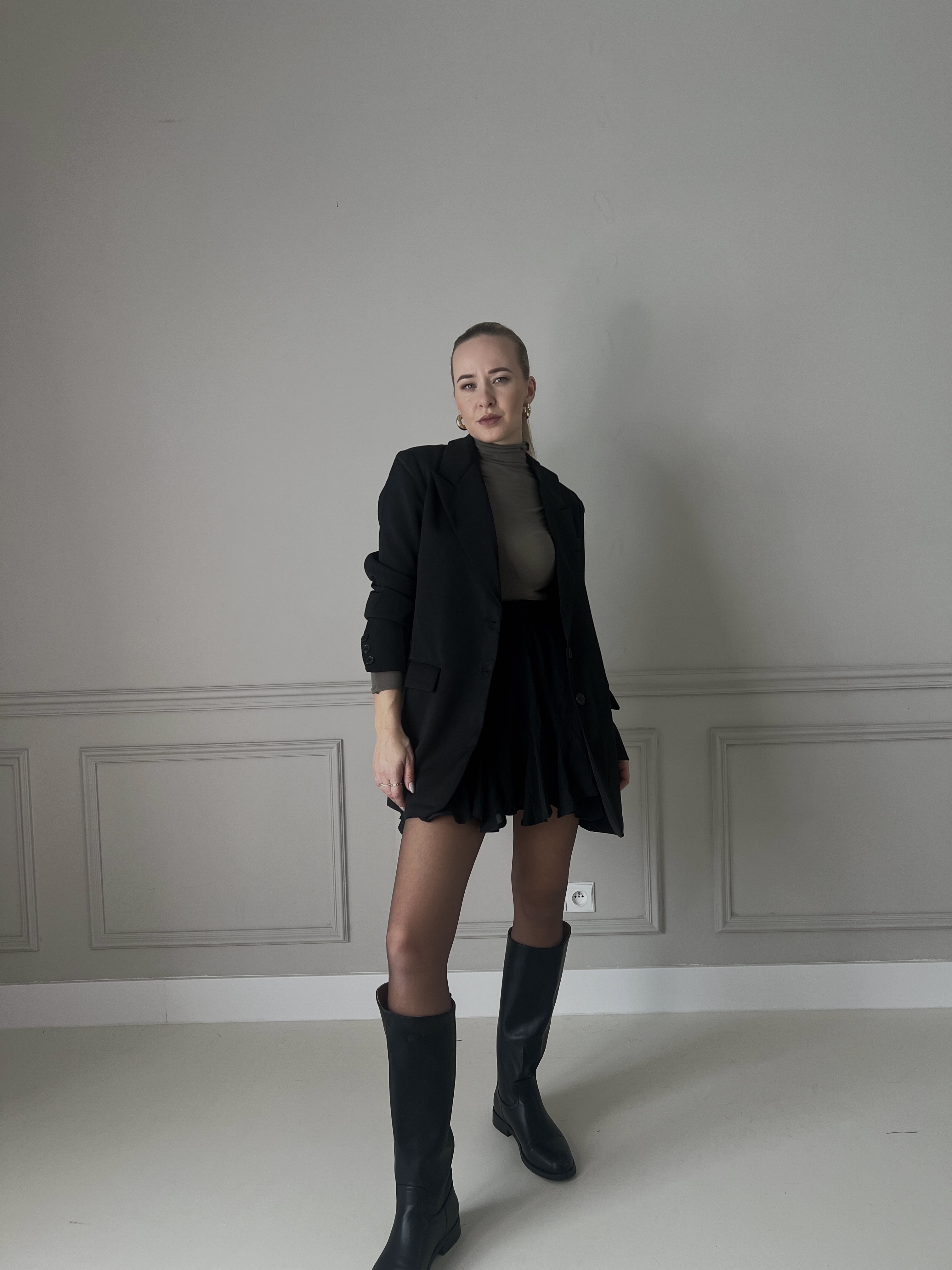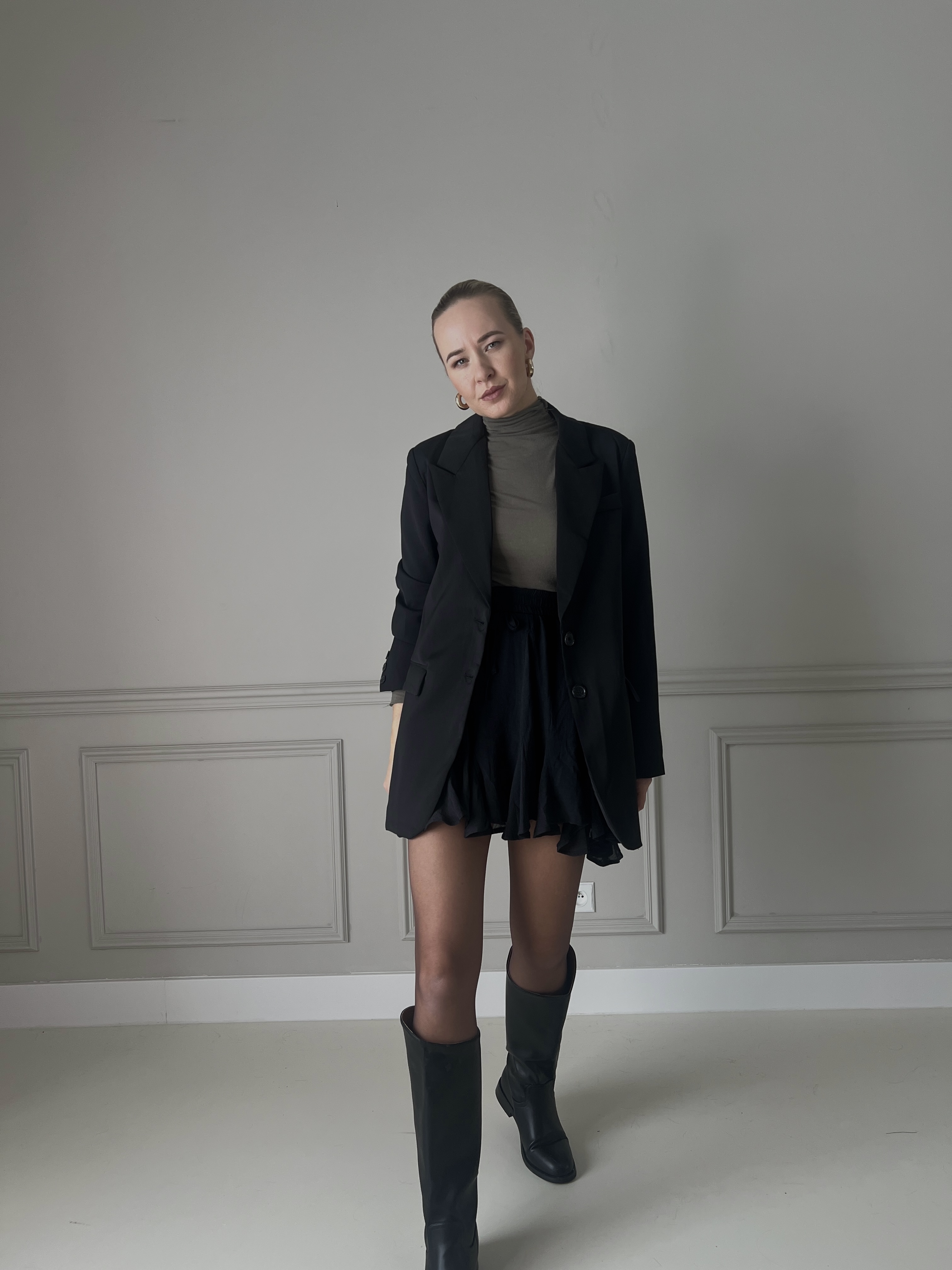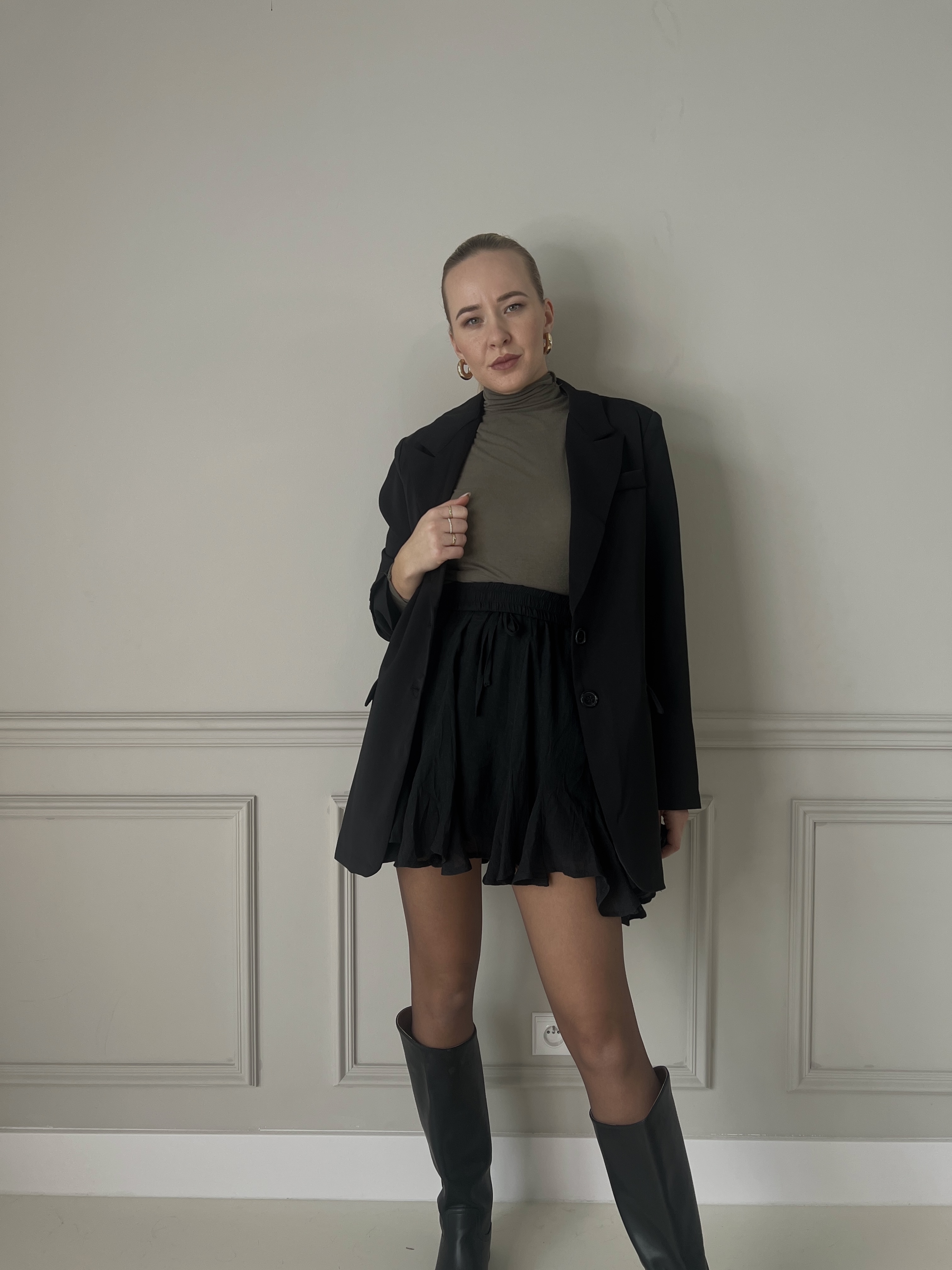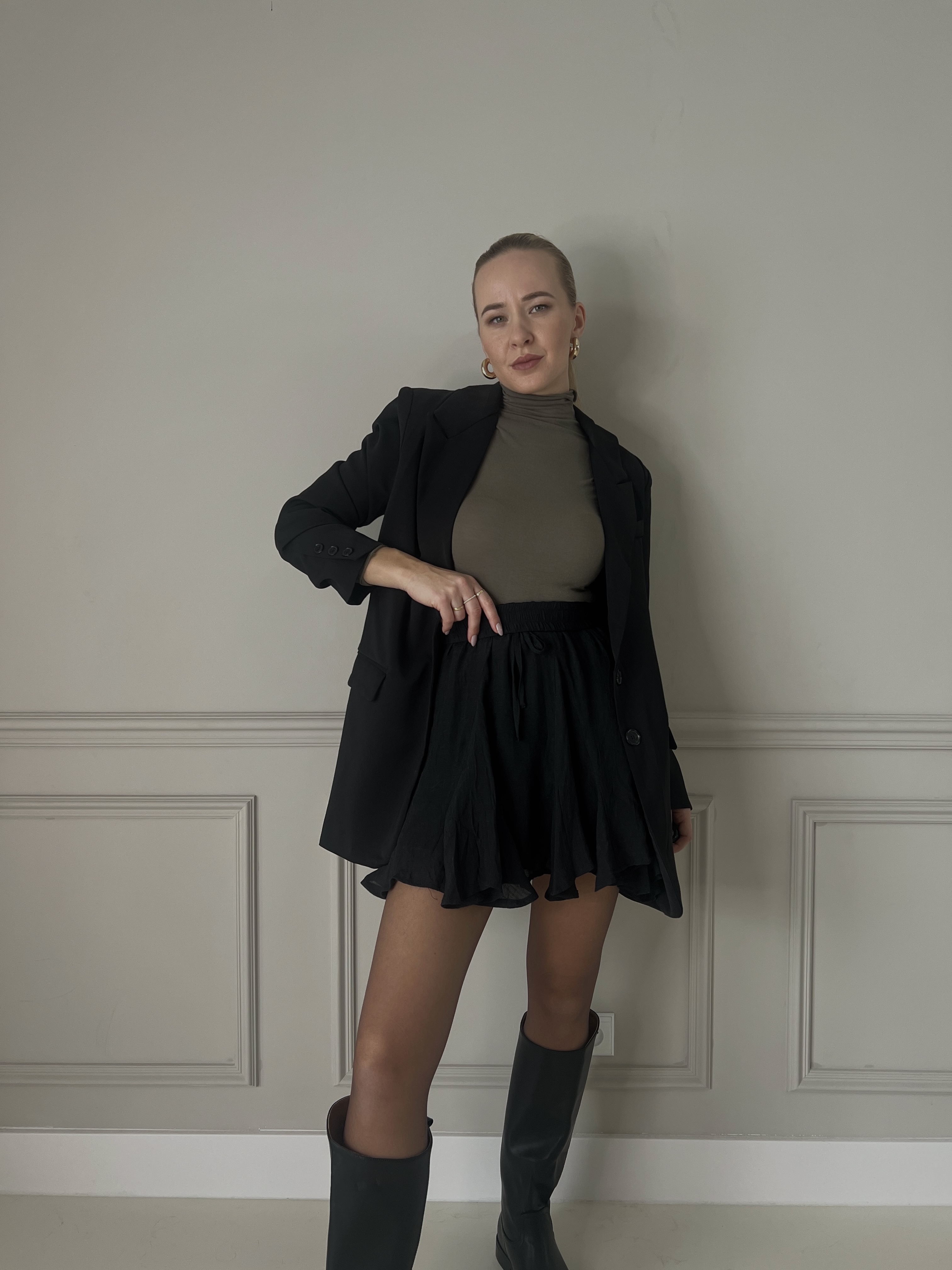 Ľahučká čierna sukňa s elastickým pásom a šnúrkou, ideálna na každodenné nosenie. Má voľný padavý strih, ktorý poskytuje maximálny komfort a pôsobí vzdušne a žensky.