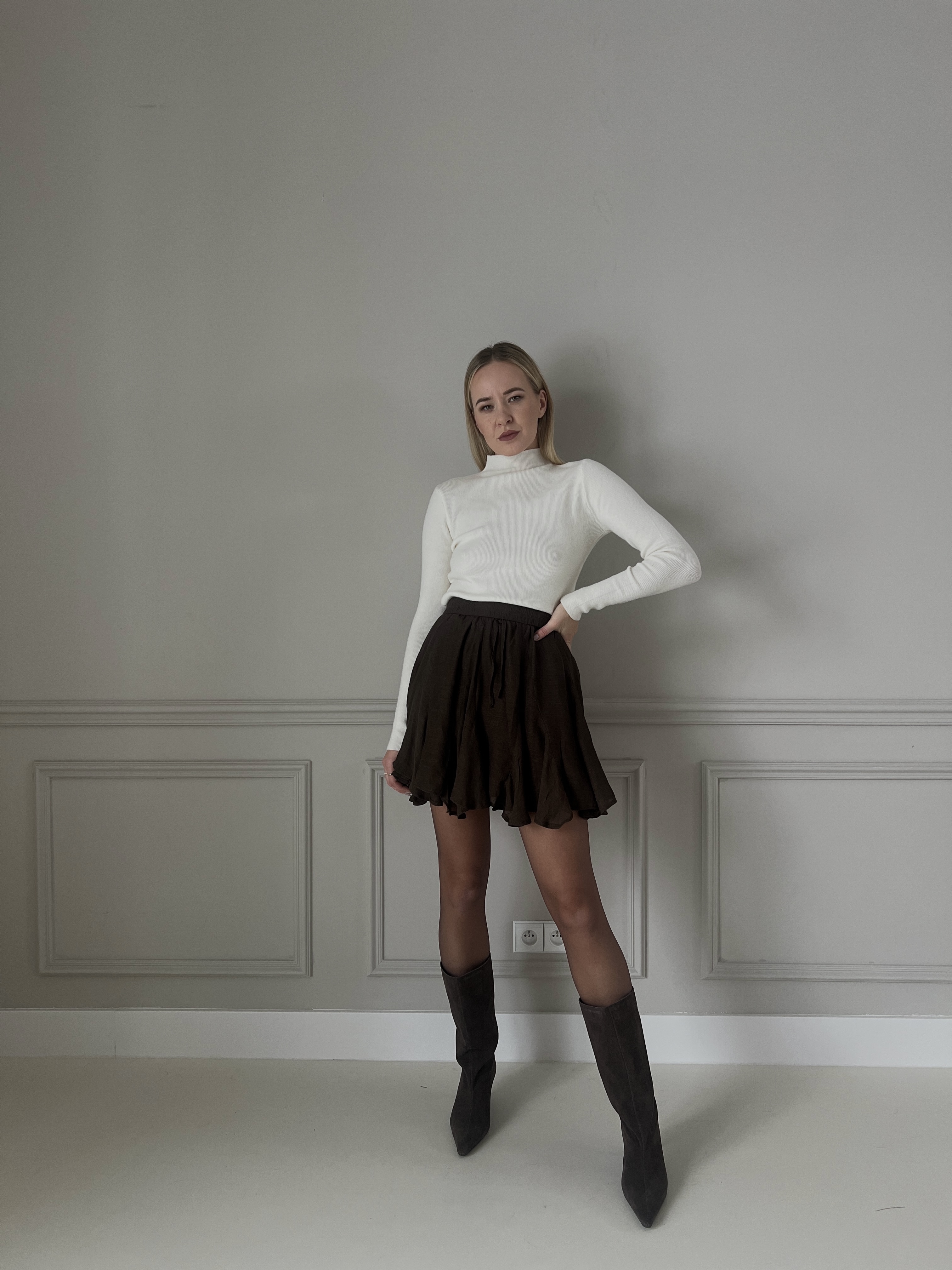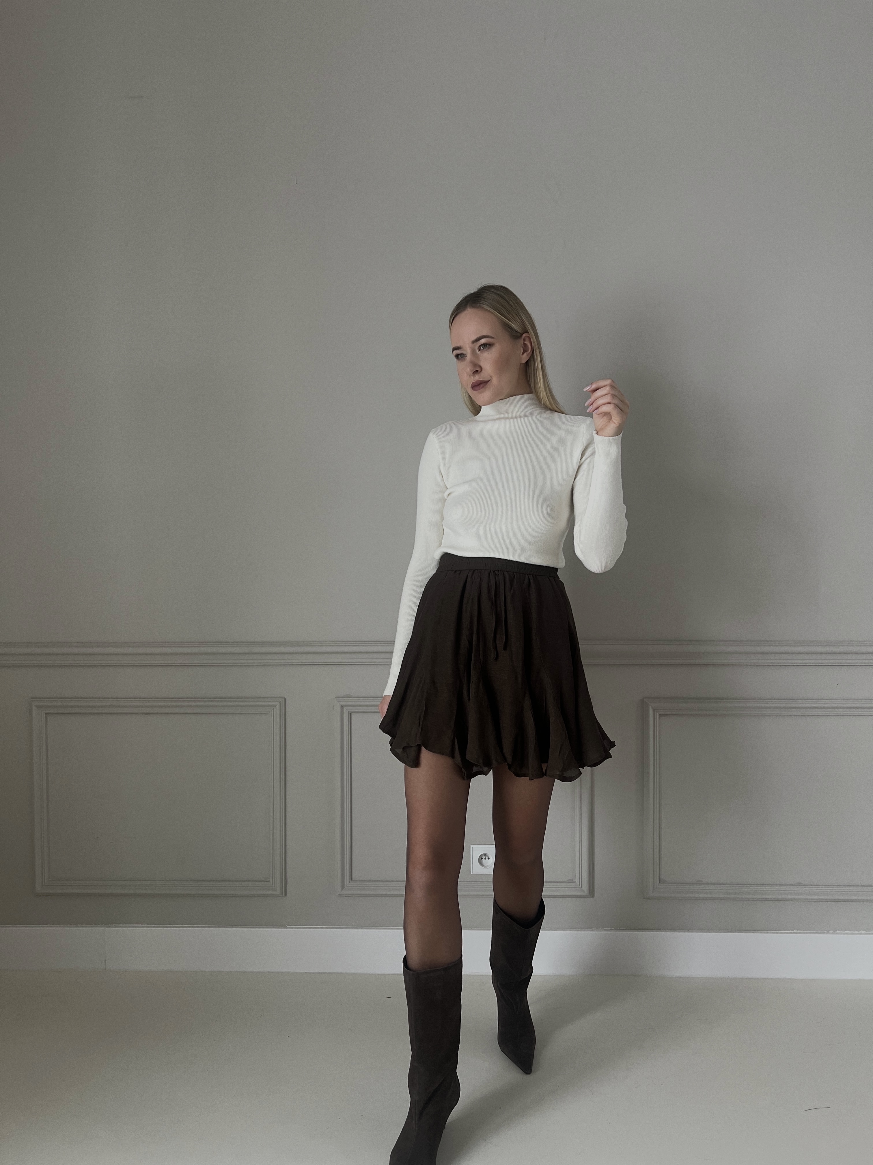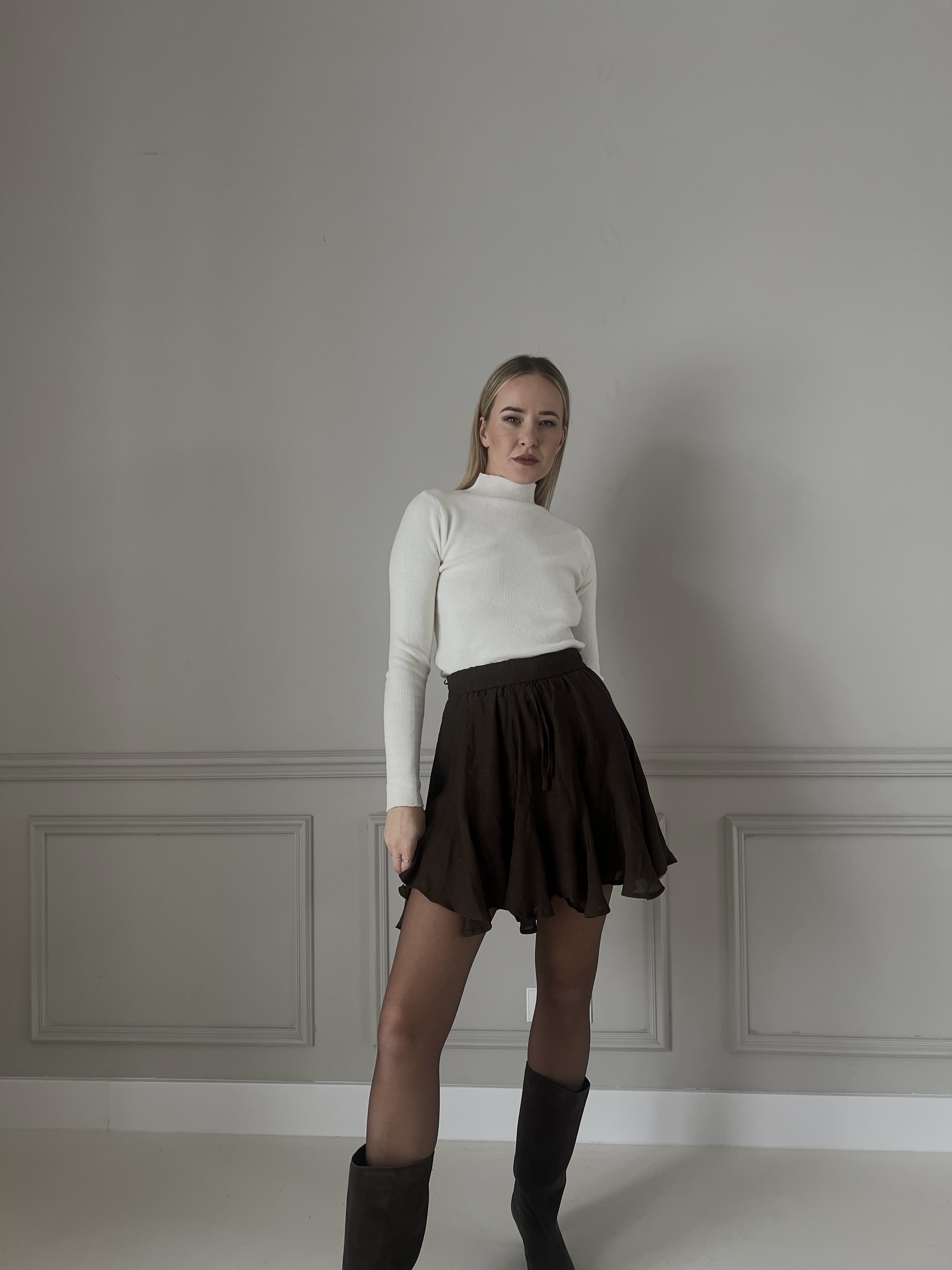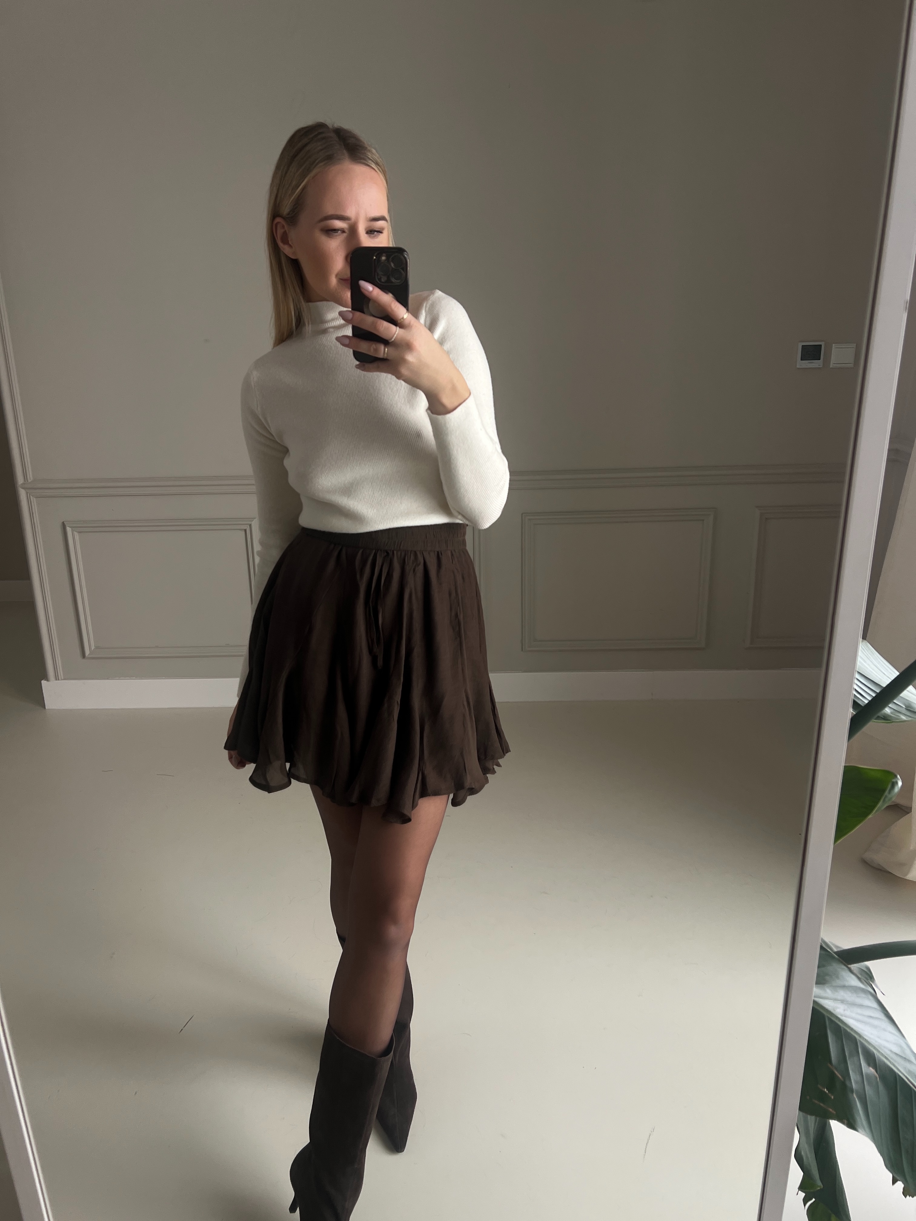 Ľahučká hnedá sukňa s elastickým pásom a šnúrkou, ideálna na každodenné nosenie. Má voľný padavý strih, ktorý poskytuje maximálny komfort a pôsobí vzdušne a žensky.