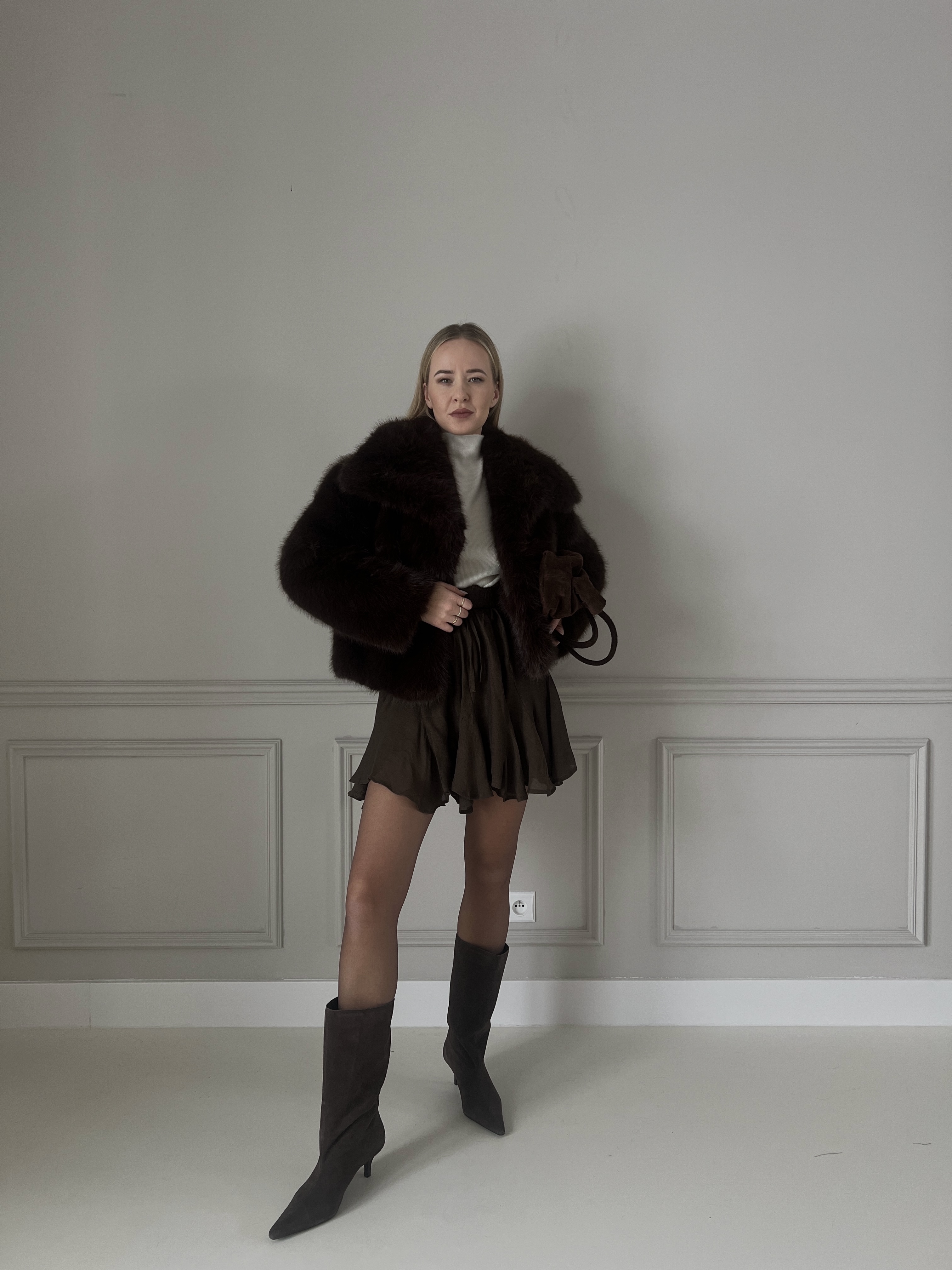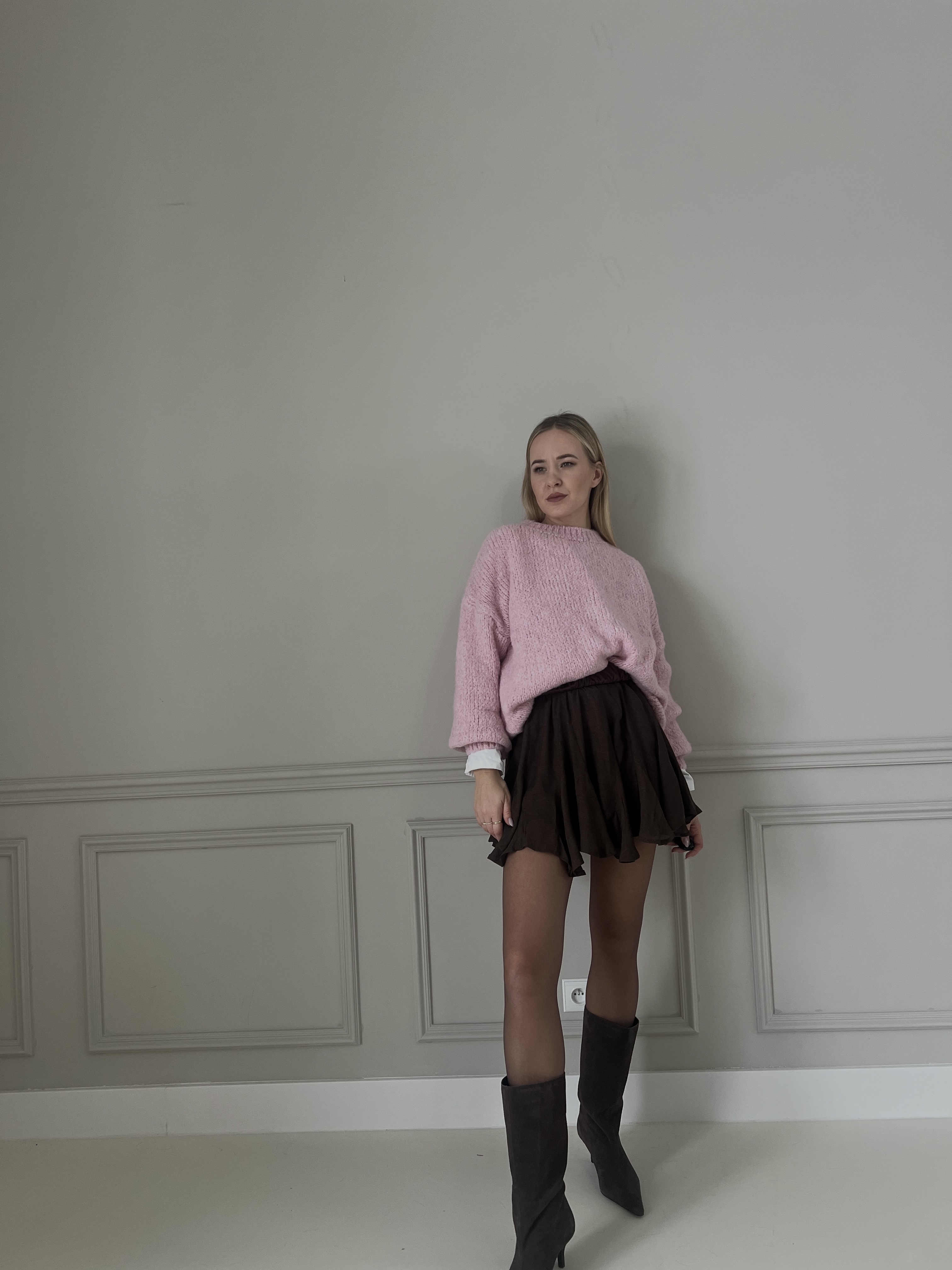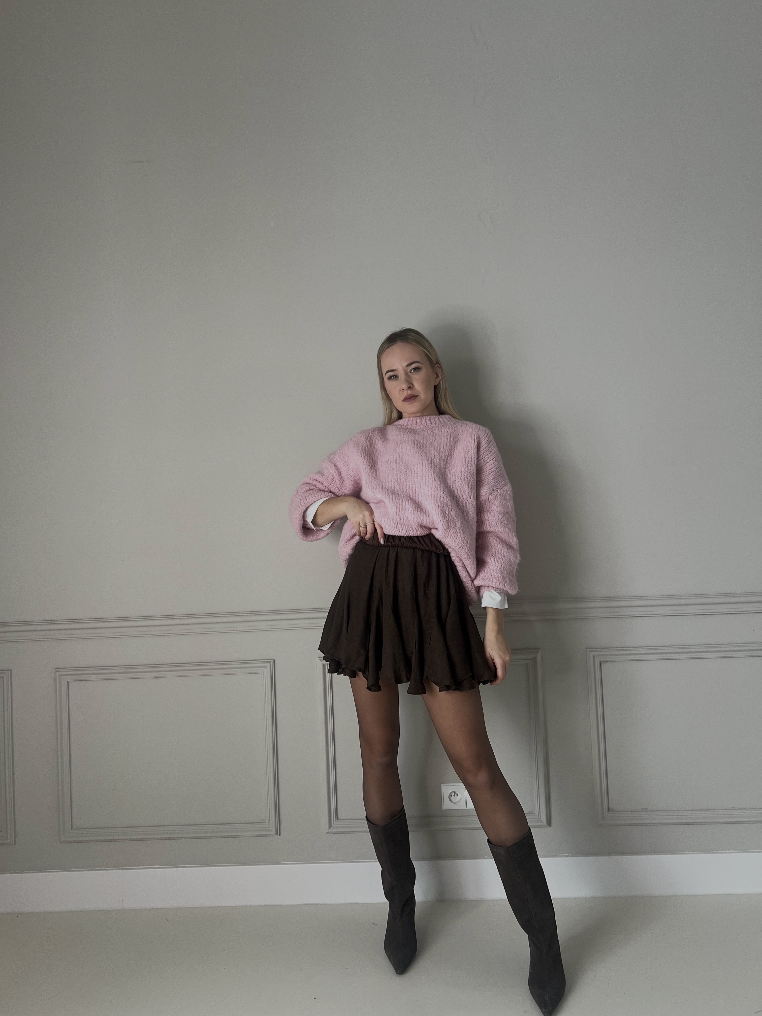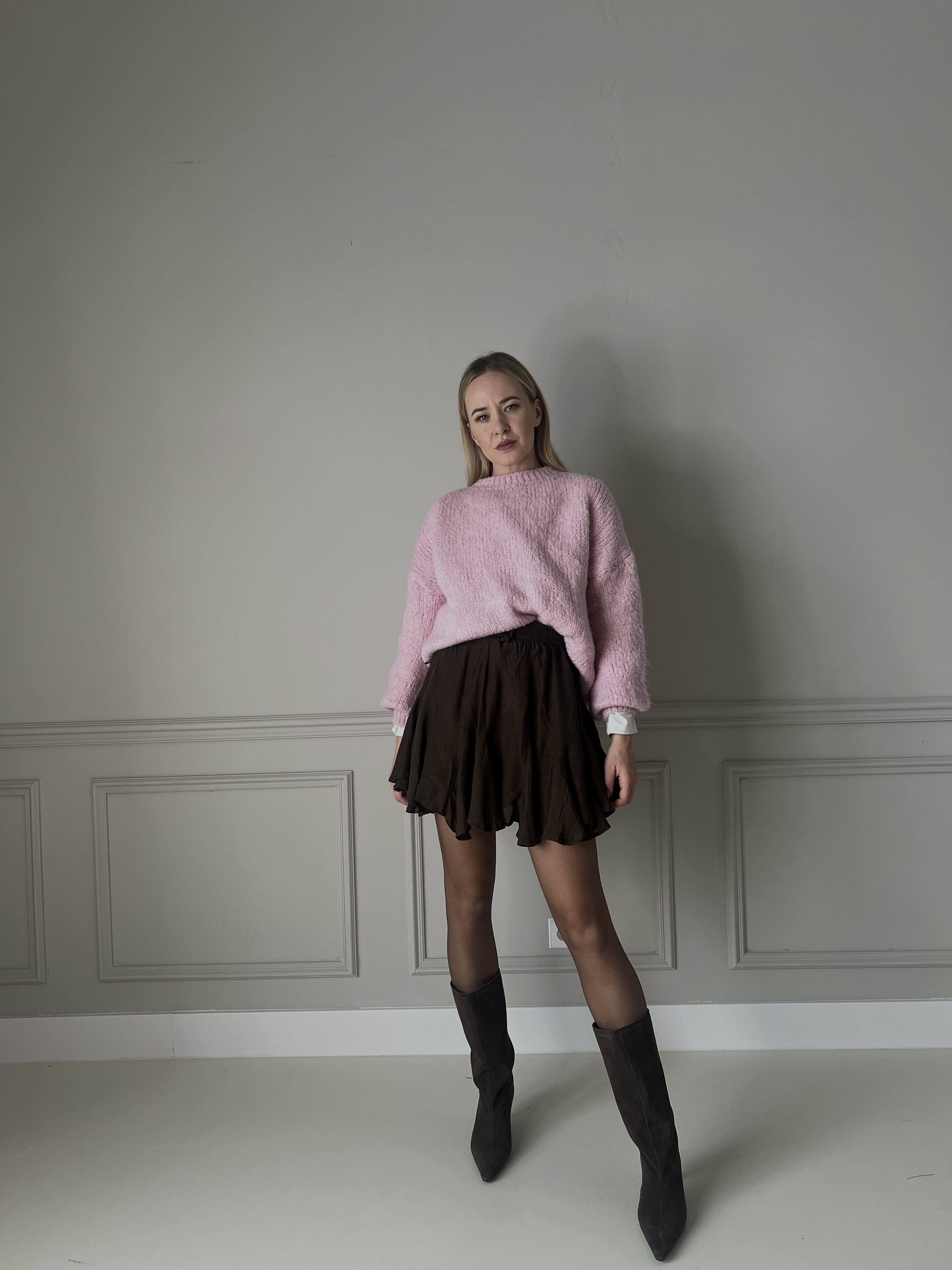Ľahučká hnedá sukňa s elastickým pásom a šnúrkou, ideálna na každodenné nosenie. Má voľný padavý strih, ktorý poskytuje maximálny komfort a pôsobí vzdušne a žensky.