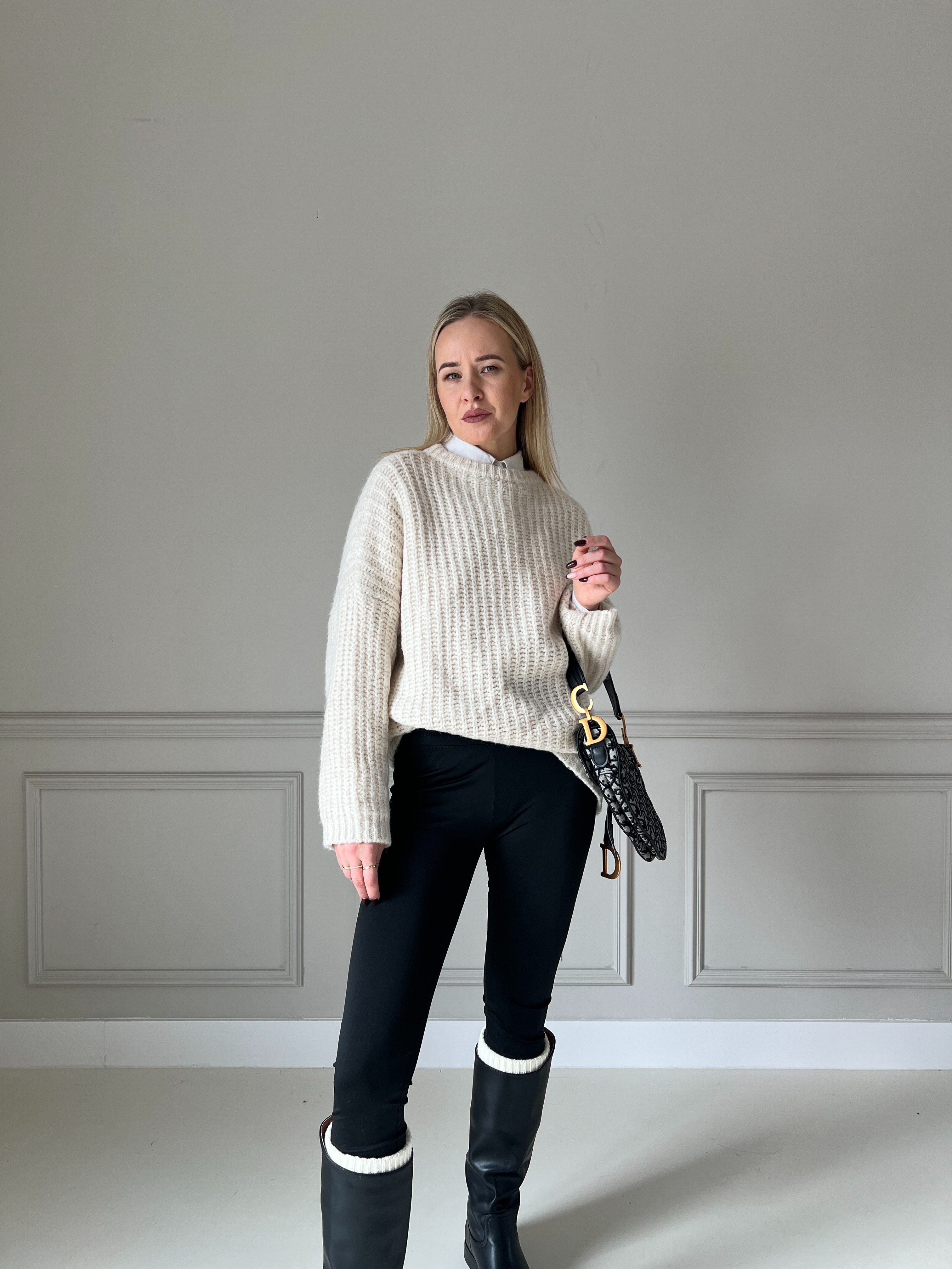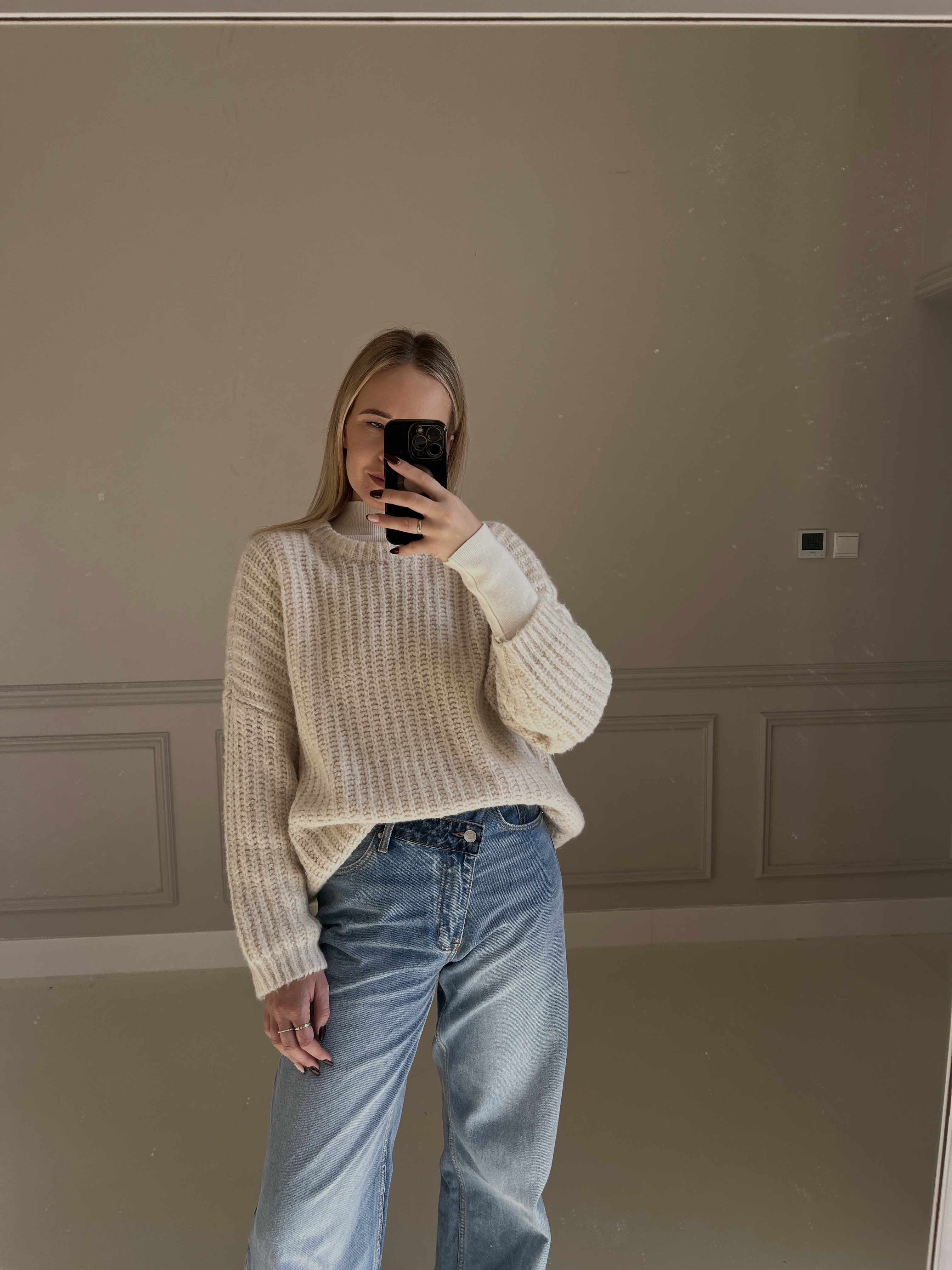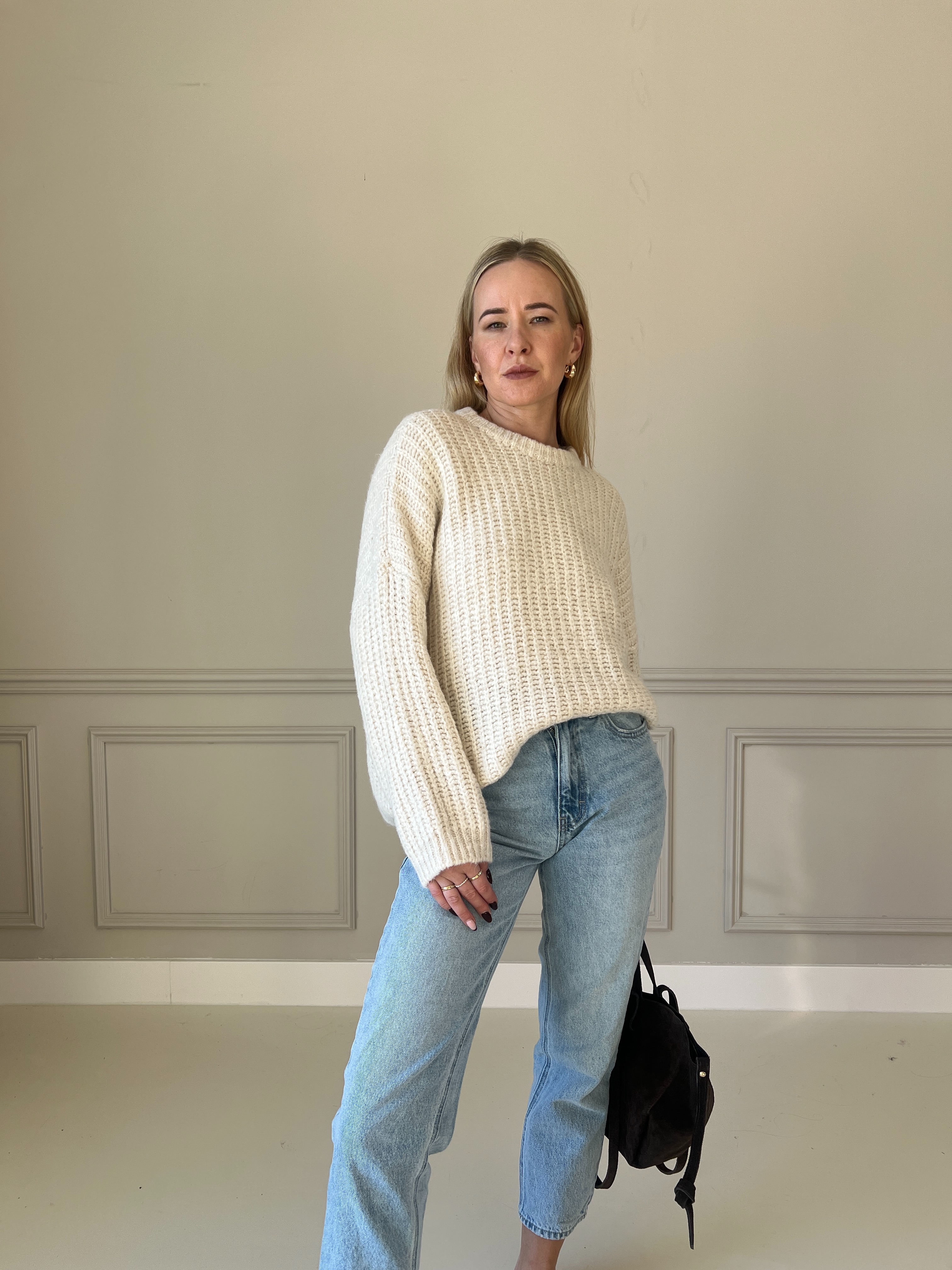 Mäkký, pohodlný pletený sveter v príjemnej béžovej farbe. Má padnutý strih s voľnými rukávmi, čo mu dodáva ležérny, ale stále upravený vzhľad. Rebrovaná pletenina pôsobí moderne a zároveň poskytuje dokonalé teplo. Ideálny na každodenné nosenie počas chladnej sezóny.