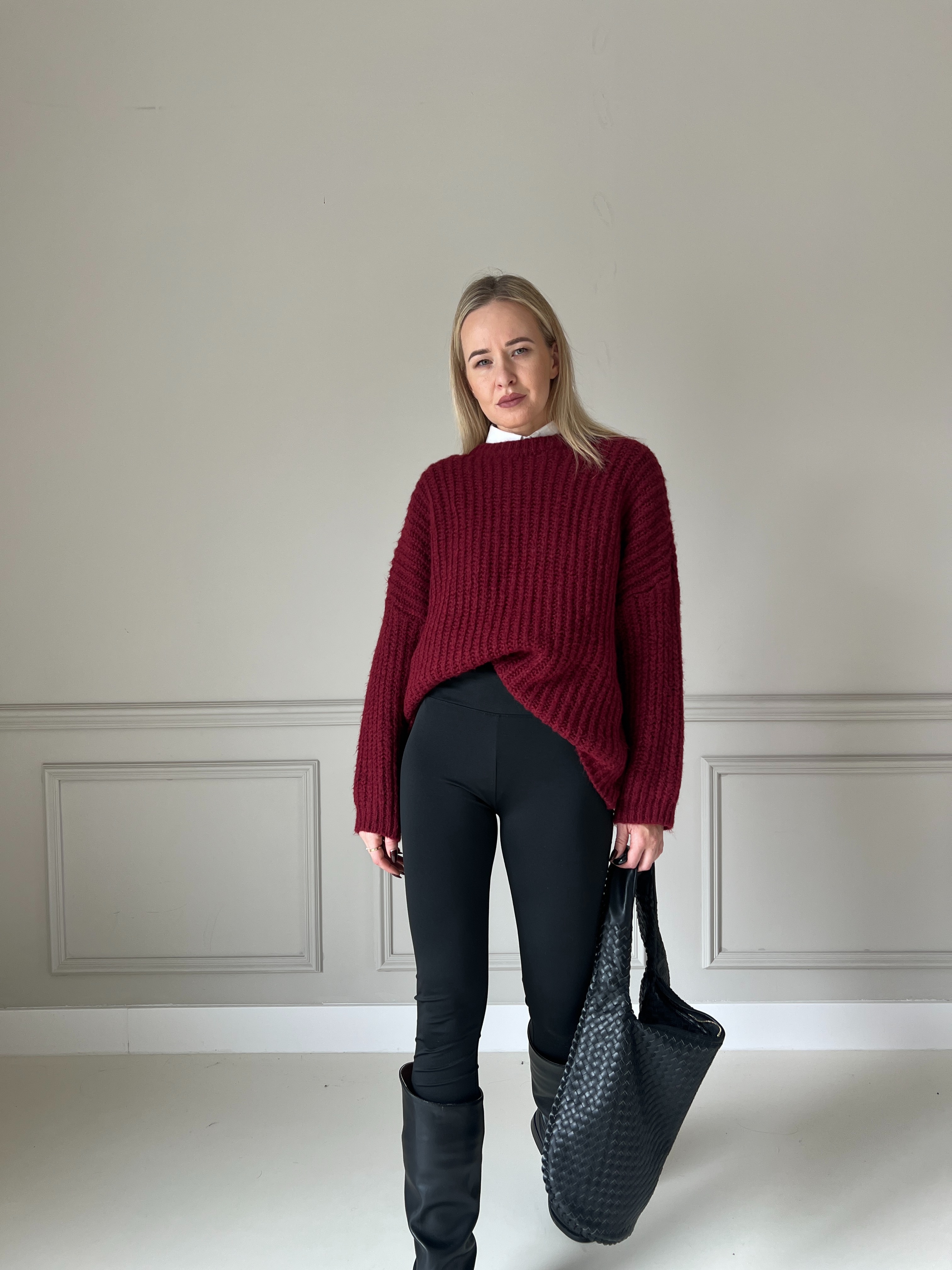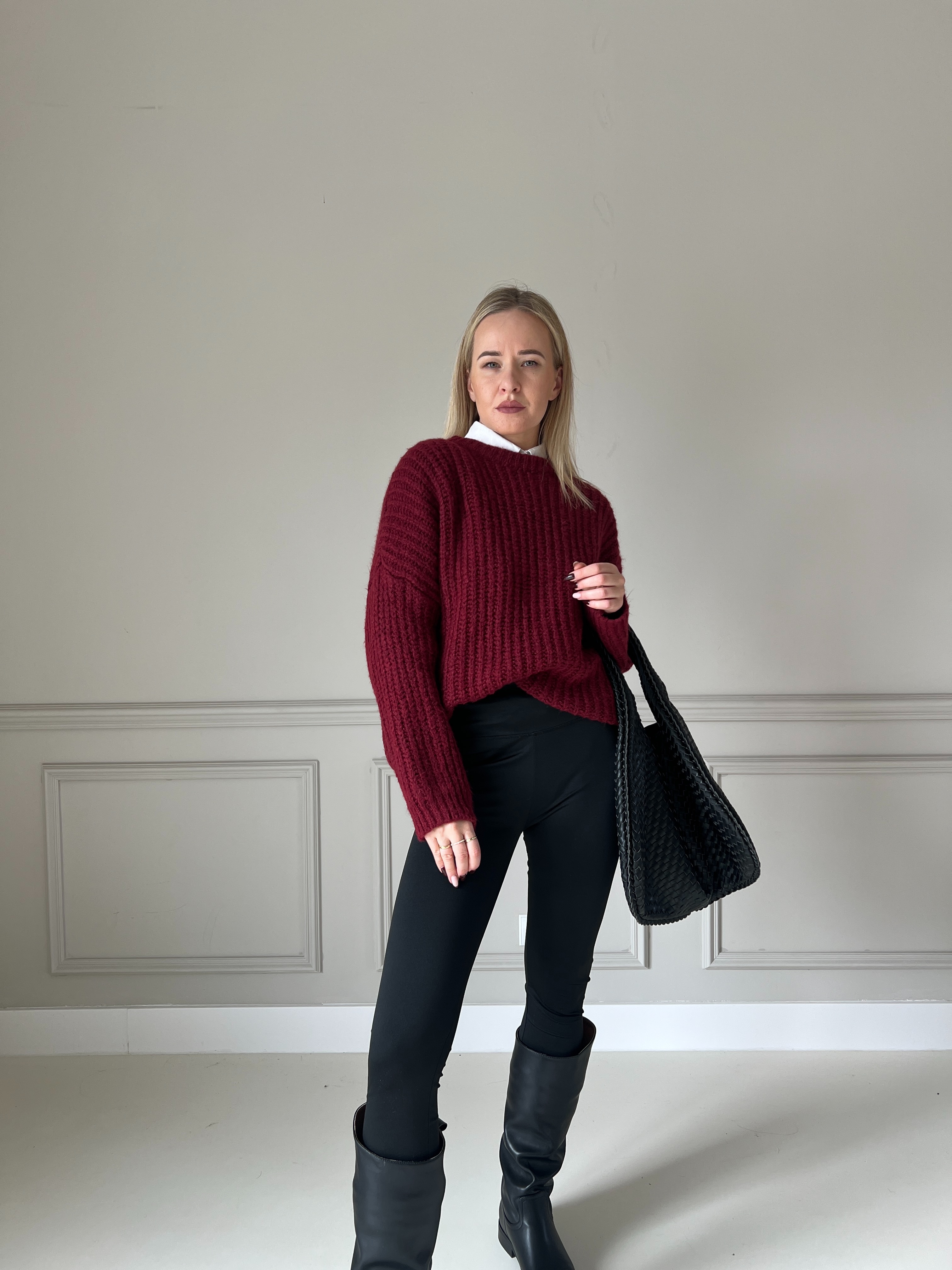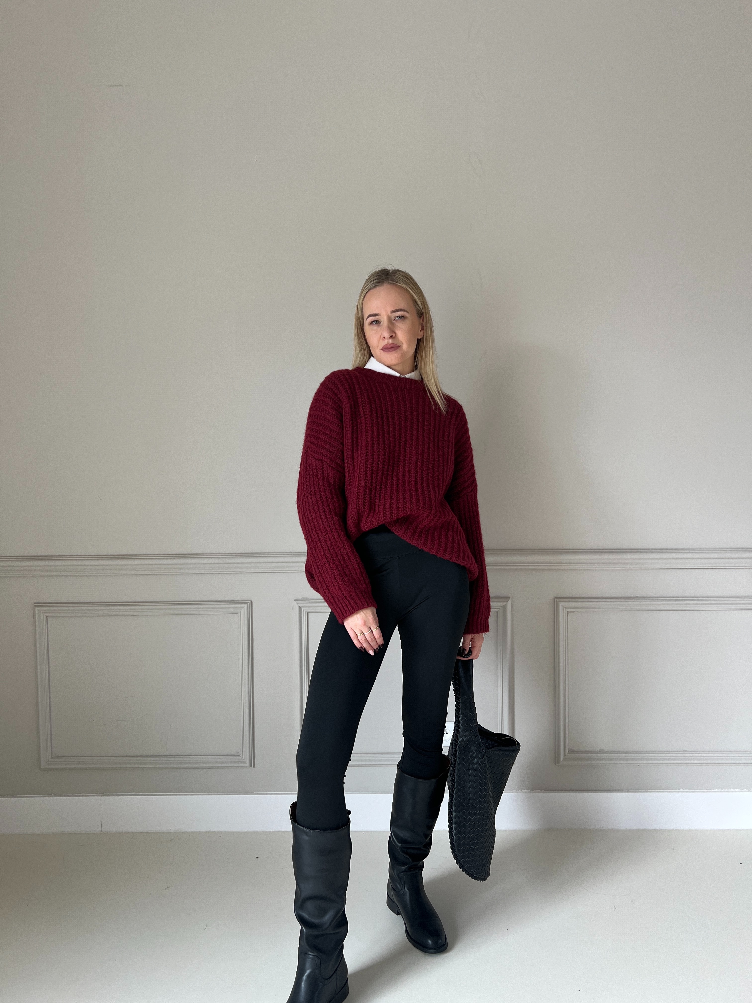 Mäkký, pohodlný pletený sveter v príjemnej vínovej farbe. Má padnutý strih s voľnými rukávmi, čo mu dodáva ležérny, ale stále upravený vzhľad. Rebrovaná pletenina pôsobí moderne a zároveň poskytuje dokonalé teplo. Ideálny na každodenné nosenie počas chladnej sezóny.