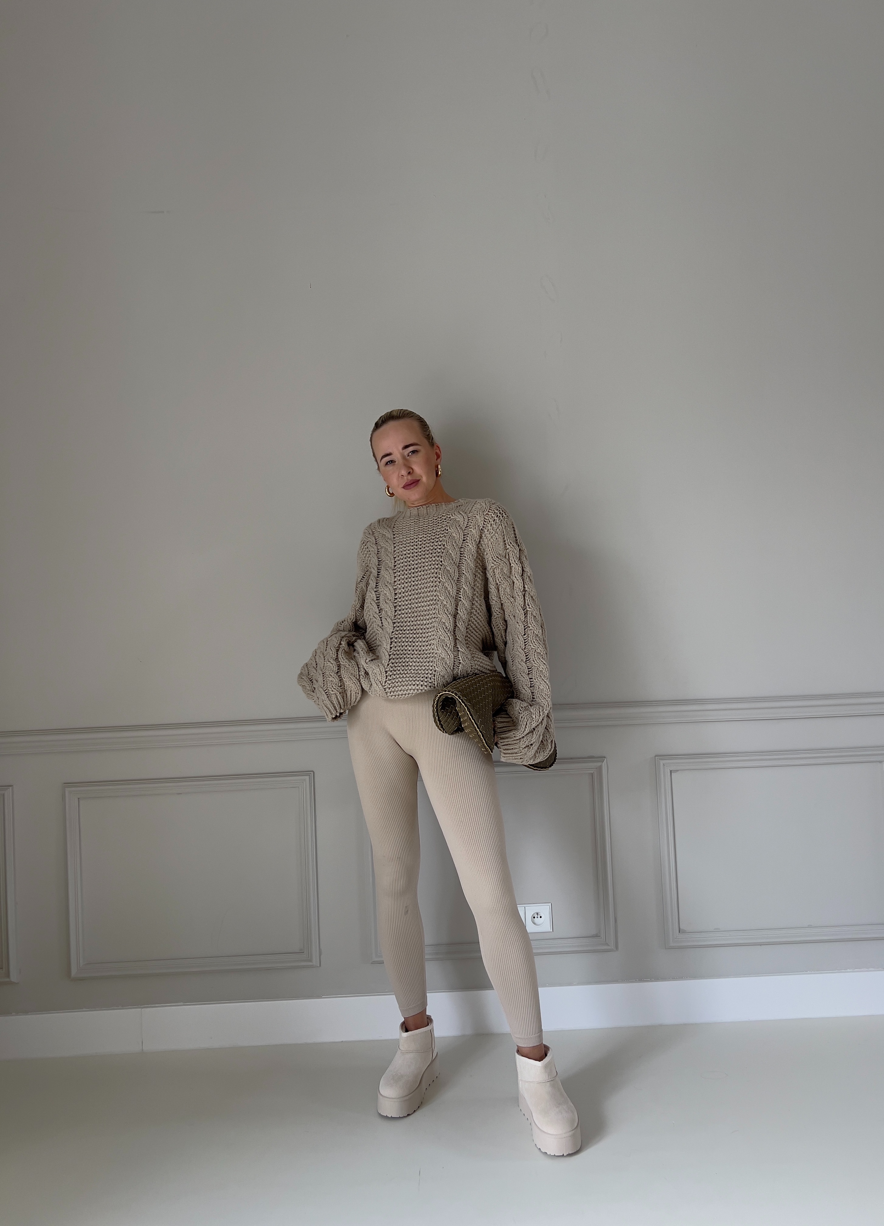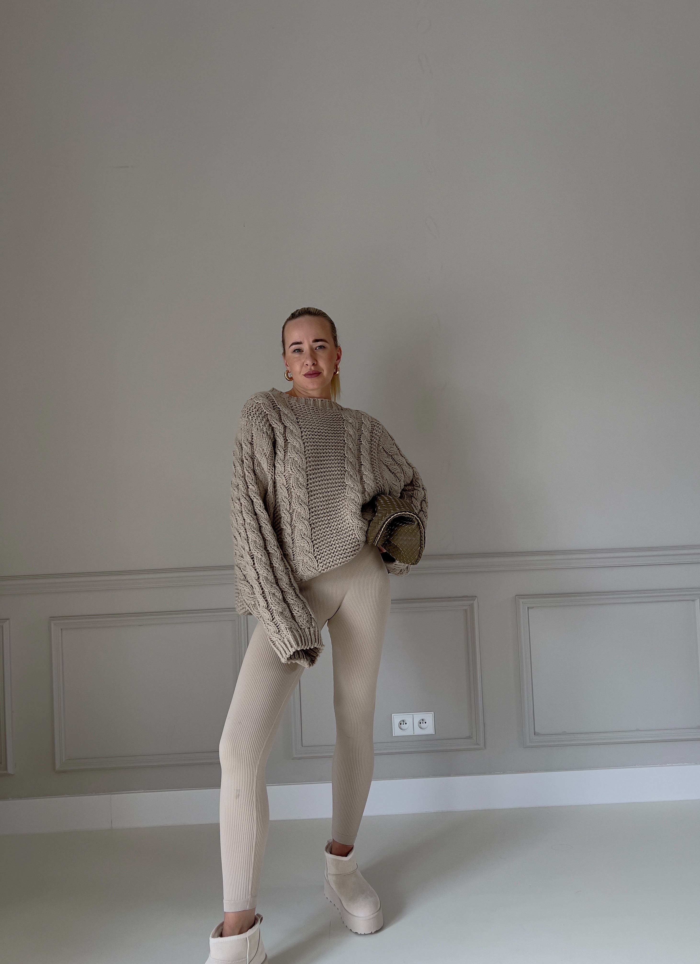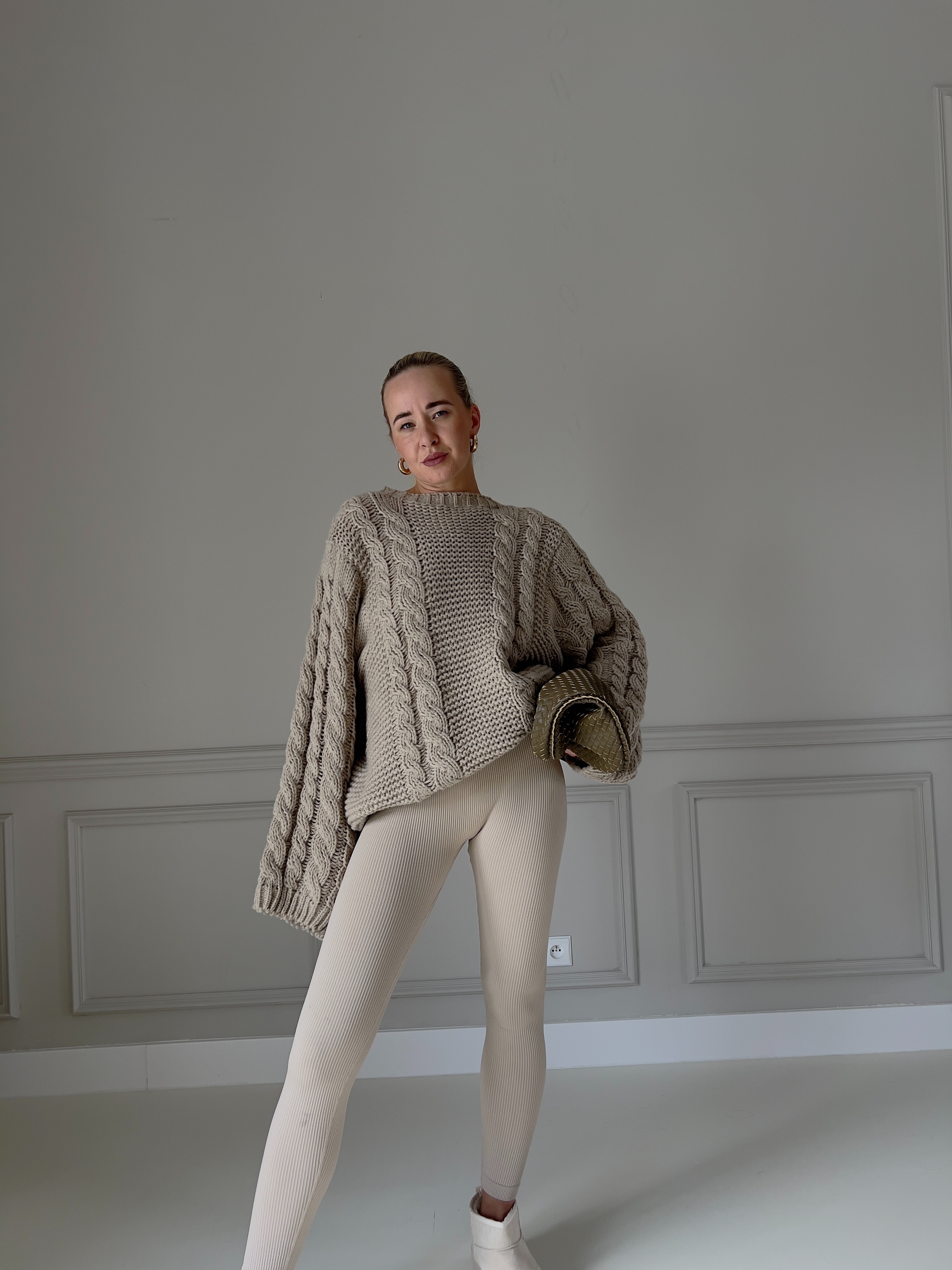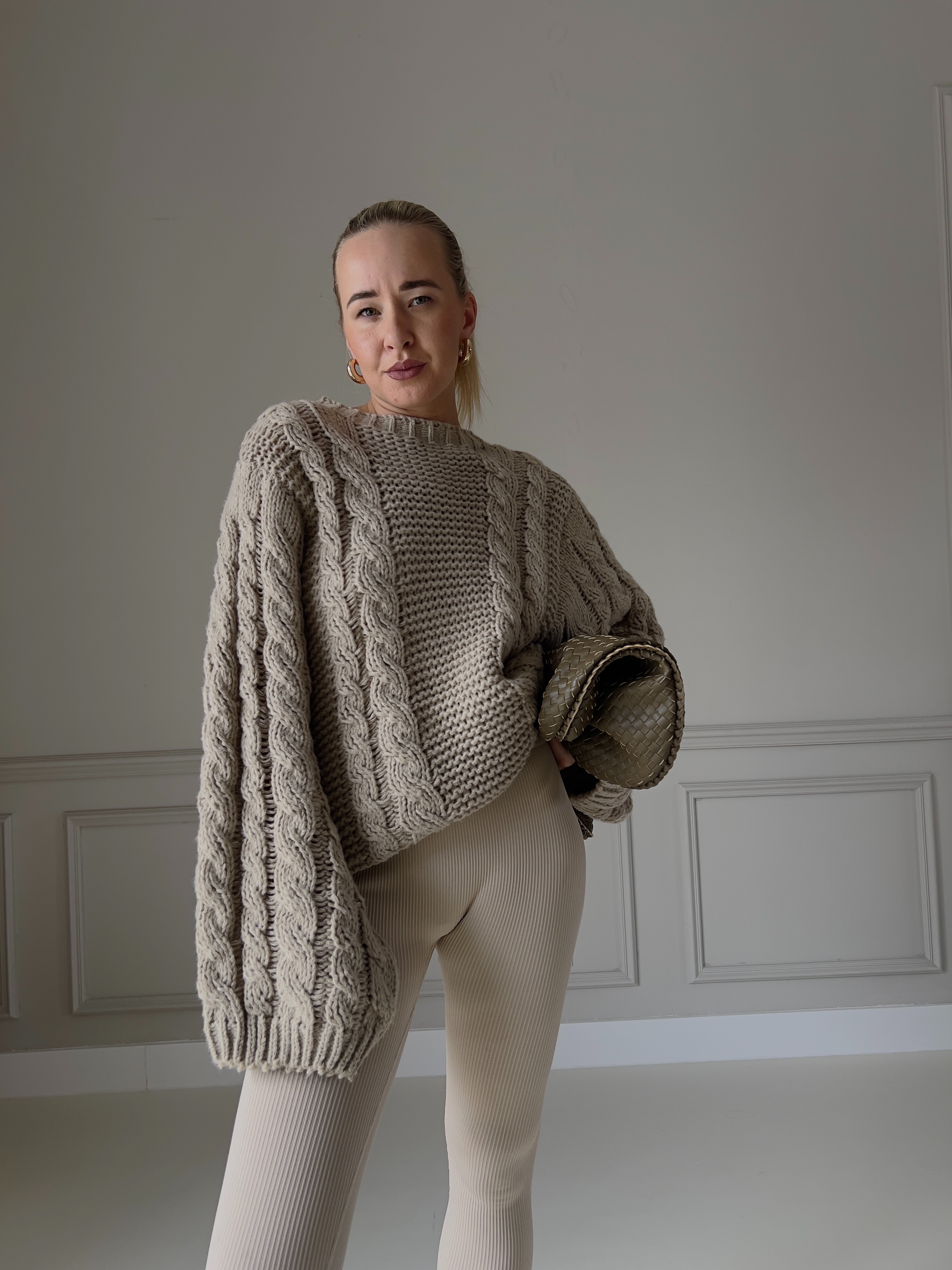 Oversize sveter z jemnej pletiny s vrkočovým vzorom. Modelka má výšku 170cm, nosí veľkosť S.