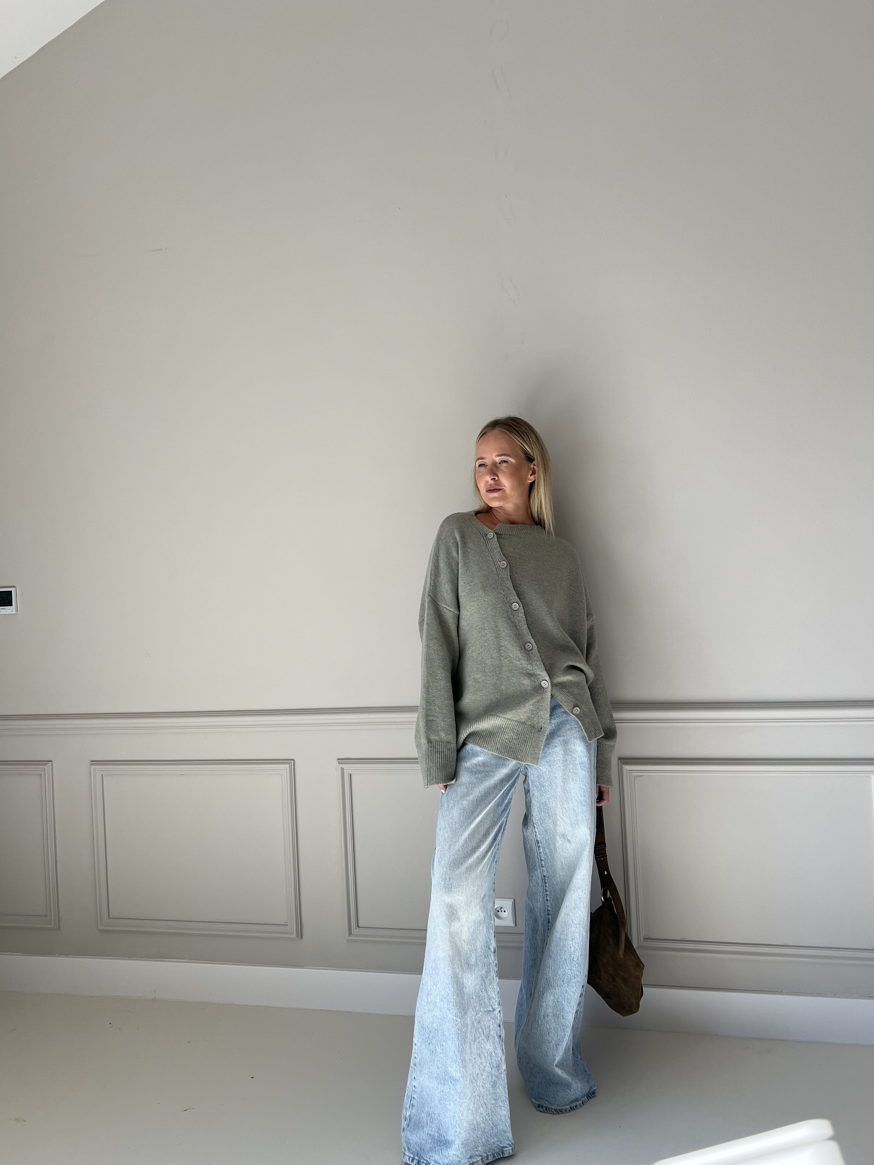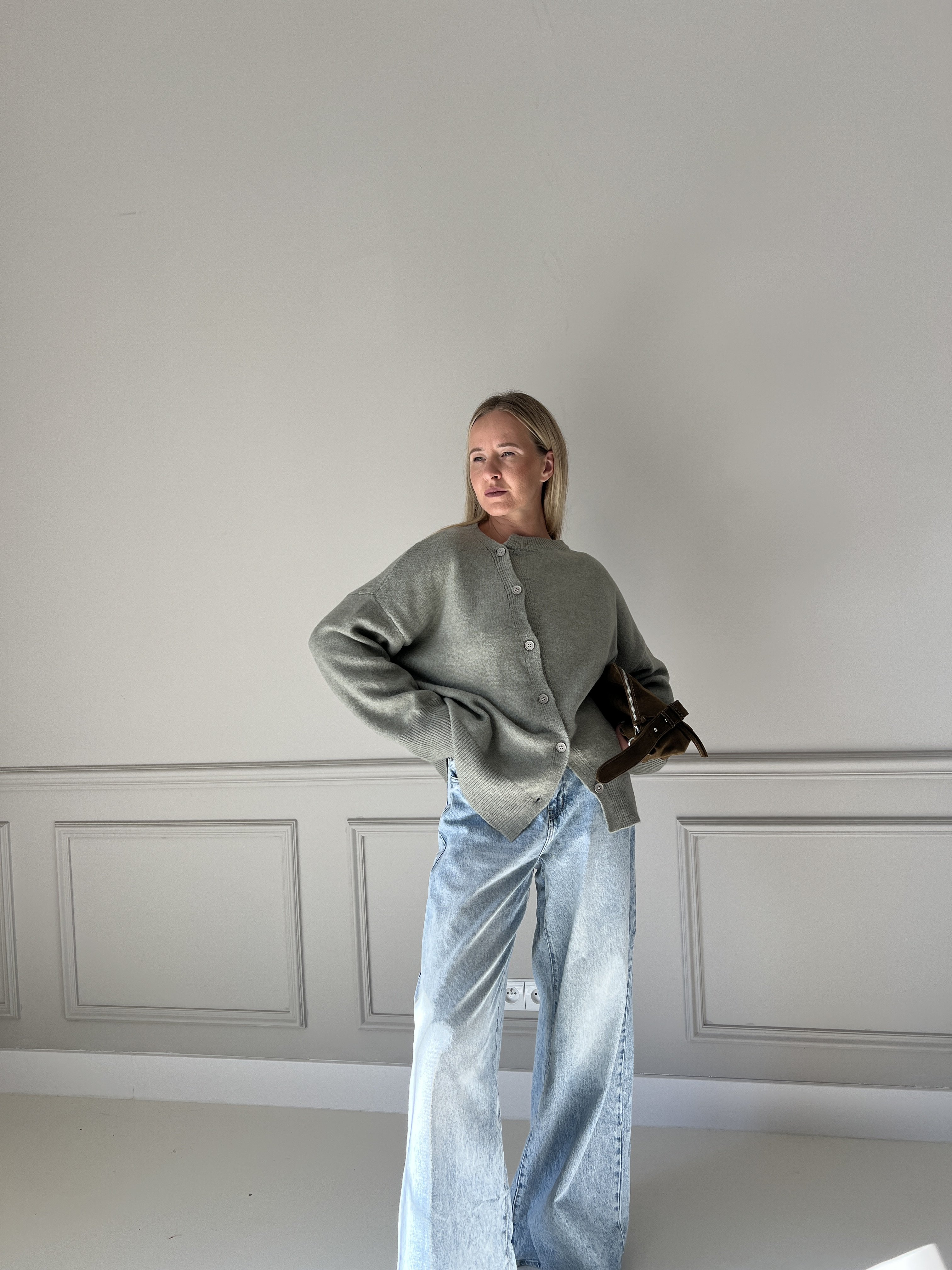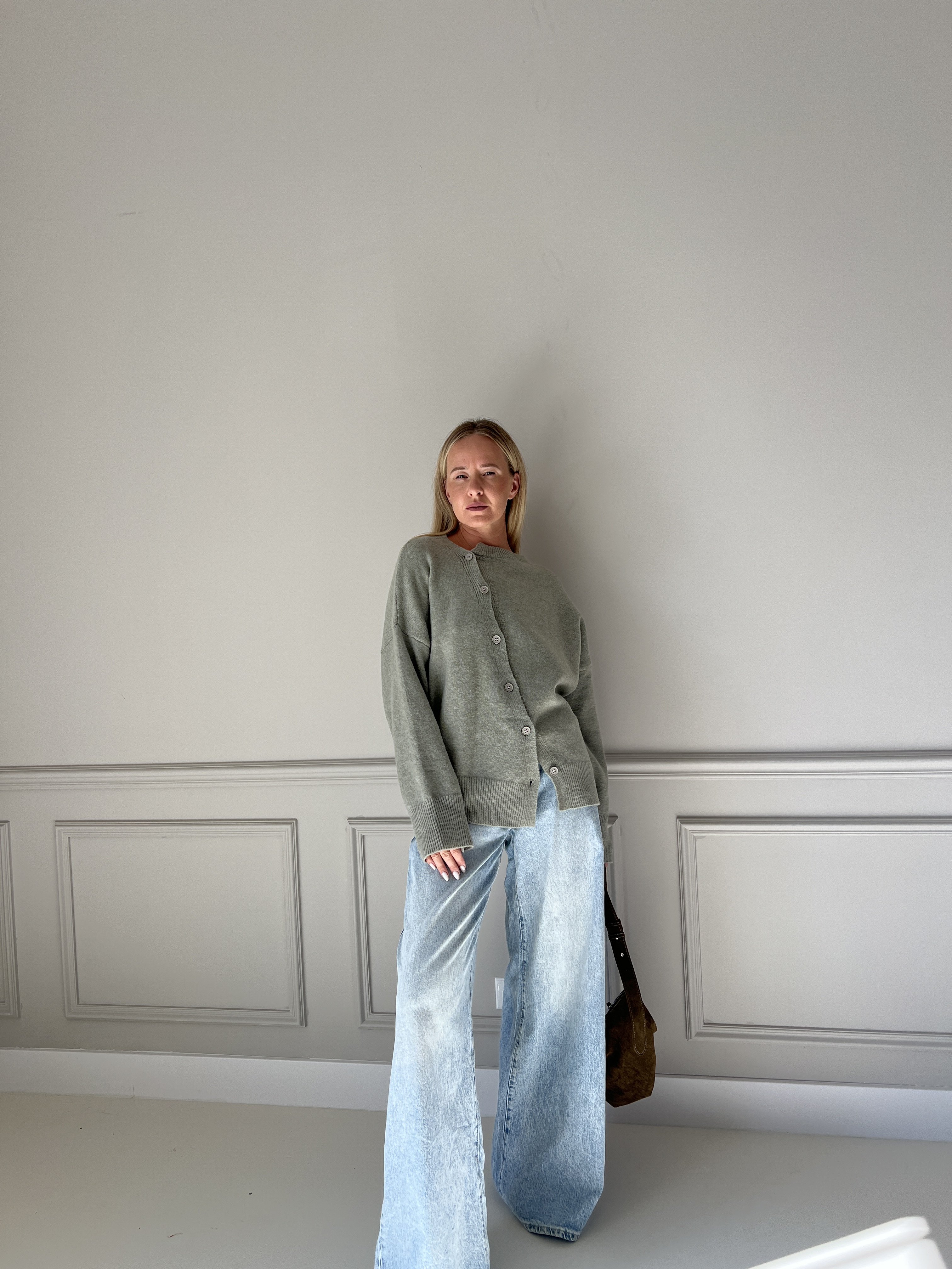 Pletený sveter v predĺženom strihu s asymetrickým zapínaním. Modelka má výšku 170cm, na sebe má veľkosť S/M