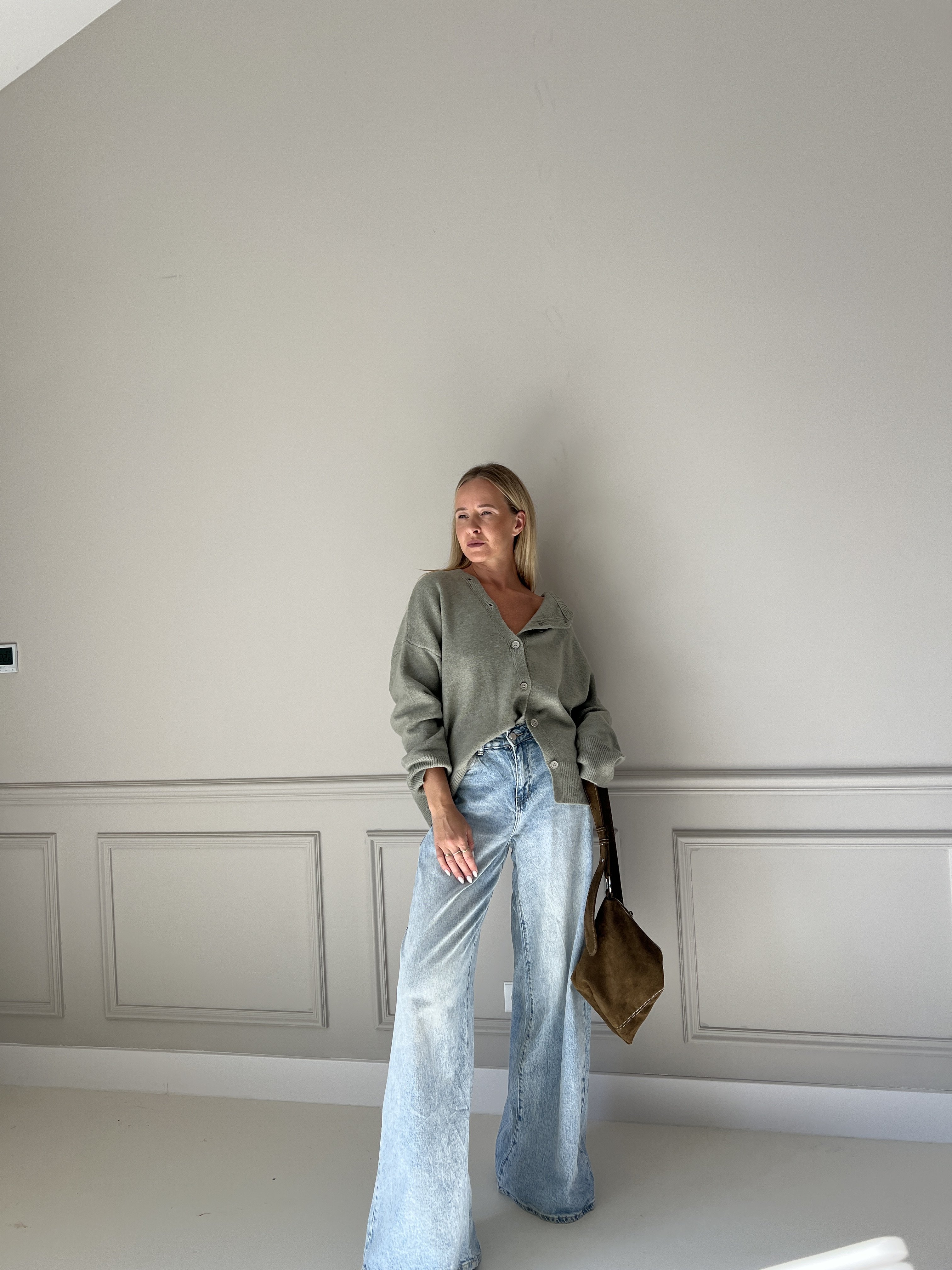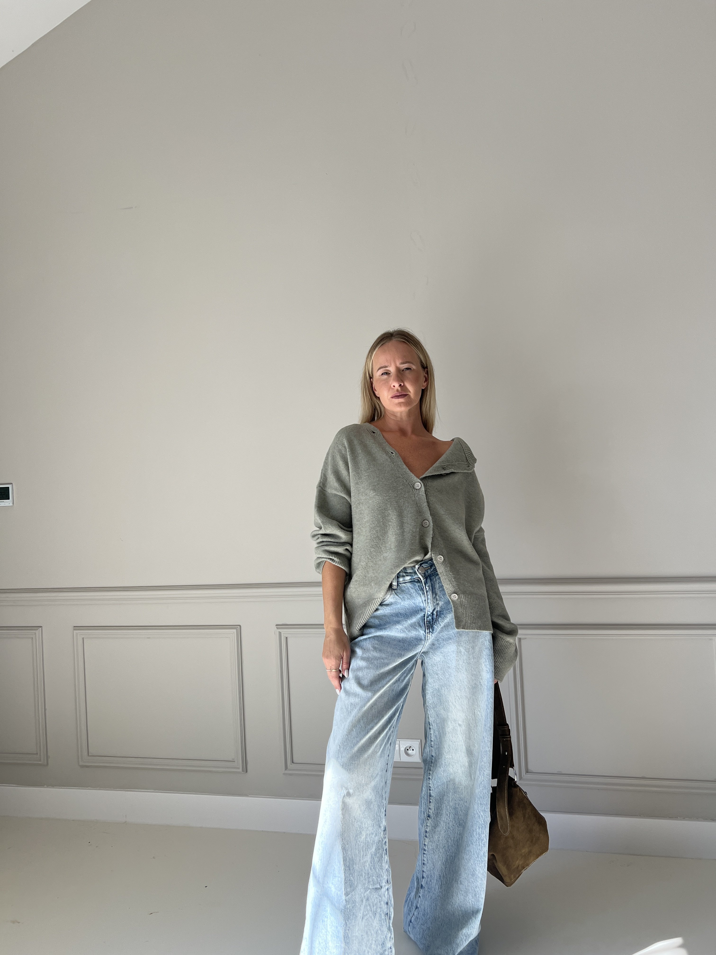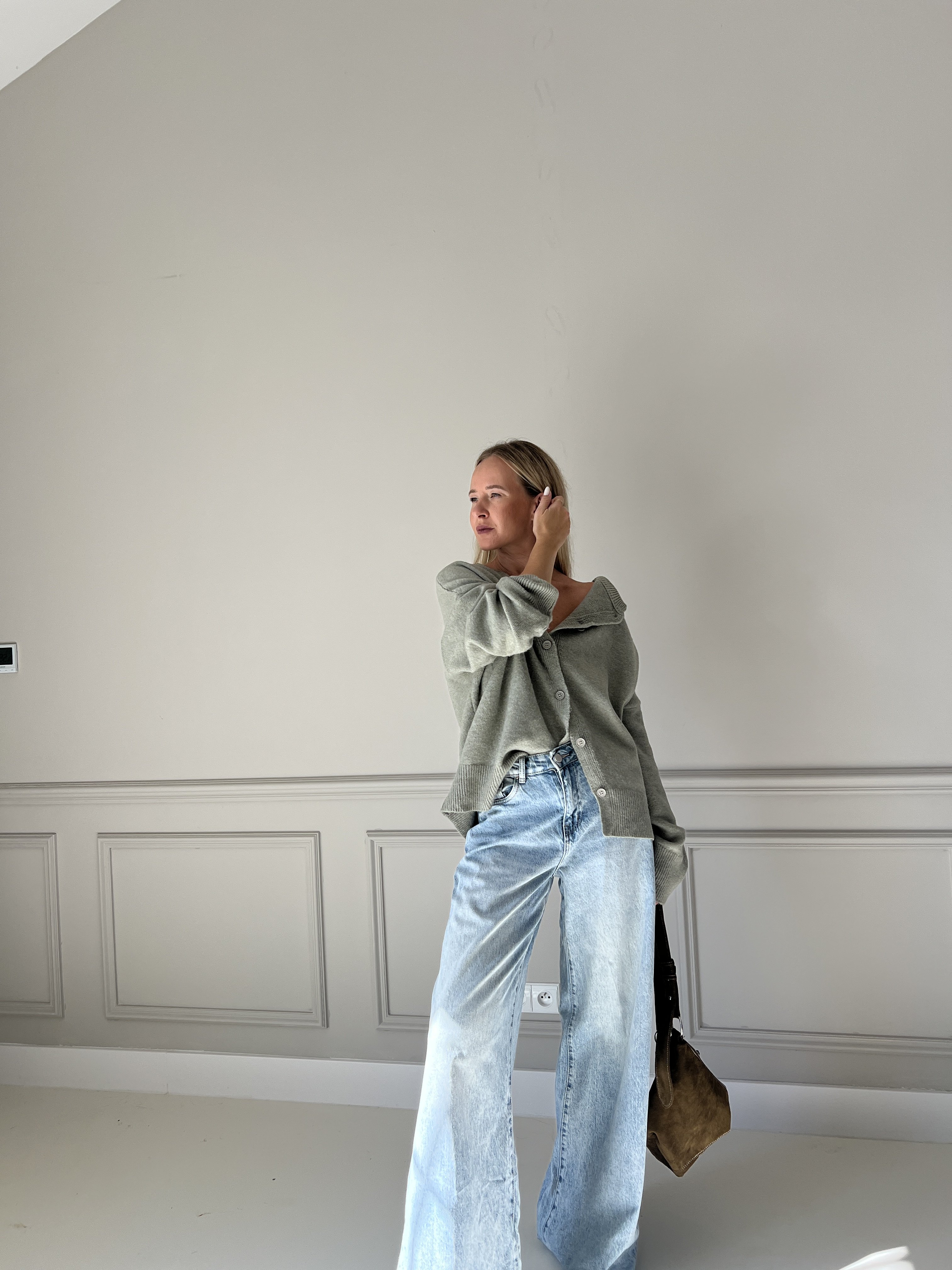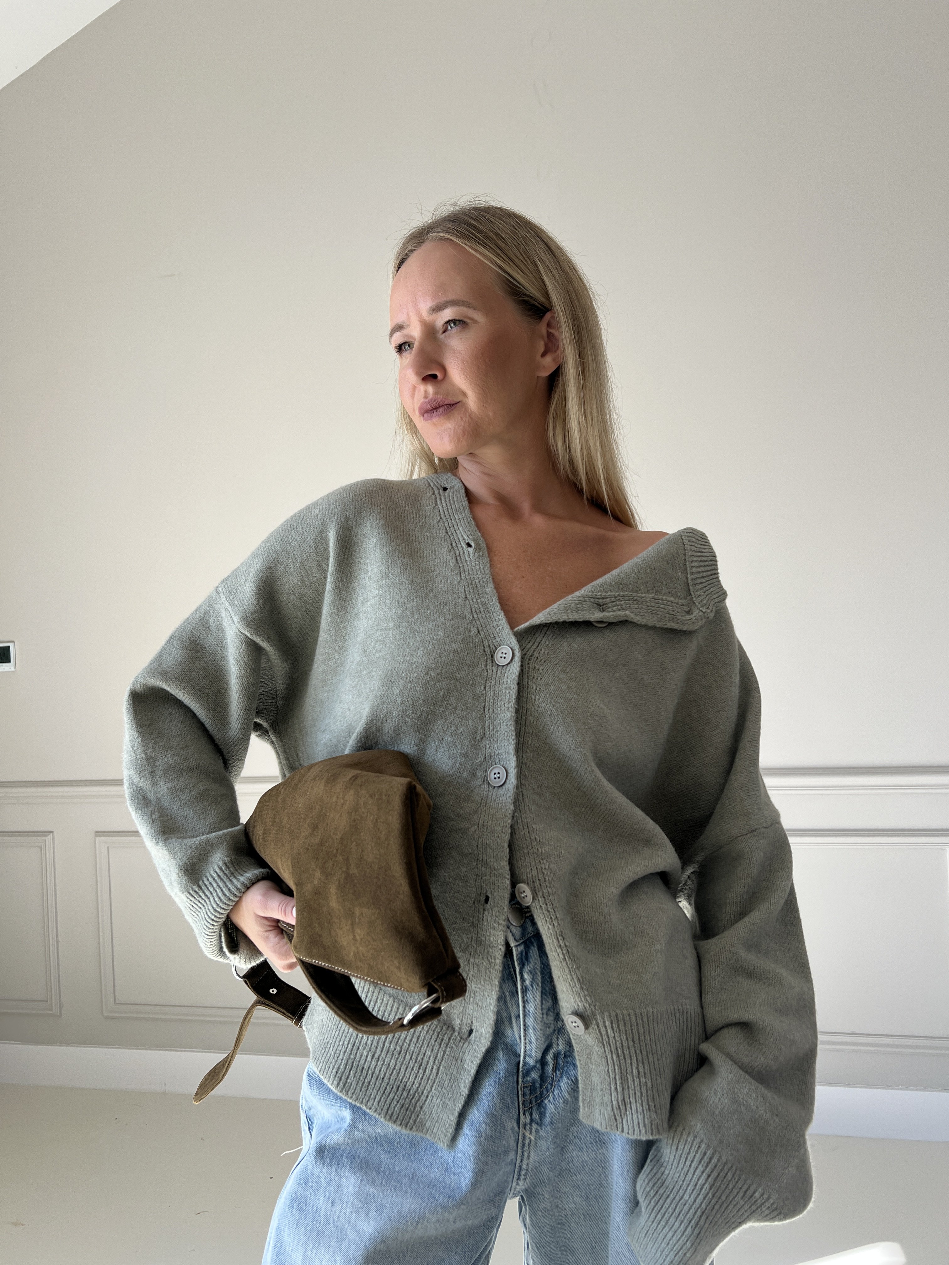 Pletený sveter v predĺženom strihu s asymetrickým zapínaním. Modelka má výšku 170cm, na sebe má veľkosť S/M