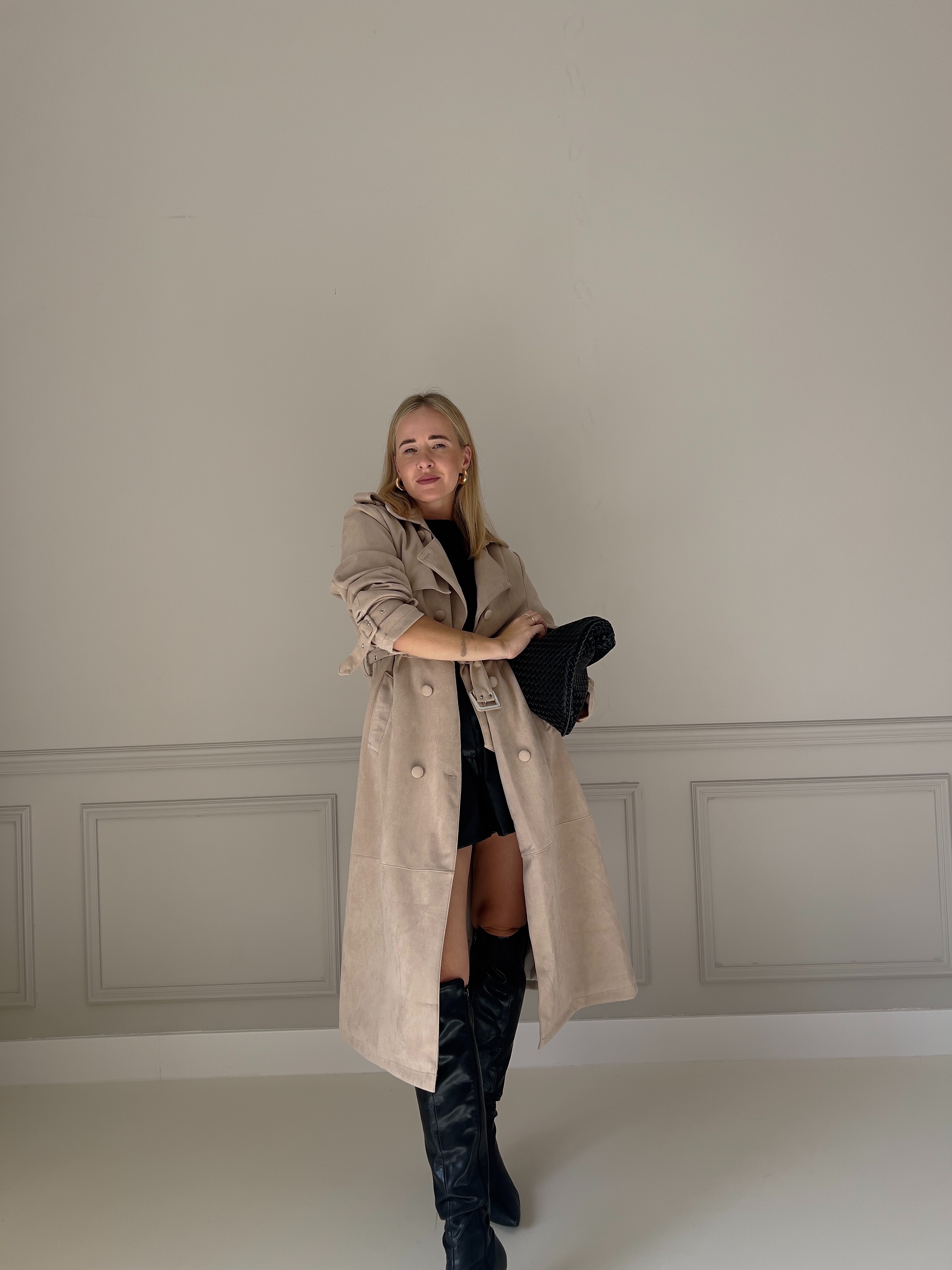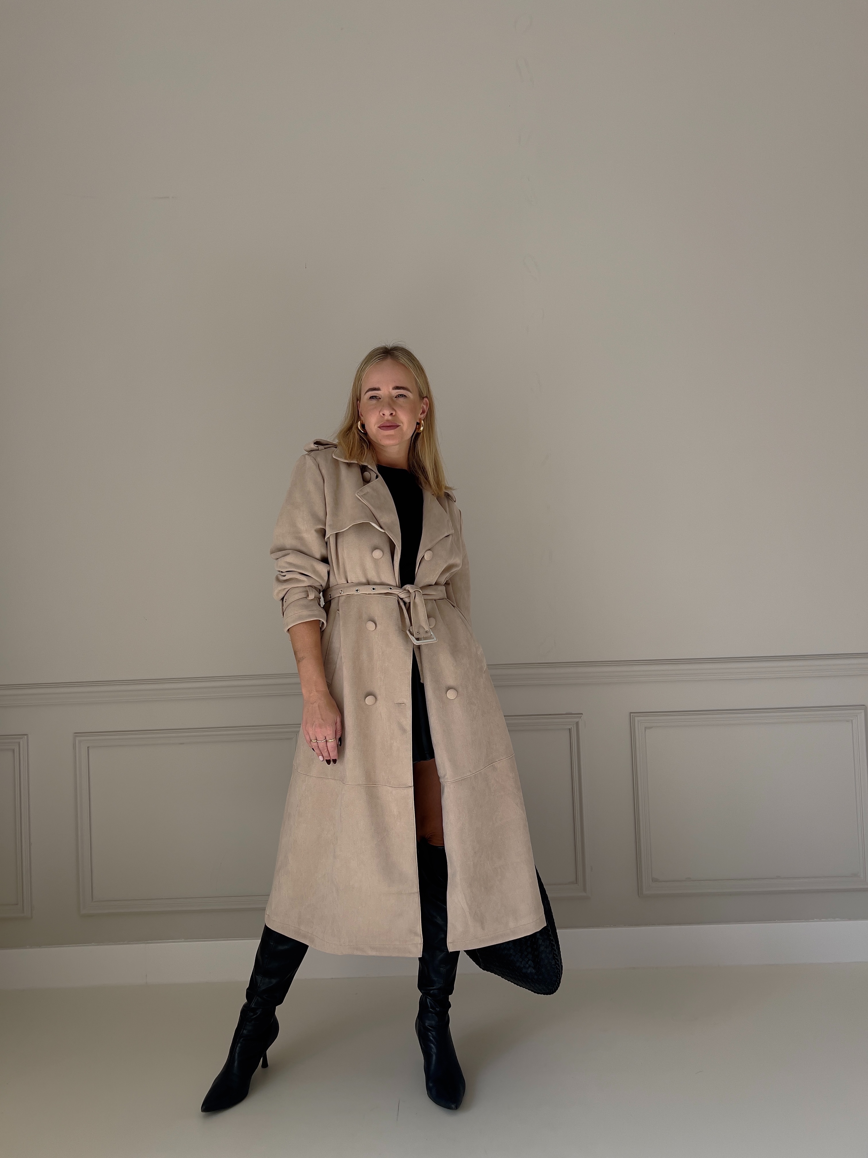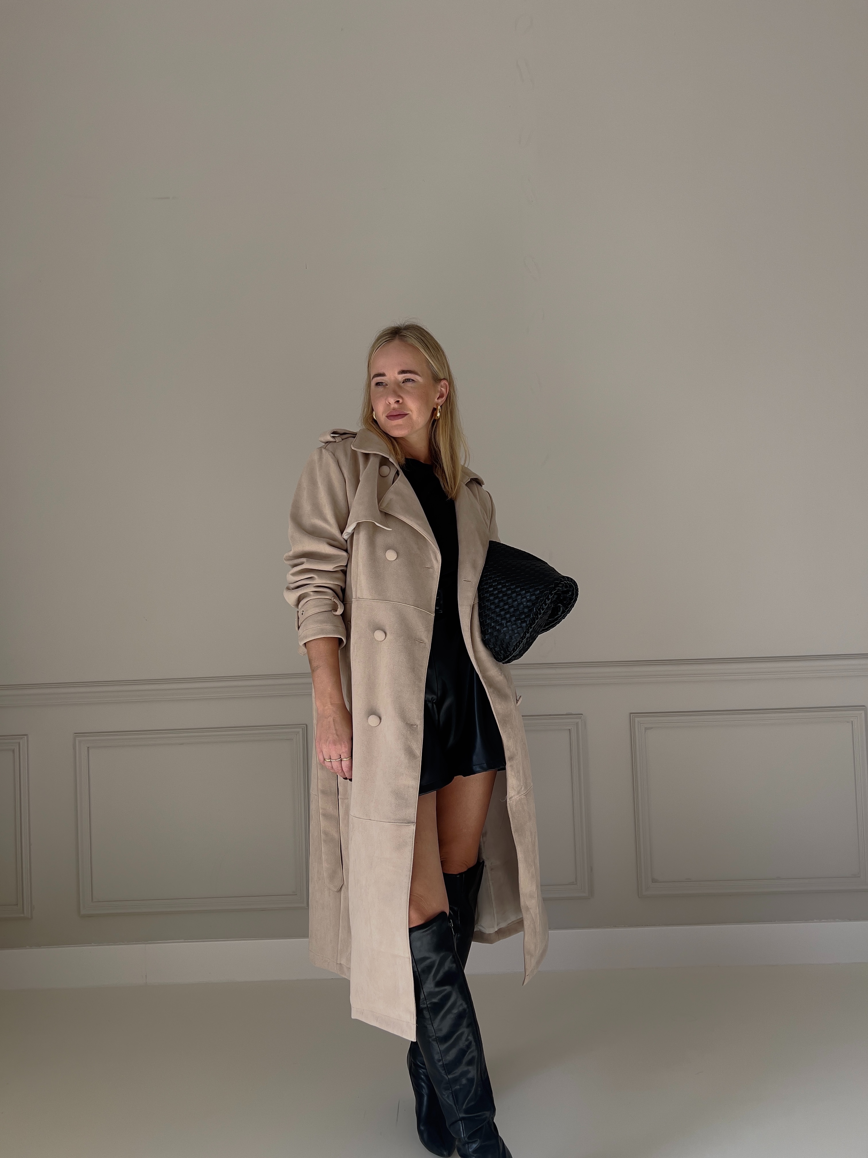 Elegantný, semišový kabát s dvojrádovým zapínaním a nastaviteľnými manžetami. Kabát je podšitý a jeho súčasťou je opasok.