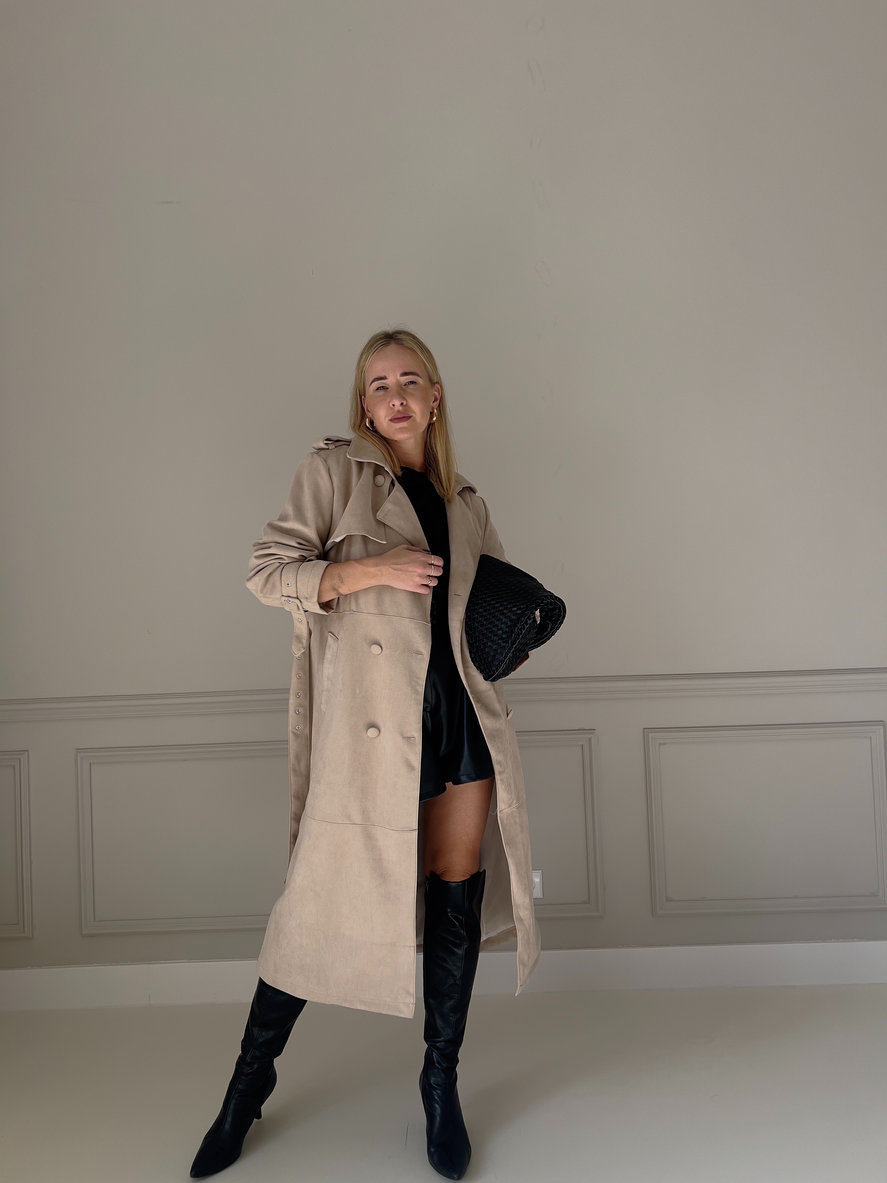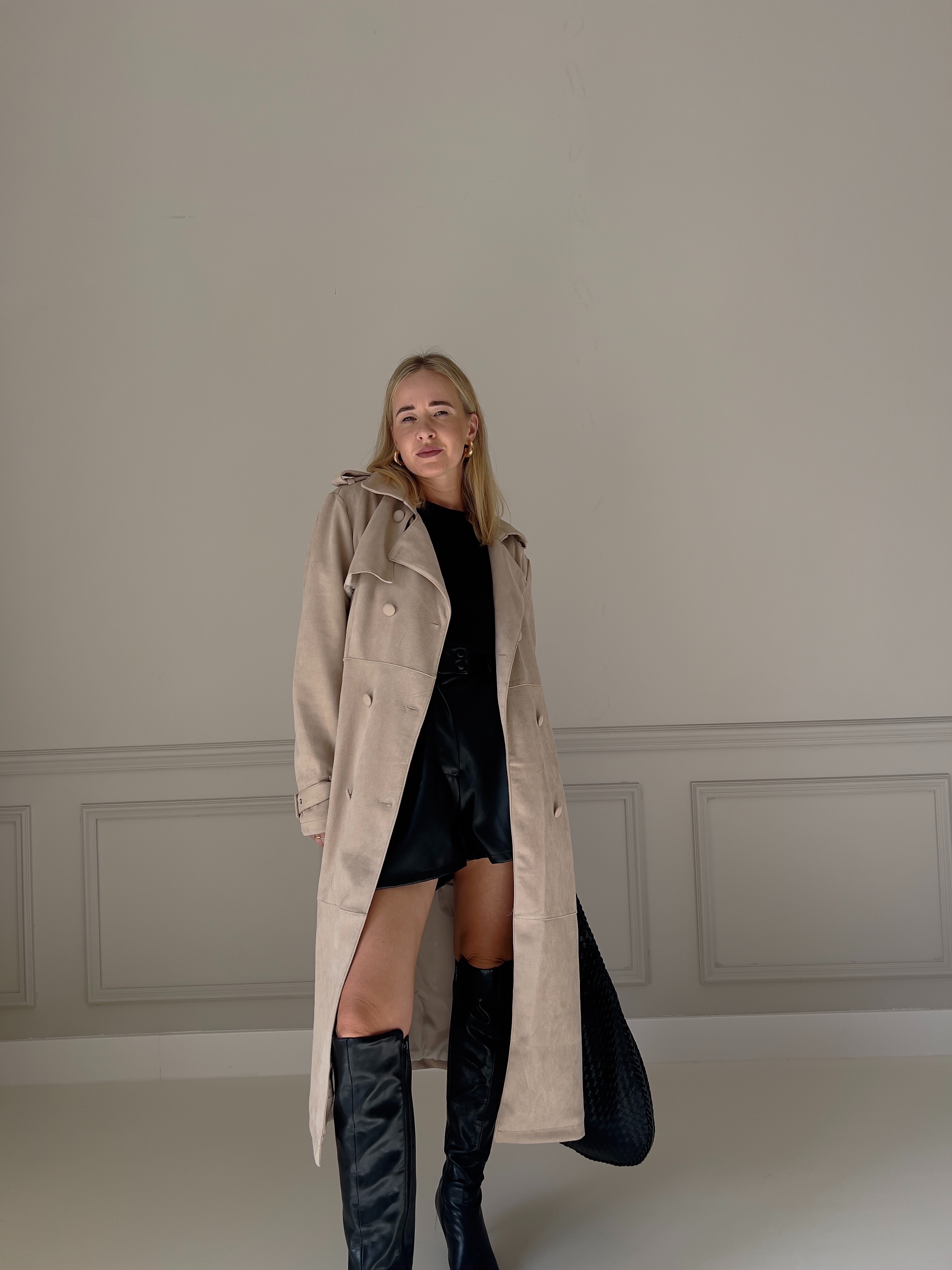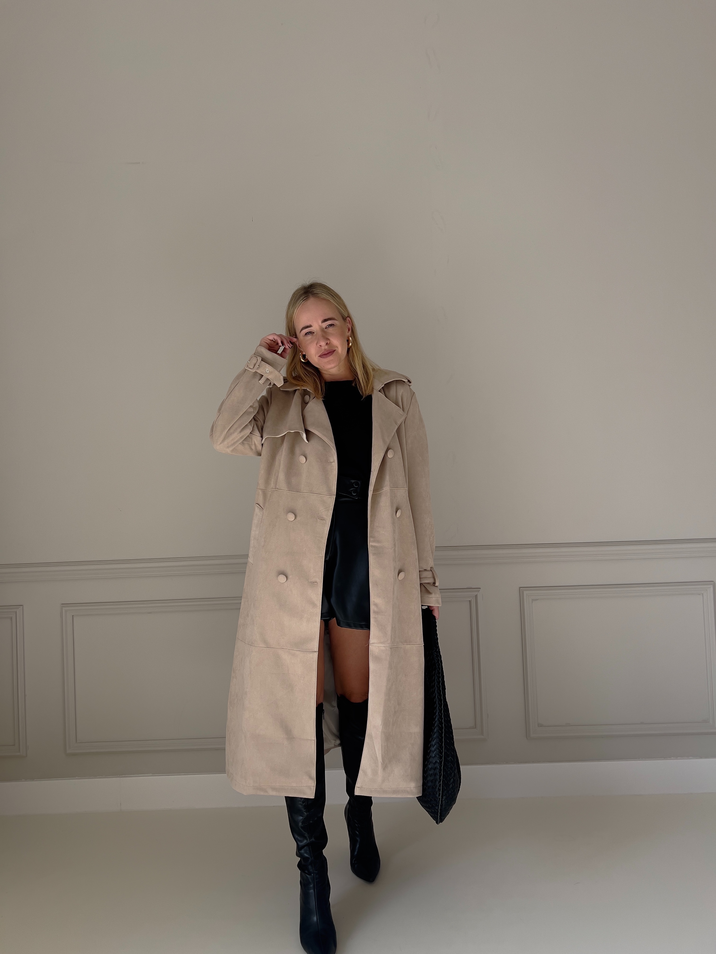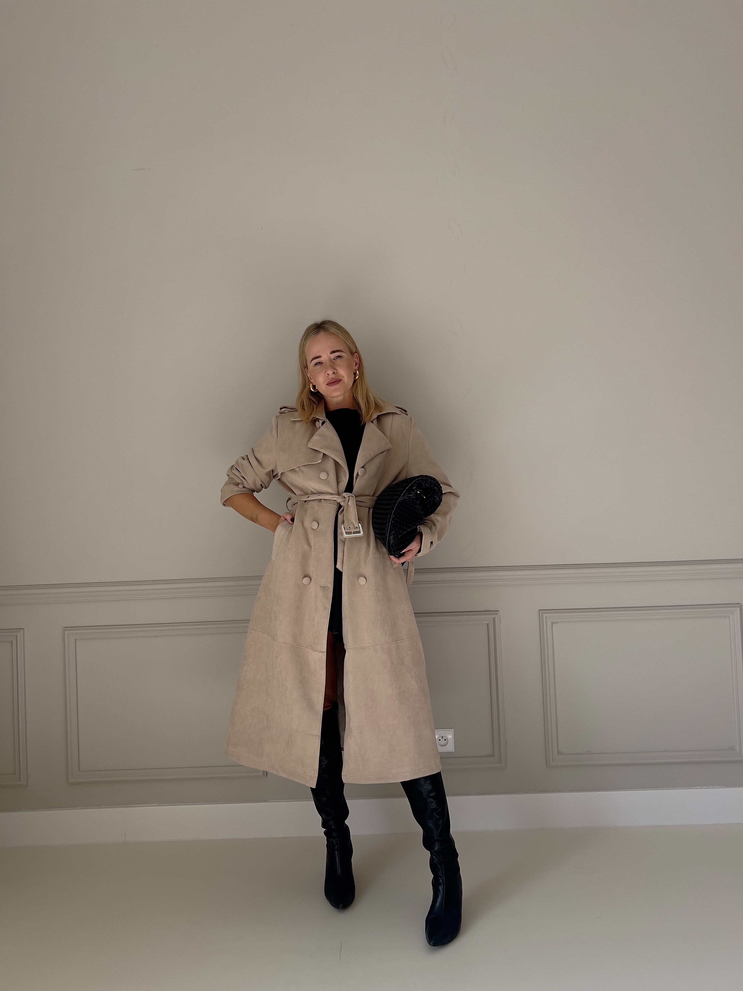 Elegantný, semišový kabát s dvojrádovým zapínaním a nastaviteľnými manžetami. Kabát je podšitý a jeho súčasťou je opasok.
