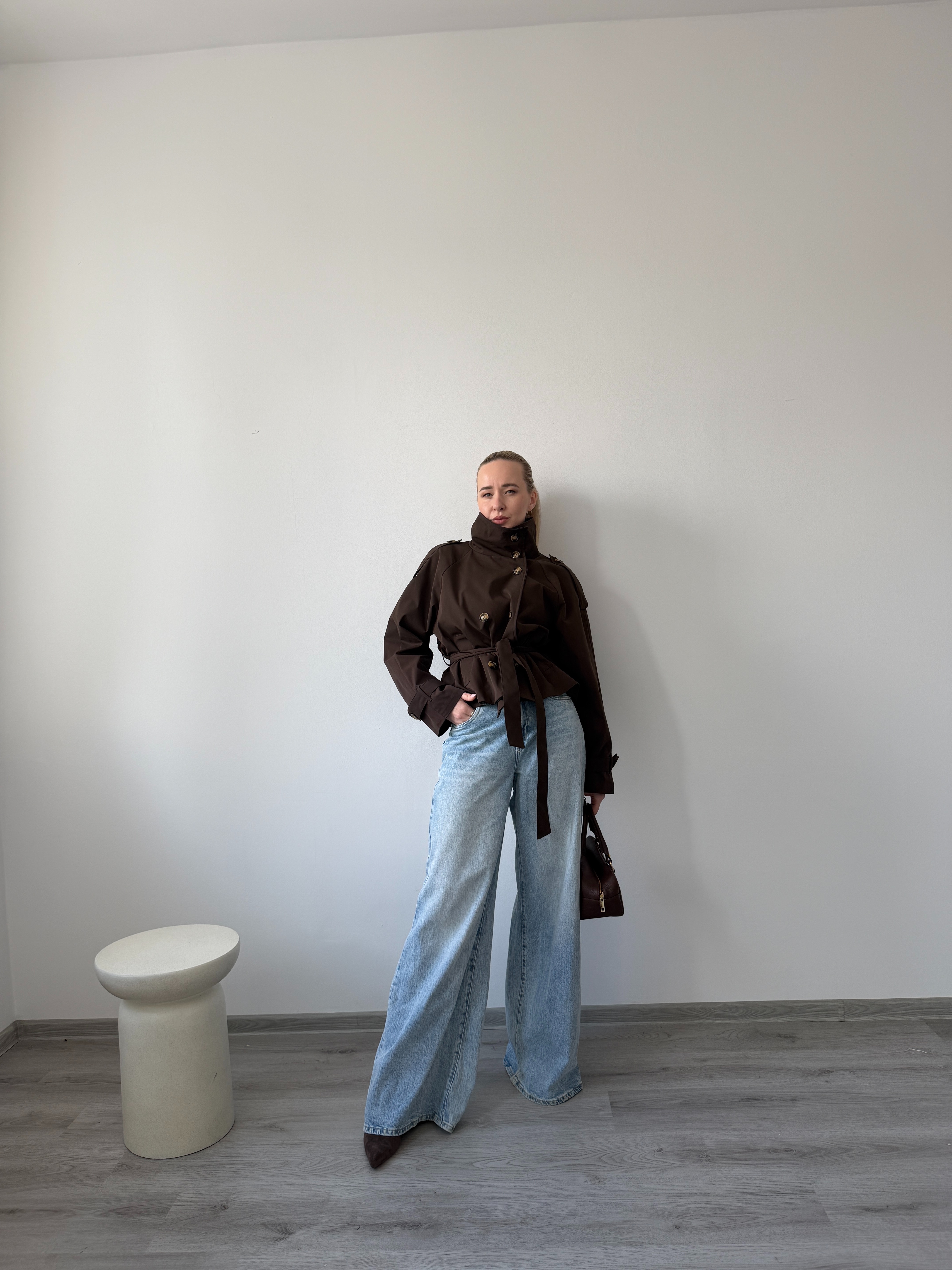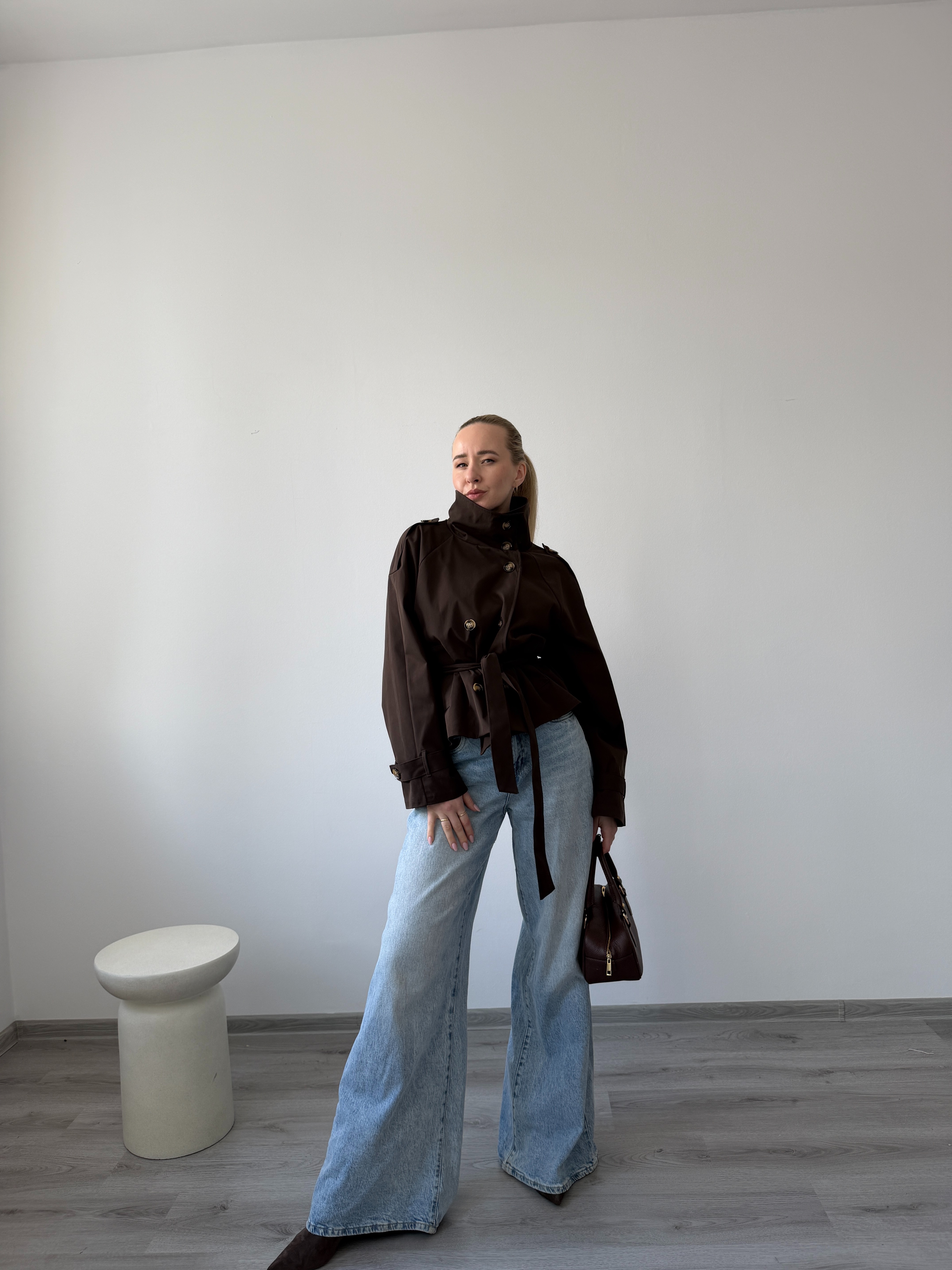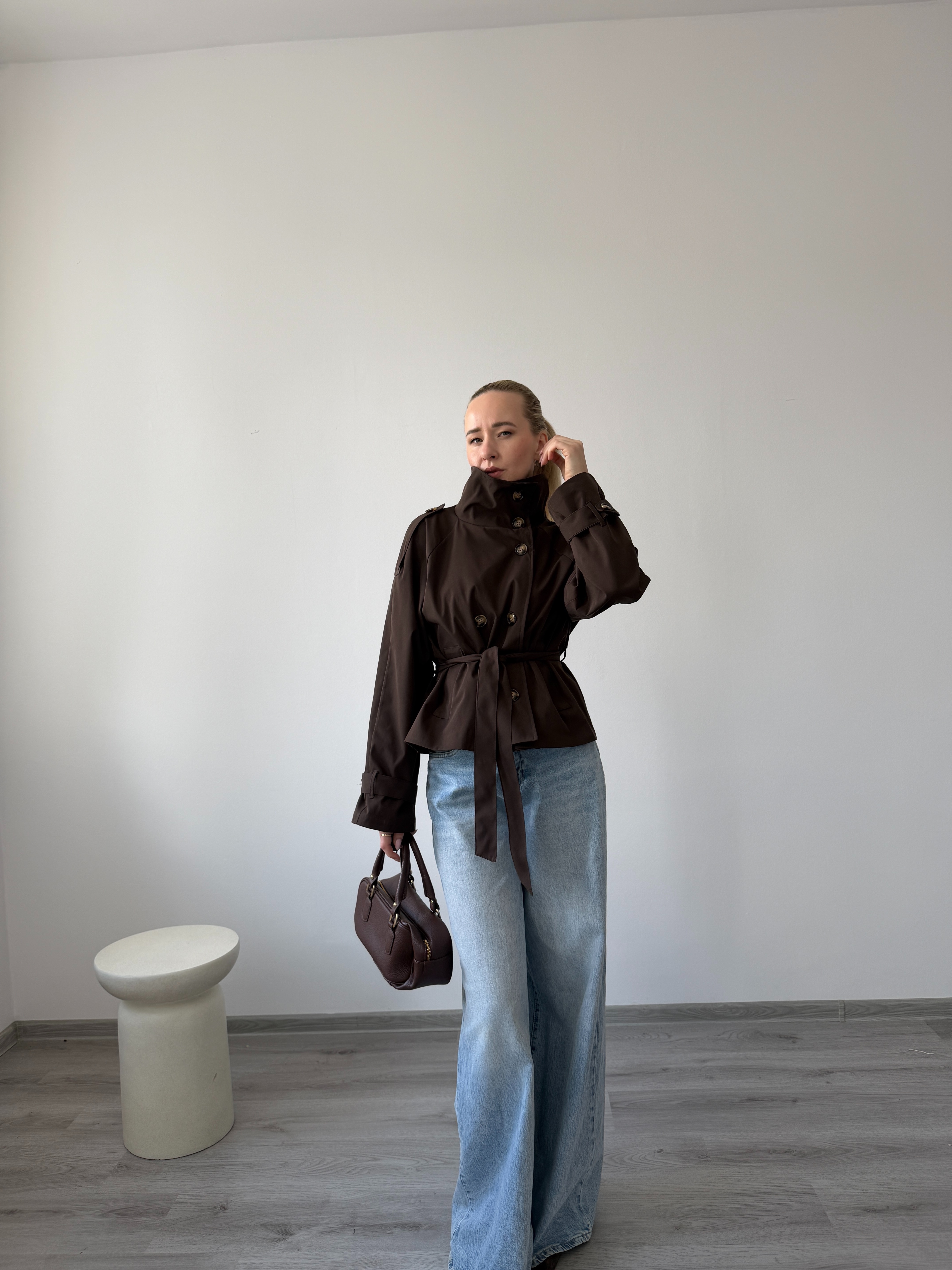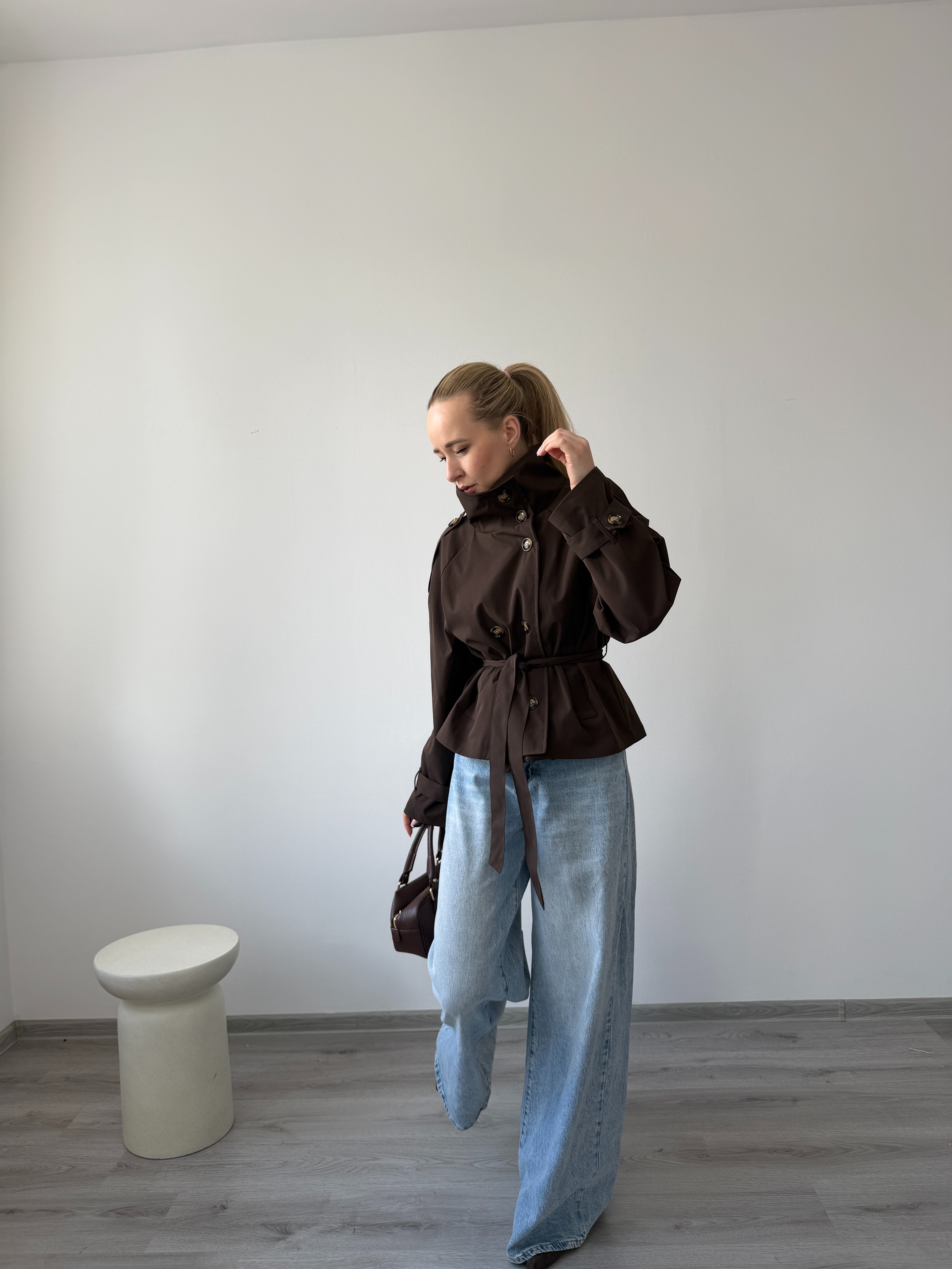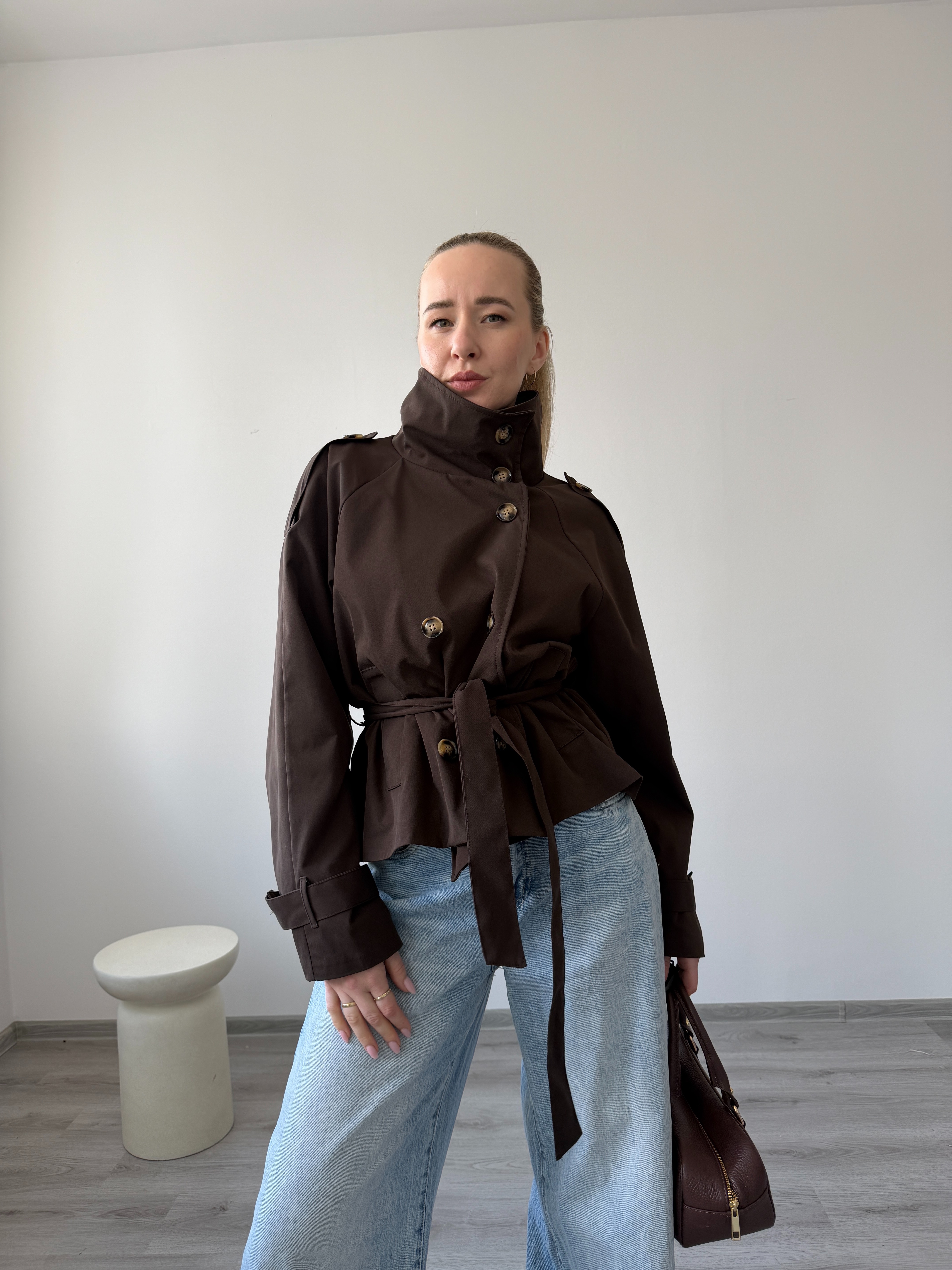 Moderný krátky trenchcoat s viazaním v páse, ktorá krásne zvýrazní siluetu. Skvelý kúsok na vrstvenie a prechodné obdobie. Modelka má výšku 170cm, nosí veľkosť S.