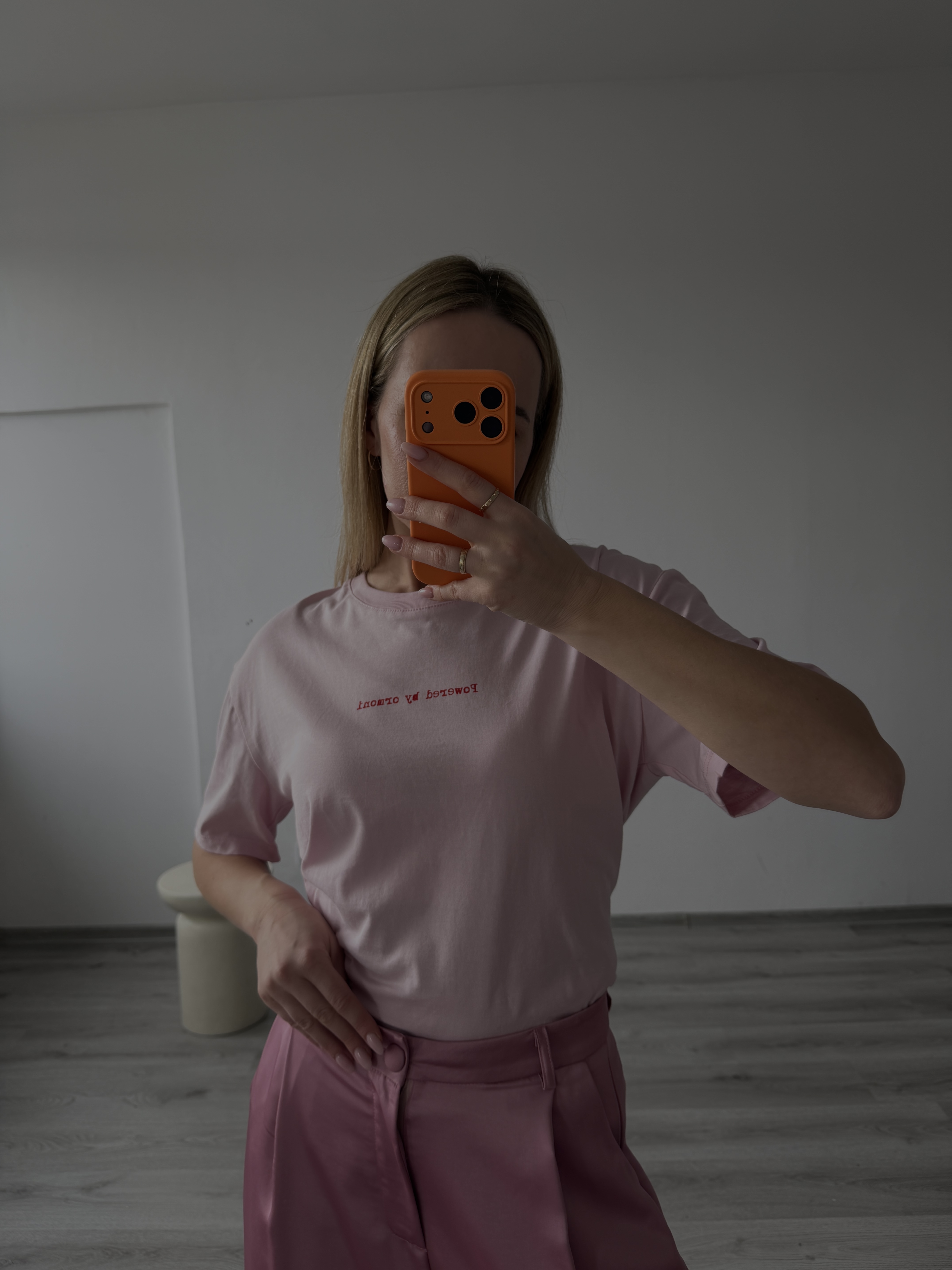 Jemné ružové tričko s nápisom z ľahkého a pohodlného materiálu. Ideálne na vrstvenie alebo letné outfity, dodá jemný a ženský nádych každému looku.