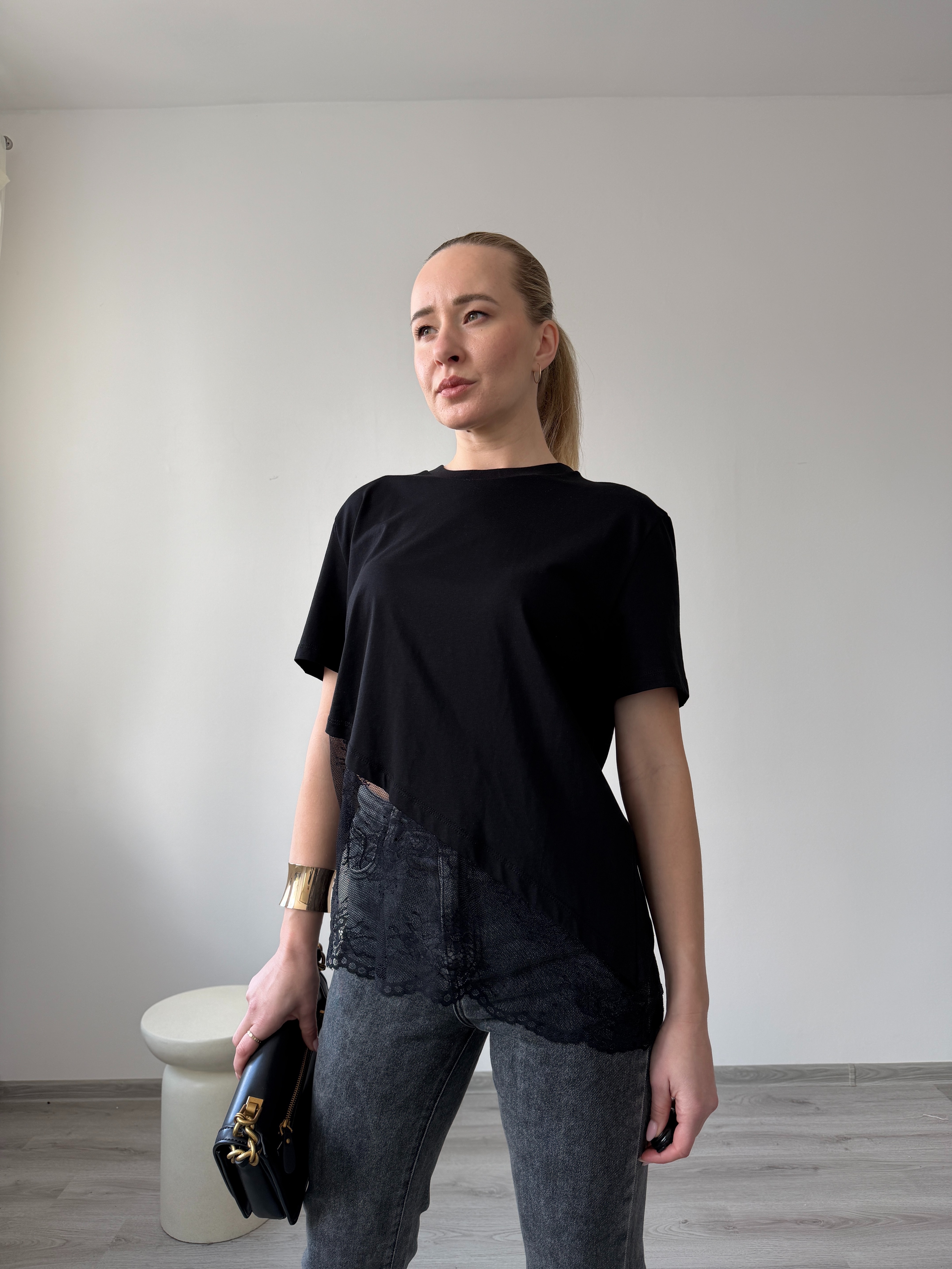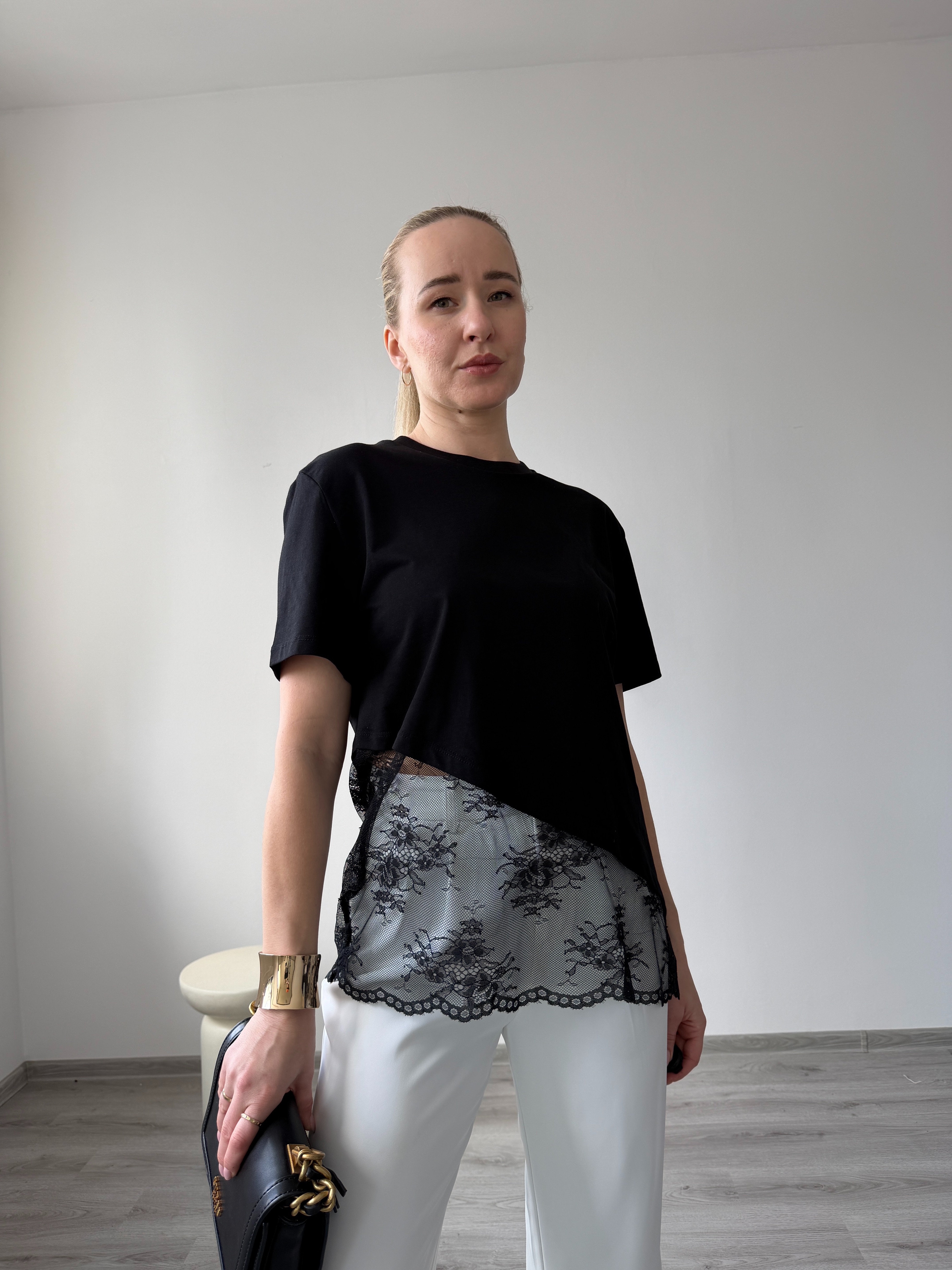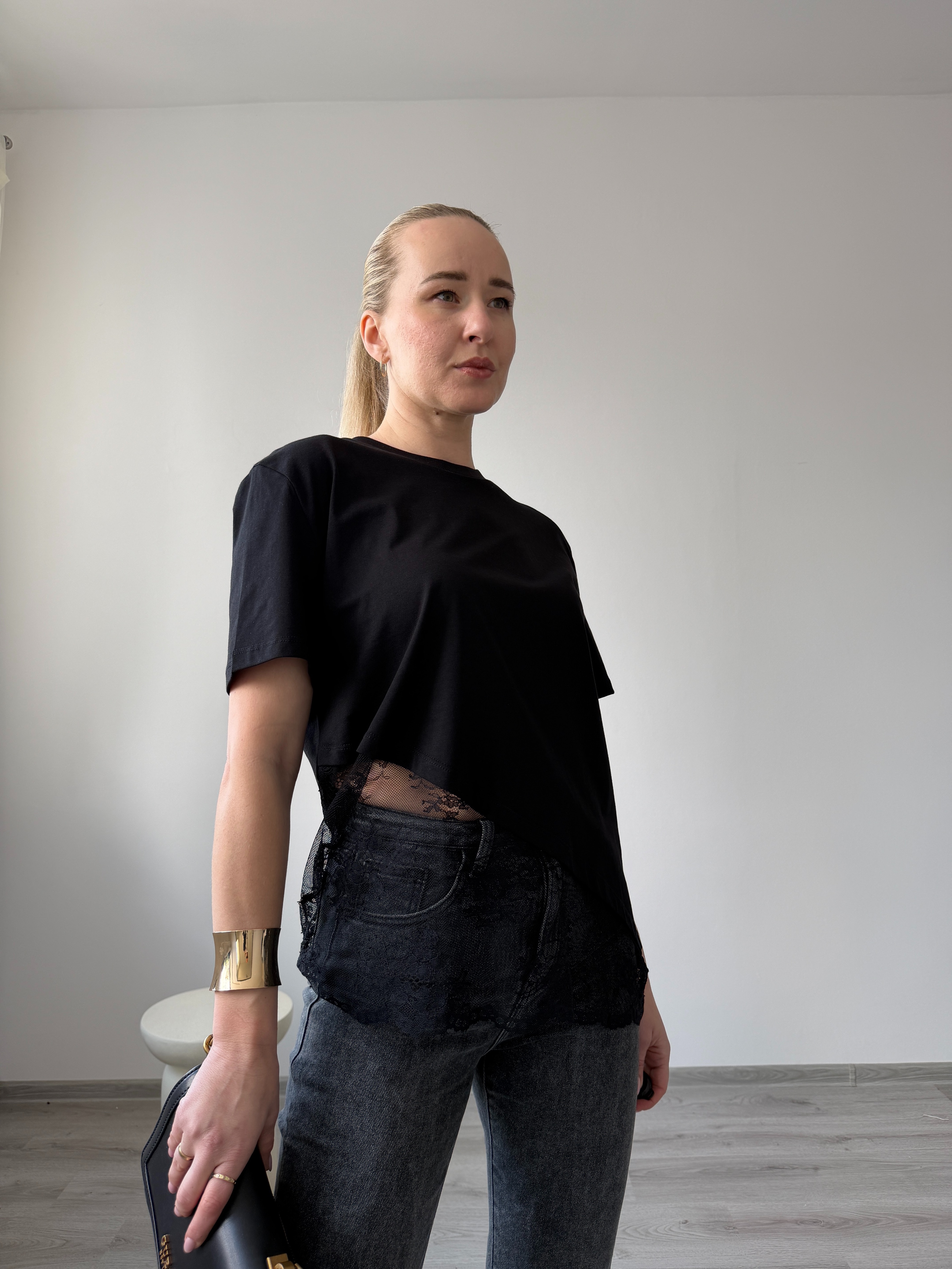 Štýlové tričko v čiernej farbe doplnené o jemný čipkovaný detail. Kombinácia pohodlia a ženskosti, ktorá oživí každý outfit. Modelka má výšku 170cm, na sebe má veľkosť s/m.